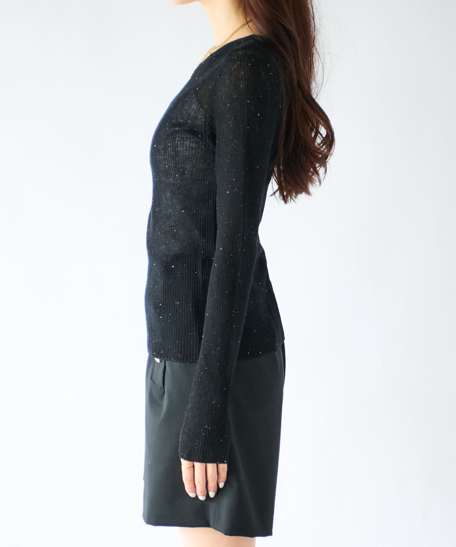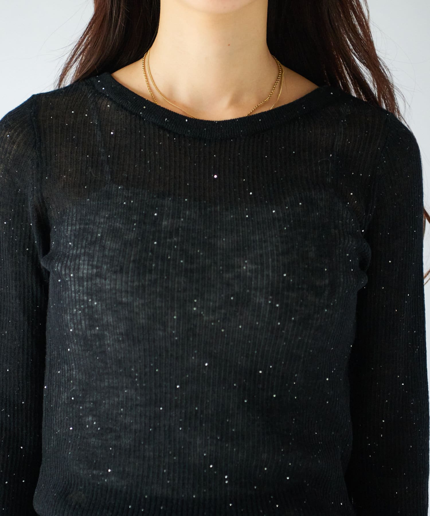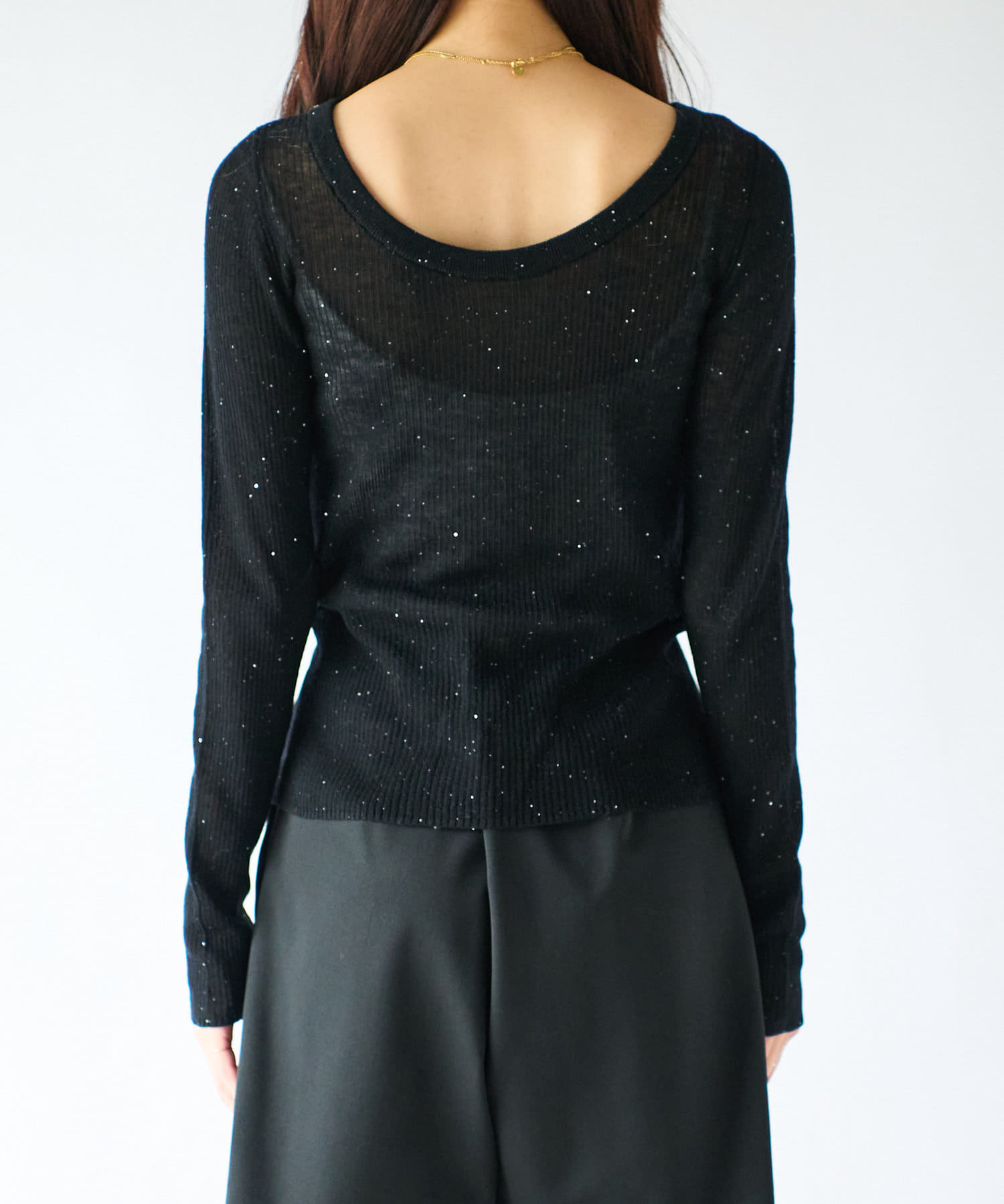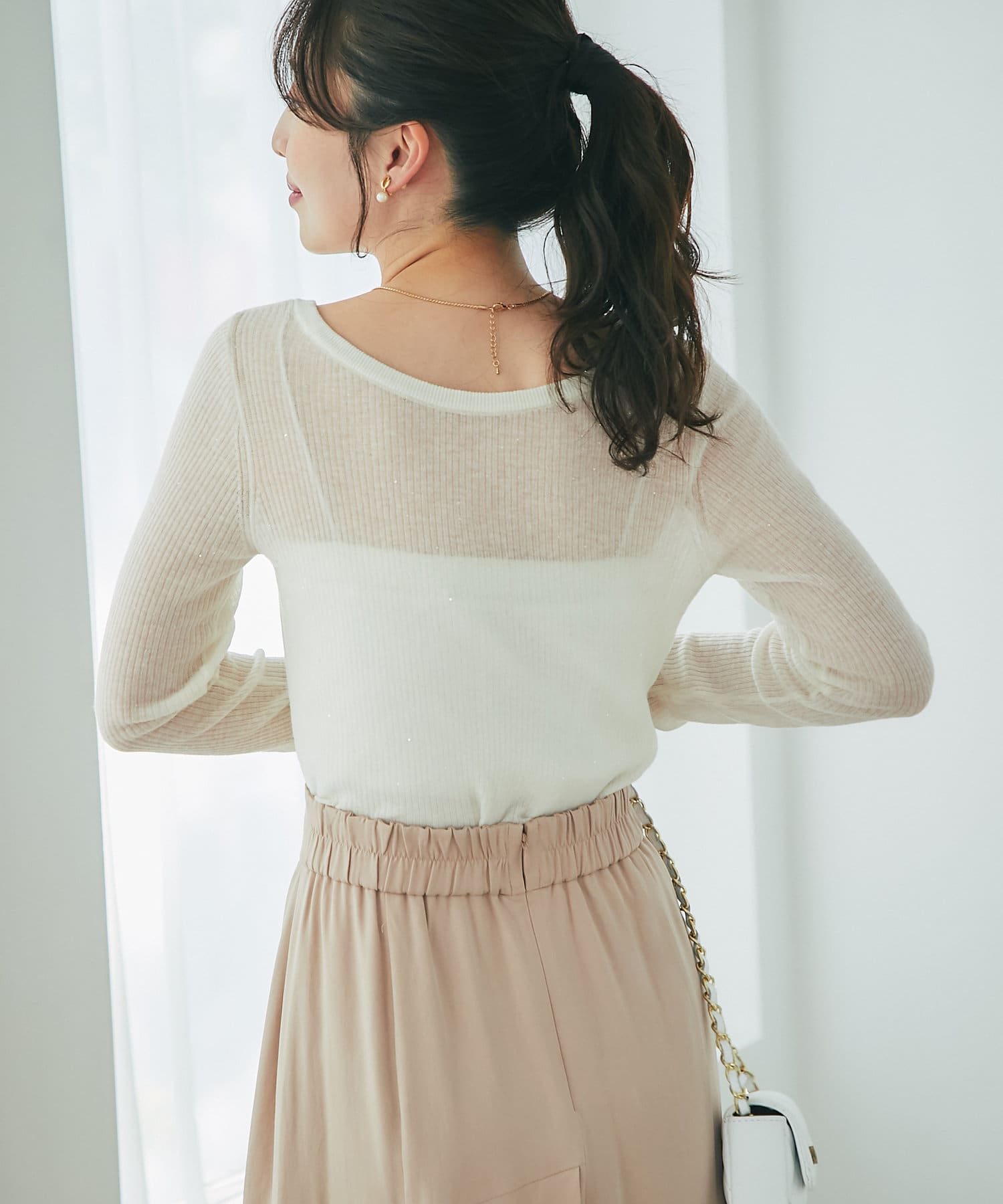 トレンドのシアー素材でさりげなく光る小さなスパンコールが品の良いニットプルオーバー。