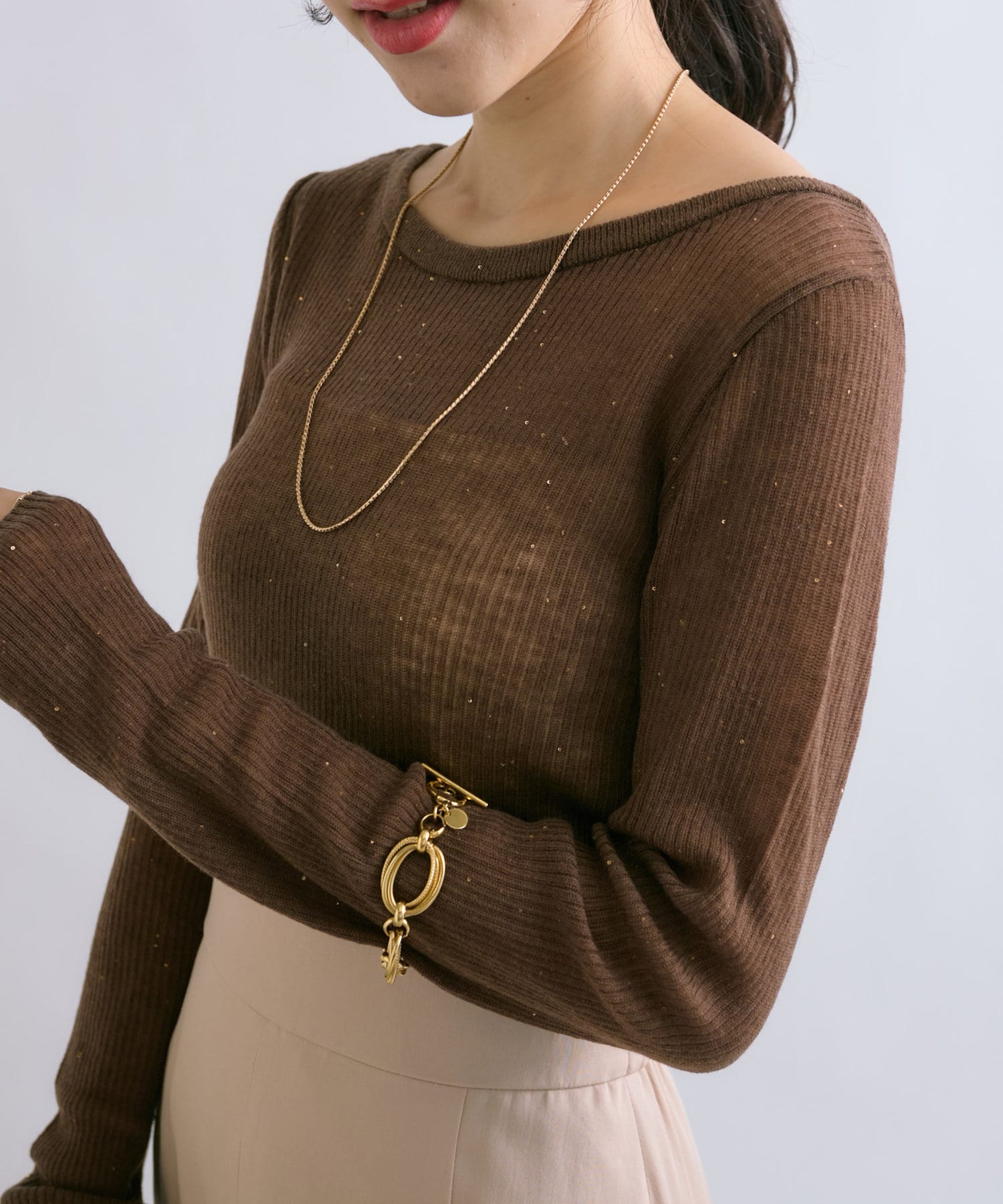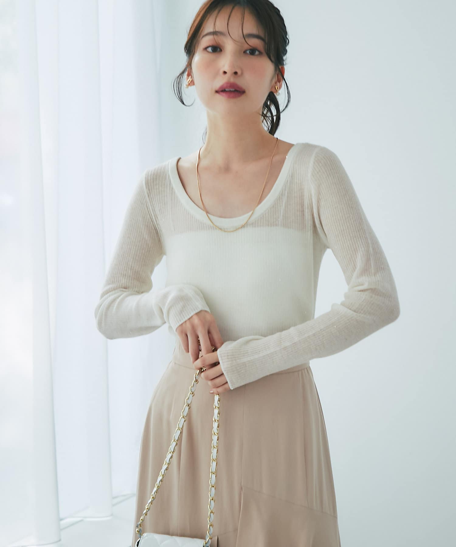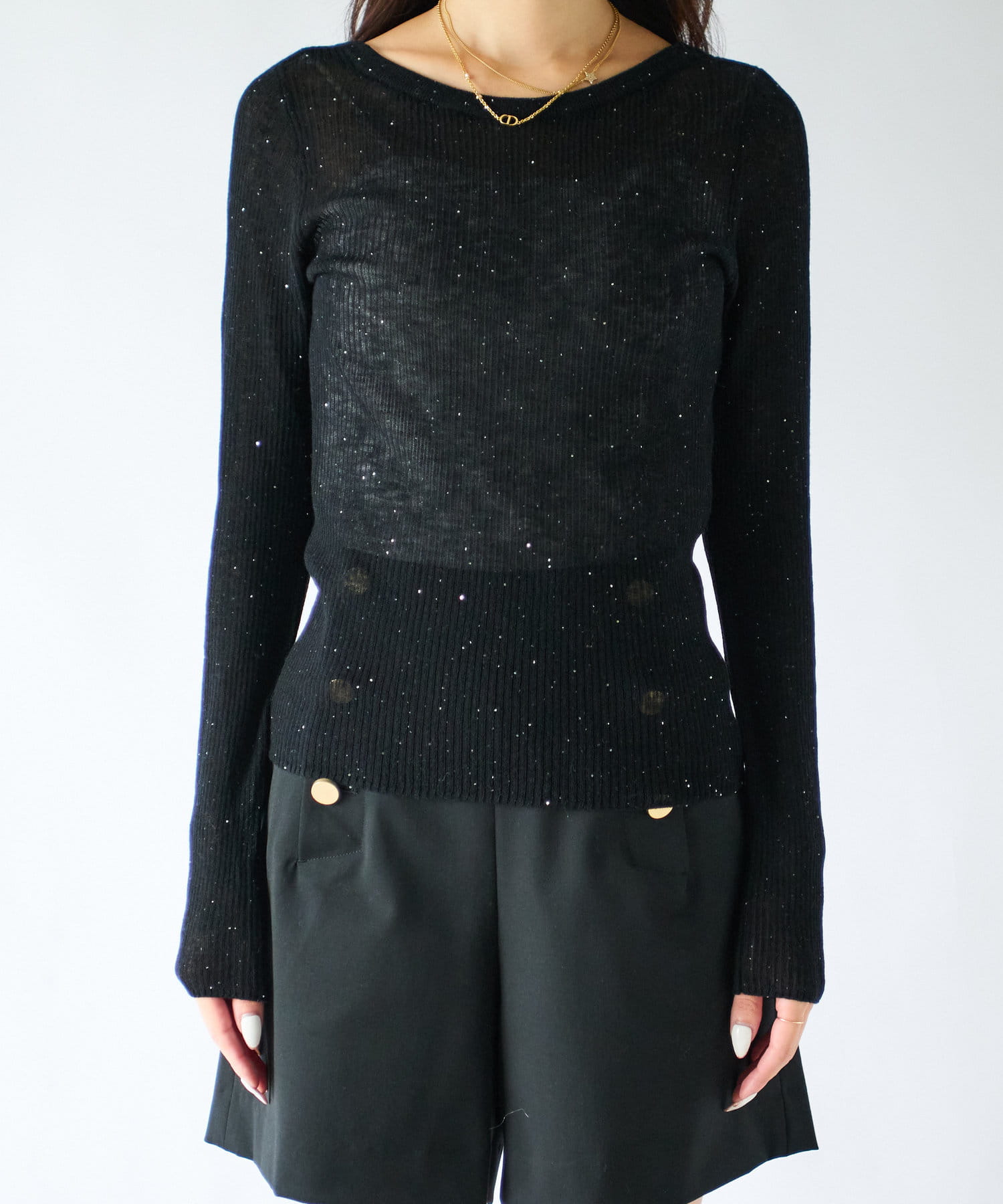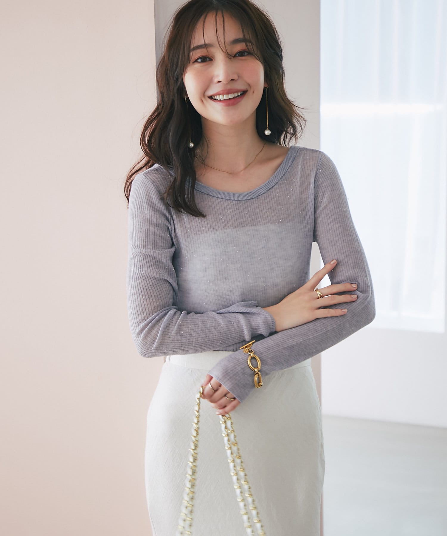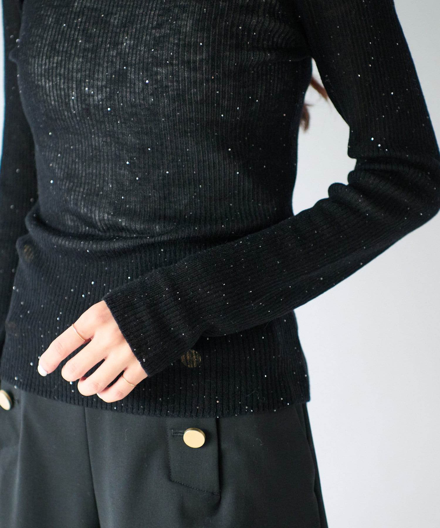 トレンドのシアー素材でさりげなく光る小さなスパンコールが品の良いニットプルオーバー。