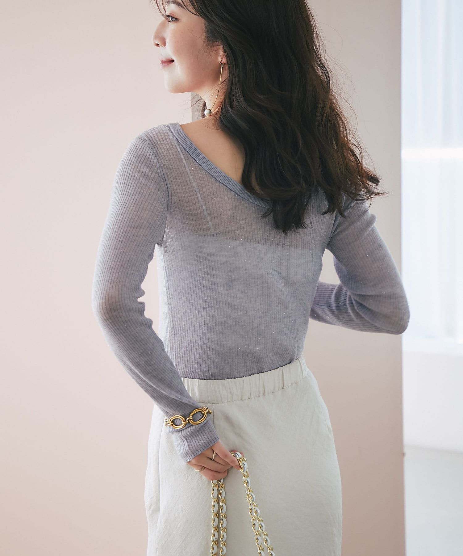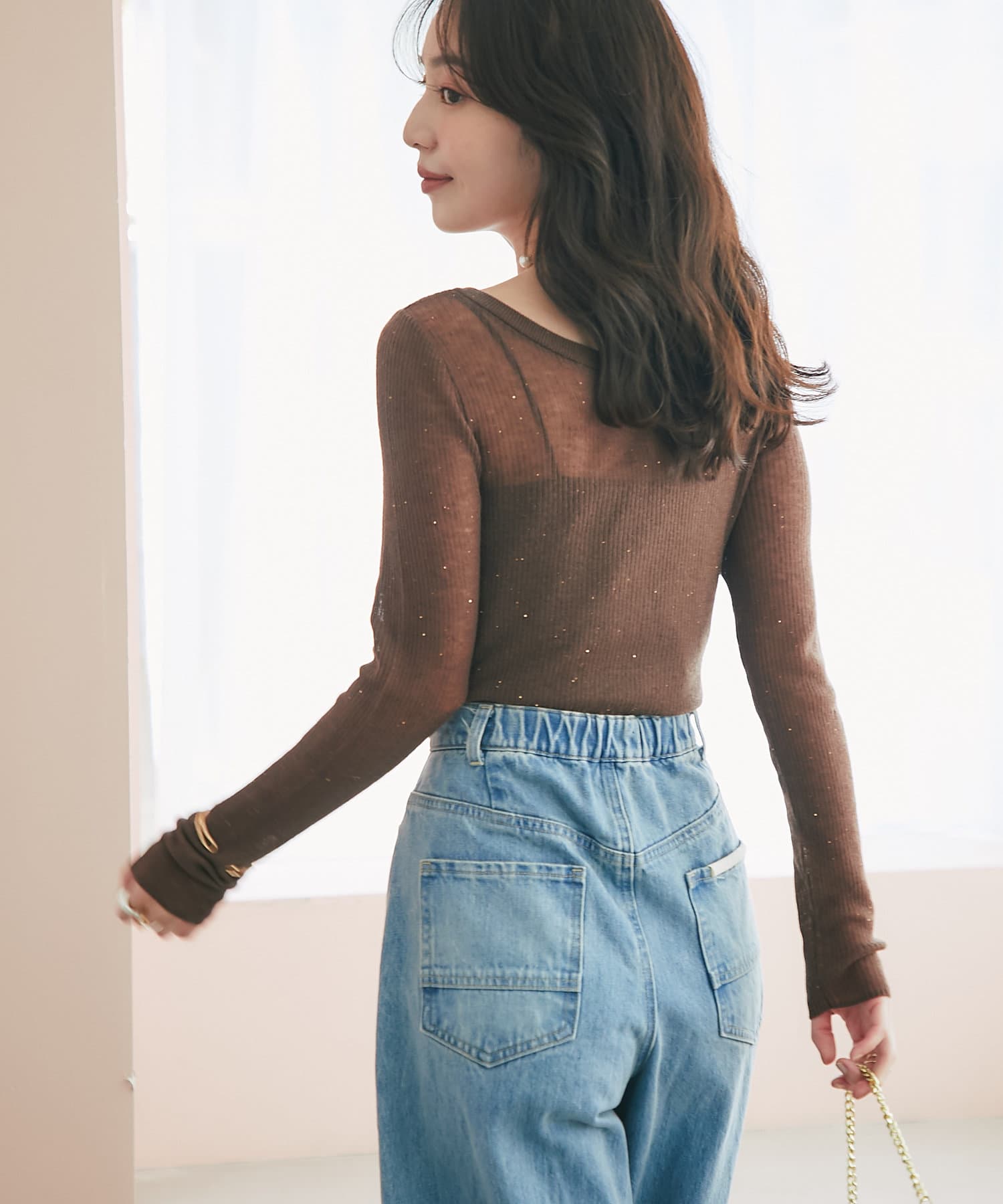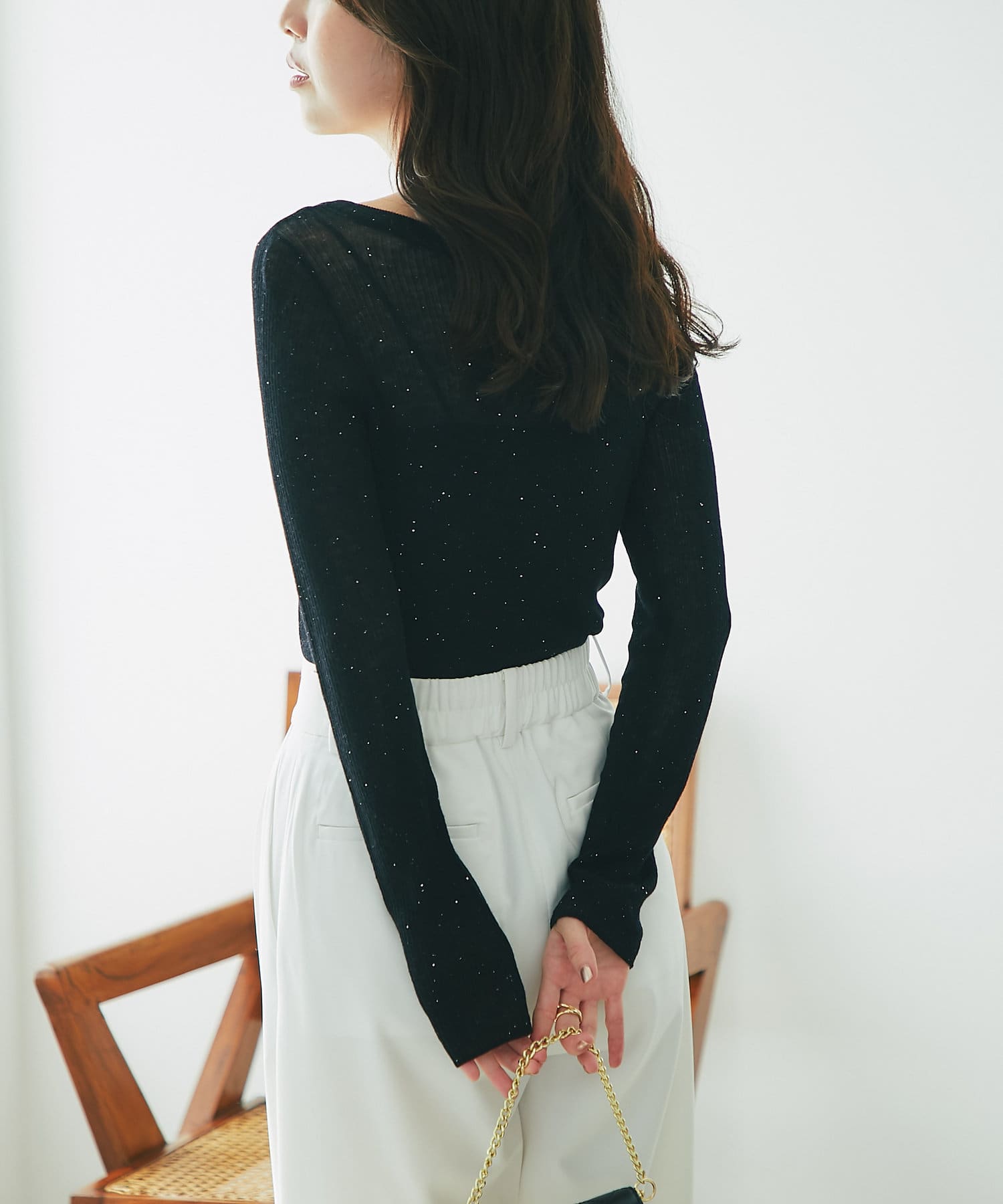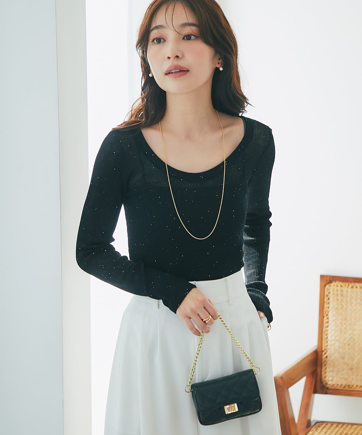 トレンドのシアー素材でさりげなく光る小さなスパンコールが品の良いニットプルオーバー。