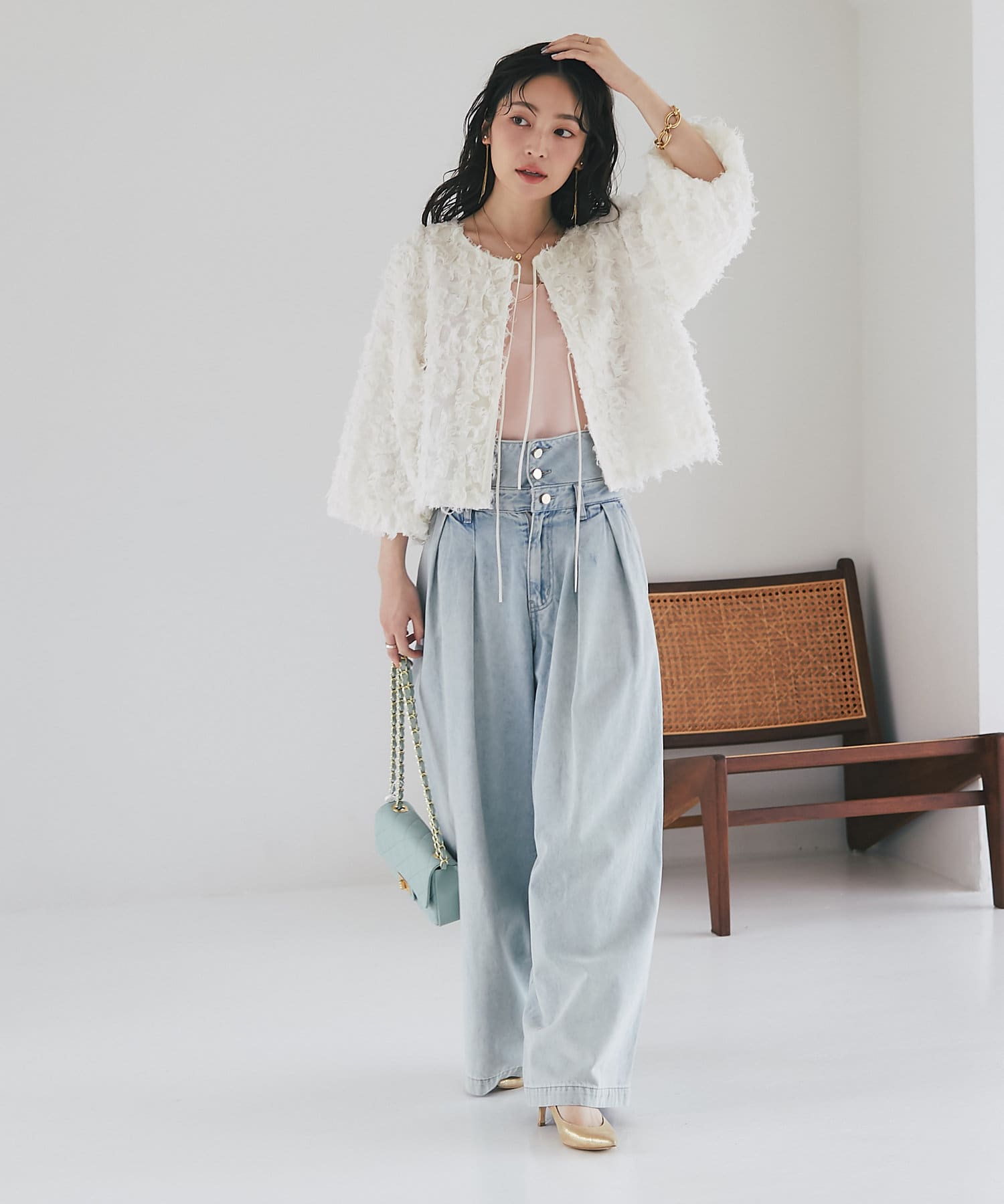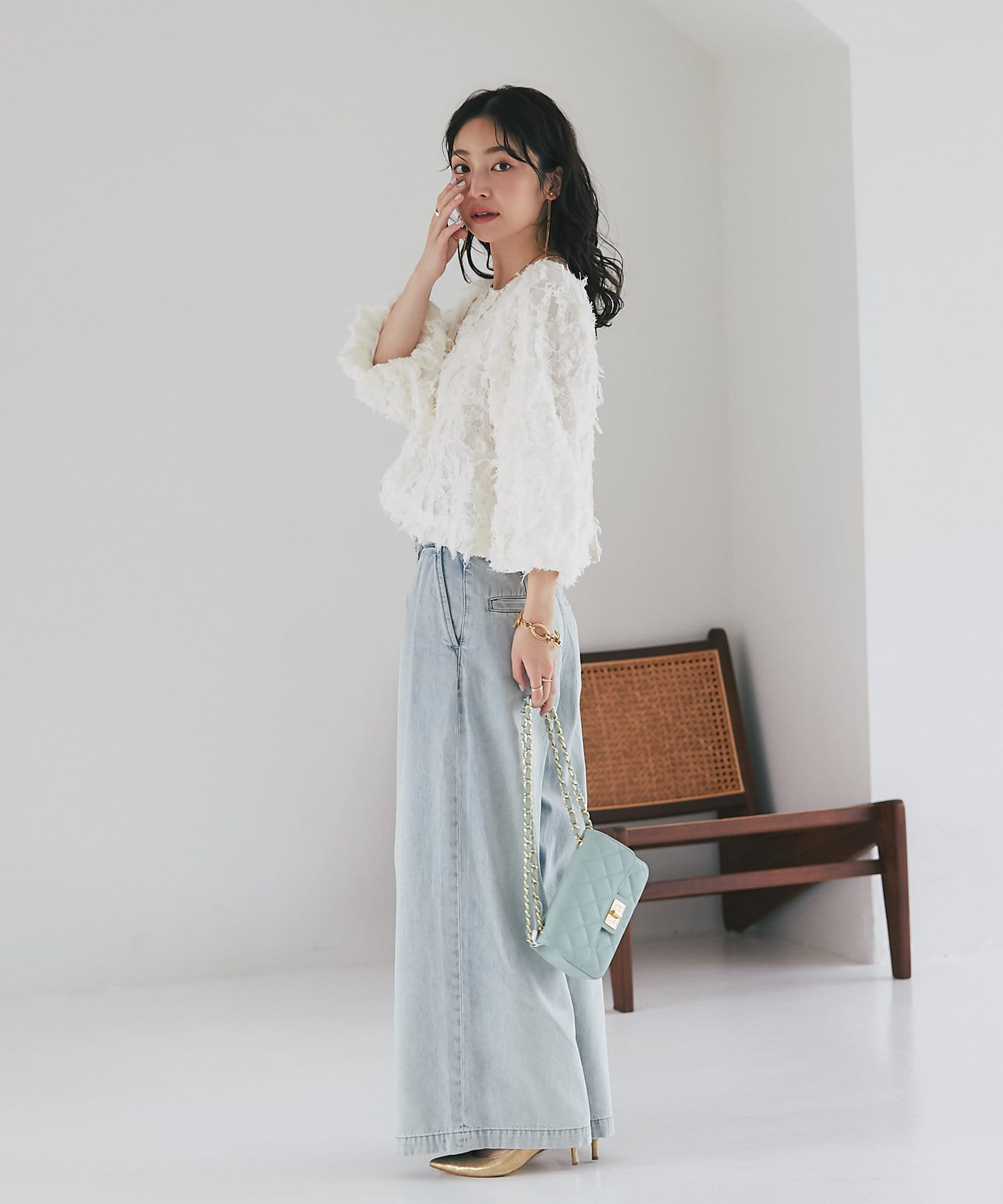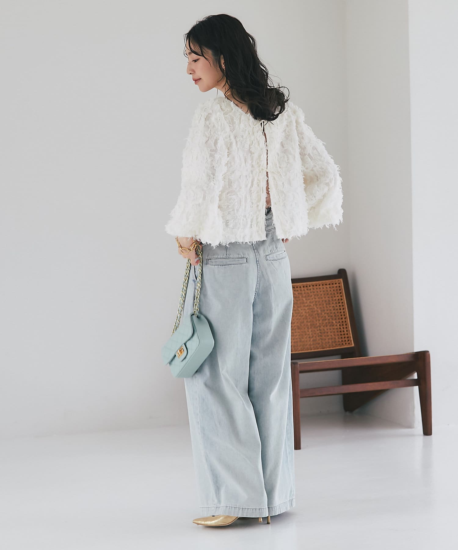 同素材のスカートとセットアップで着用すれば、特別なお出かけにもぴったり。
