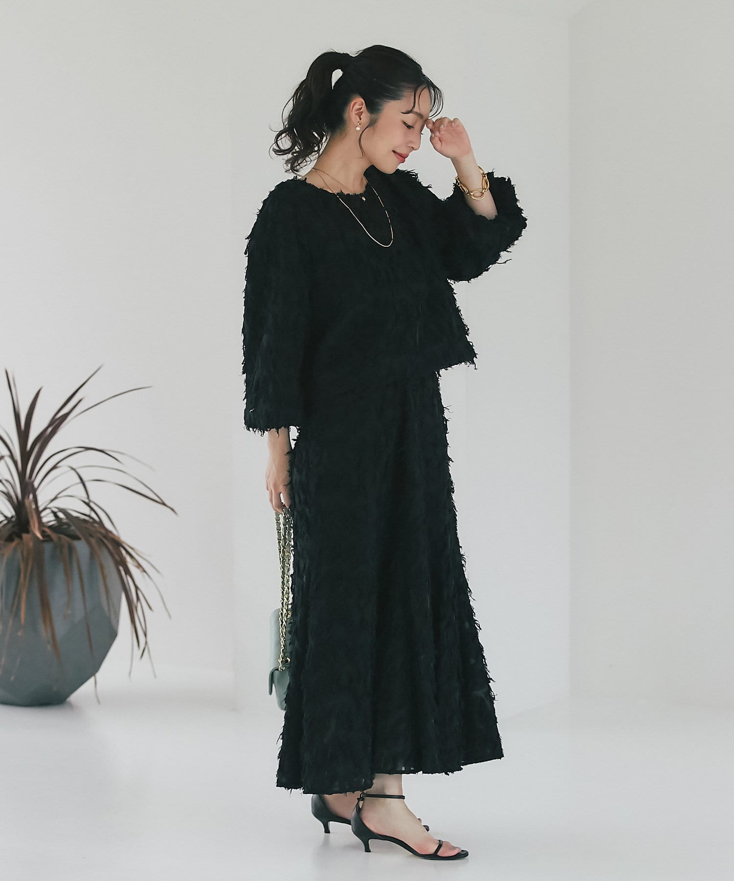 同素材のスカートとセットアップで着用すれば特別感のある上品スタイルが完成。
