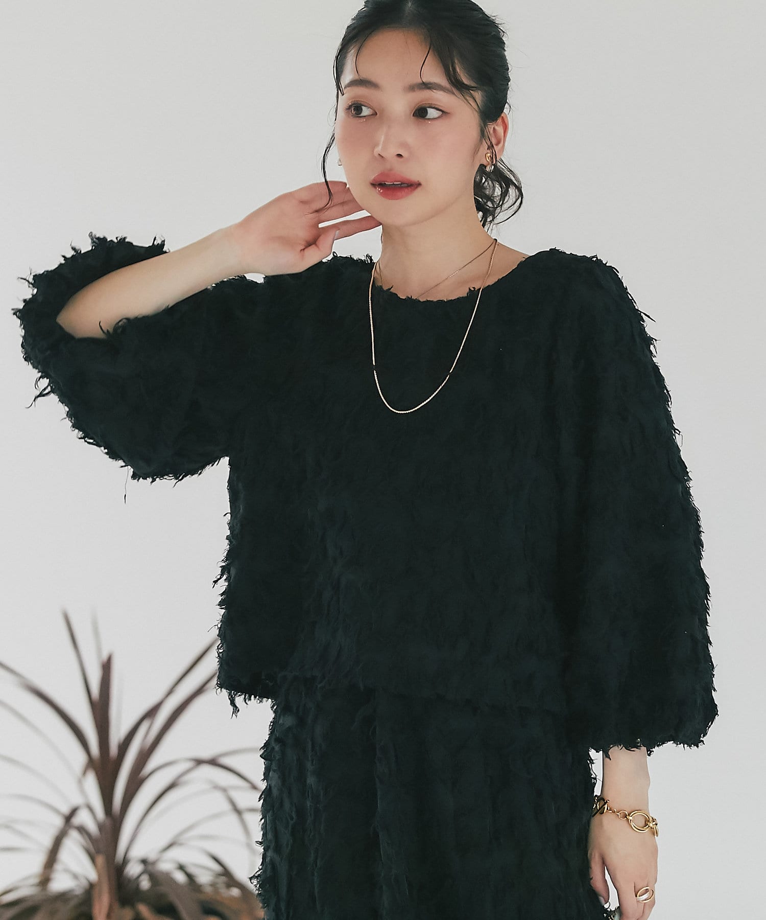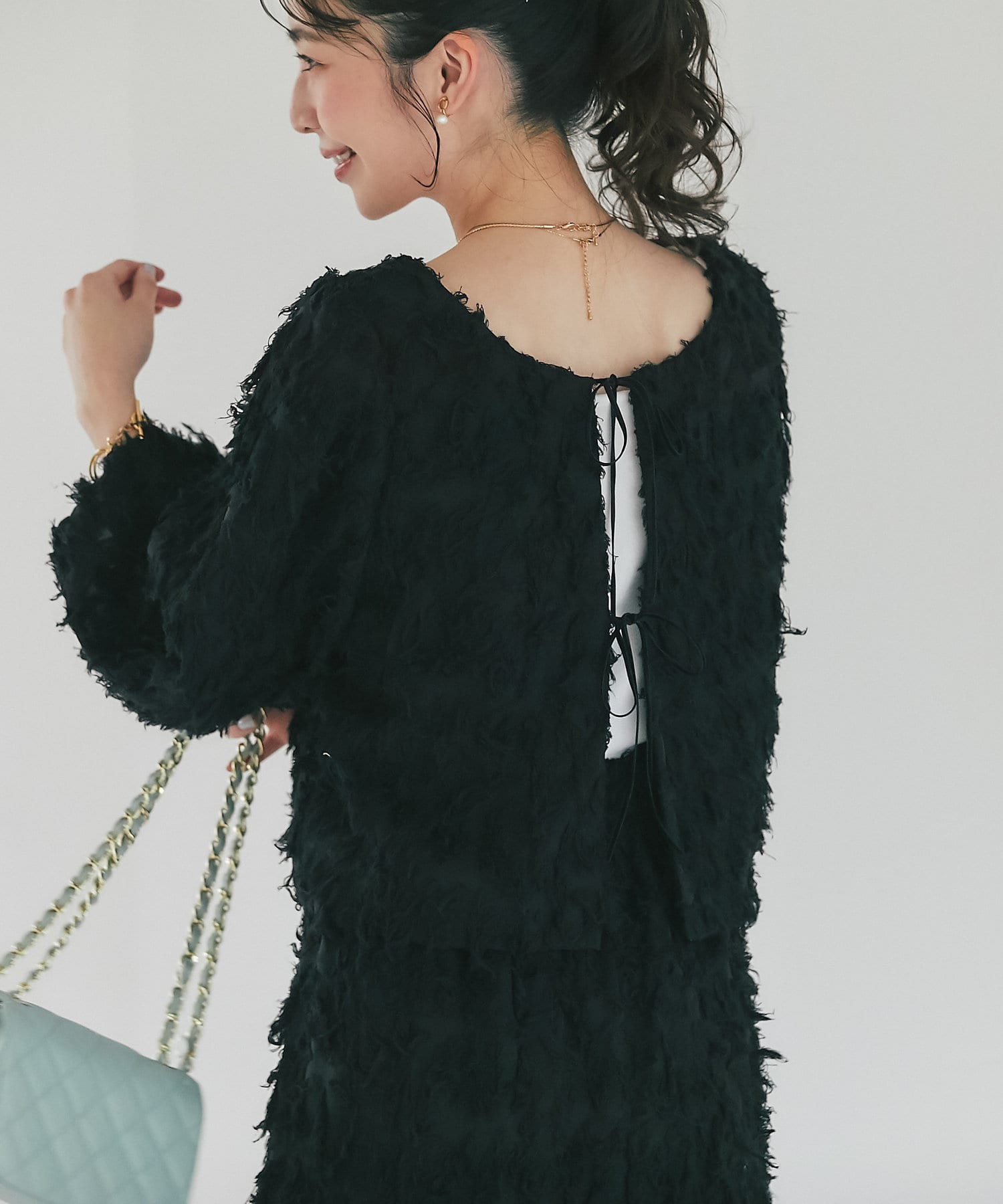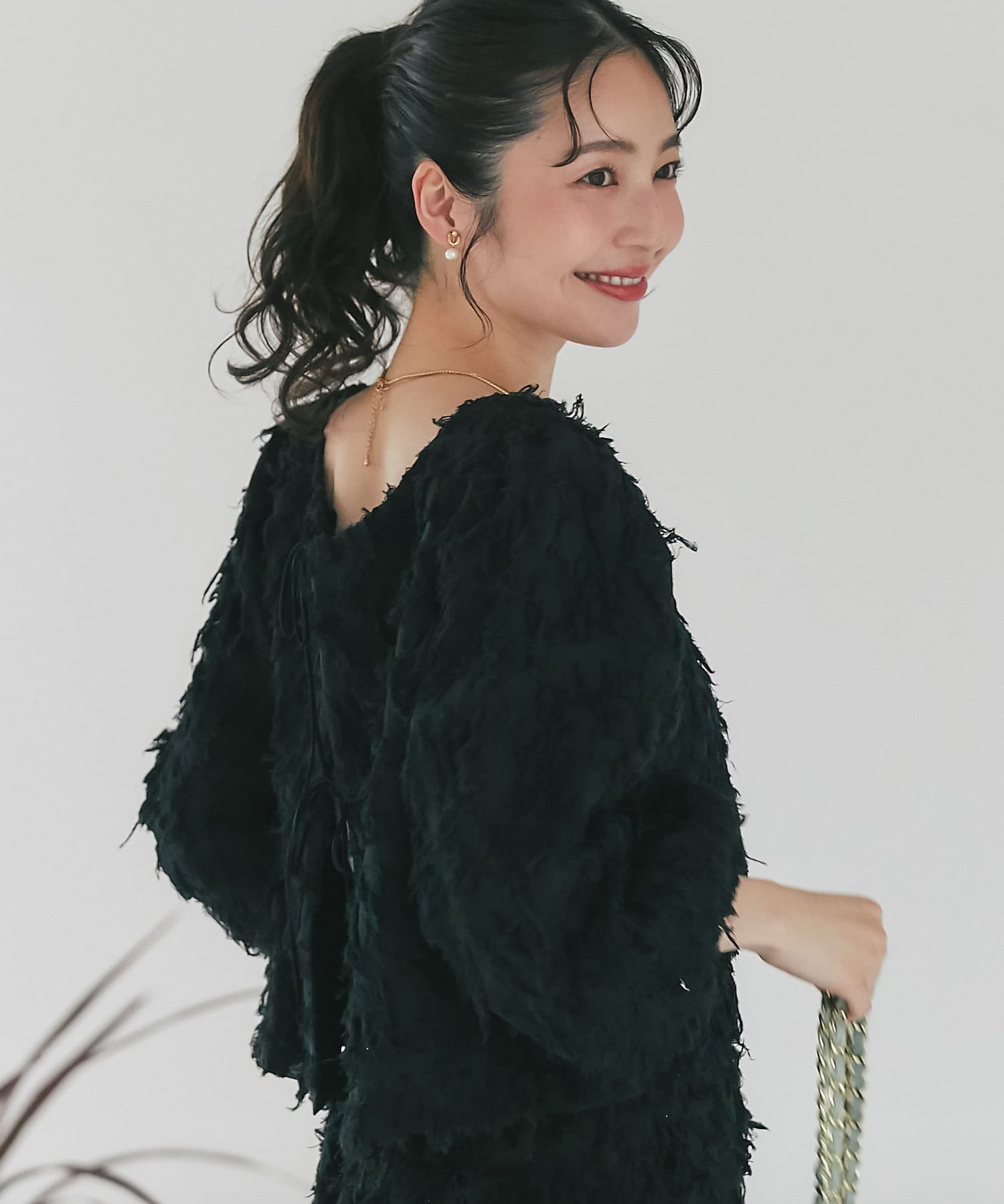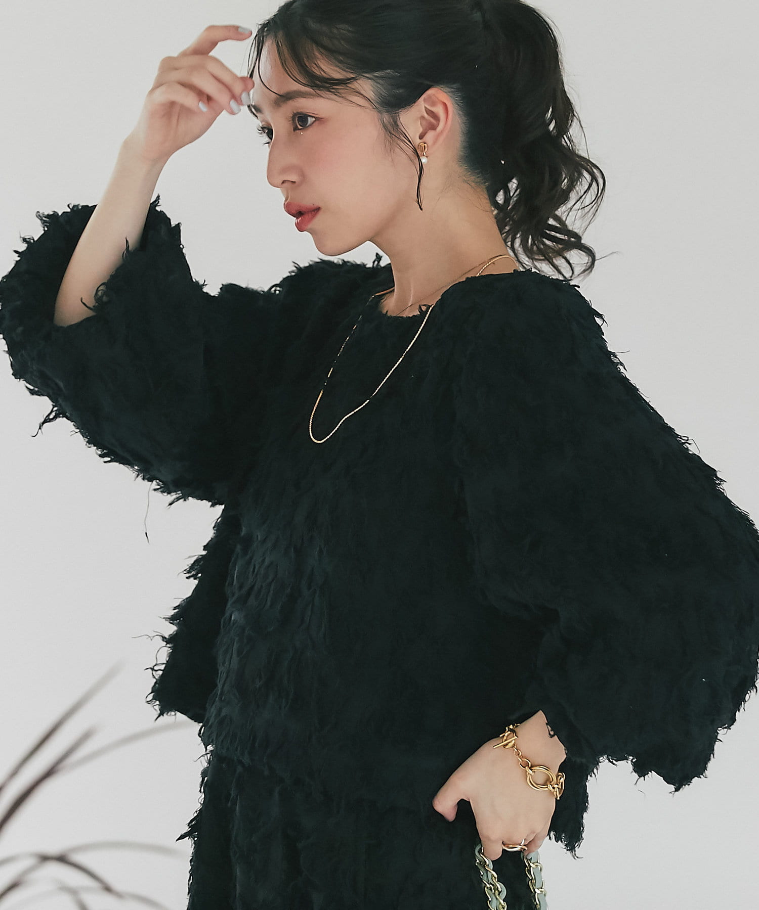 ふわふわとなびく毛足が特徴的な素材感。ペプラムにバルーン袖がポイントです。