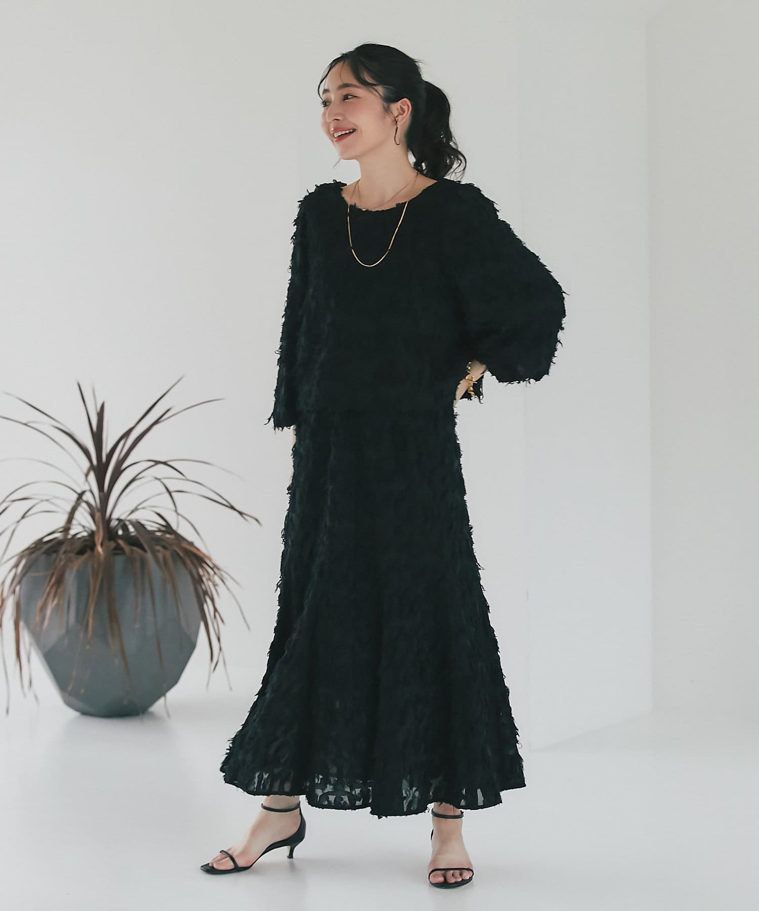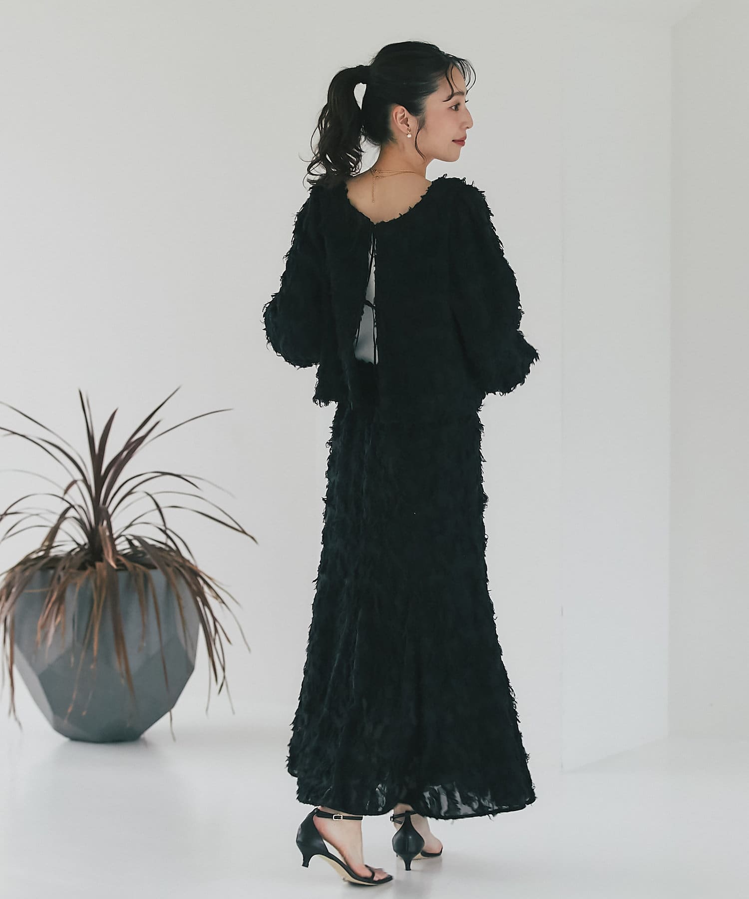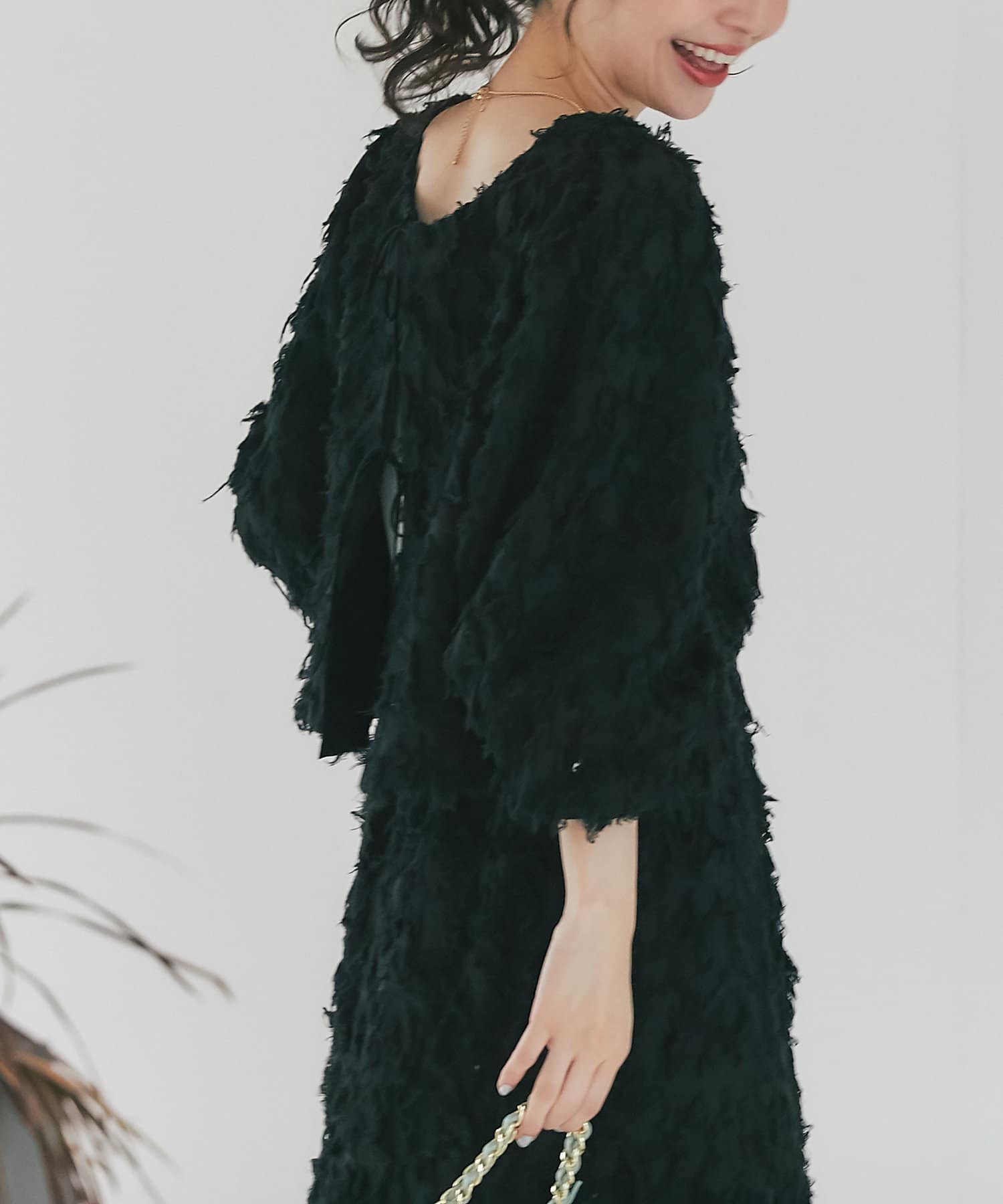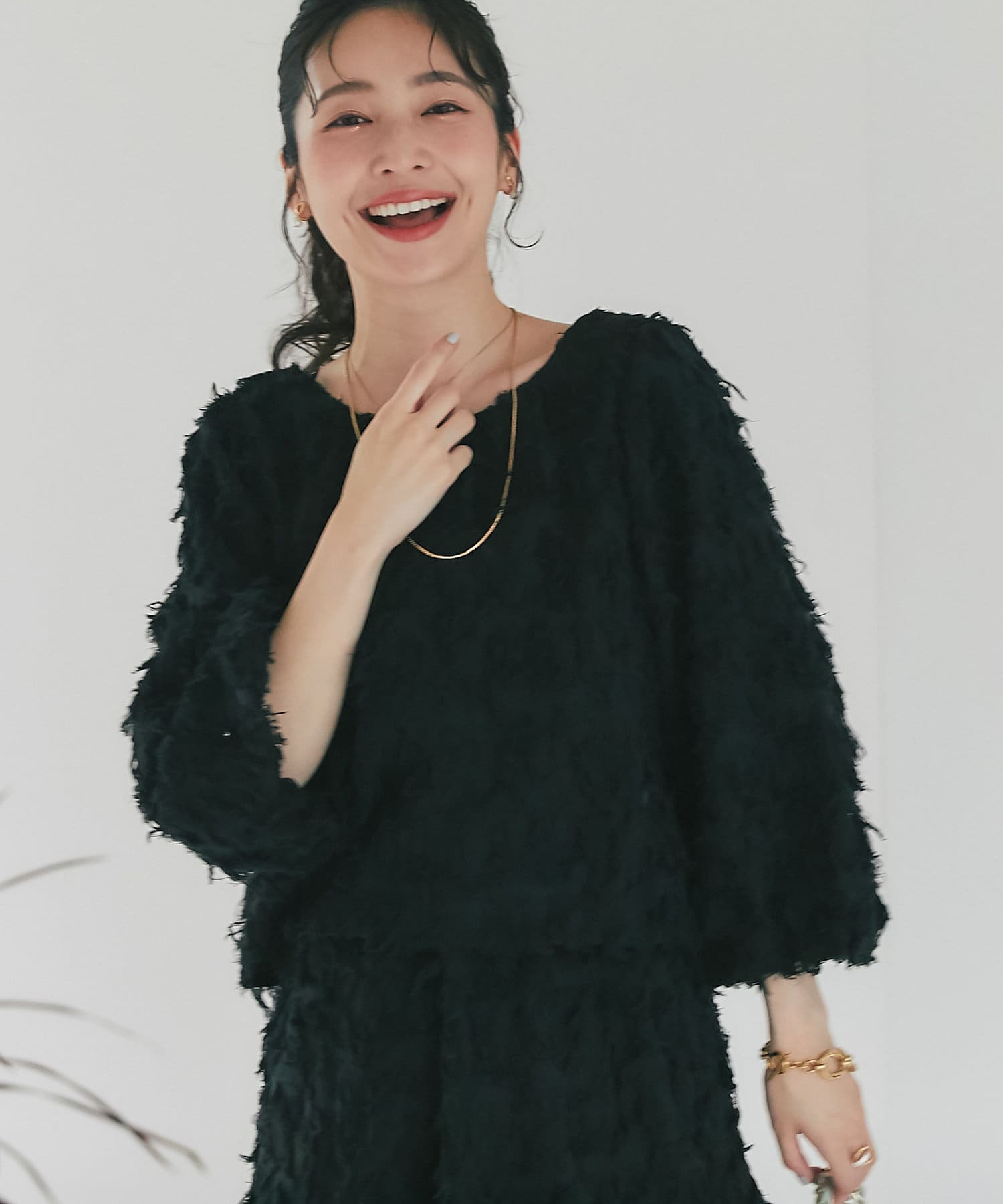 ふわふわとなびく毛足が特徴的な素材感。ペプラムにバルーン袖がポイントです。