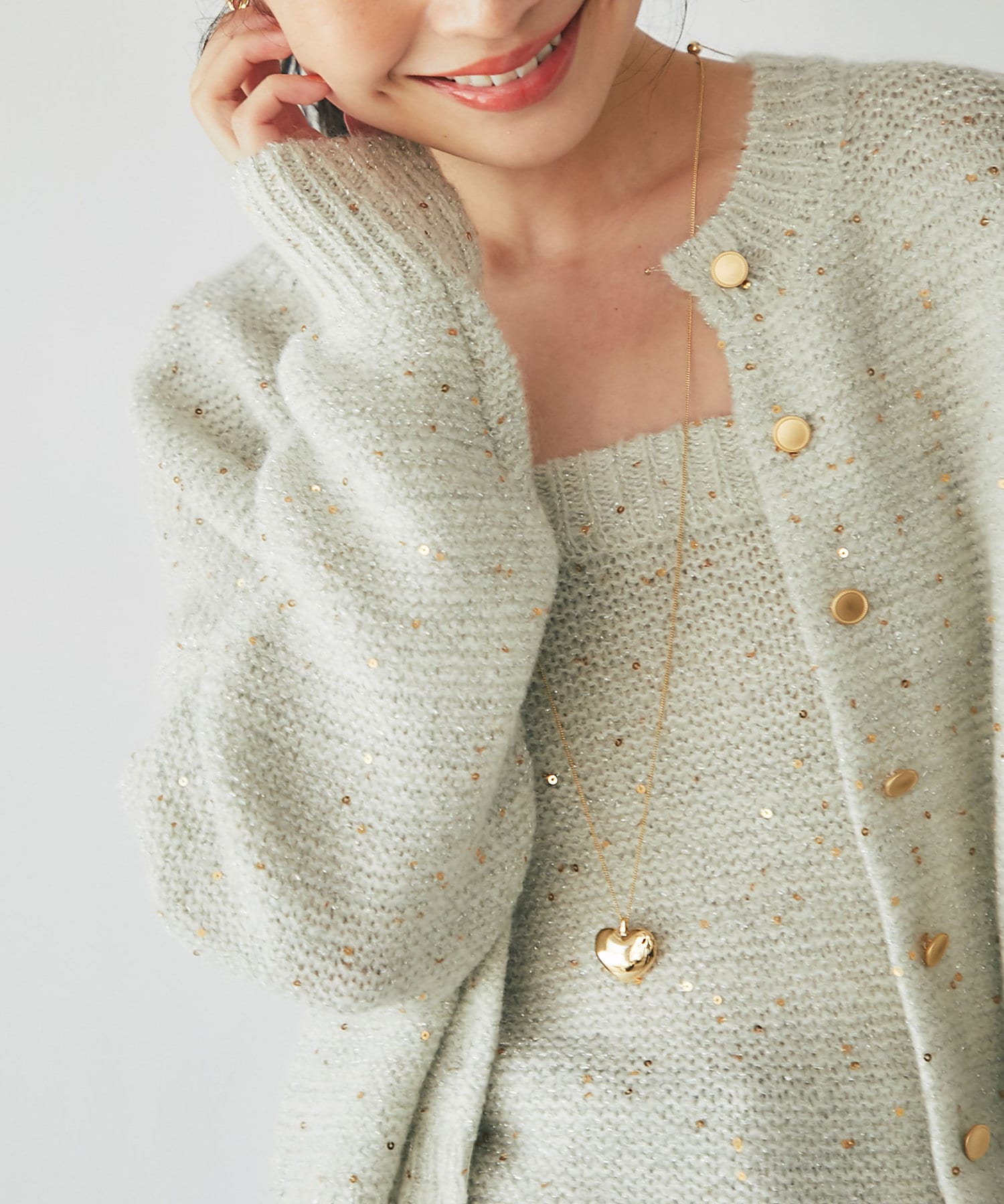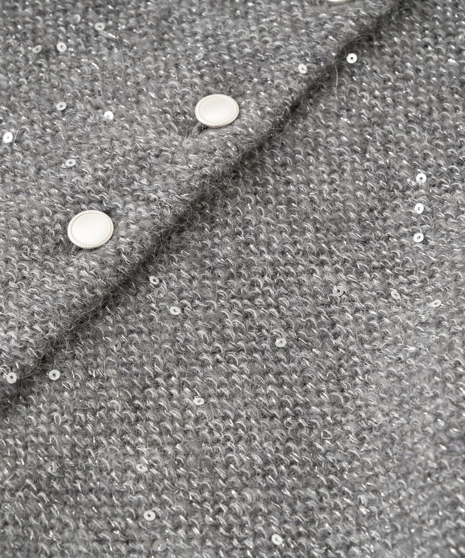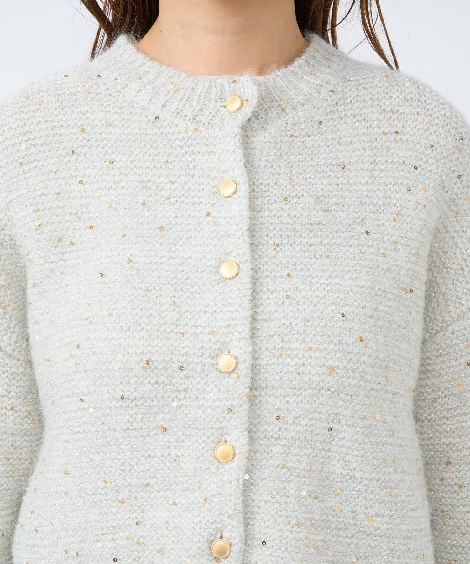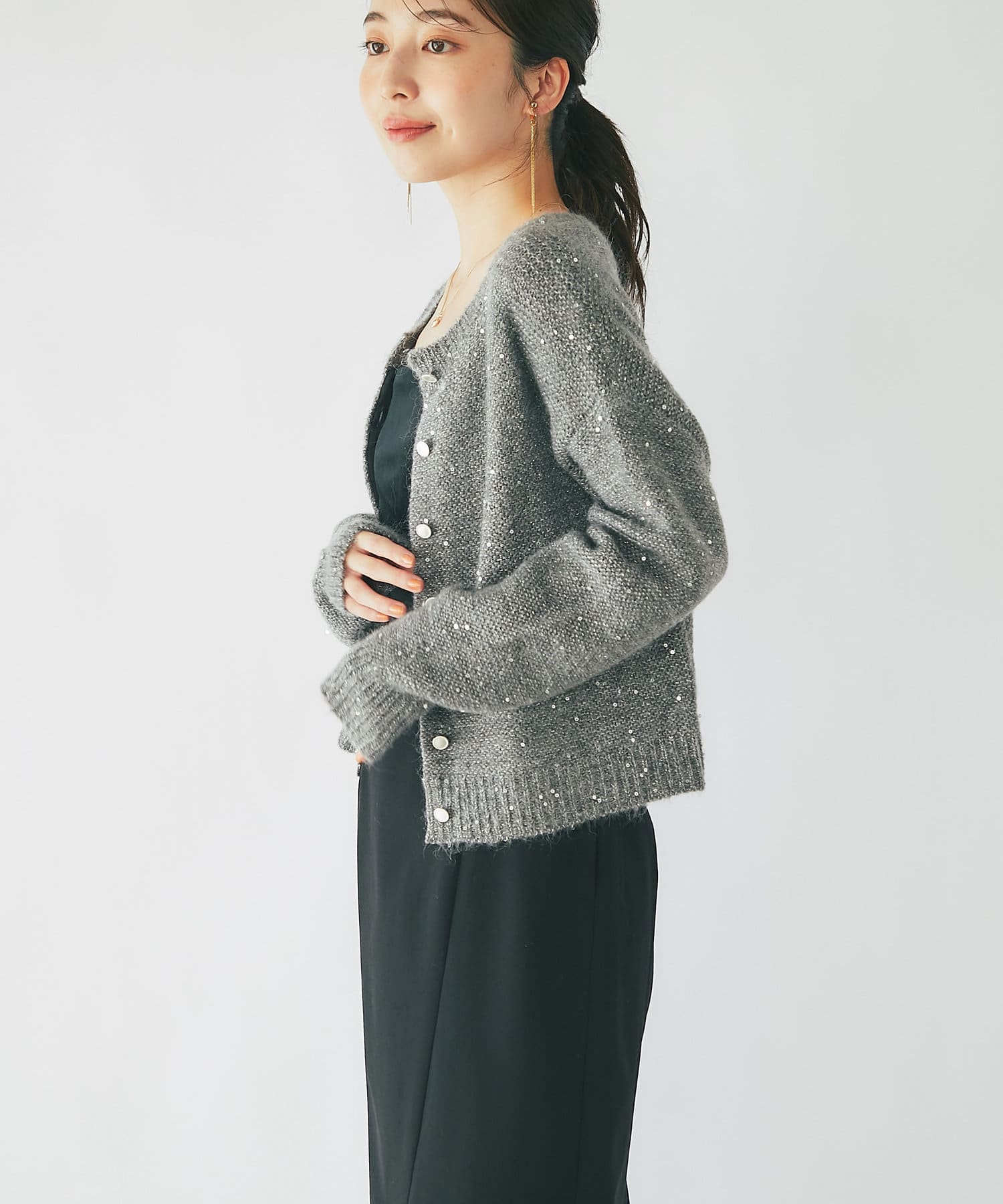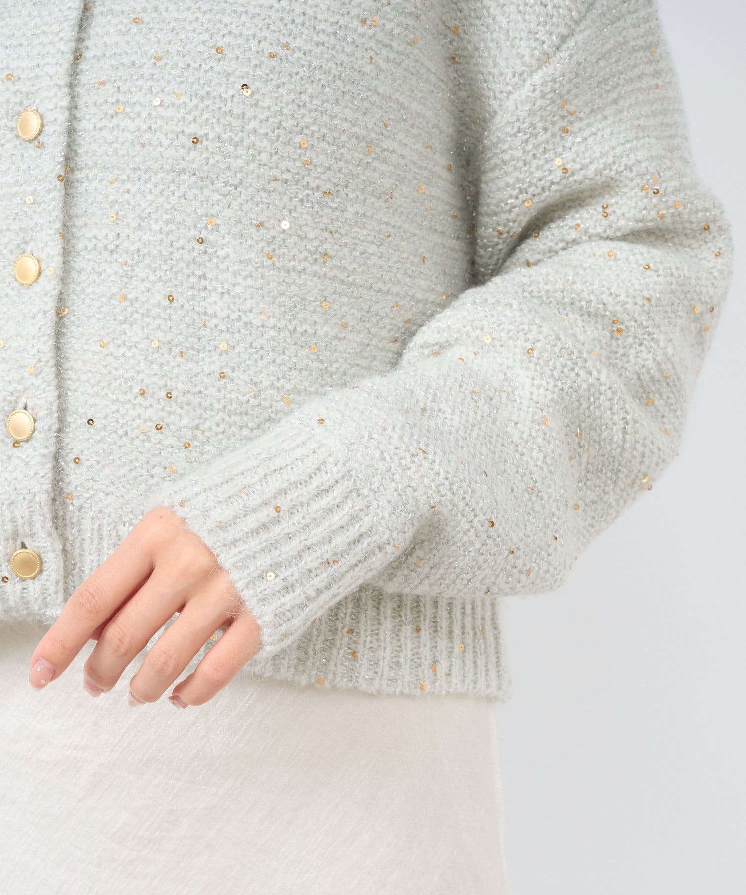 モヘア混の糸にスパンコールを編み込んだ表情感のある華やかニットカーデ。