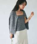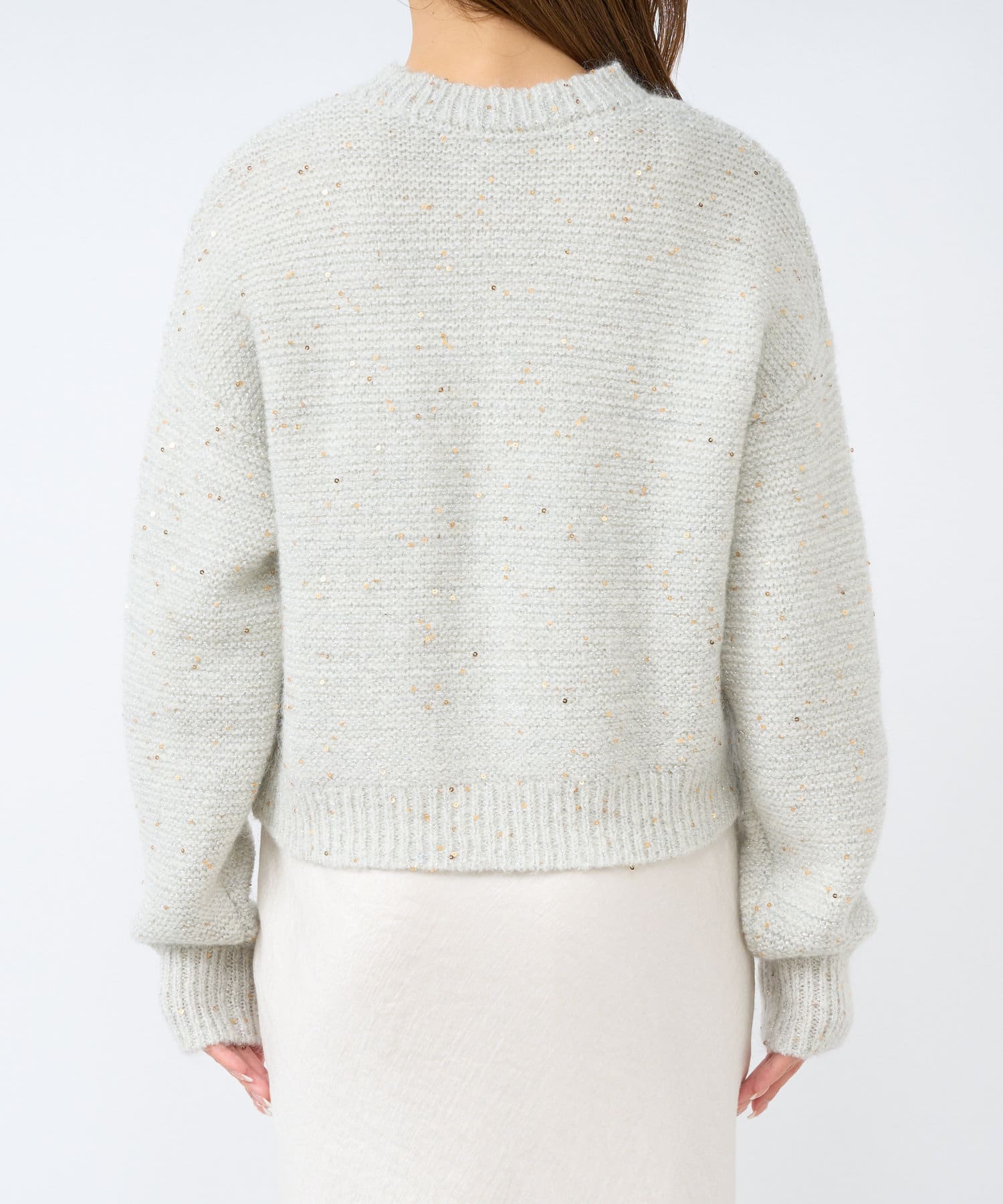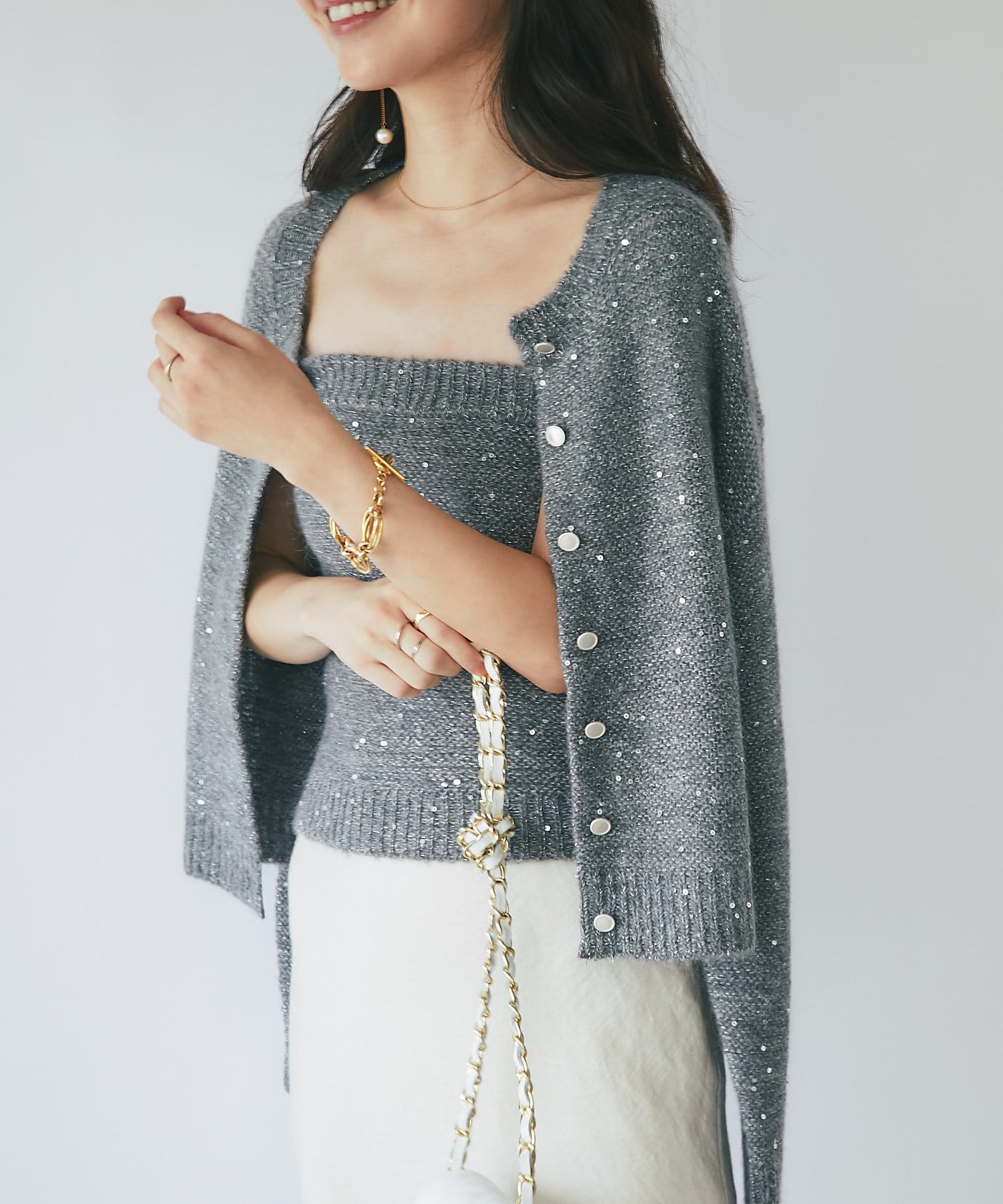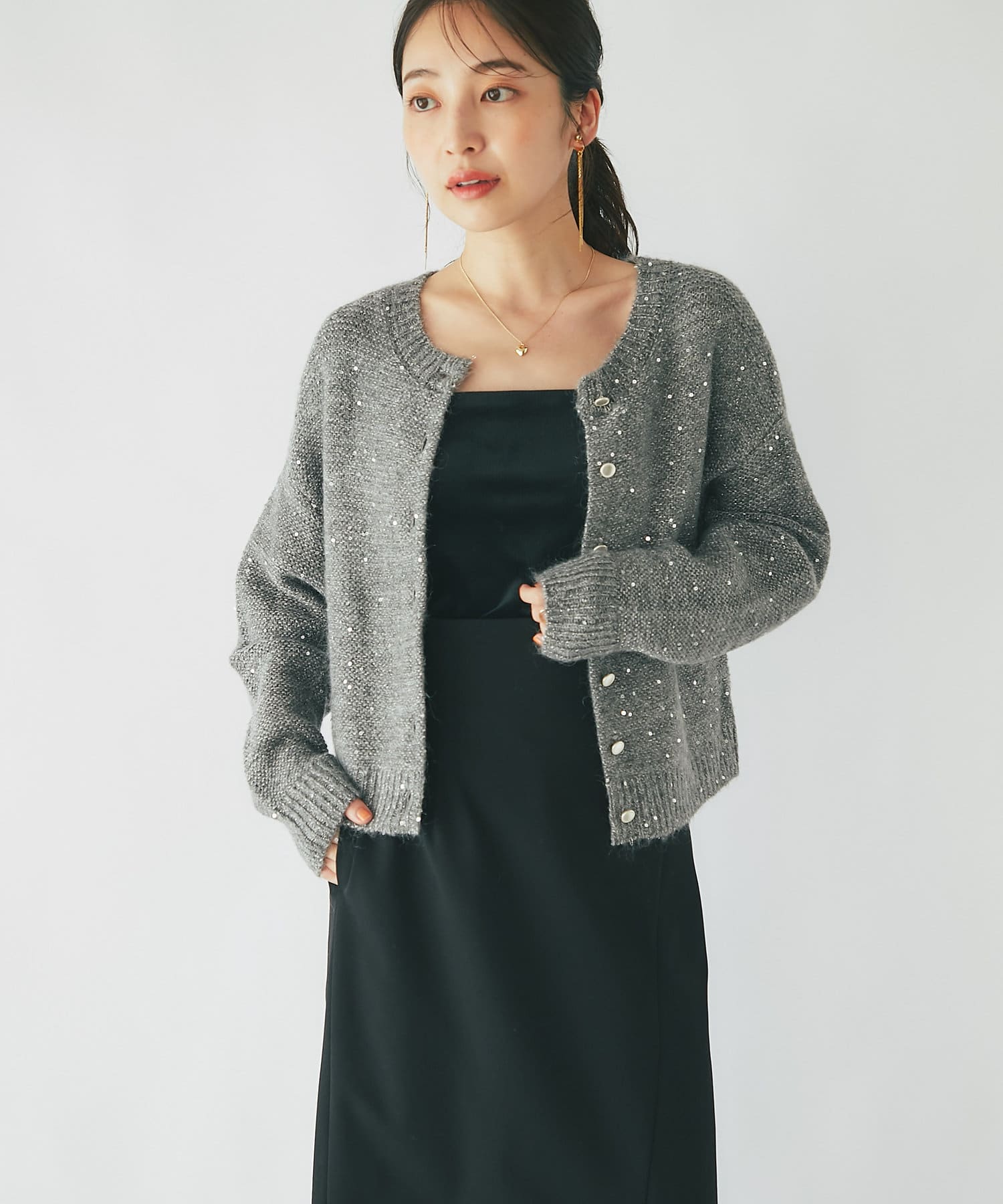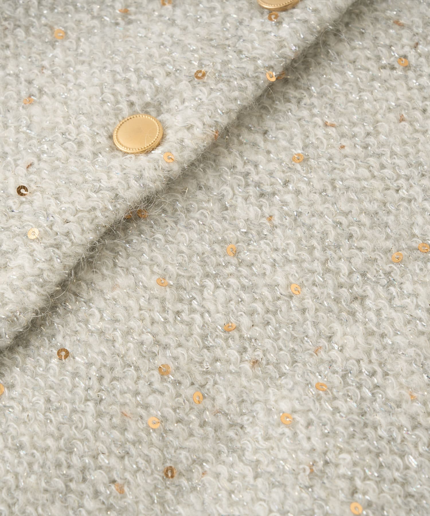 モヘア混の糸にスパンコールを編み込んだ表情感のある華やかニットカーデ。
