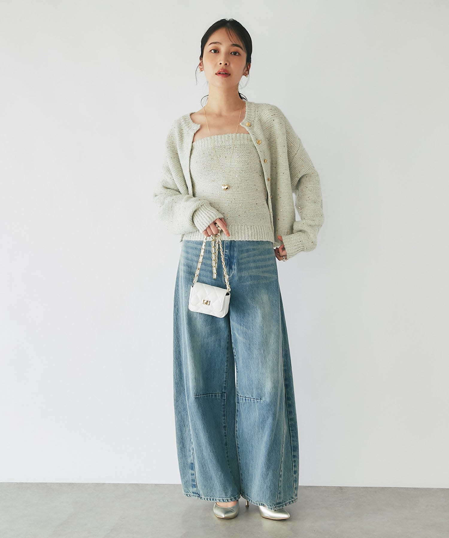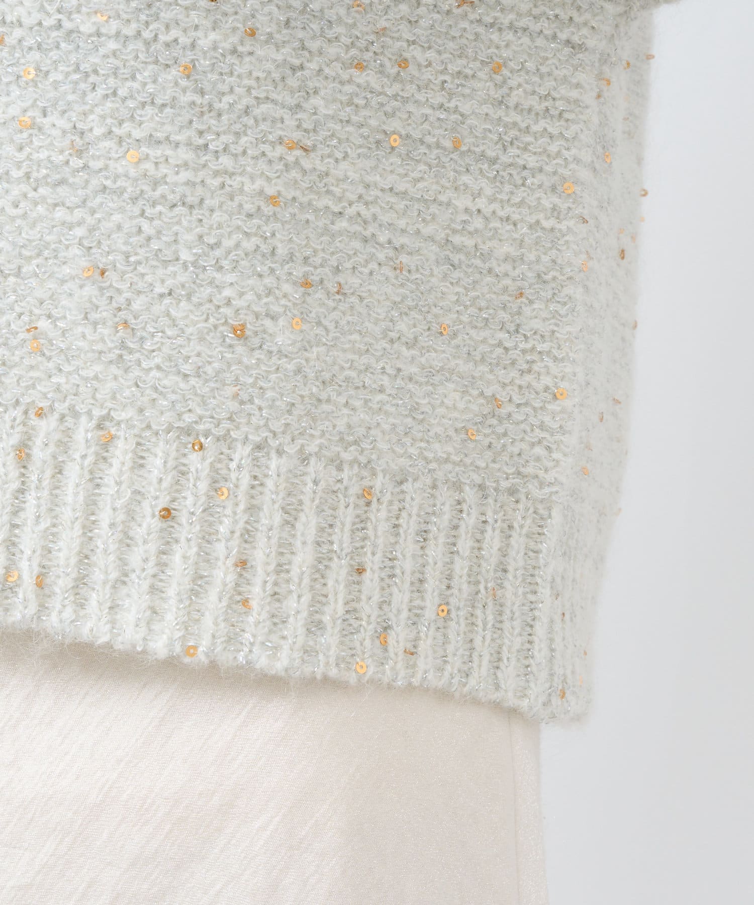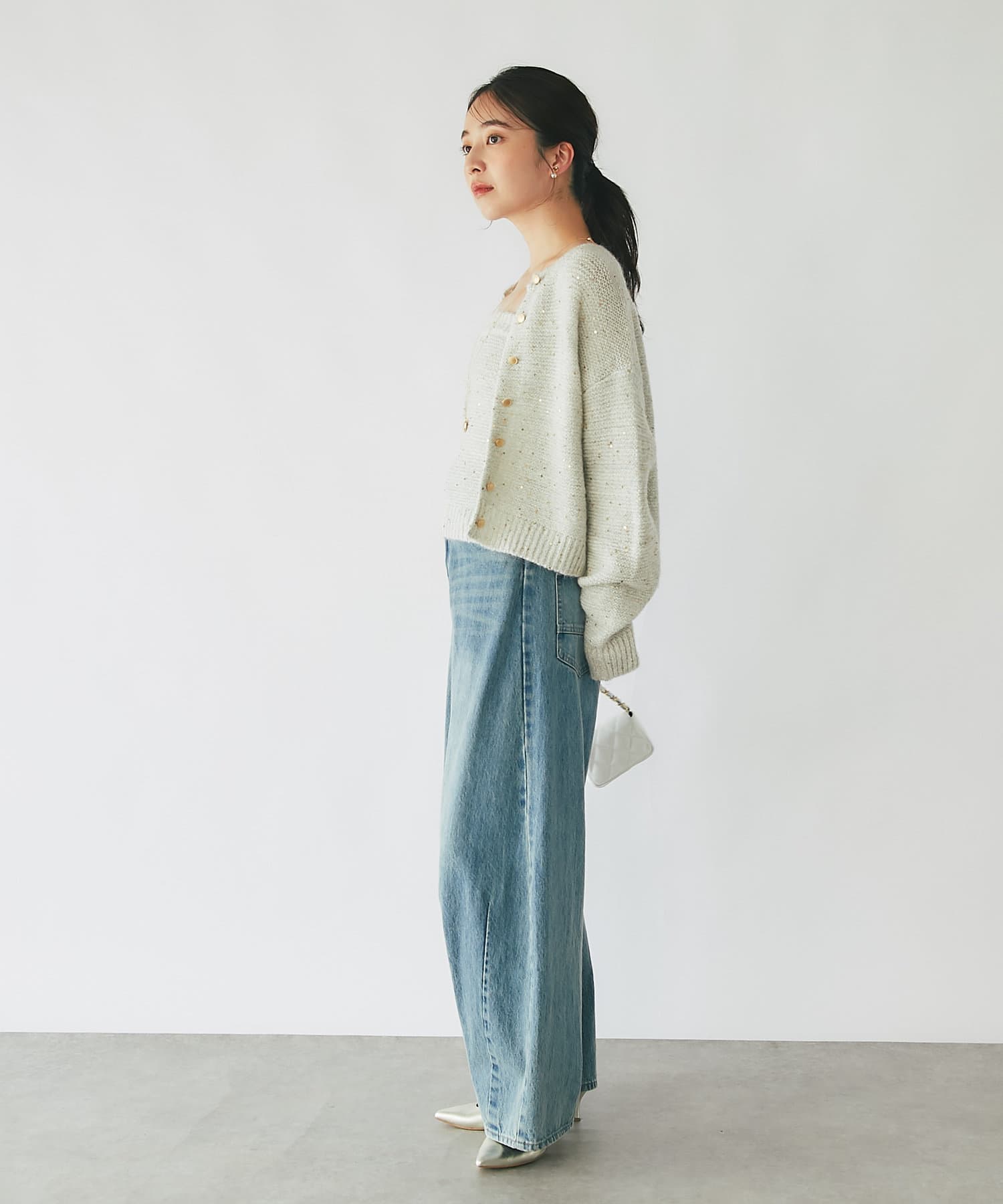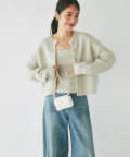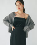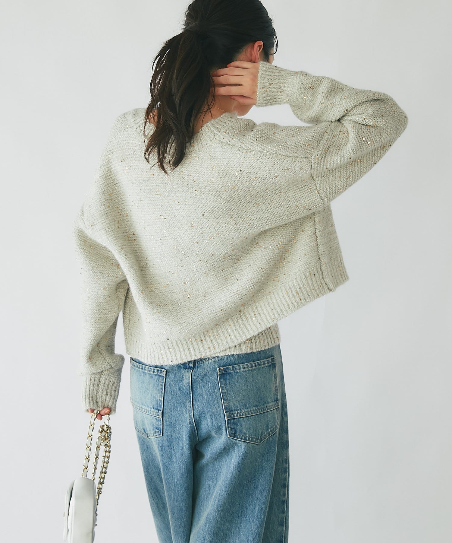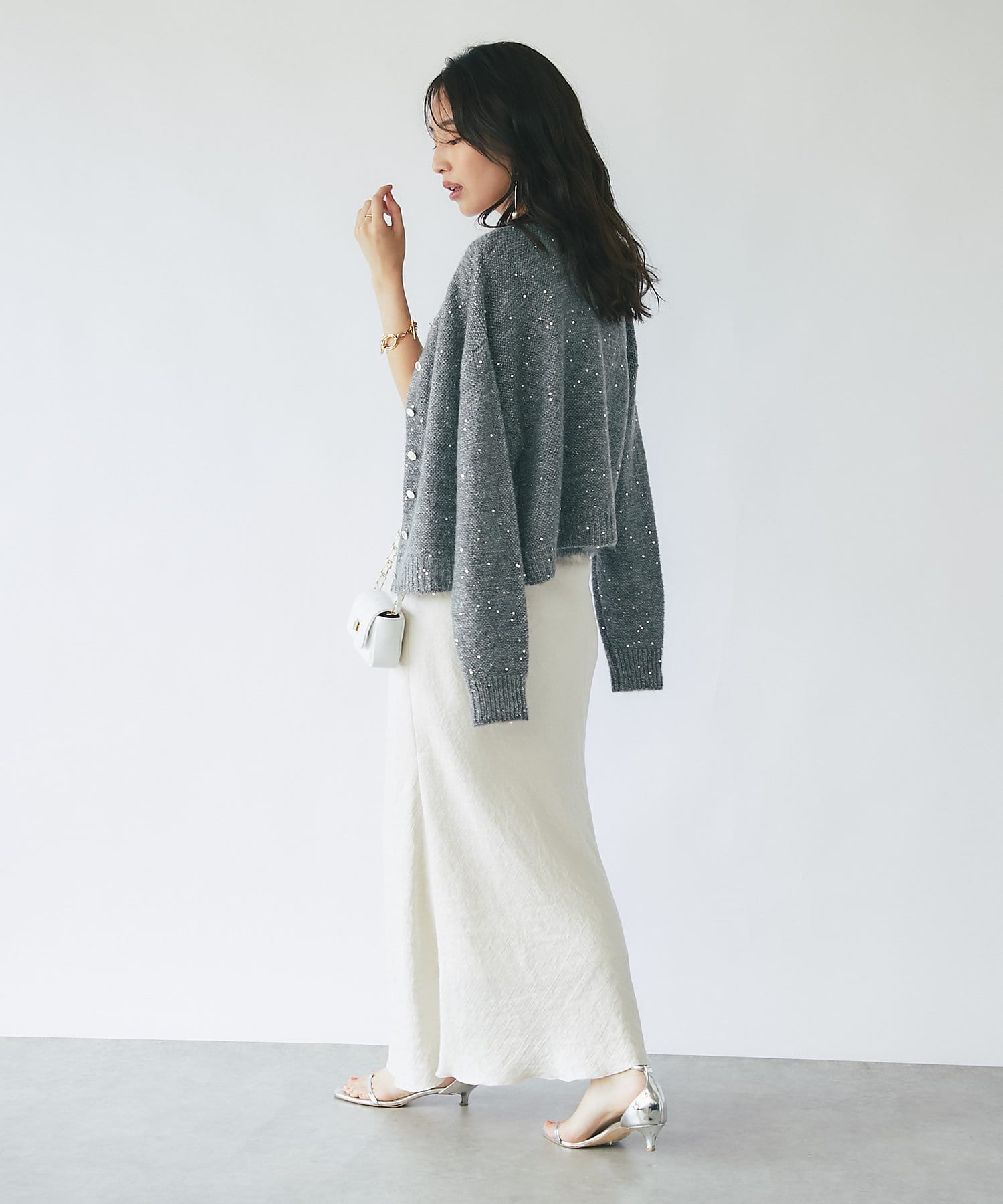 モヘア混の糸にスパンコールを編み込んだ表情感のある華やかニットカーデ。