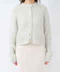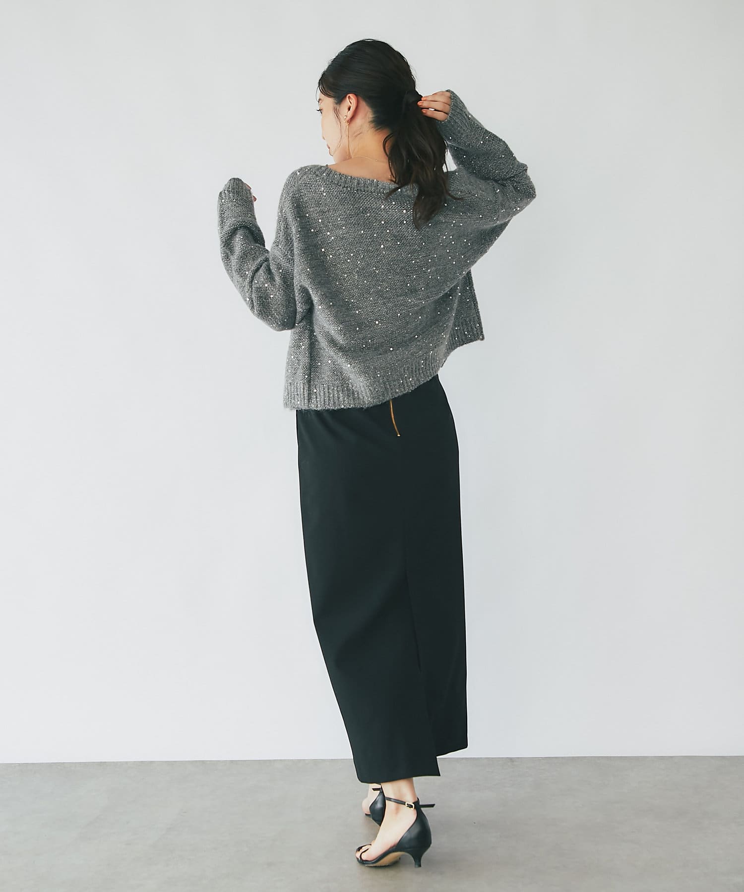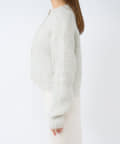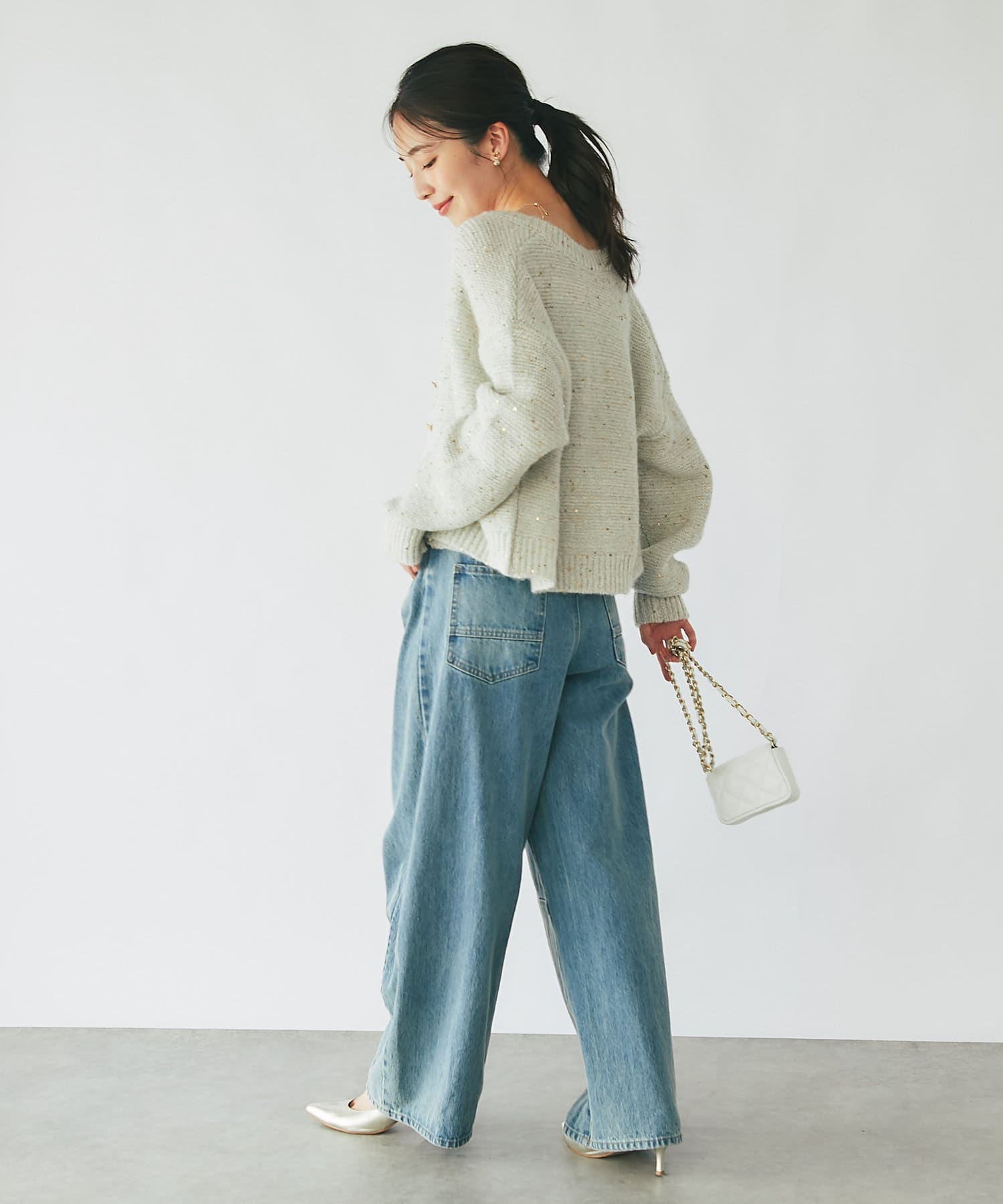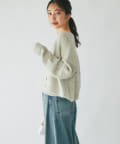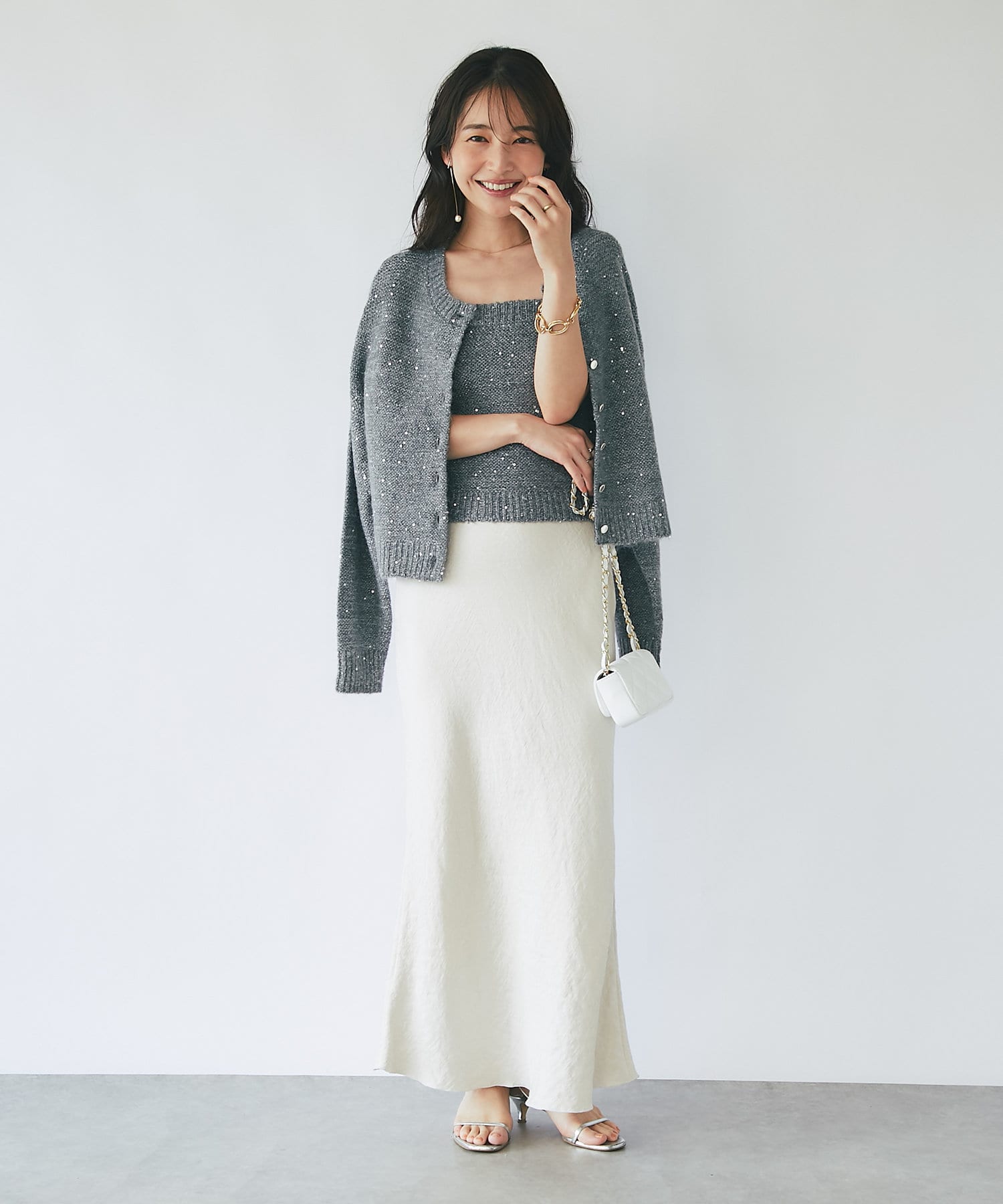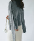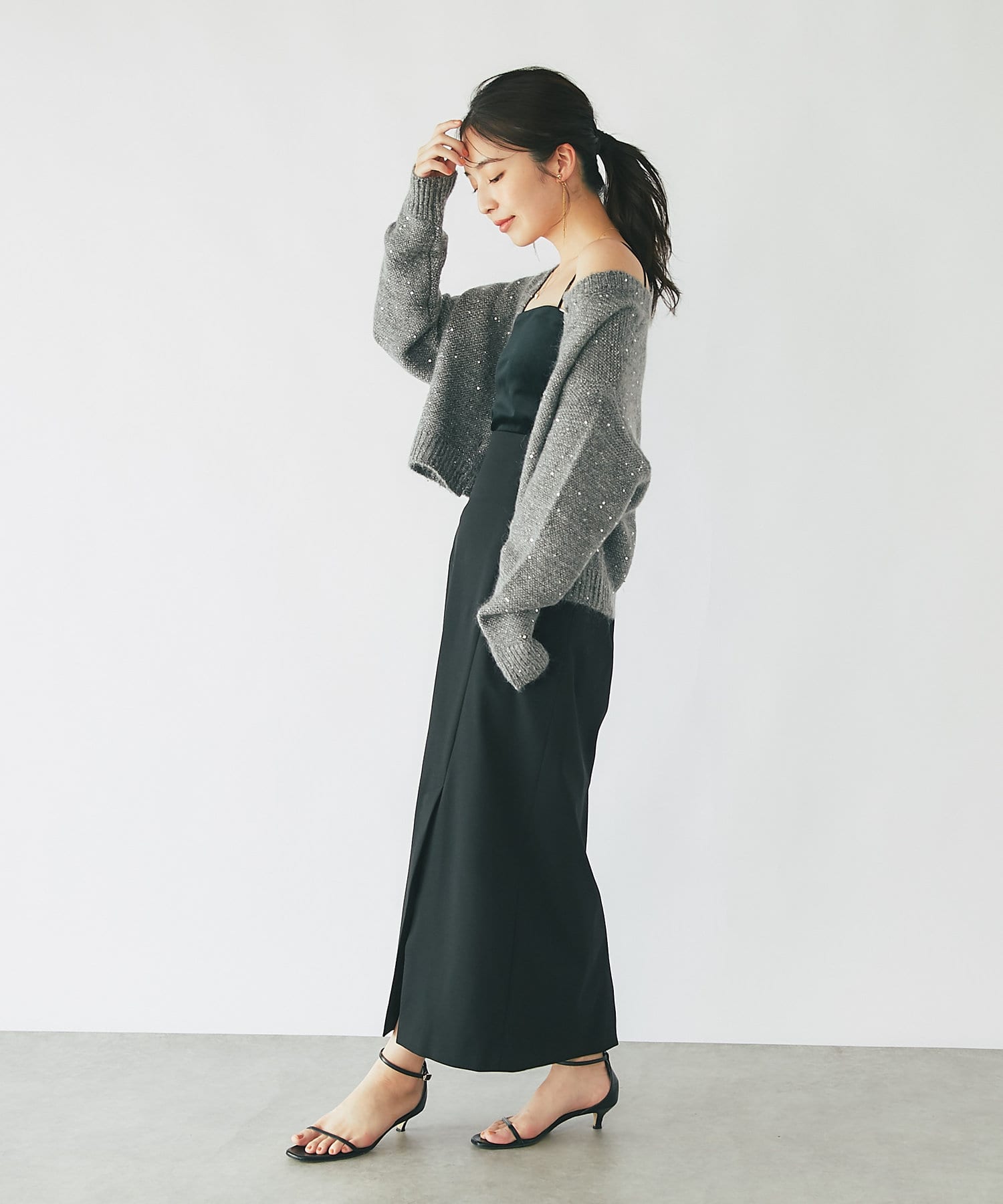 モヘア混の糸にスパンコールを編み込んだ表情感のある華やかニットカーデ。