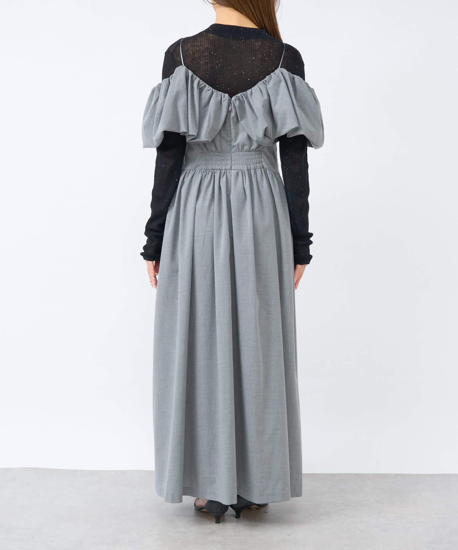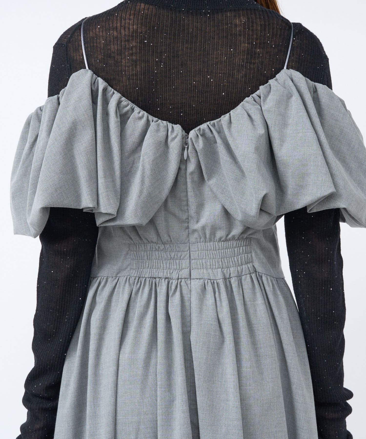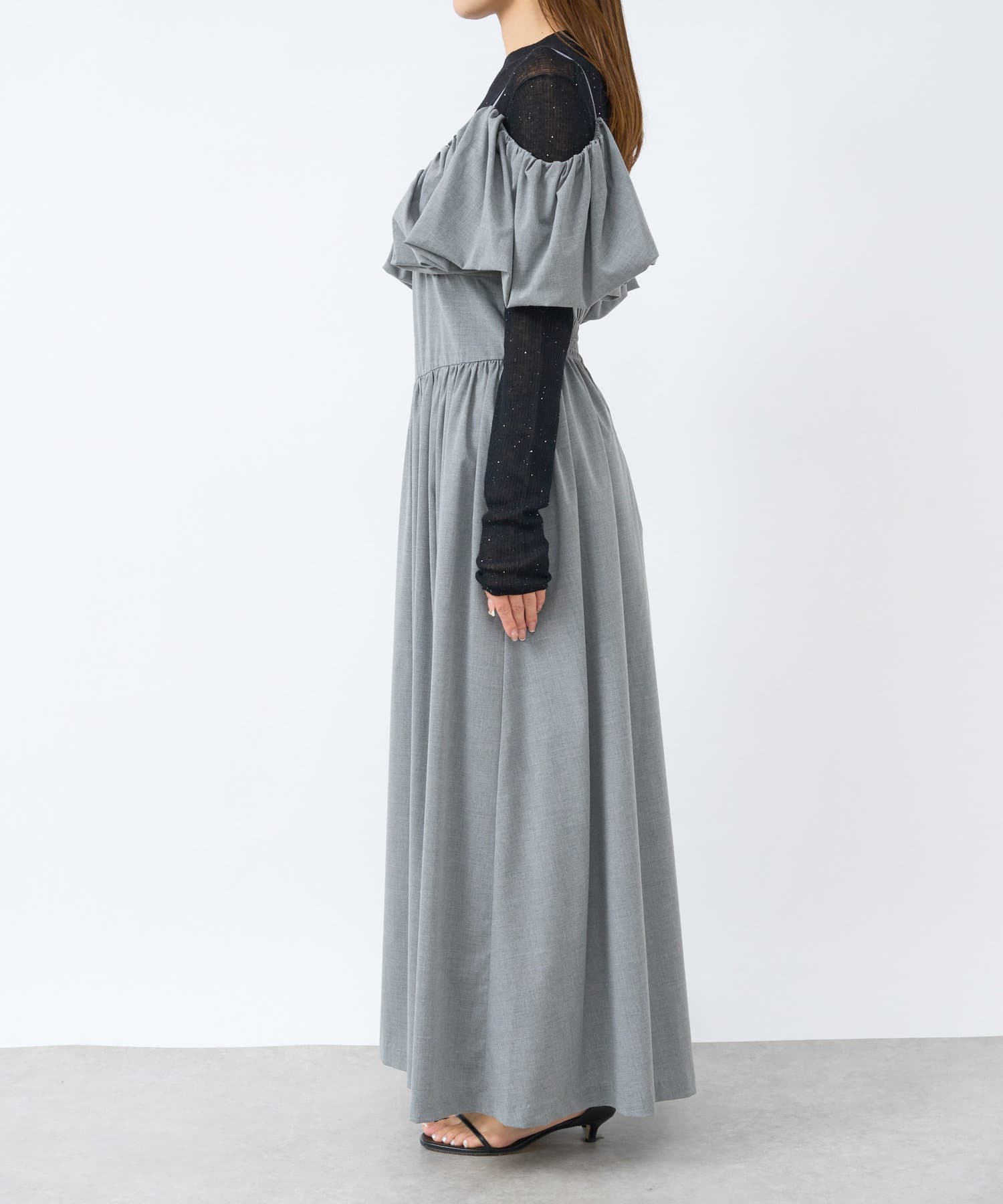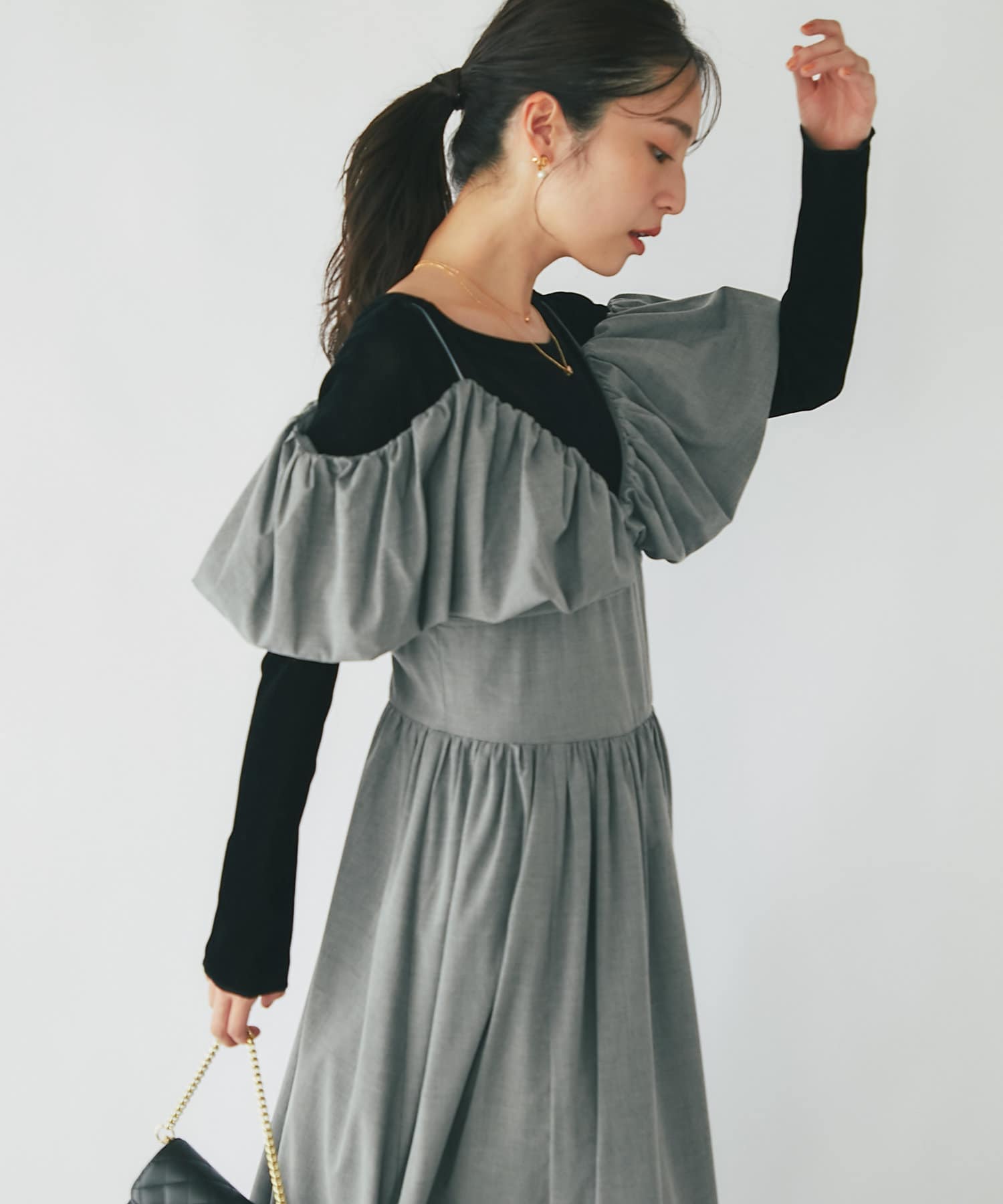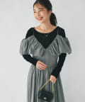 ふんわりとしたバルーンのフリルと贅沢に広がるフレアスカートのシルエットがフェミニンな雰囲気を演出します。