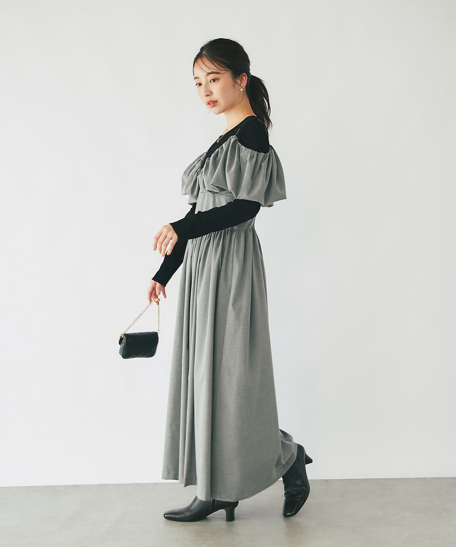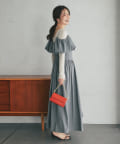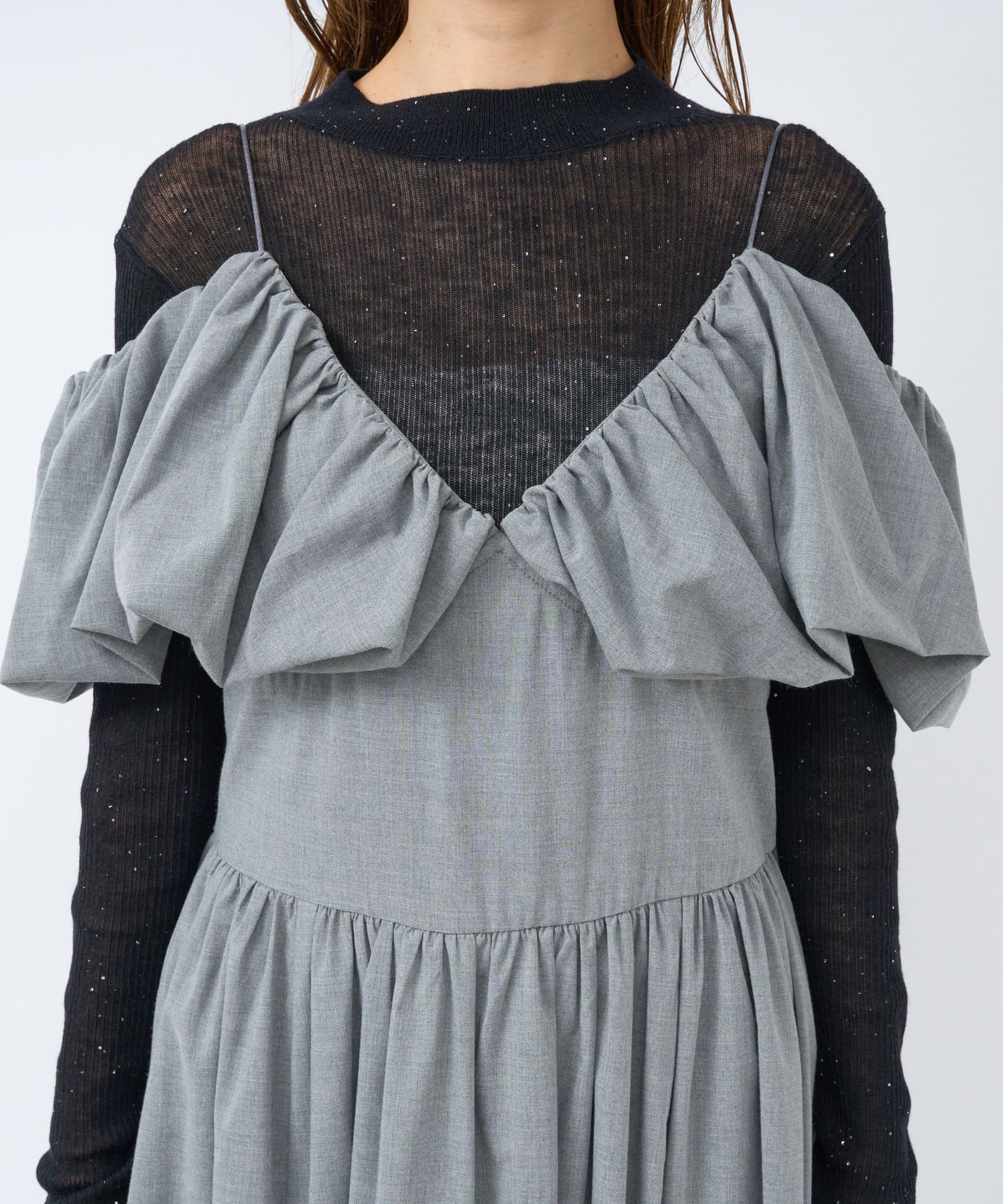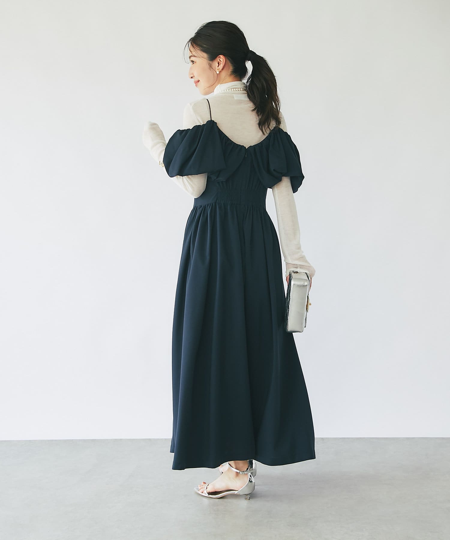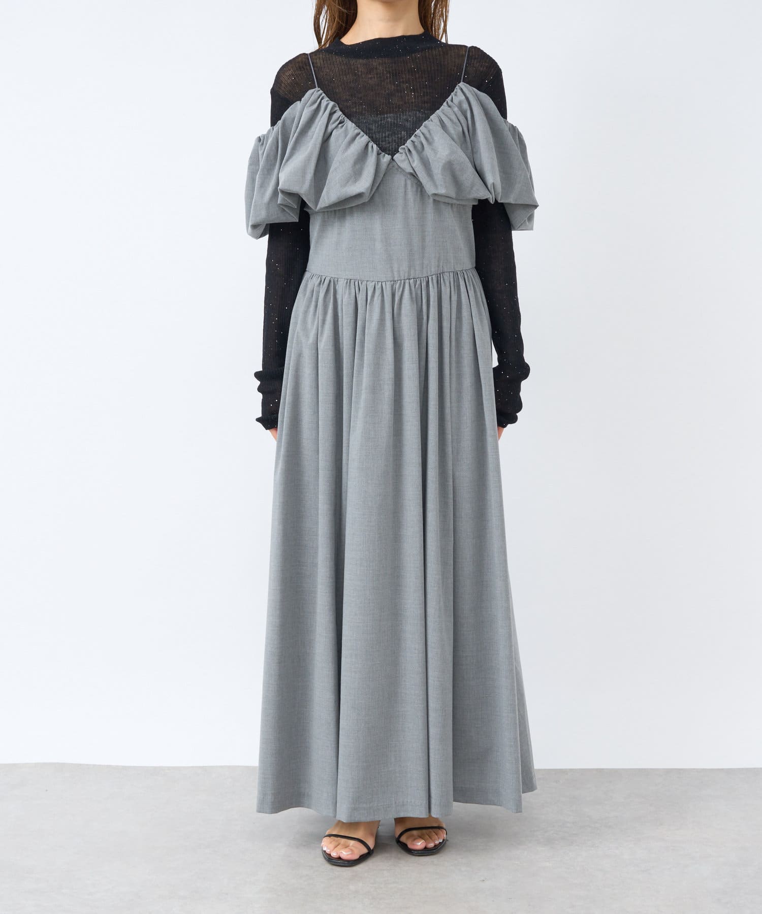 ふんわりとしたバルーンのフリルと贅沢に広がるフレアスカートのシルエットがフェミニンな雰囲気を演出します。