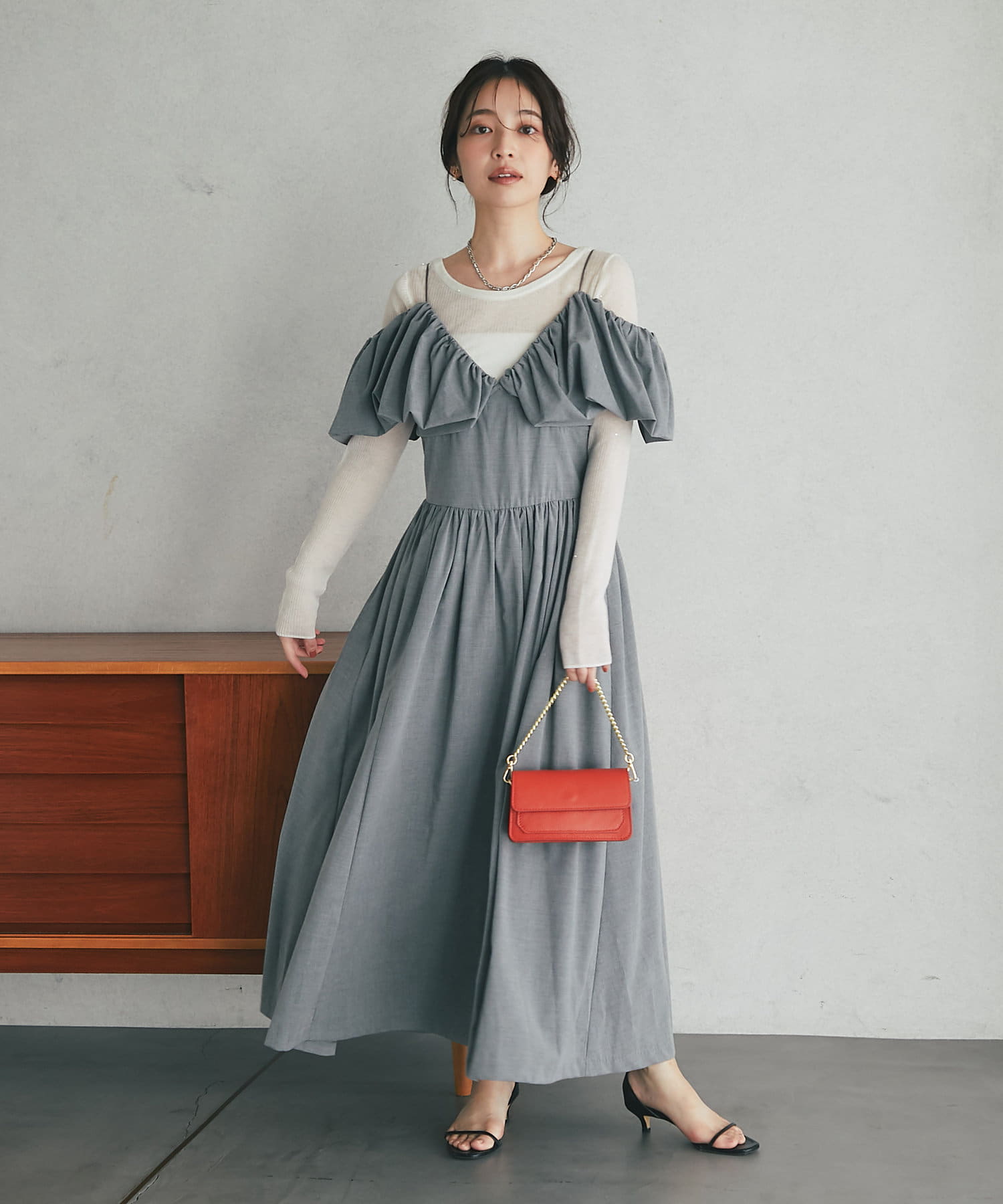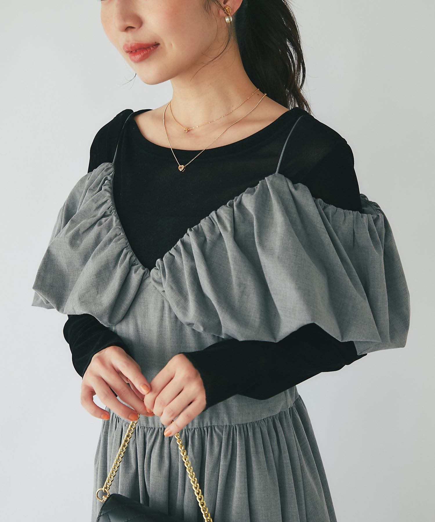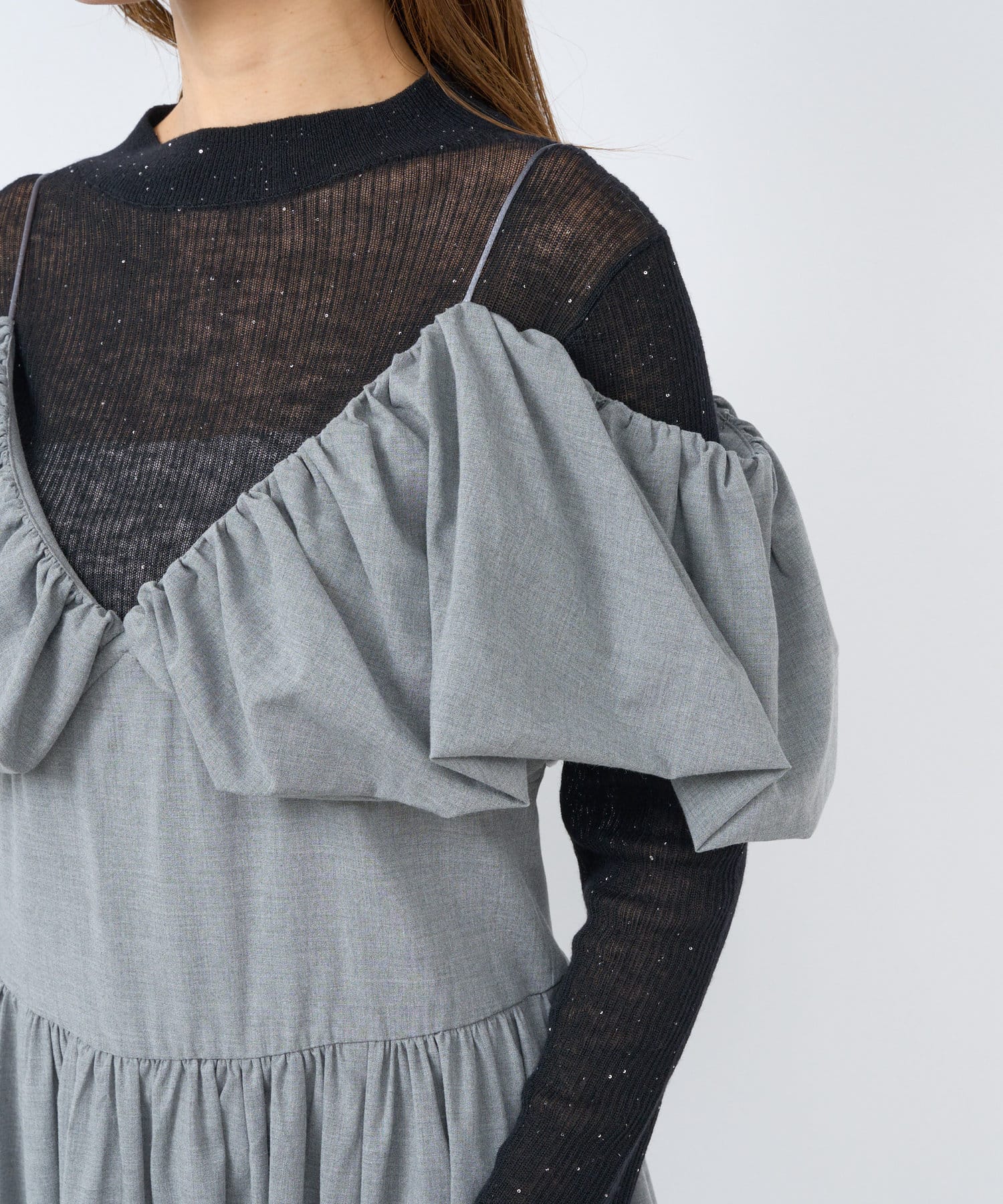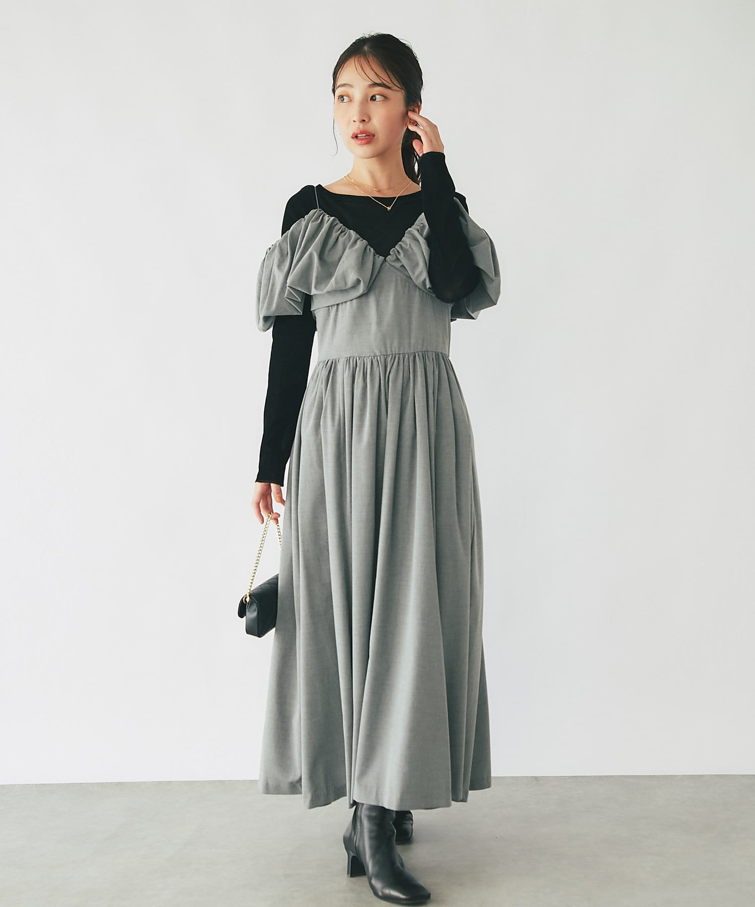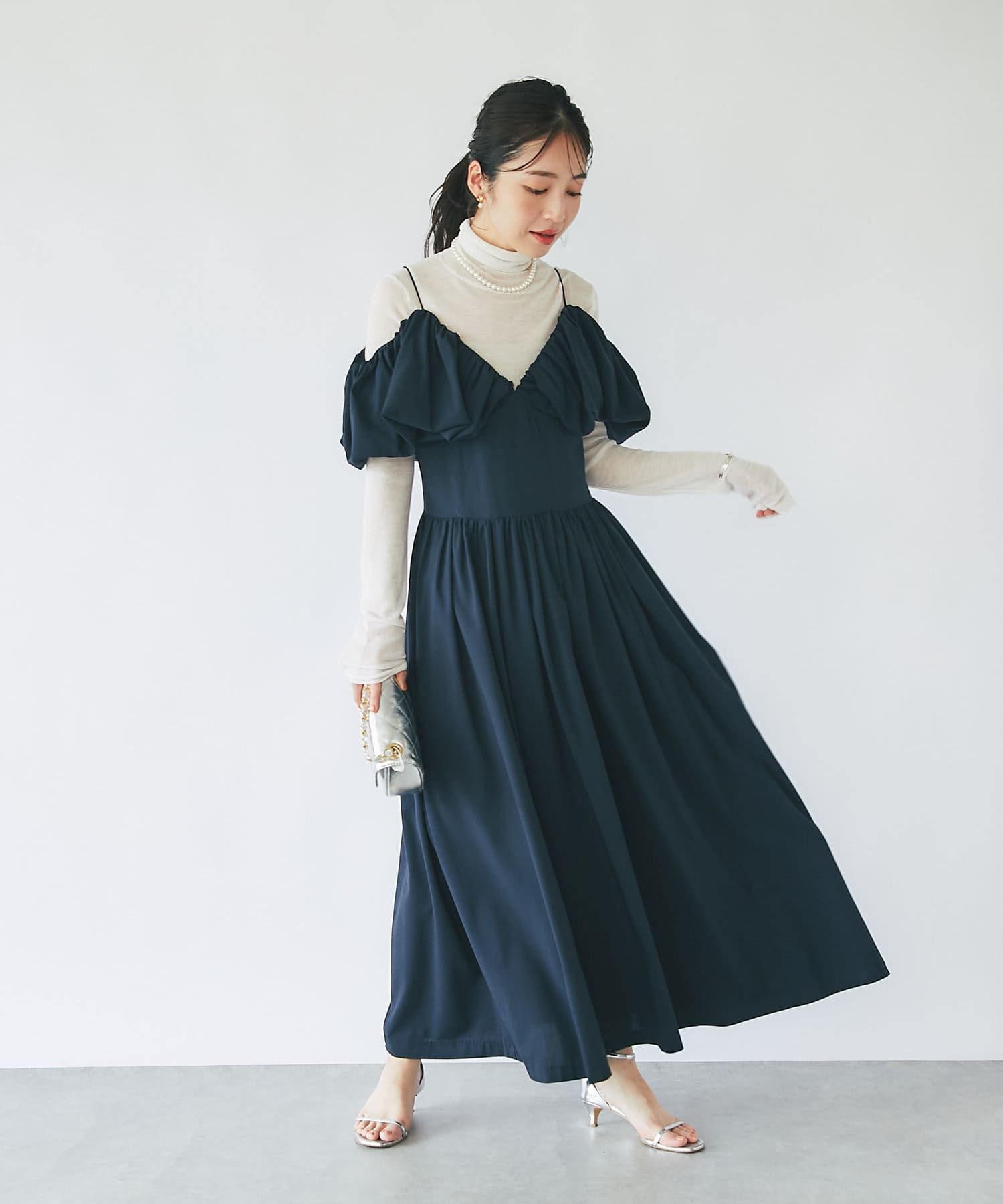 ふんわりとしたバルーンのフリルと贅沢に広がるフレアスカートのシルエットがフェミニンな雰囲気を演出します。