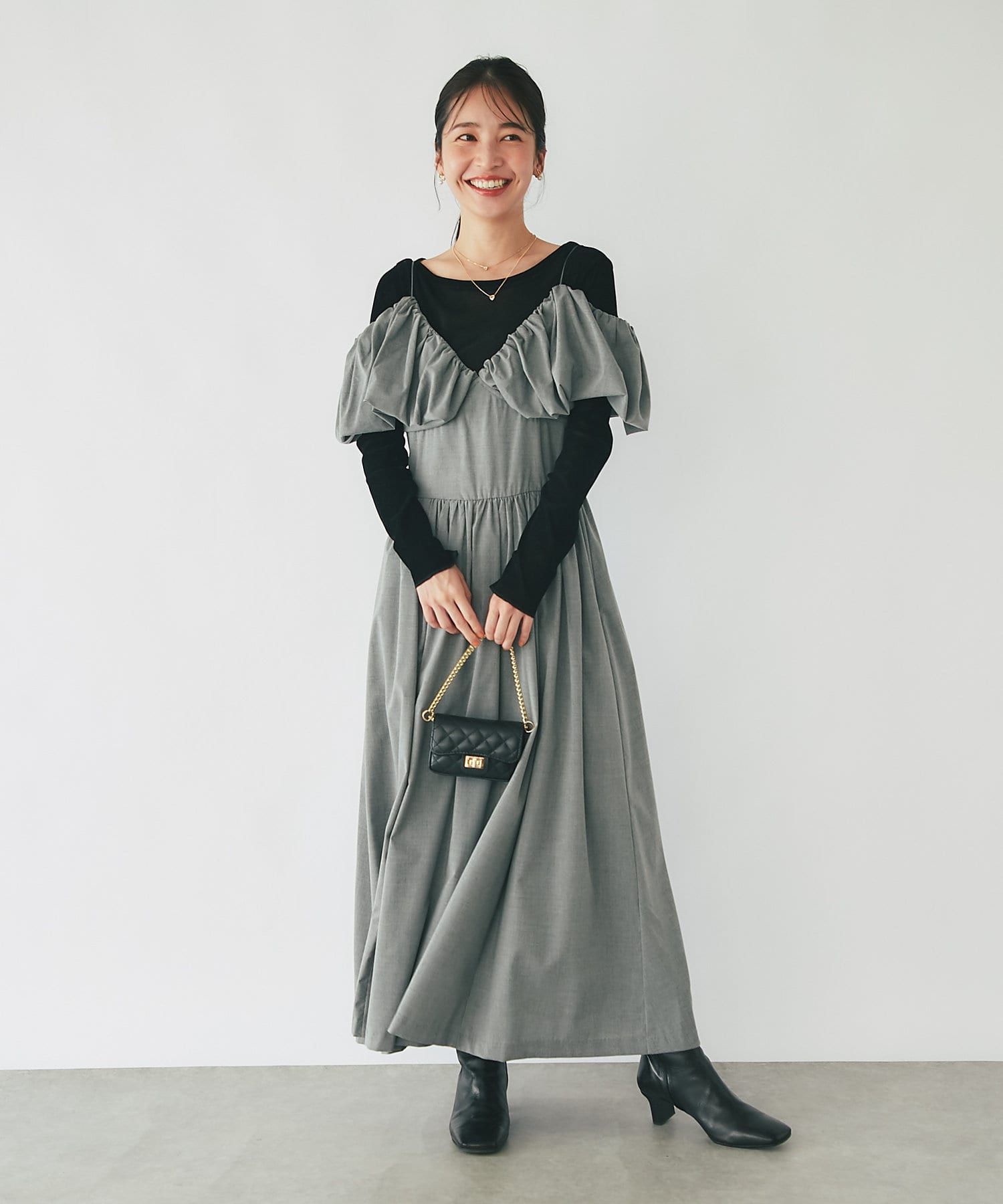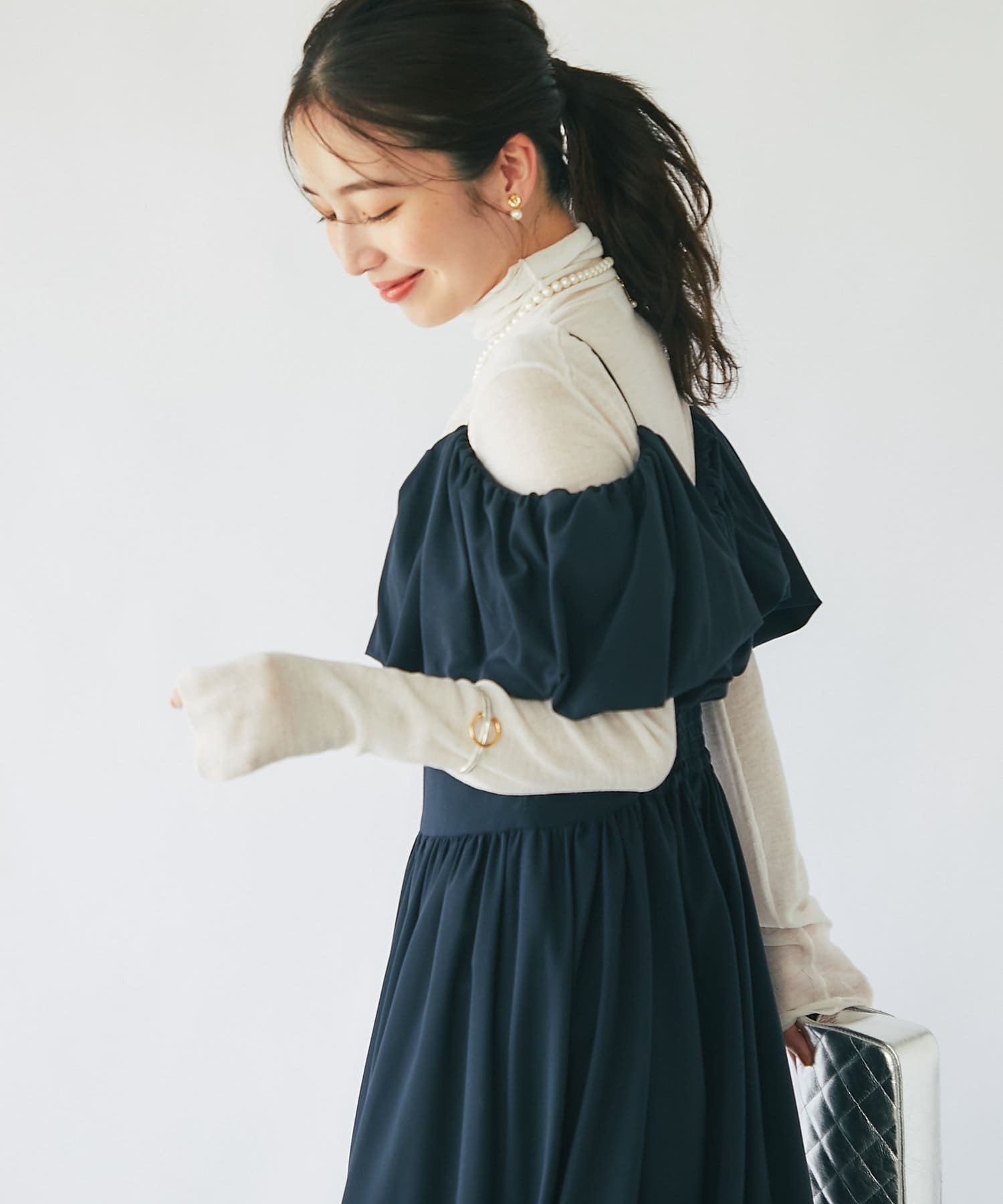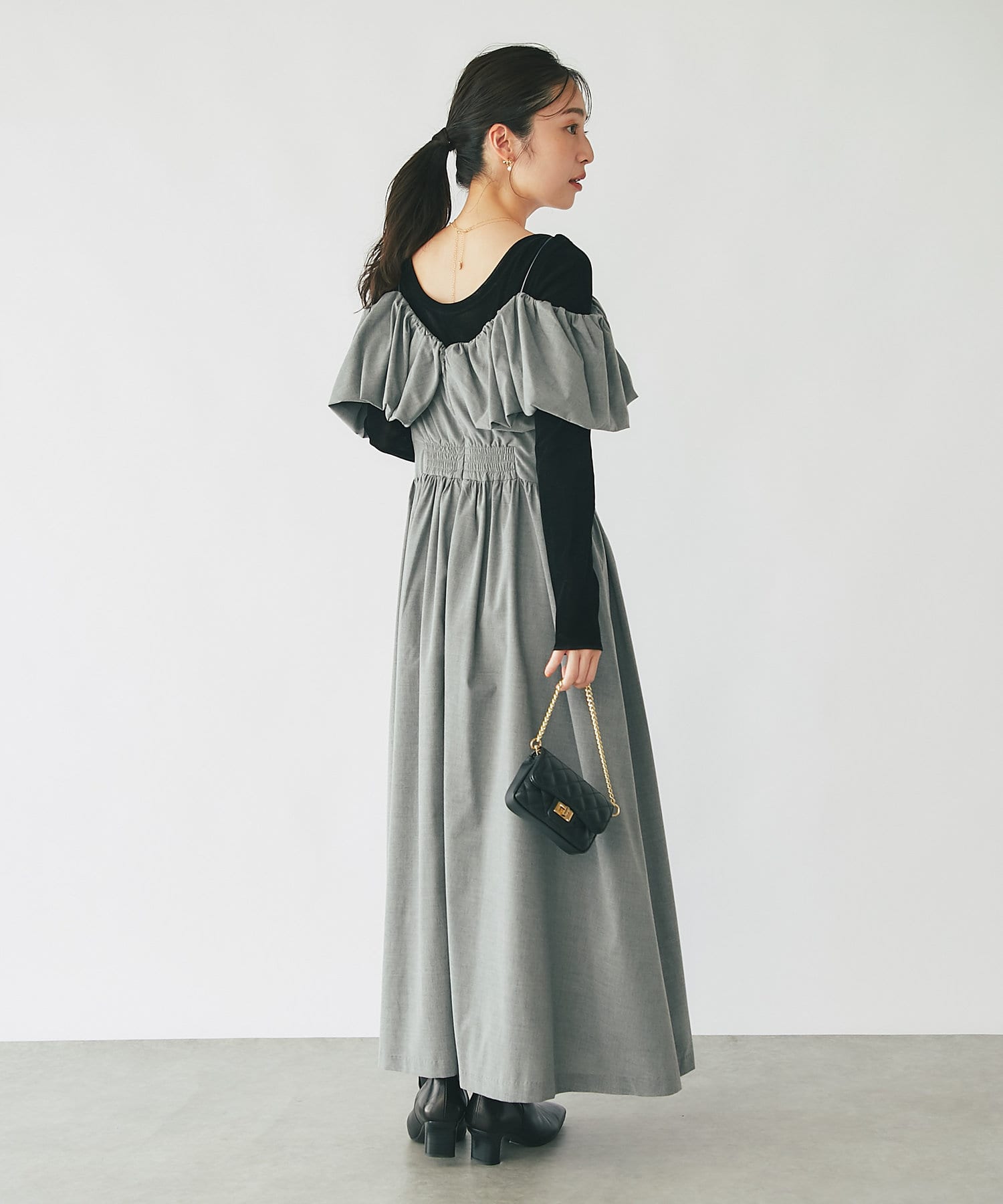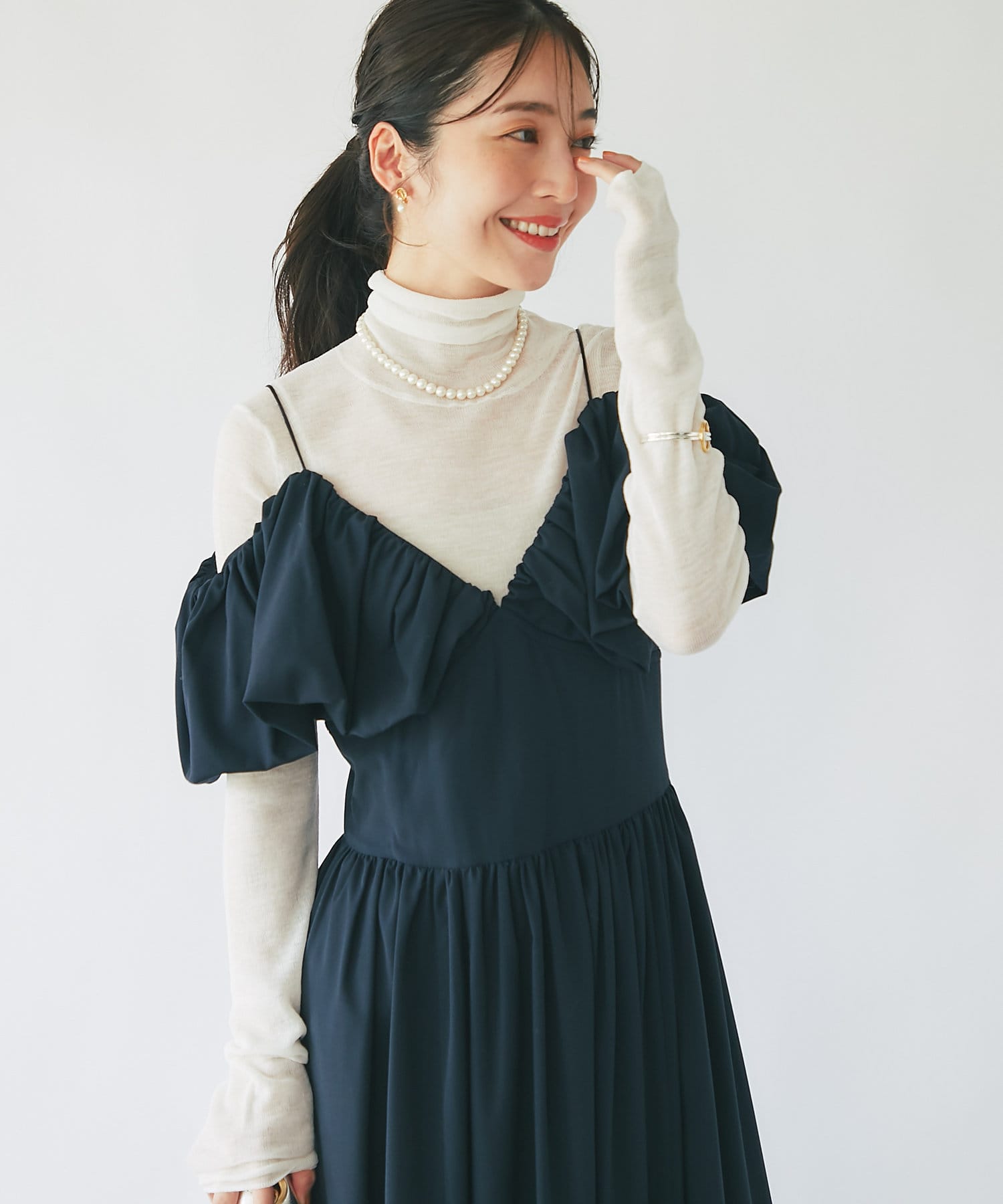 ふんわりとしたバルーンのフリルと贅沢に広がるフレアスカートのシルエットがフェミニンな雰囲気を演出します。