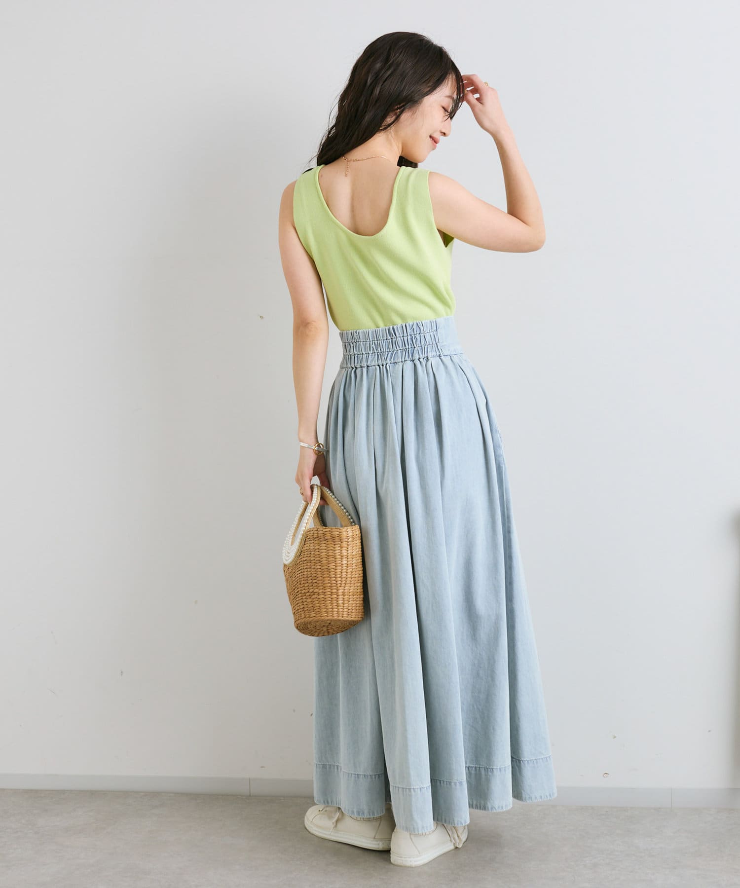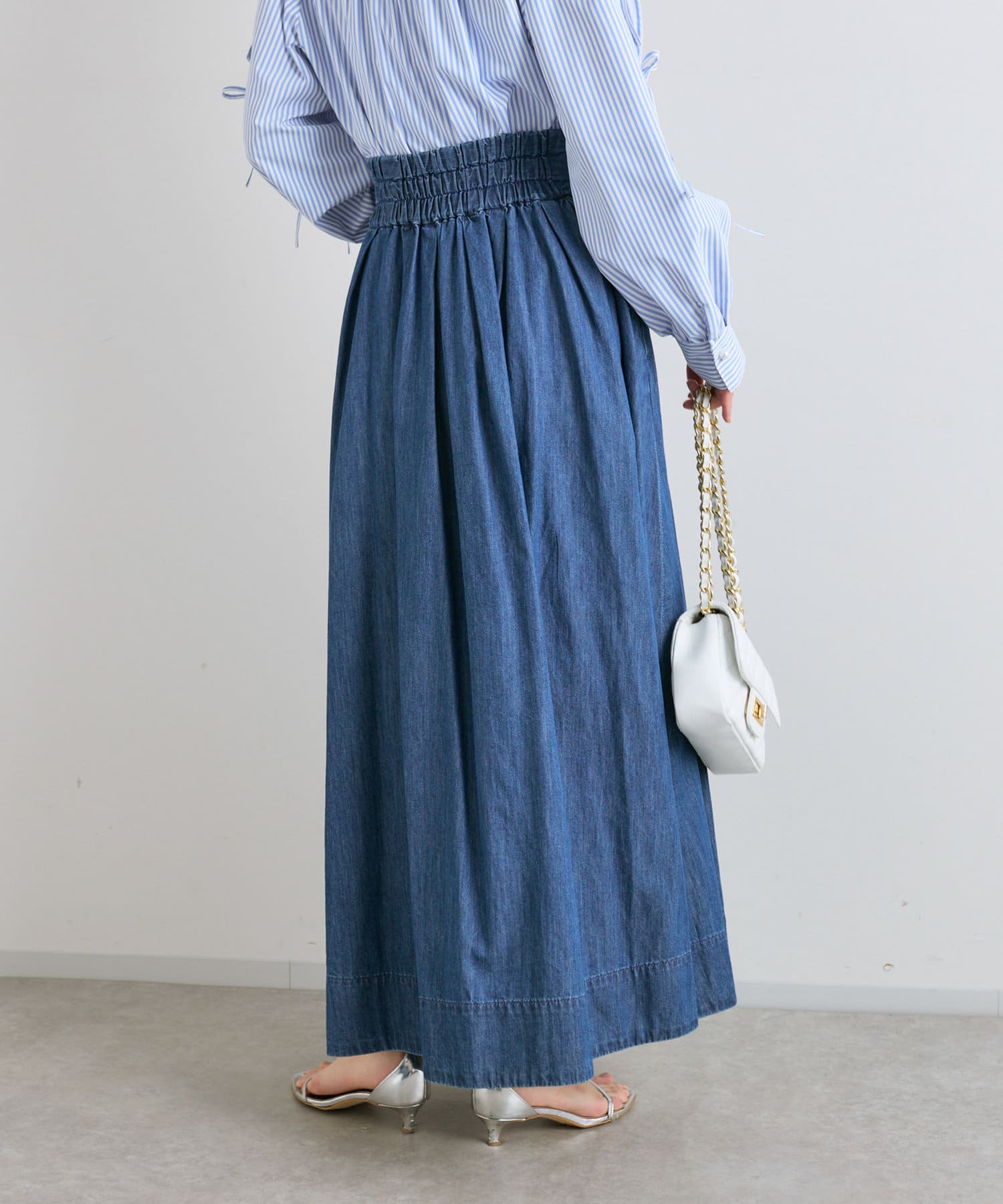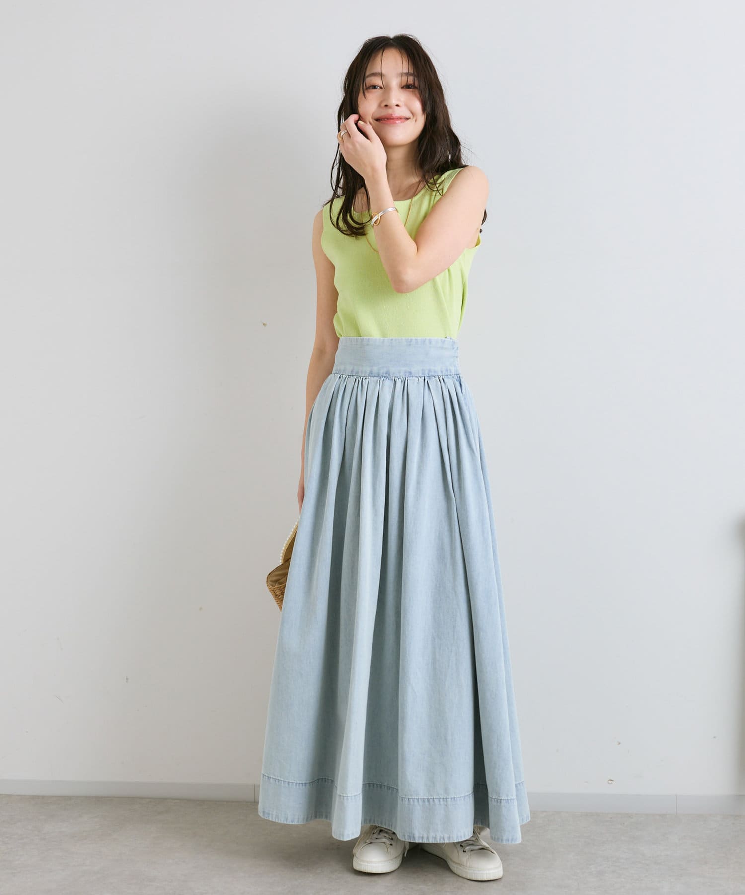 シンプルなトップスがスカートのデザインを引き立ててくれます。