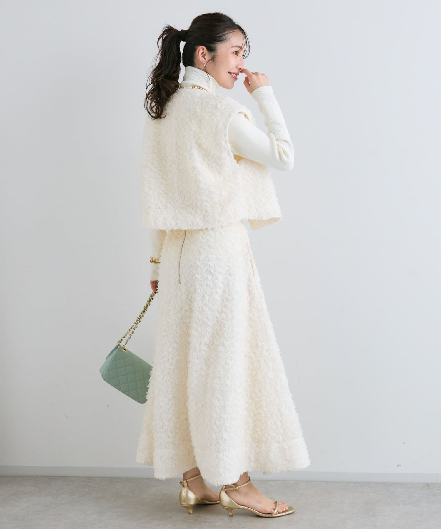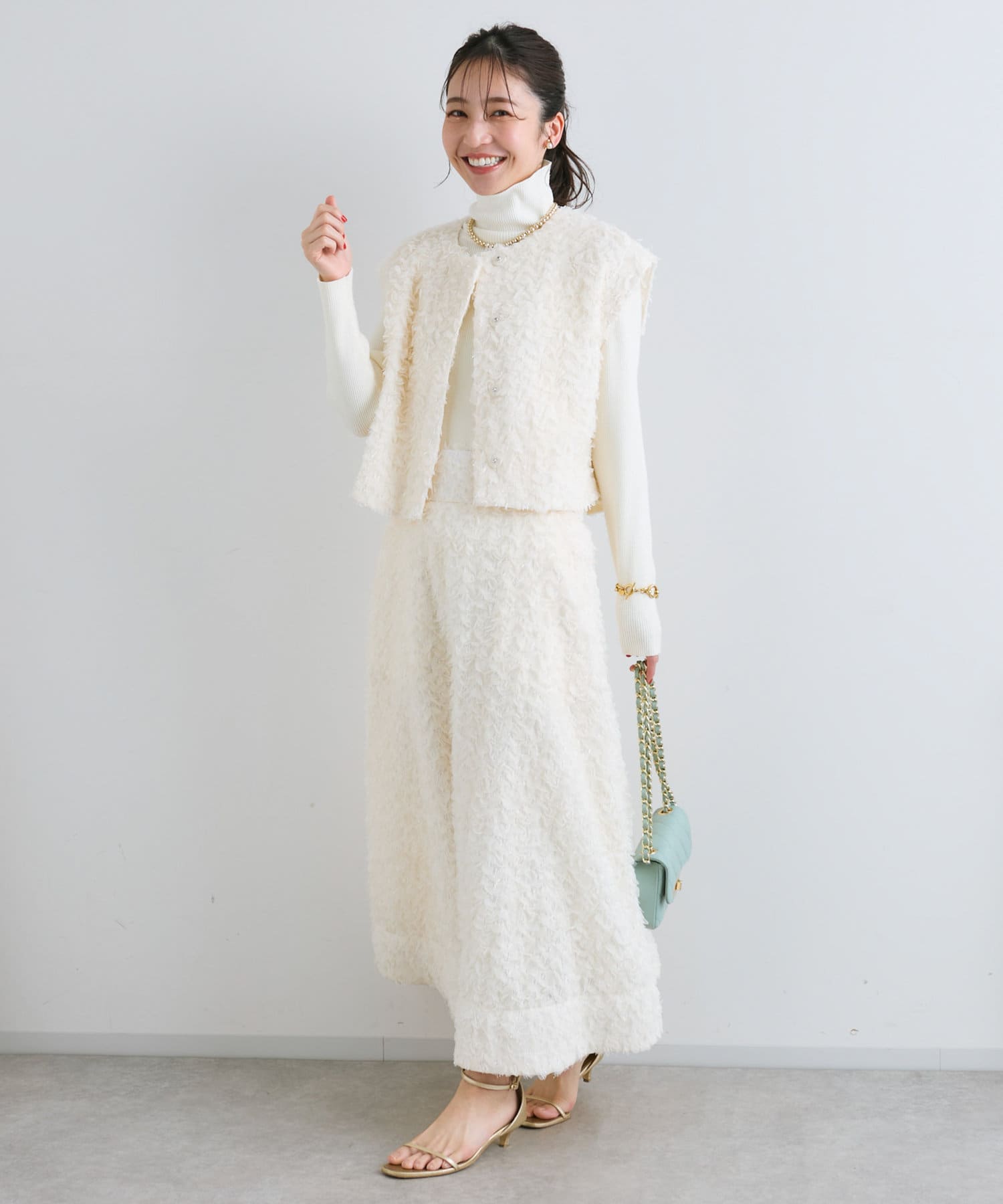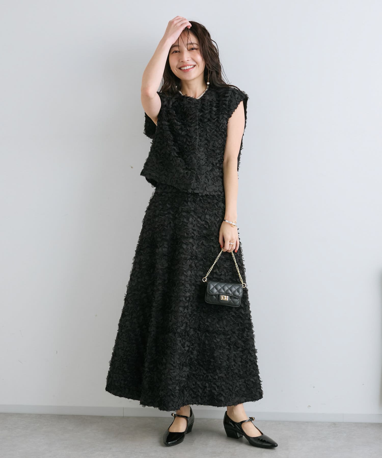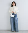 同素材のスカートとセットアップで着用すれば特別感のある上品スタイルが完成。