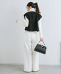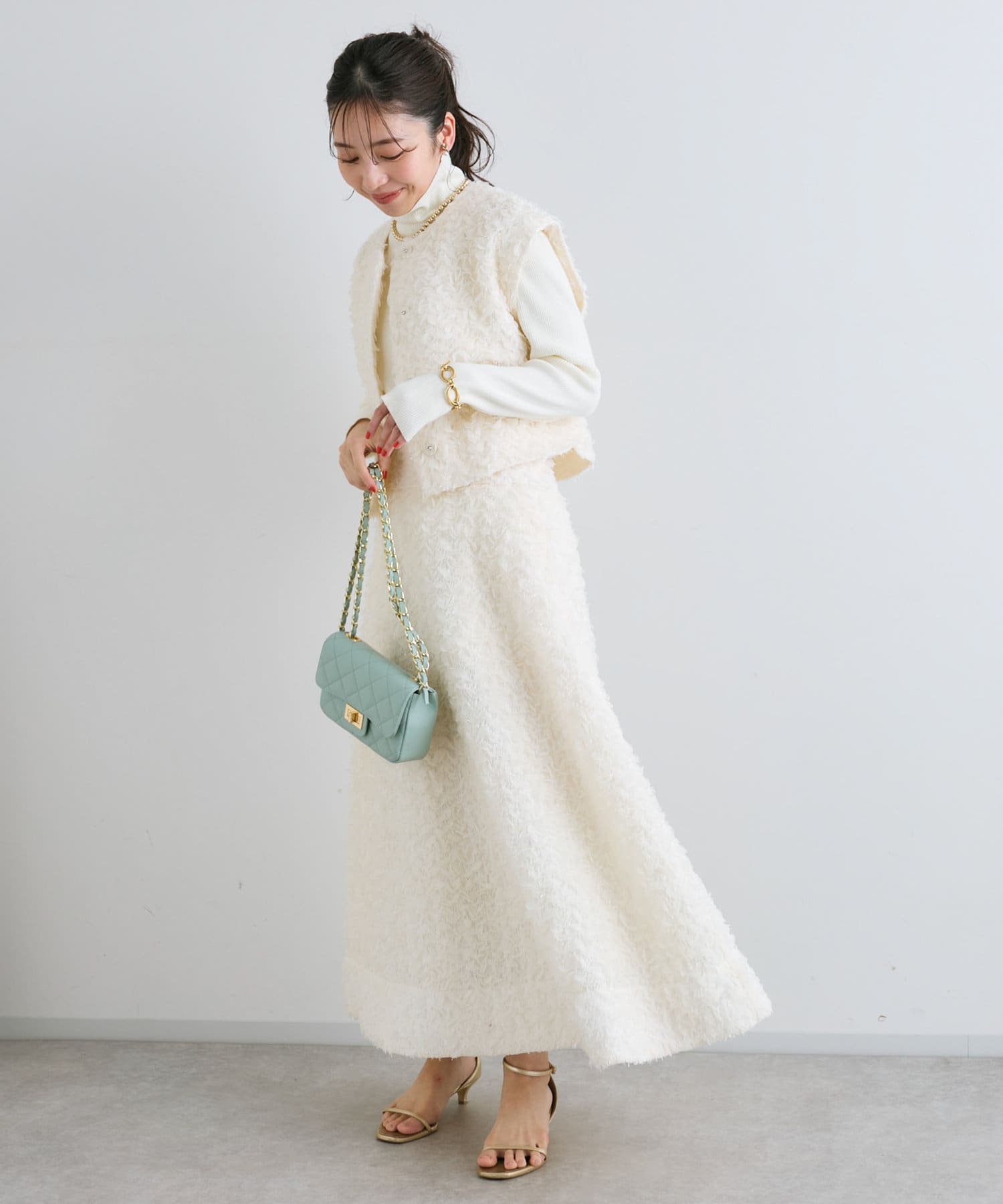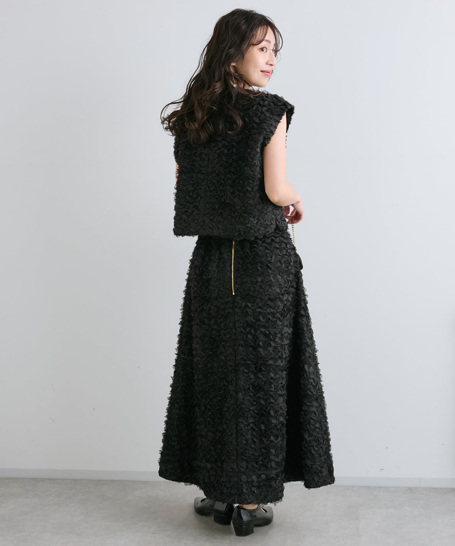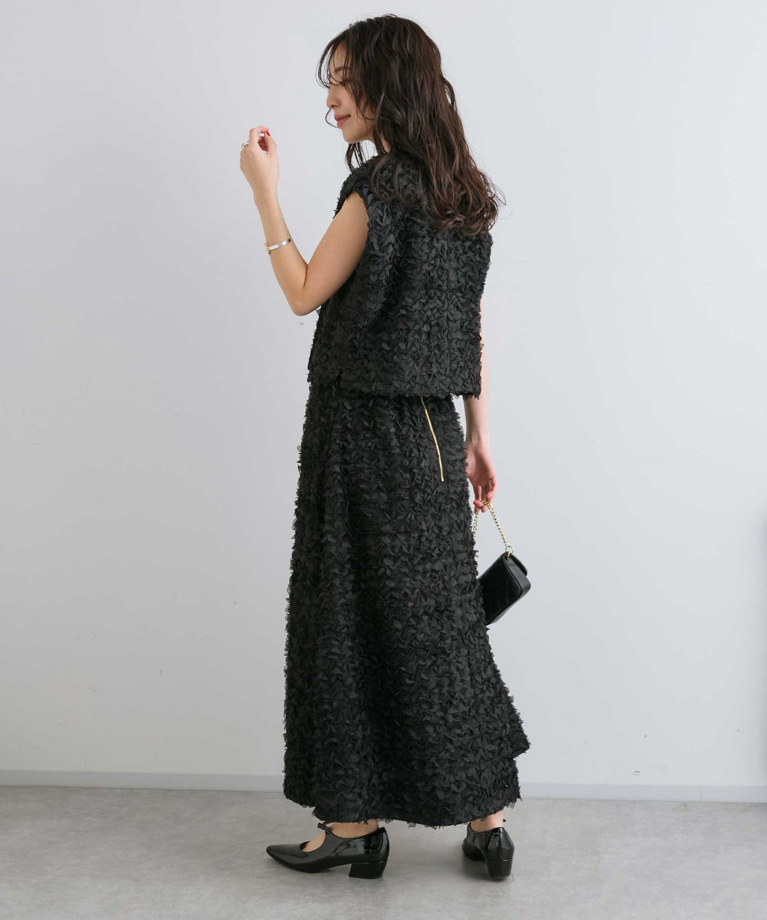 同素材のスカートとセットアップで着用すれば特別感のある上品スタイルが完成。