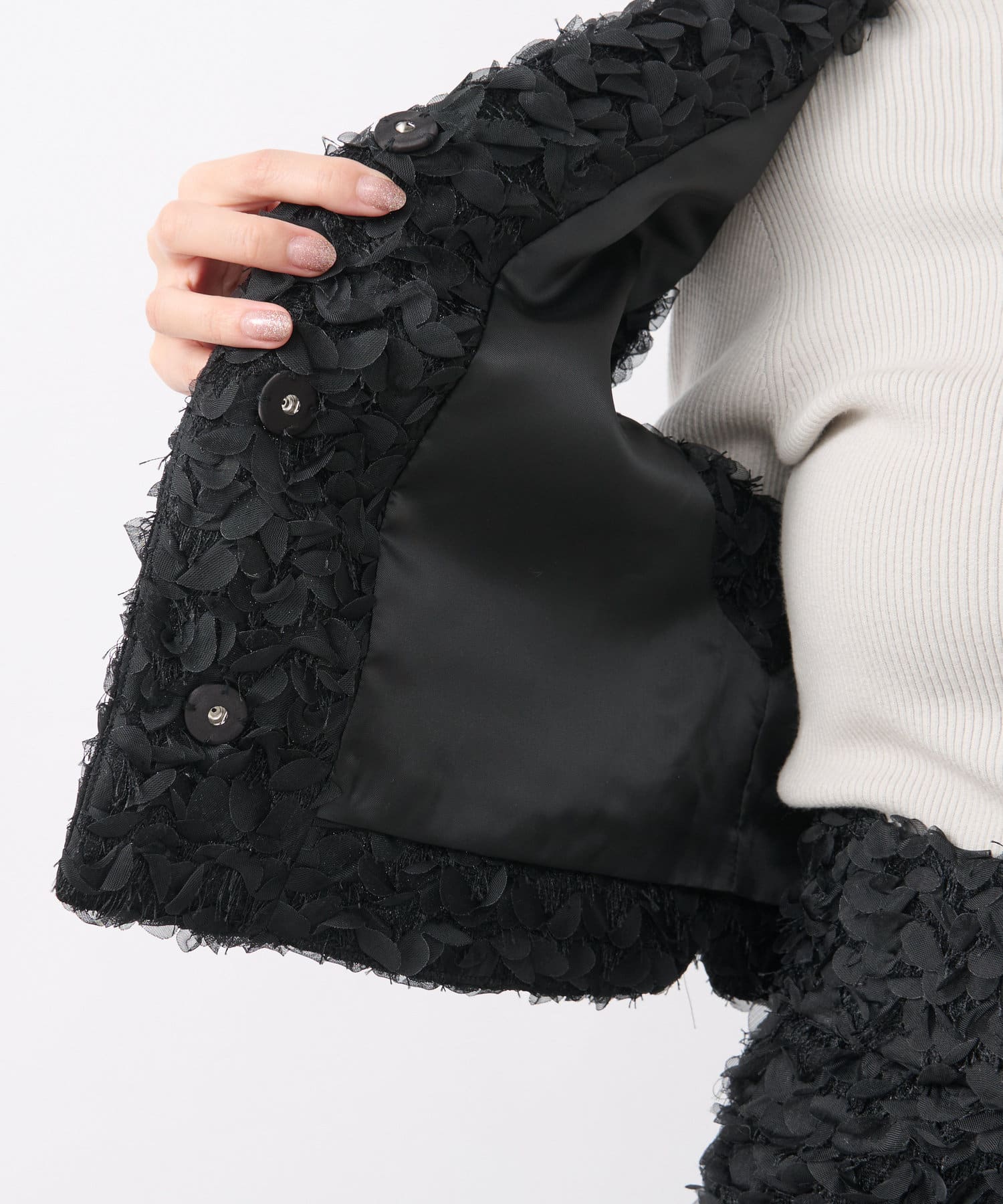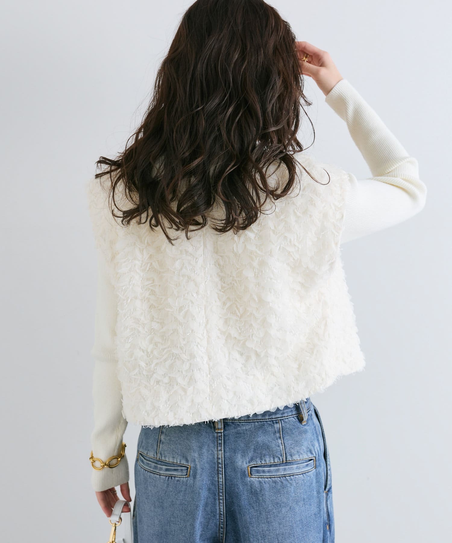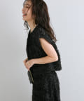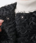 トレンドのフェザーとフラワーモチーフをあしらった華やか素材のショートベスト。