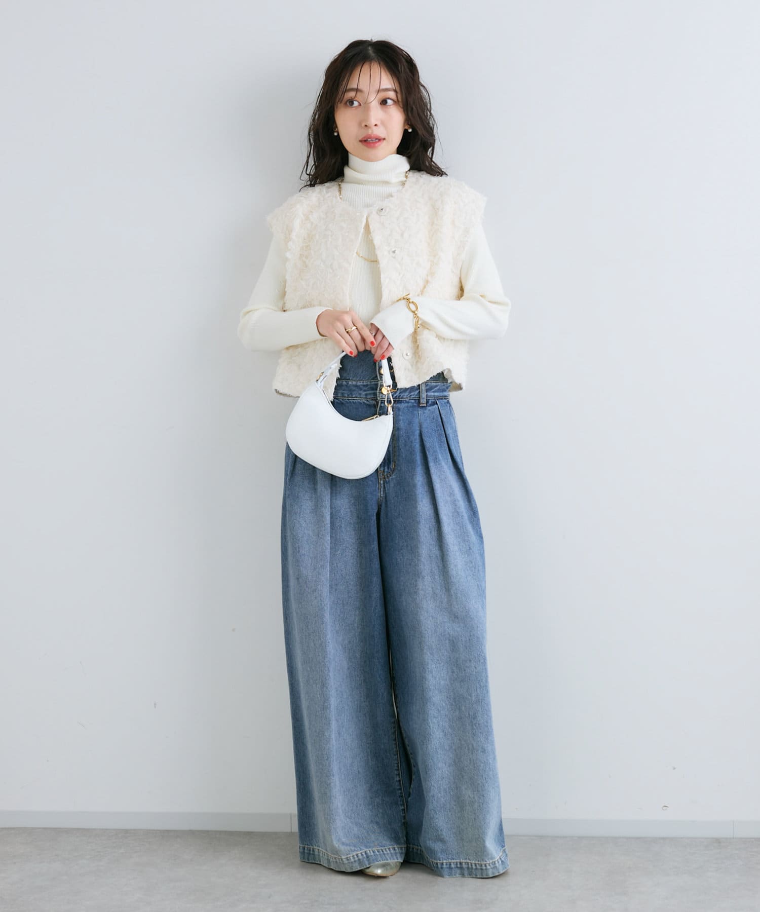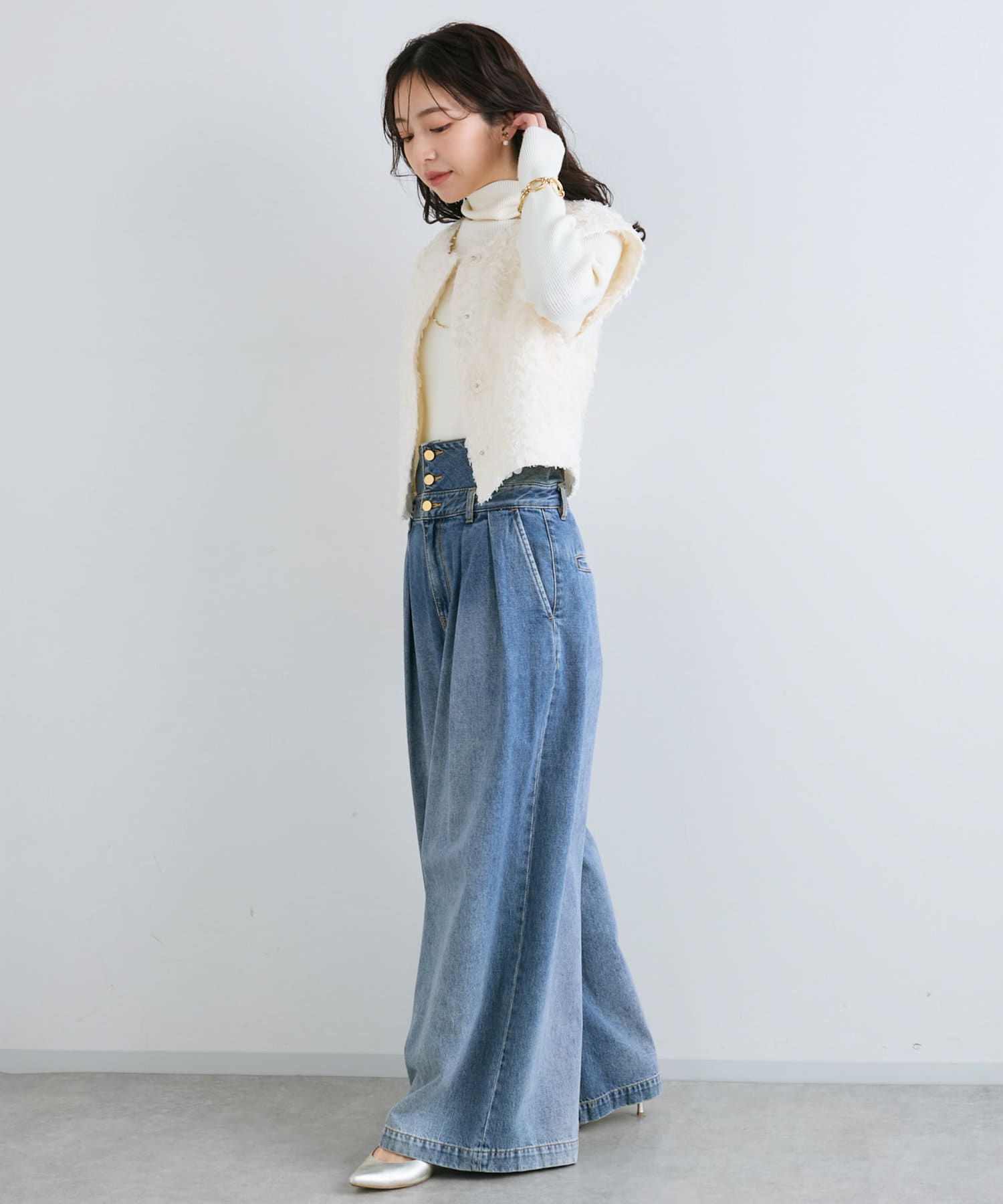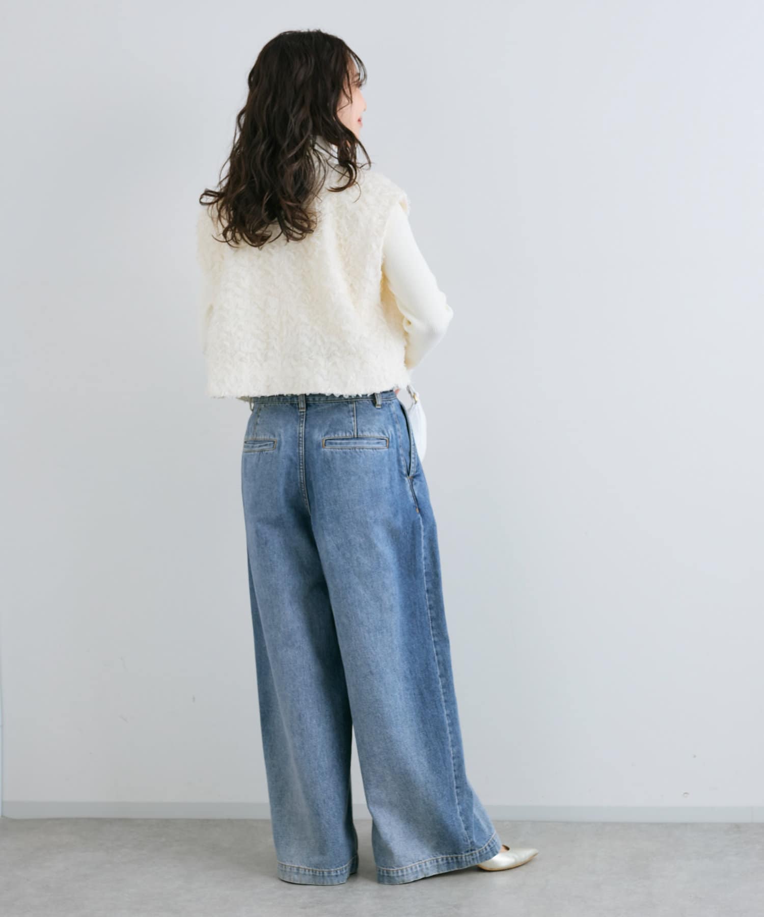 デニムやバギーパンツなどカジュアルなアイテムとも好相性です。