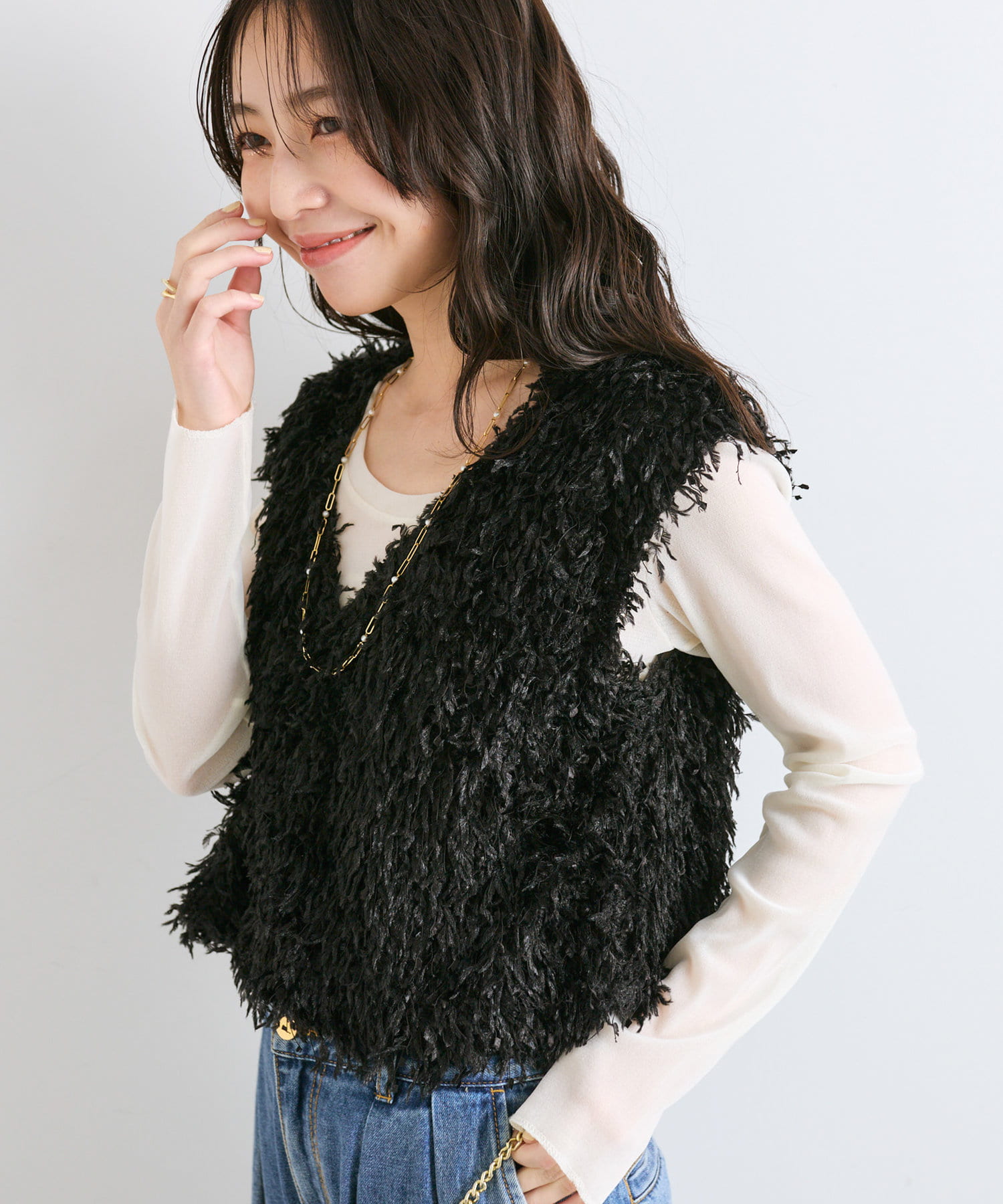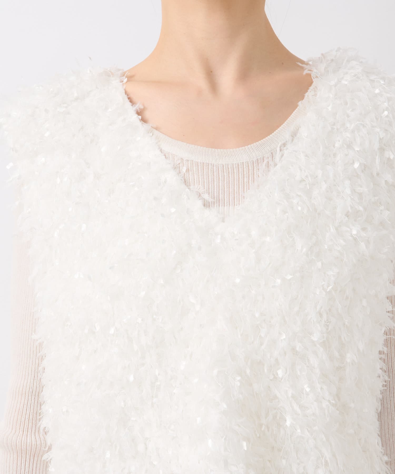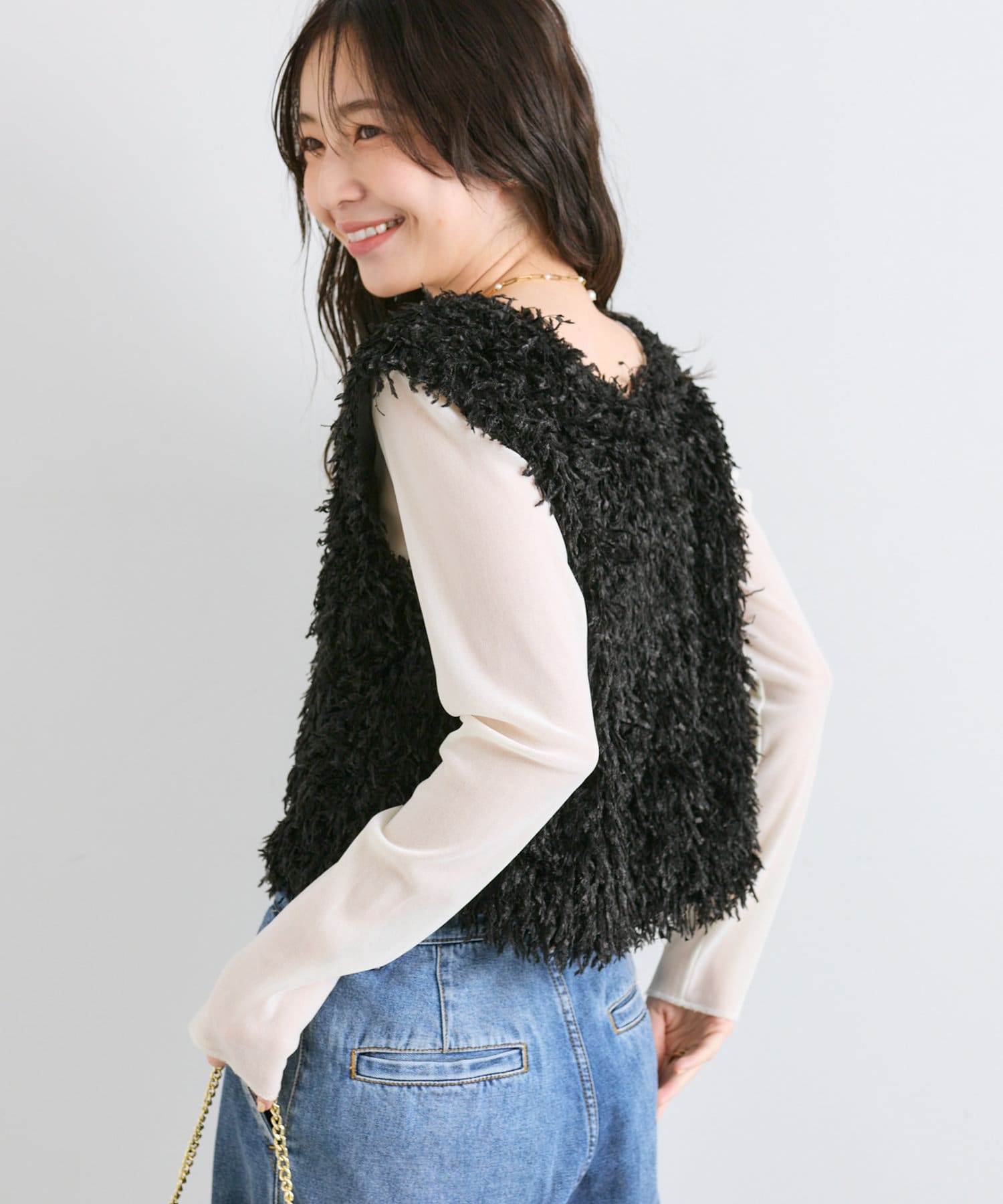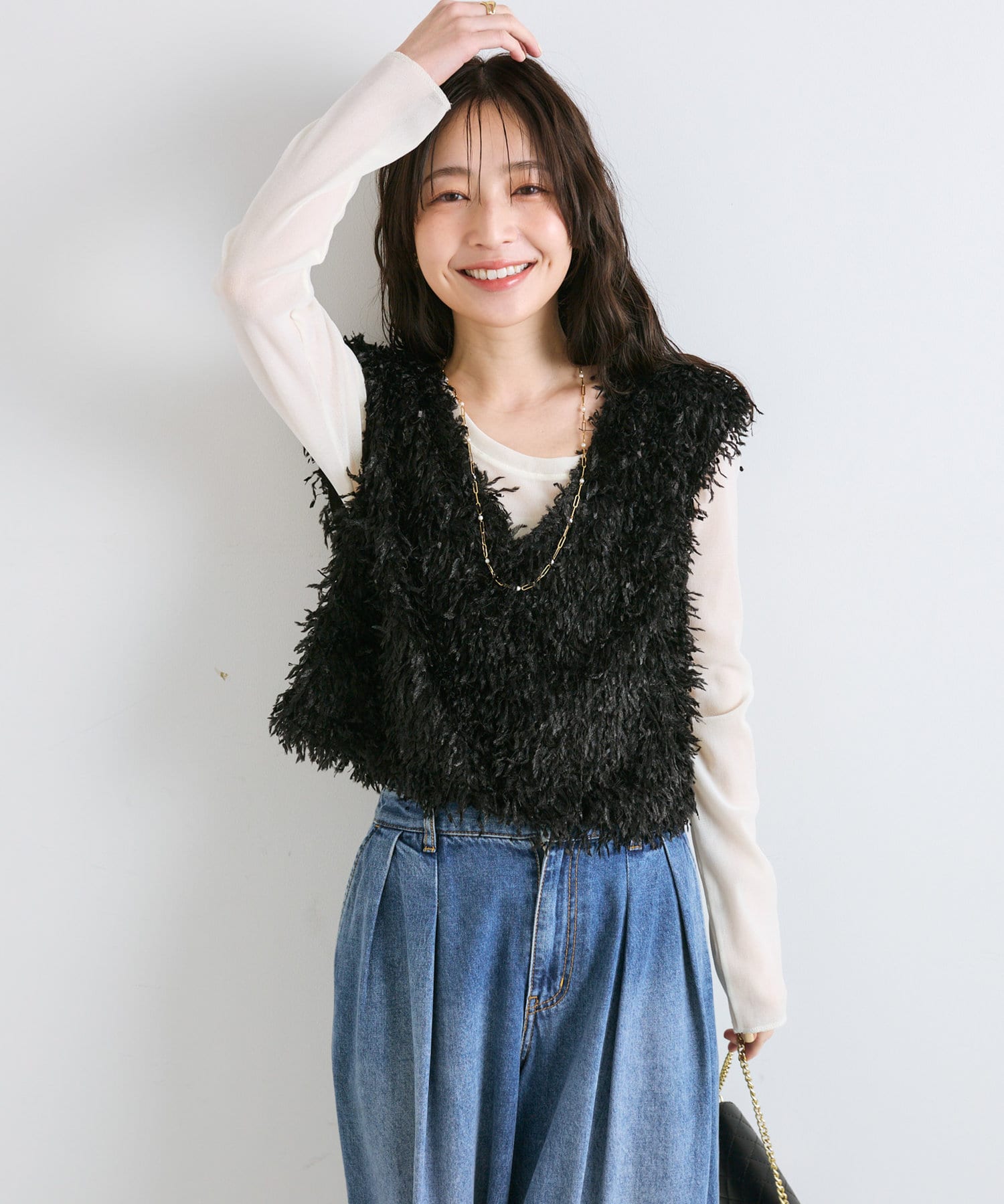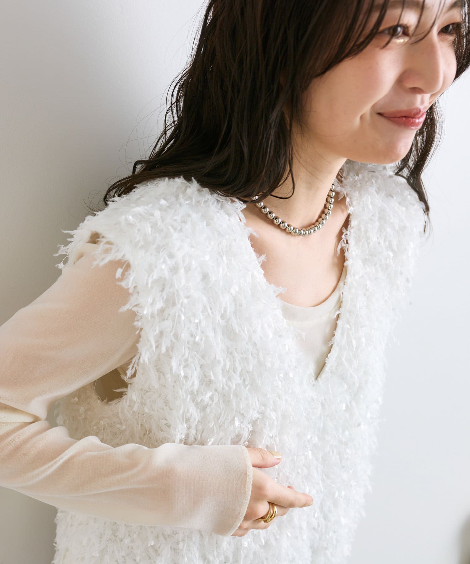 毛足の長いフェザーヤーンを編み込んだトレンド素材のベスト。