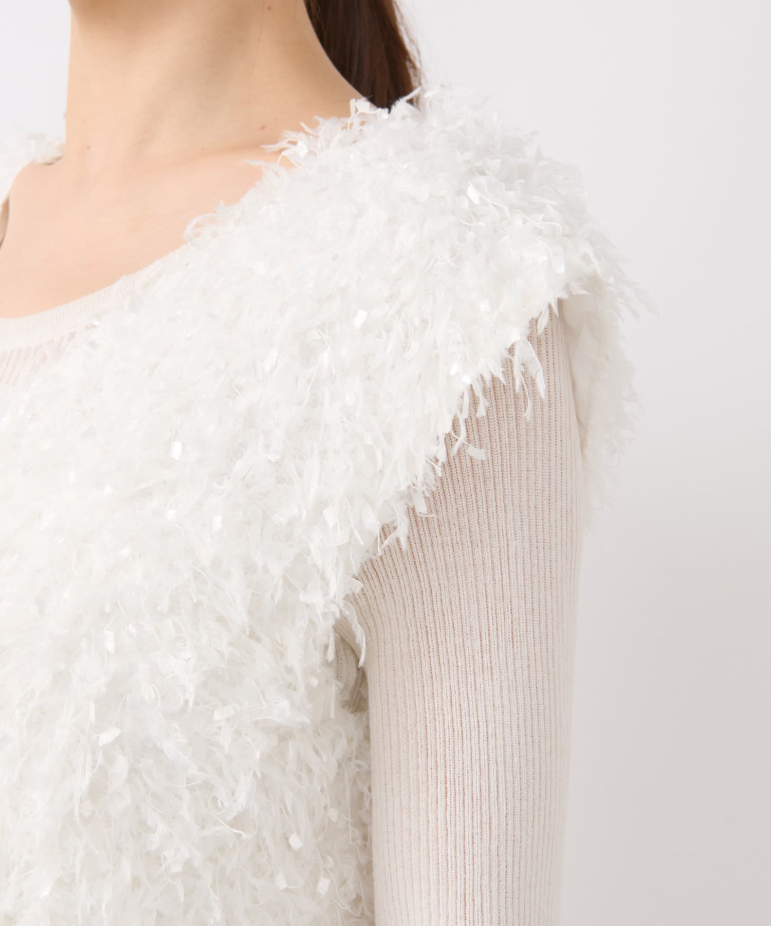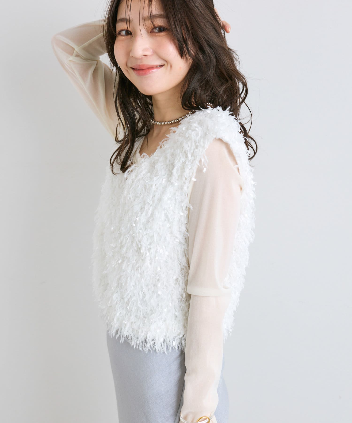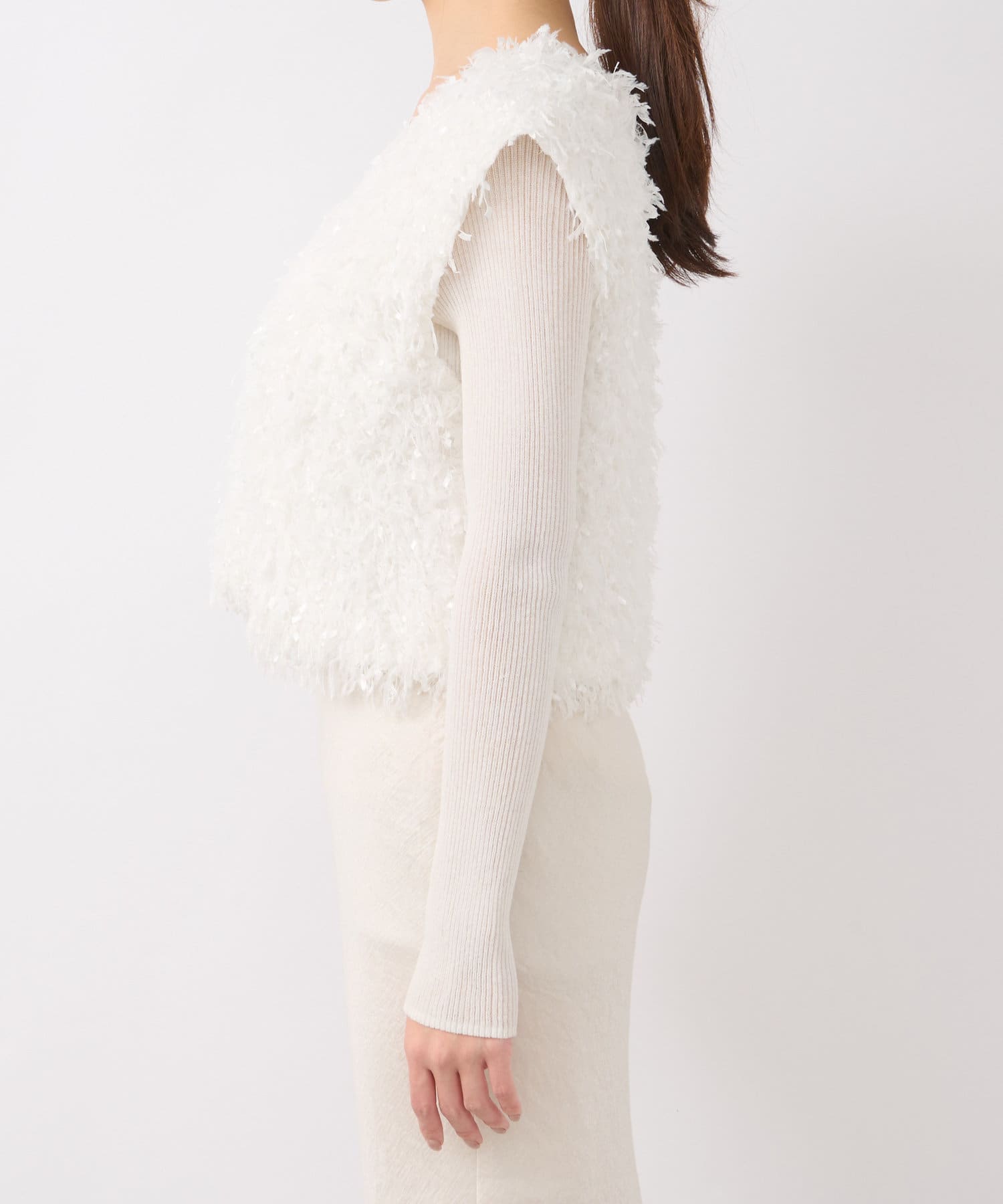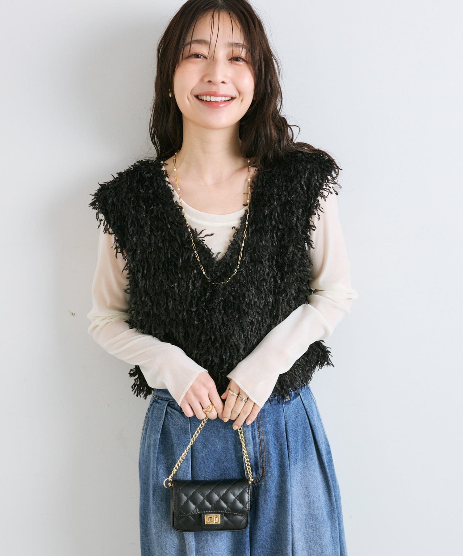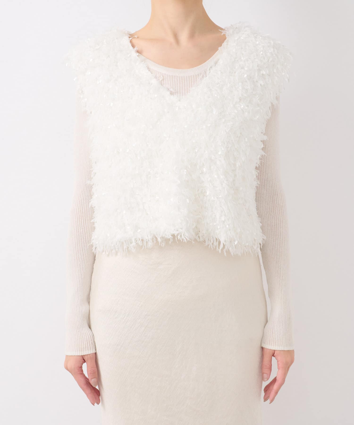 毛足の長いフェザーヤーンを編み込んだトレンド素材のベスト。