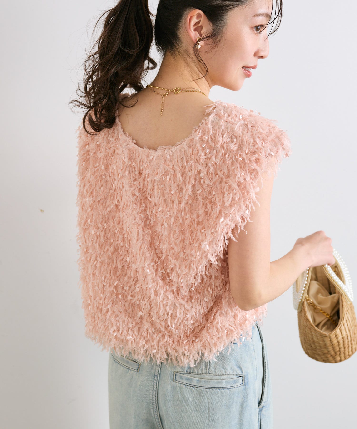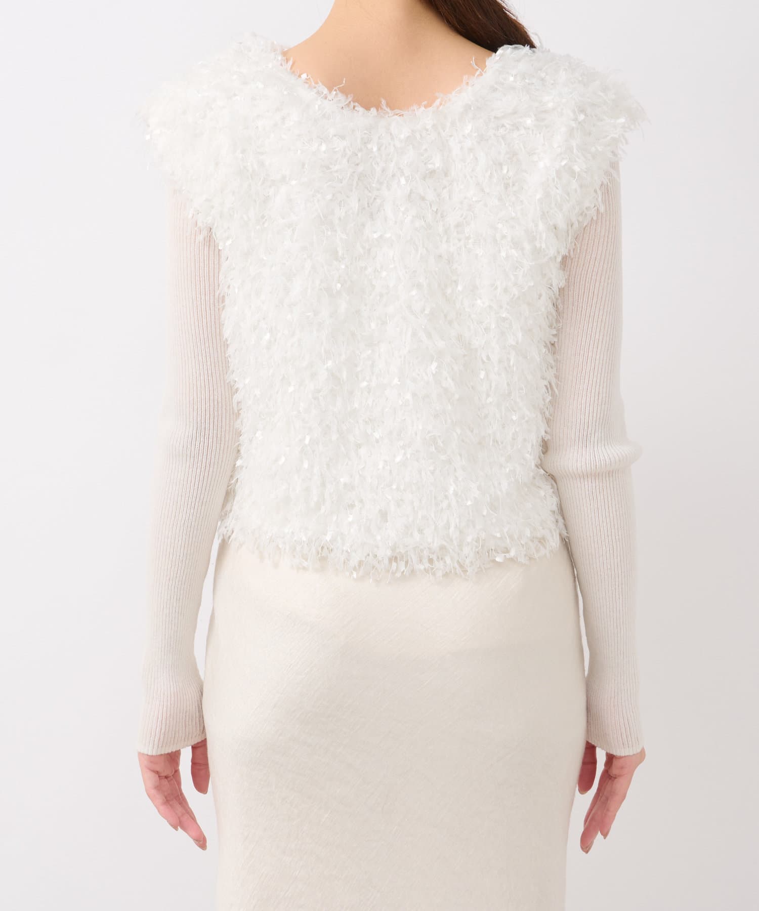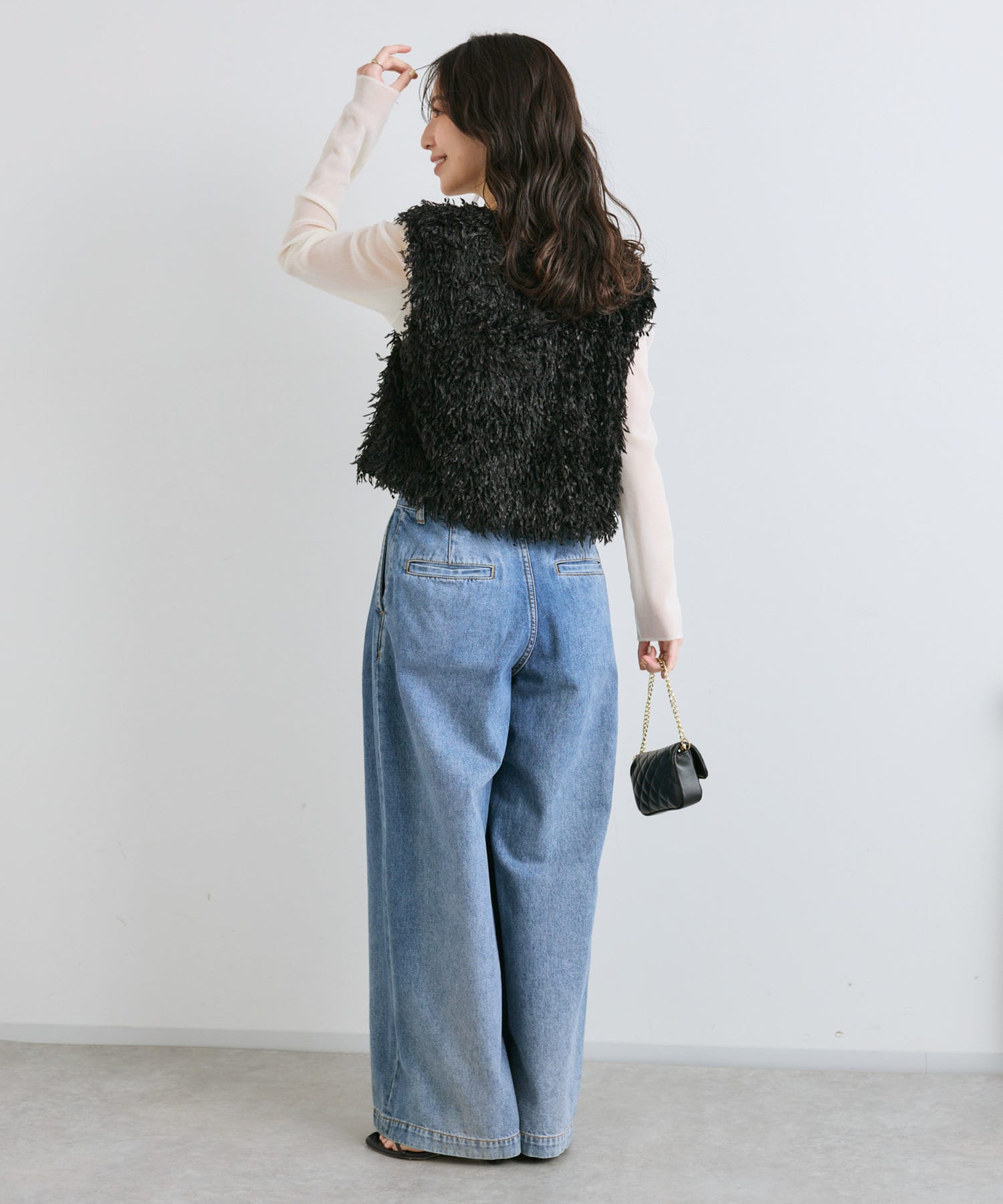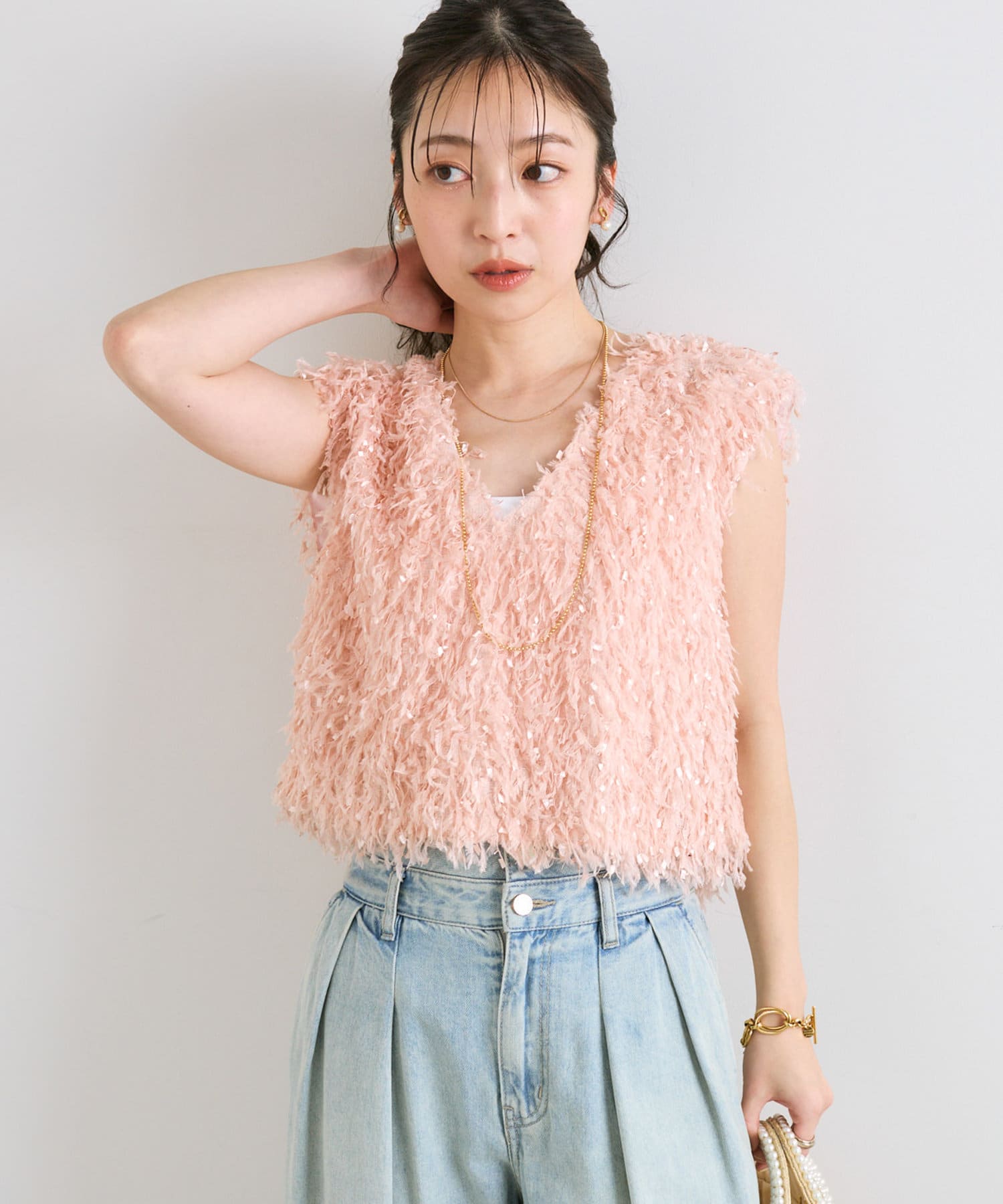 毛足の長いフェザーヤーンを編み込んだトレンド素材のベスト。