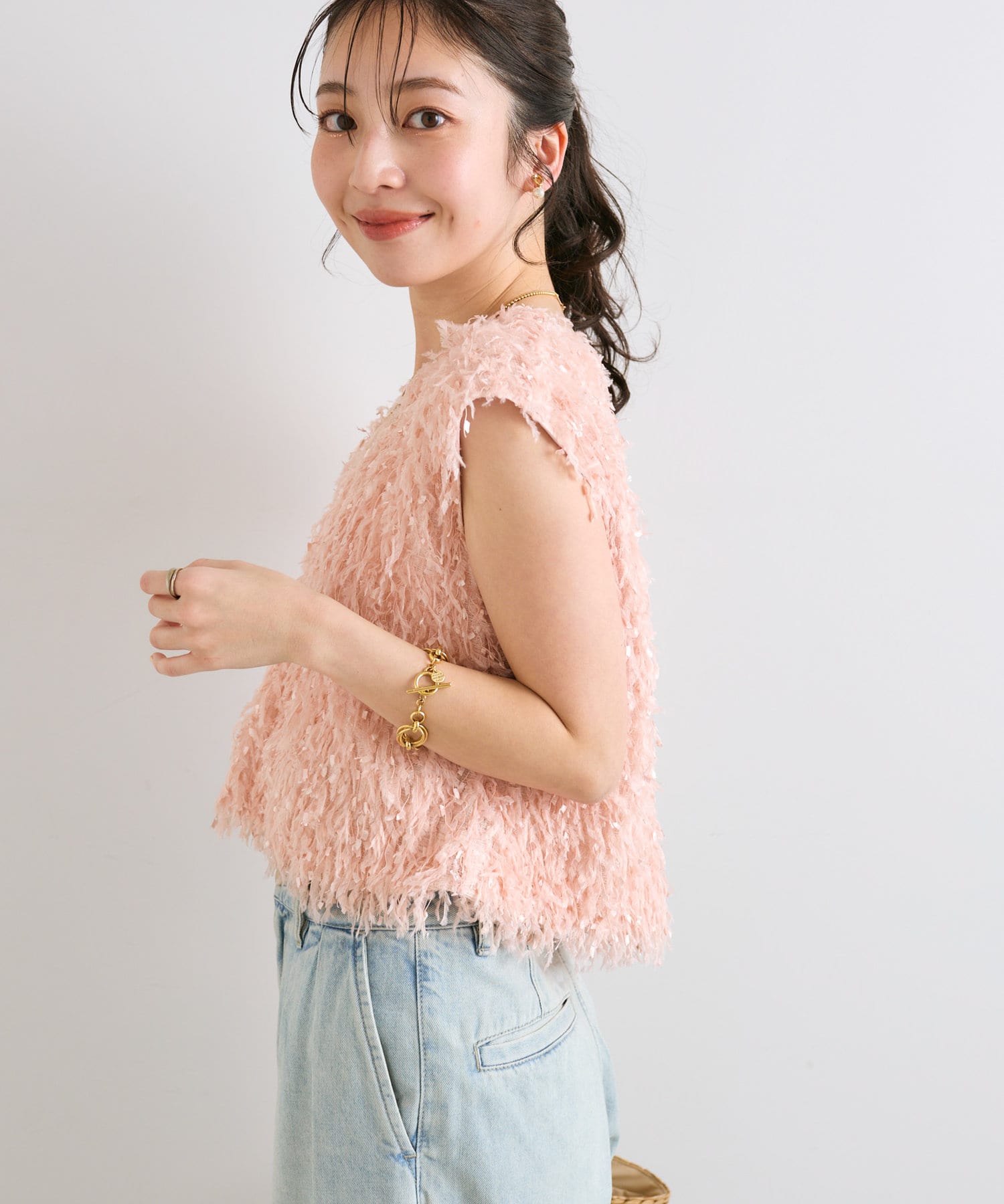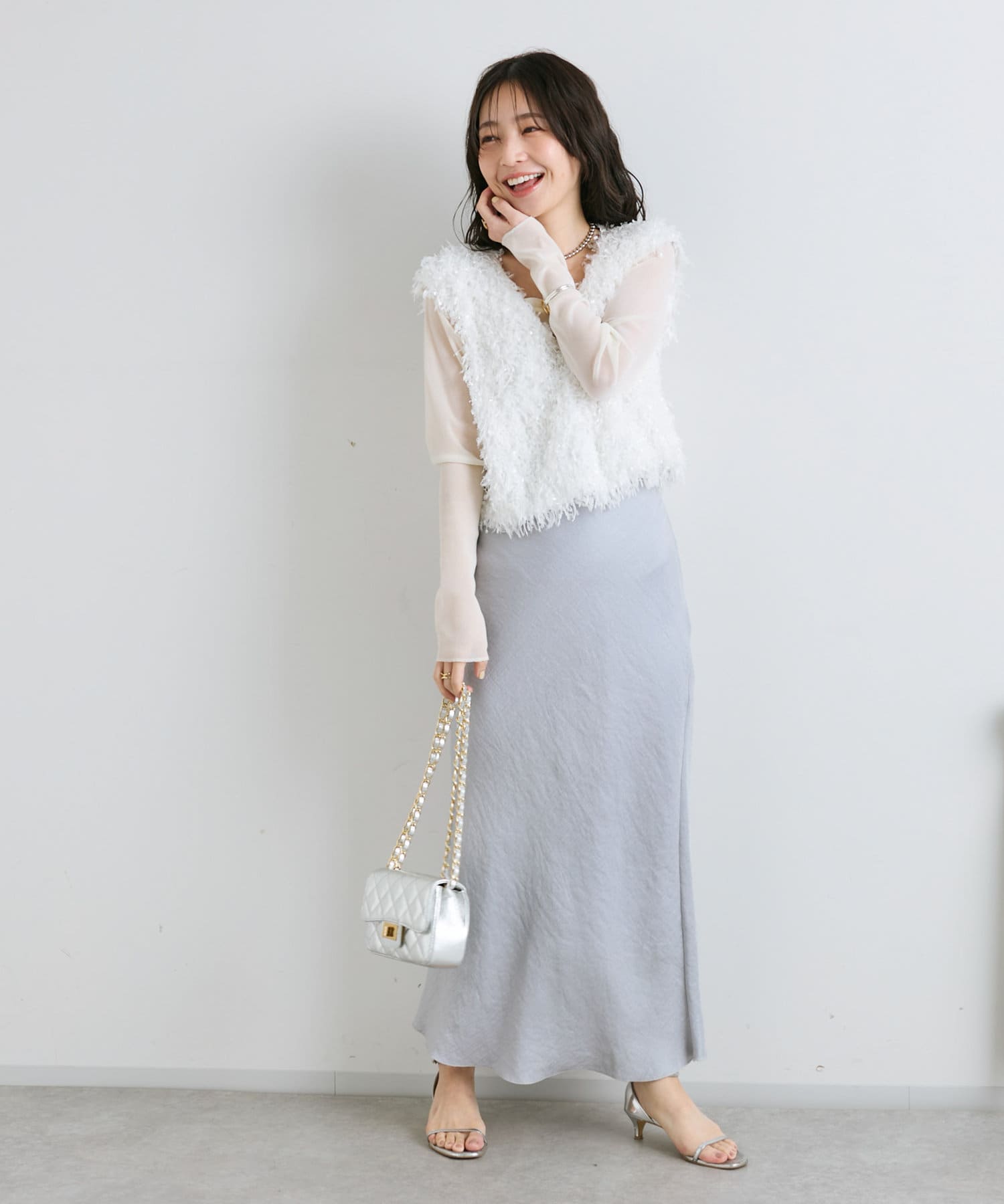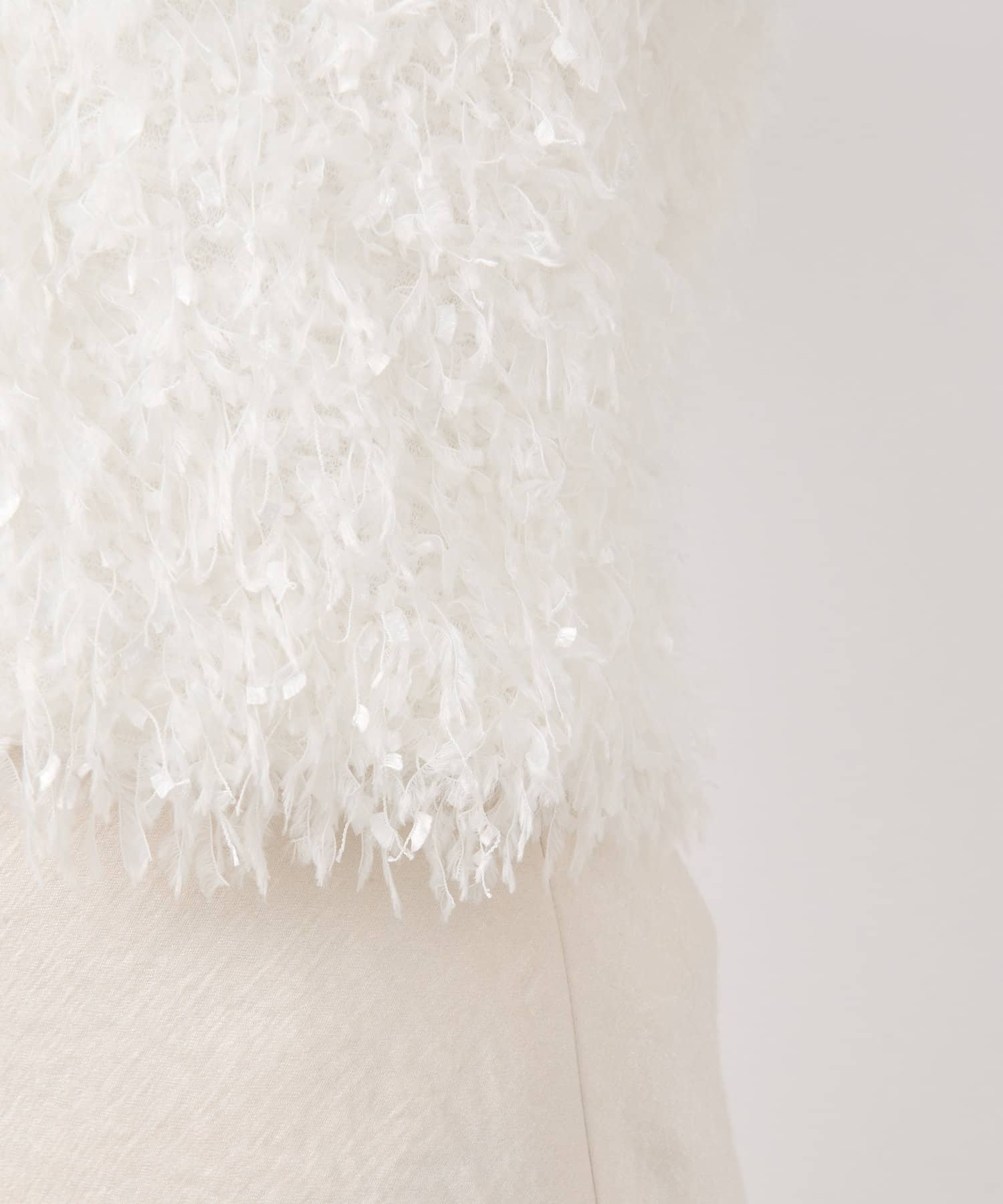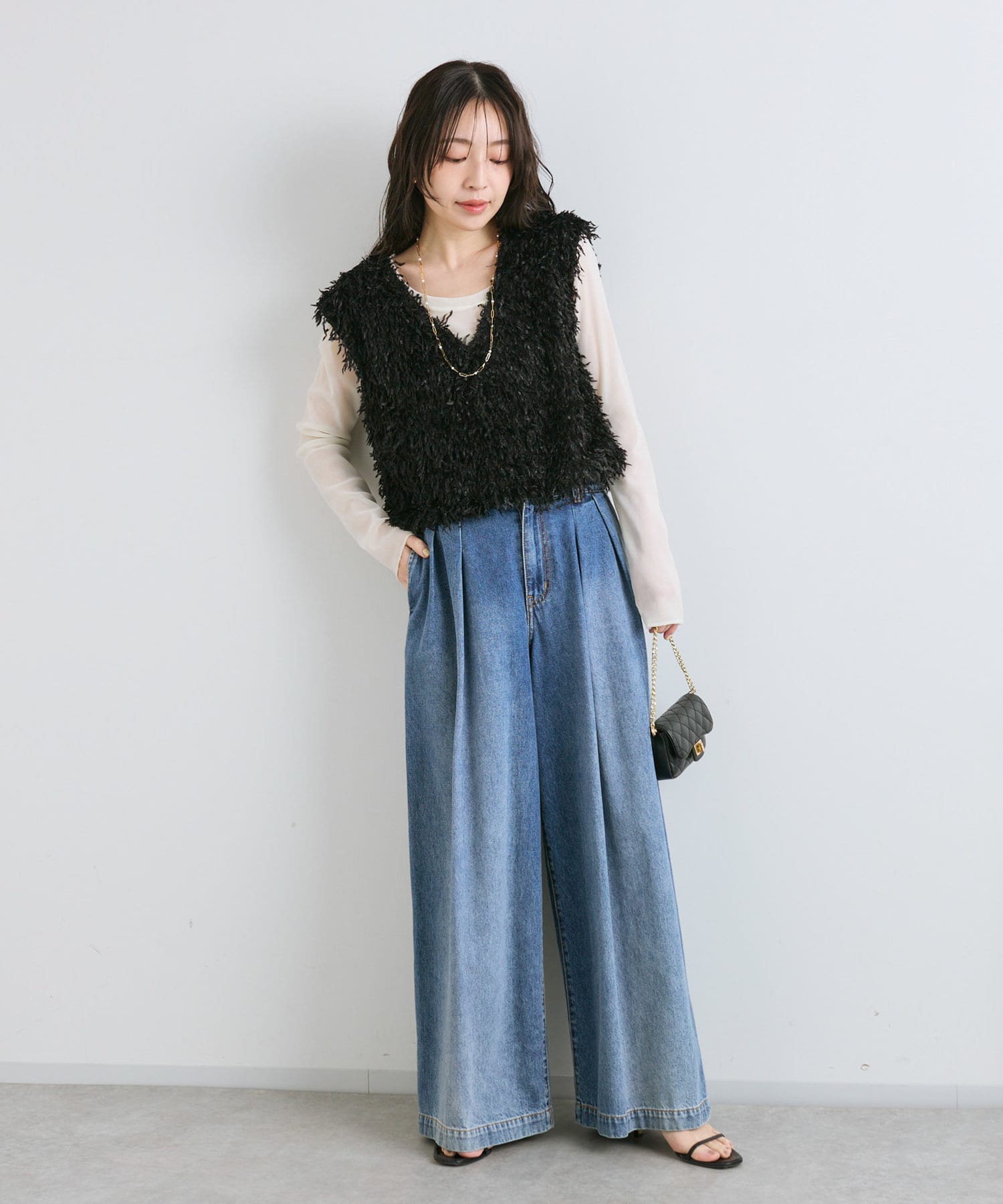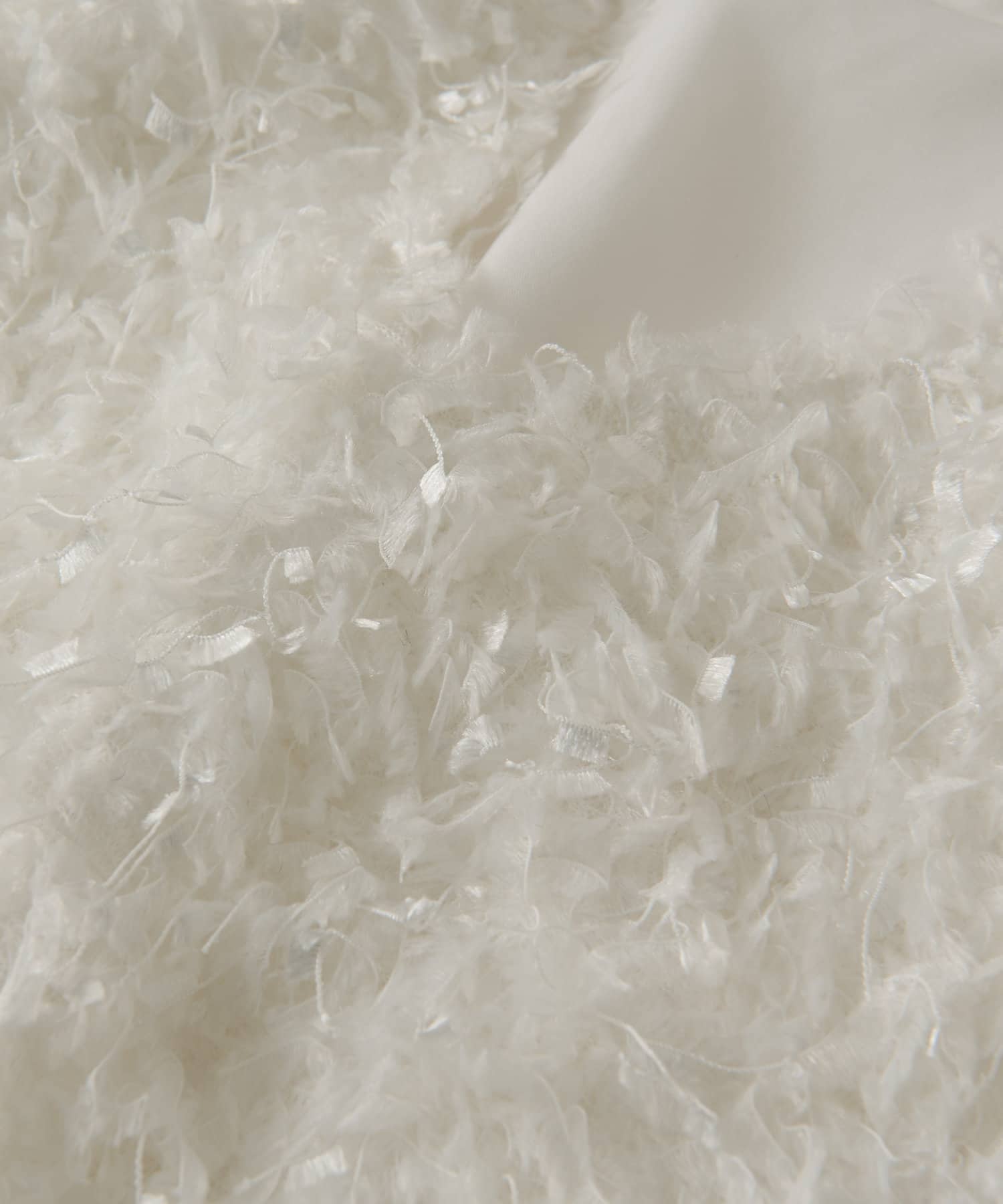 毛足の長いフェザーヤーンを編み込んだトレンド素材のベスト。