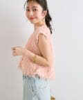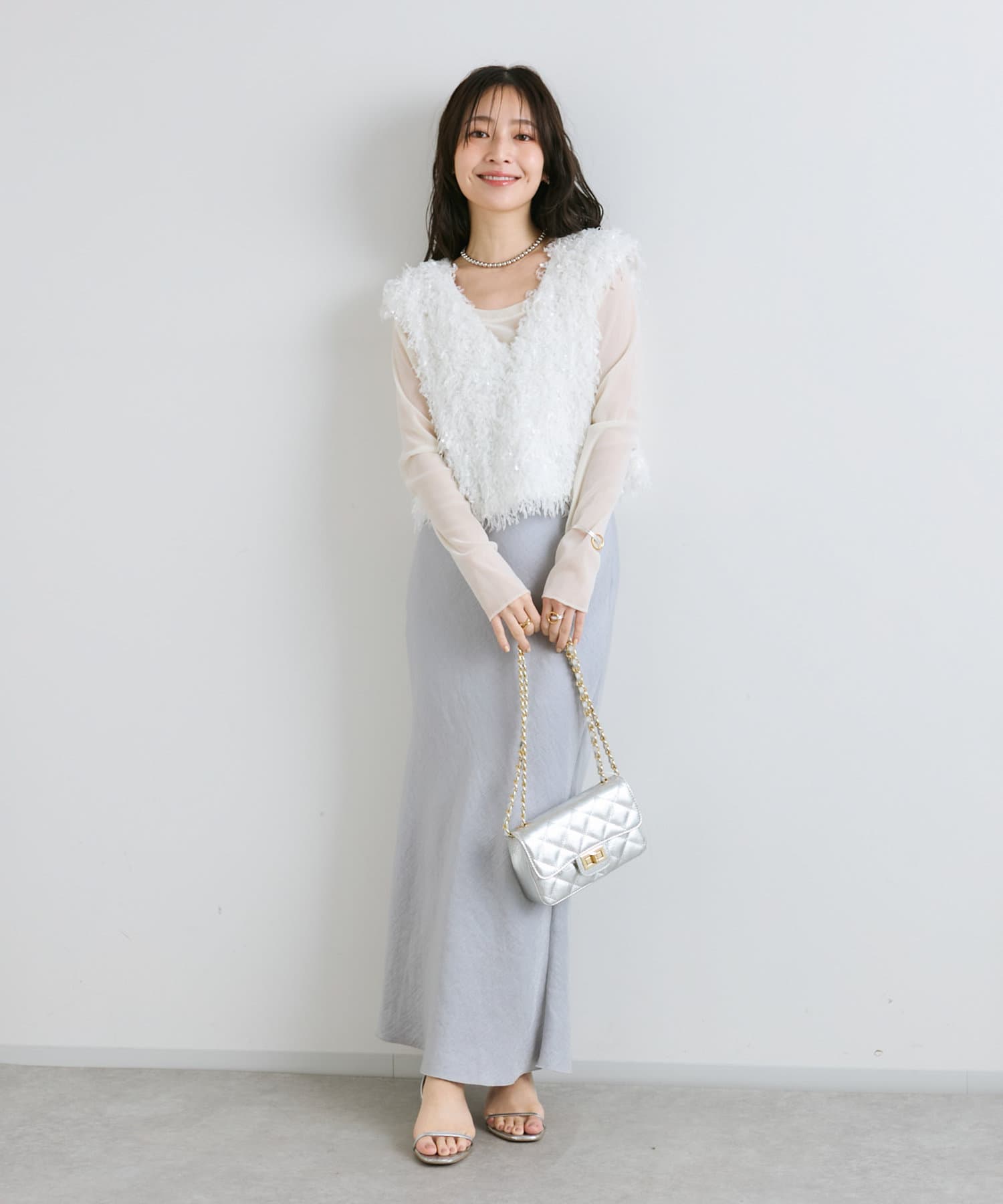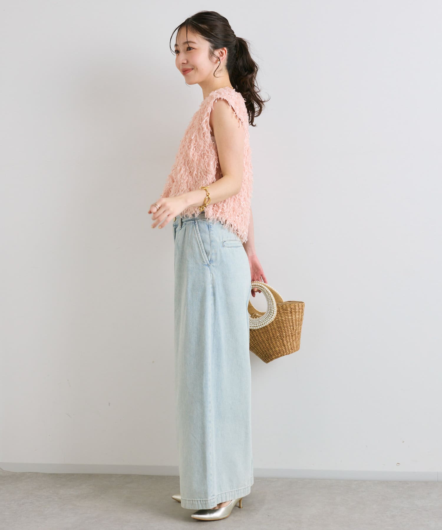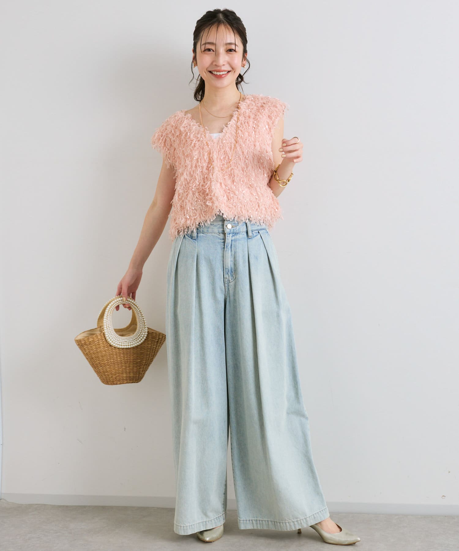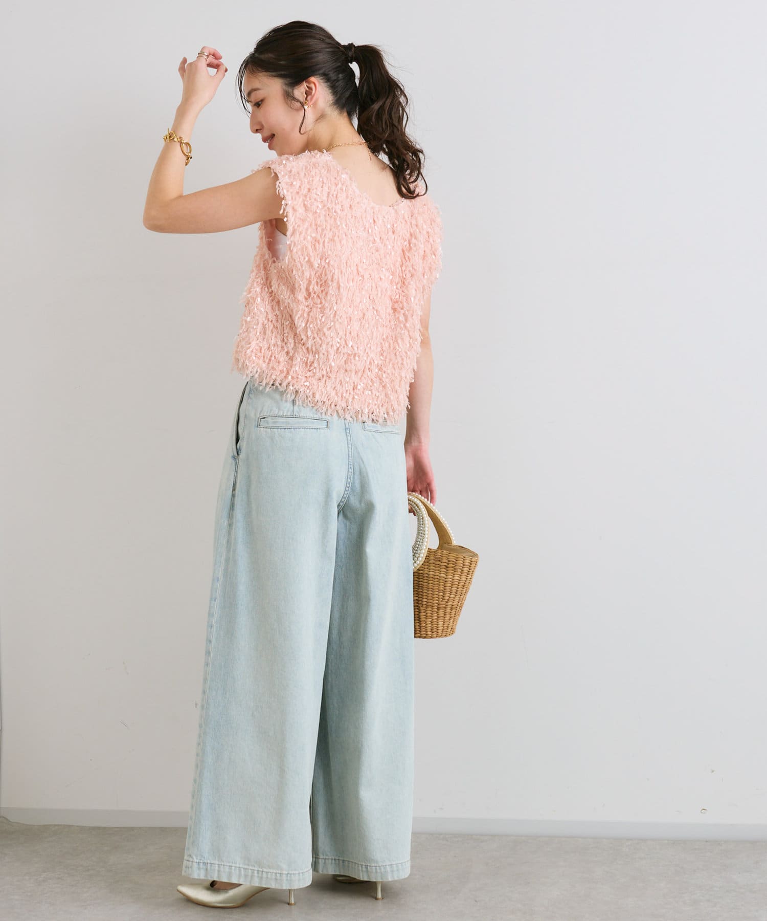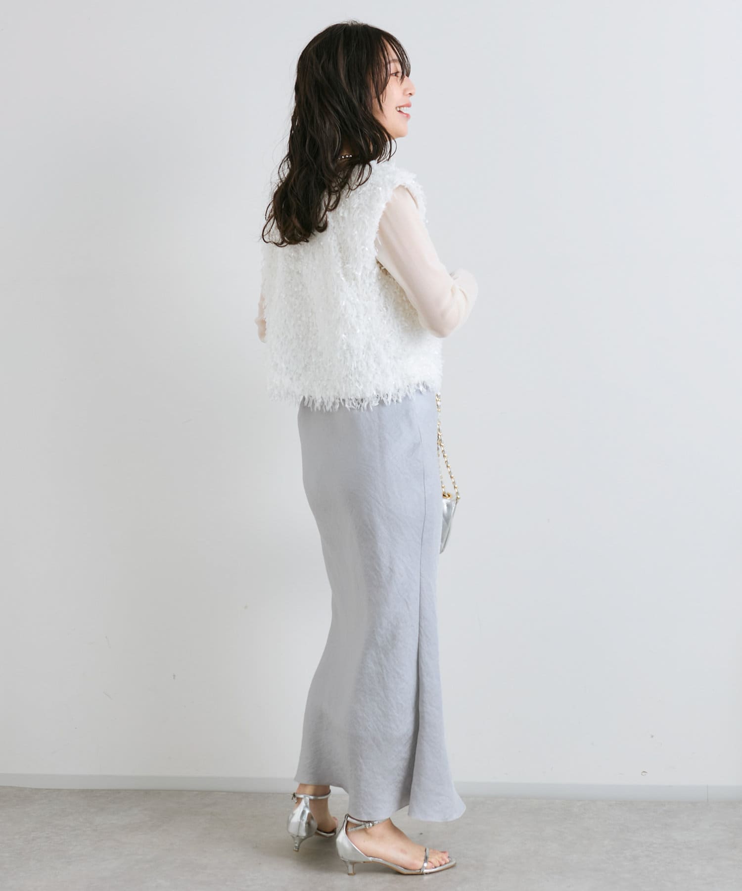 毛足の長いフェザーヤーンを編み込んだトレンド素材のベスト。