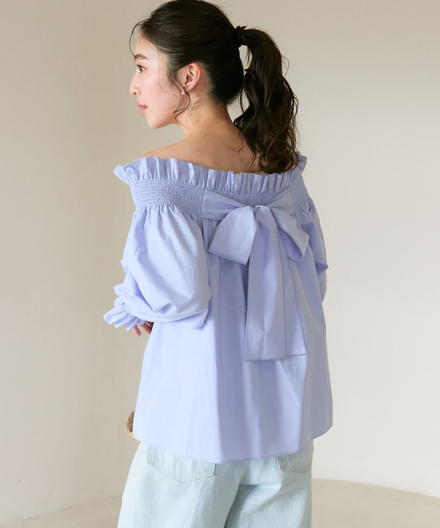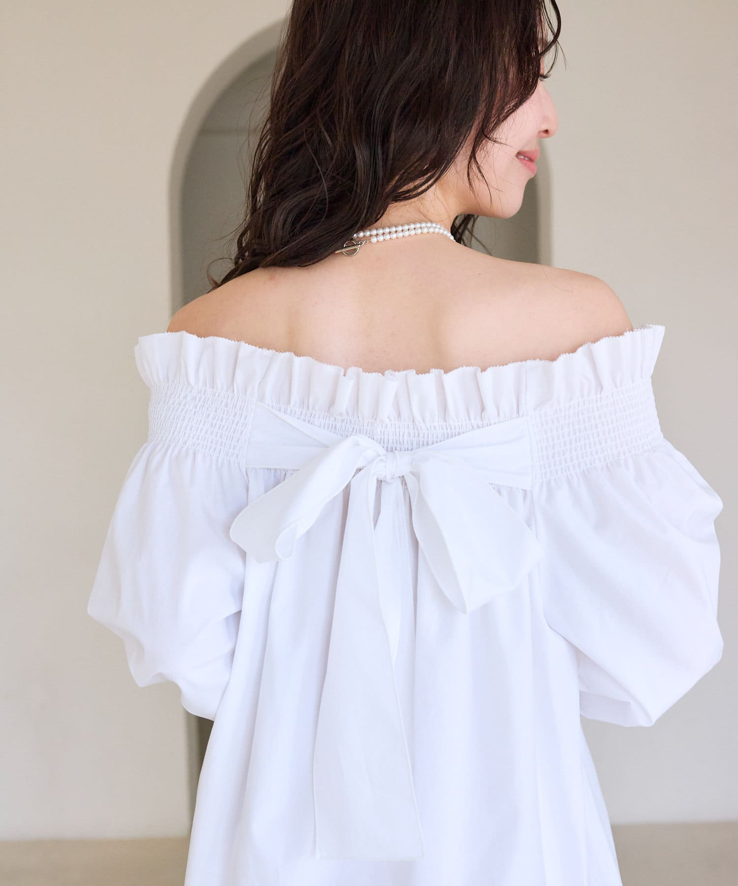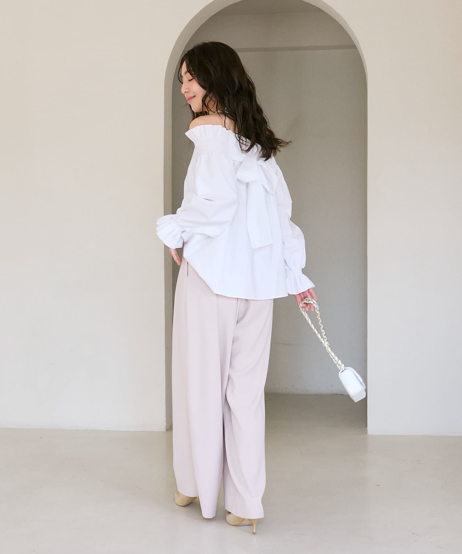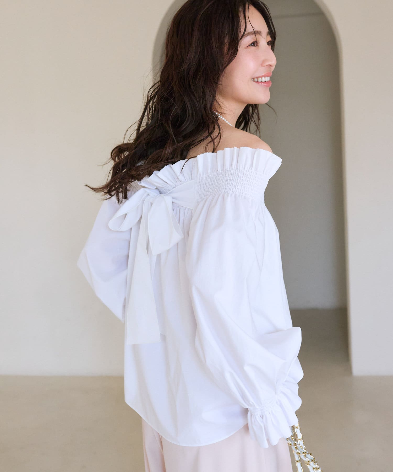 肩回りのシャーリングとバックのリボンデザインで女性らしい着こなしに。