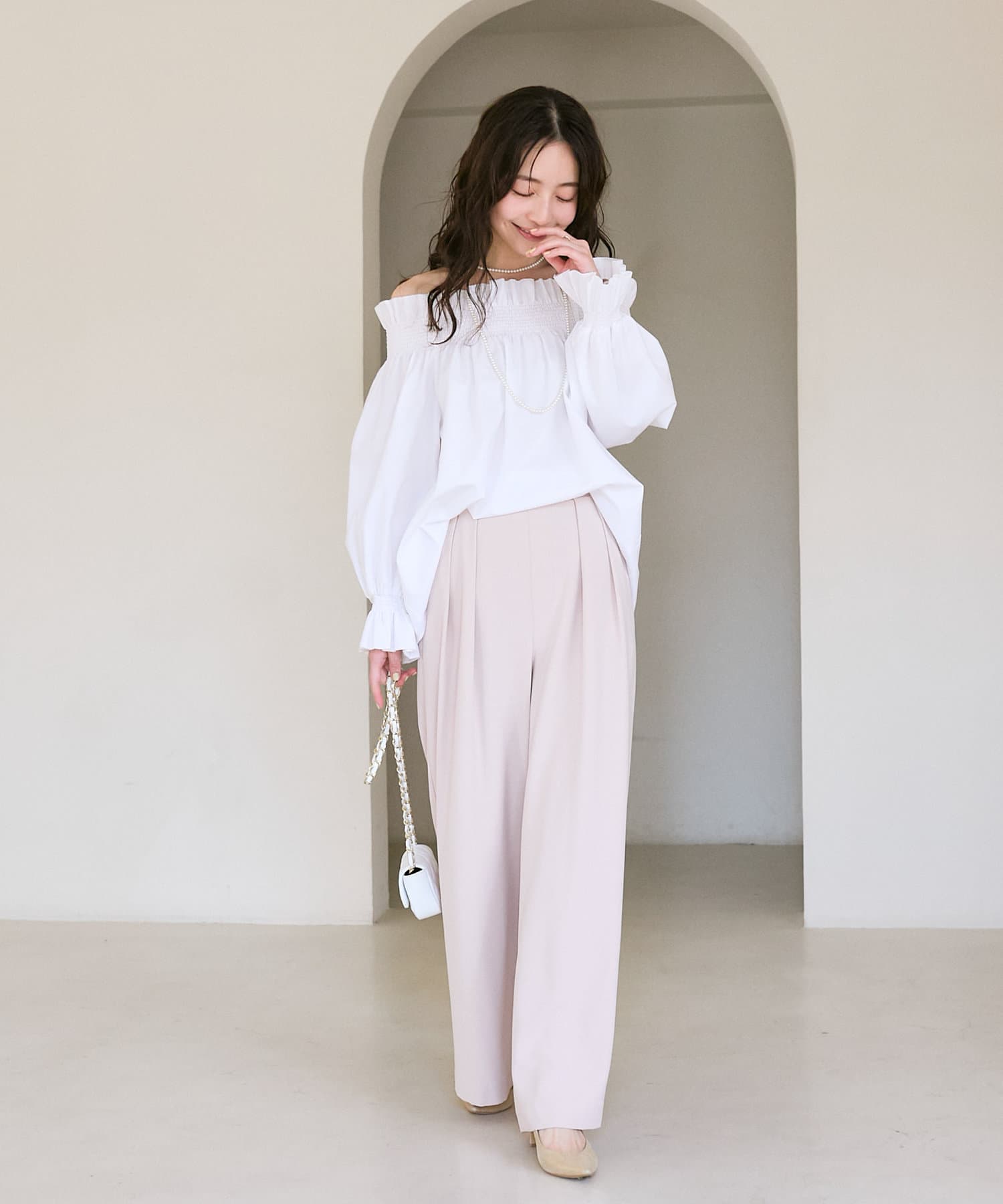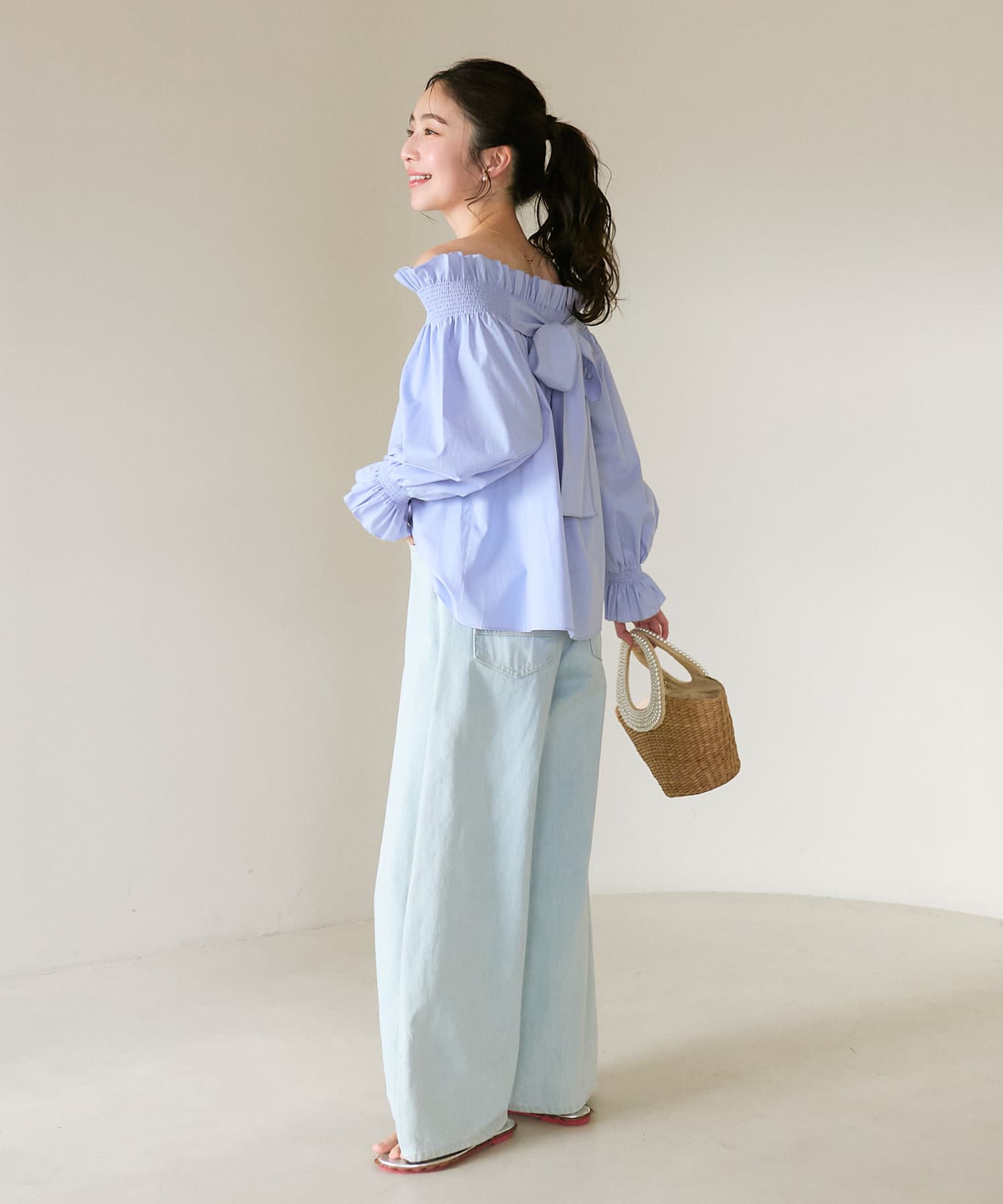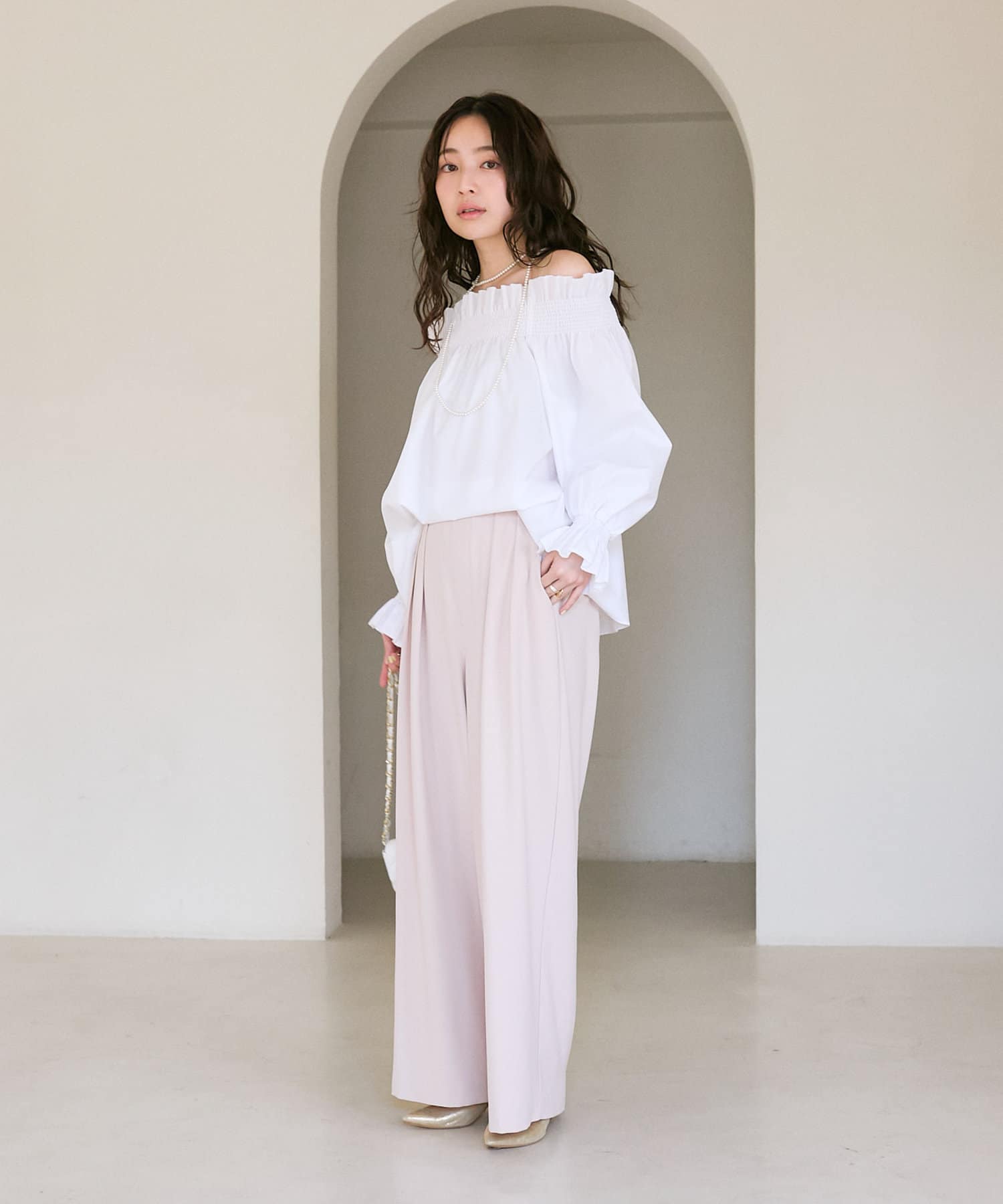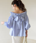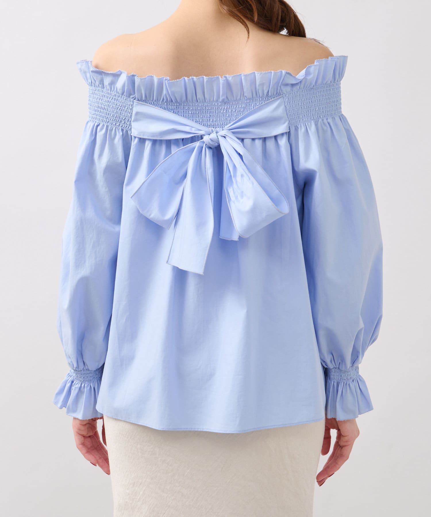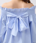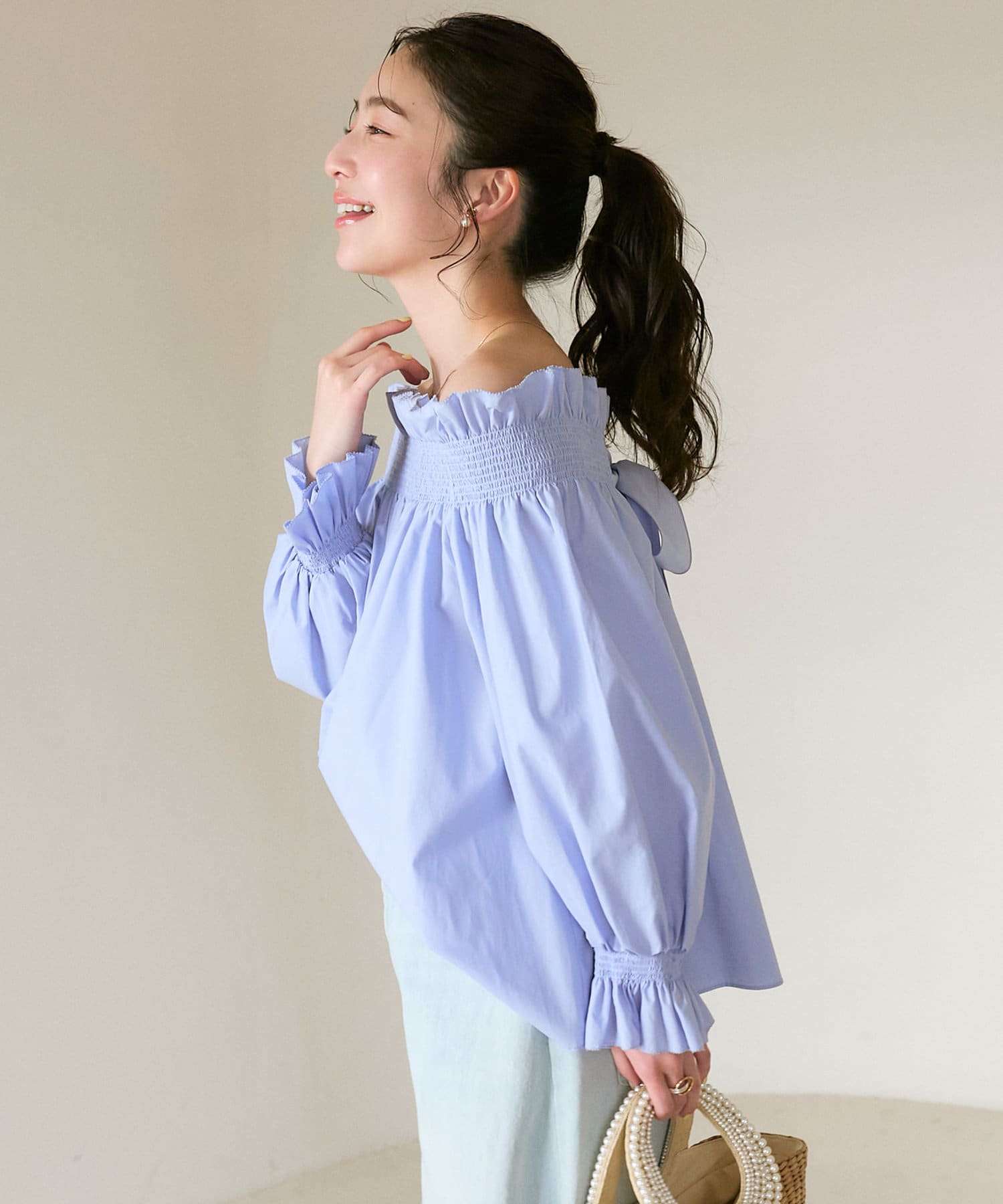 肩回りのシャーリングとバックのリボンデザインで女性らしい着こなしに。