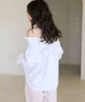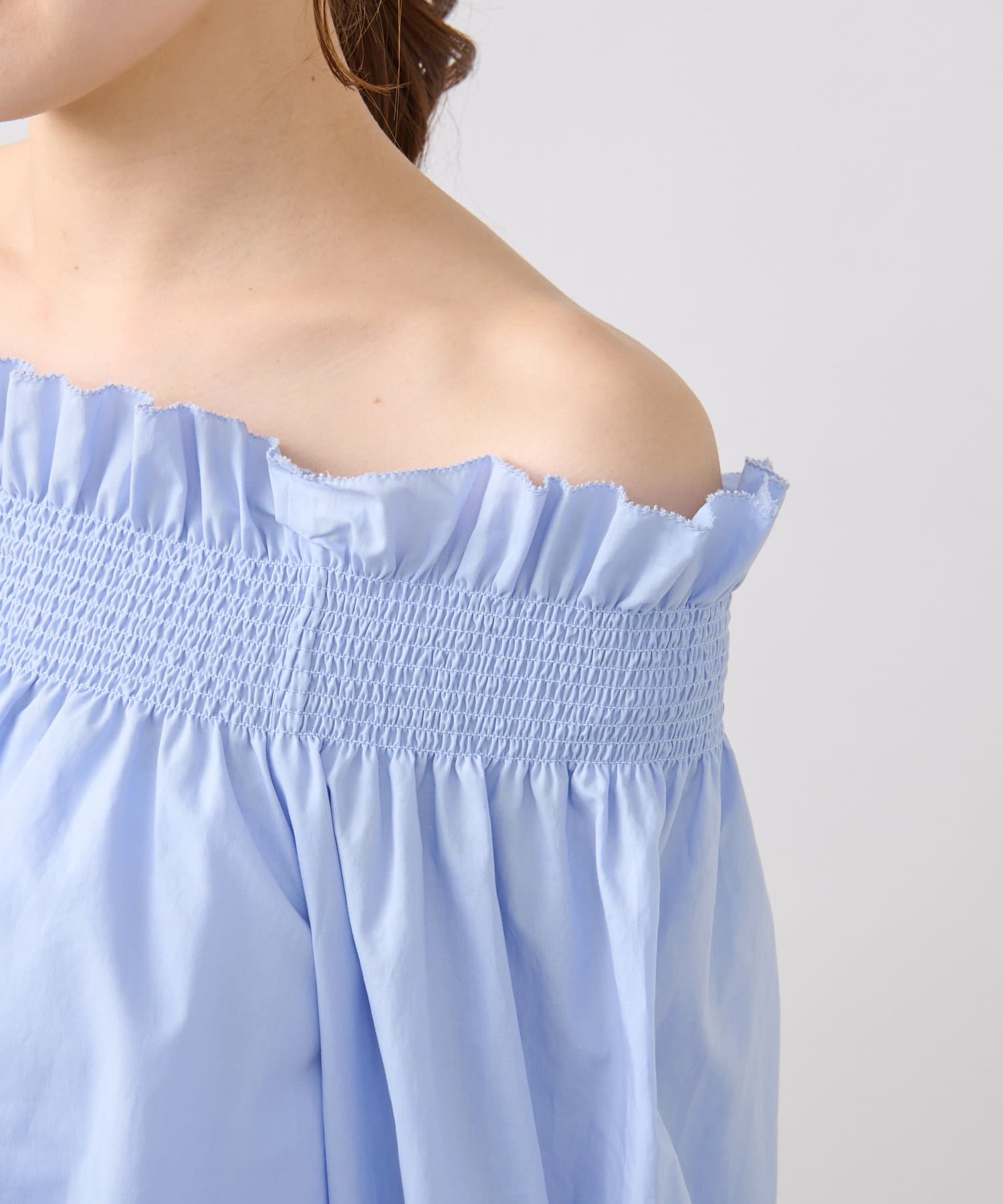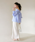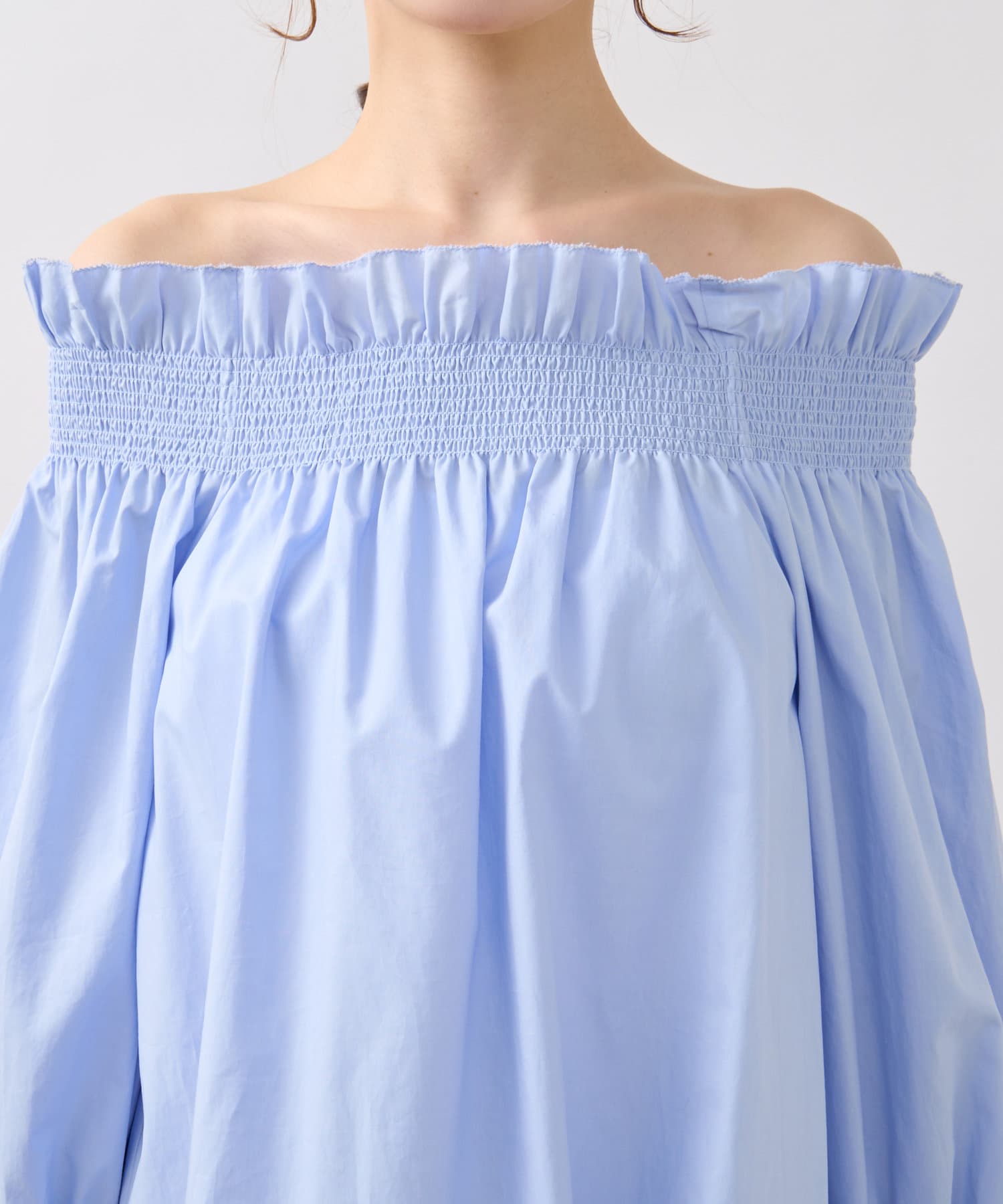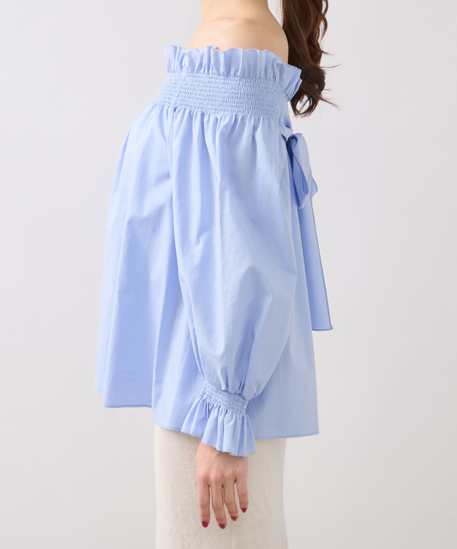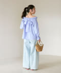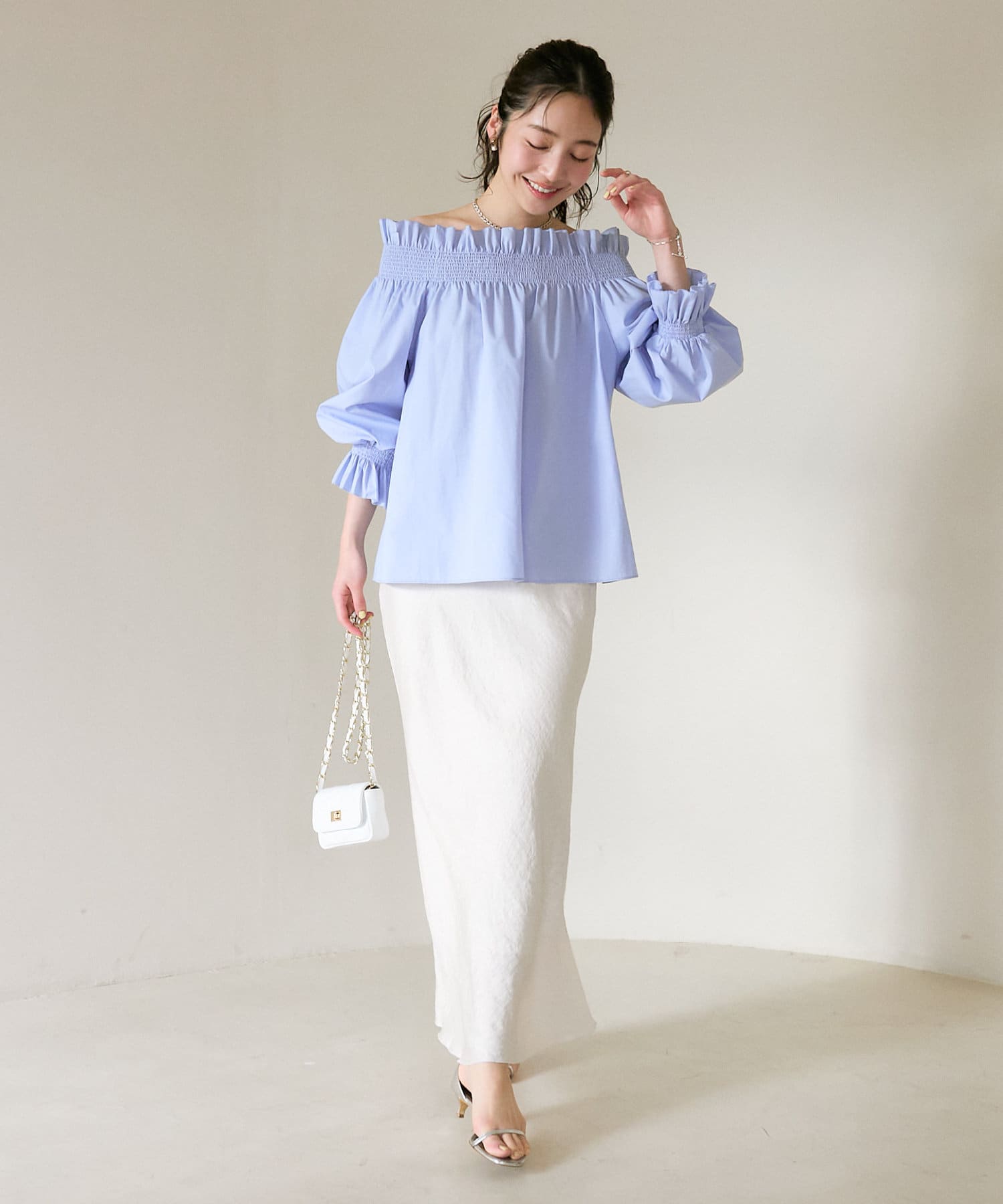 肩回りのシャーリングとバックのリボンデザインで女性らしい着こなしに。