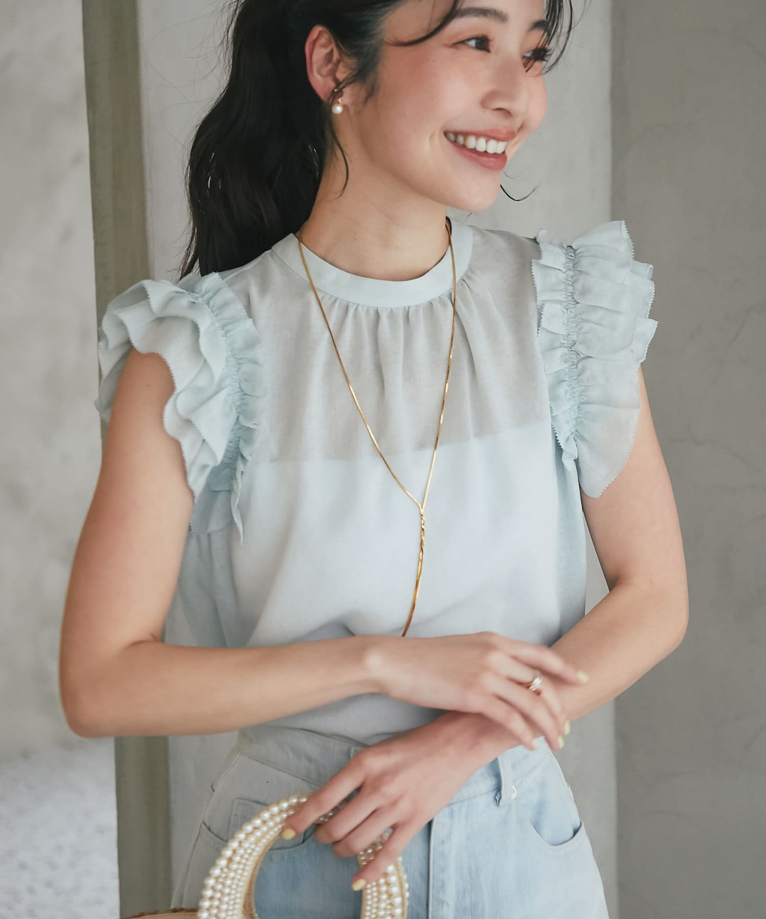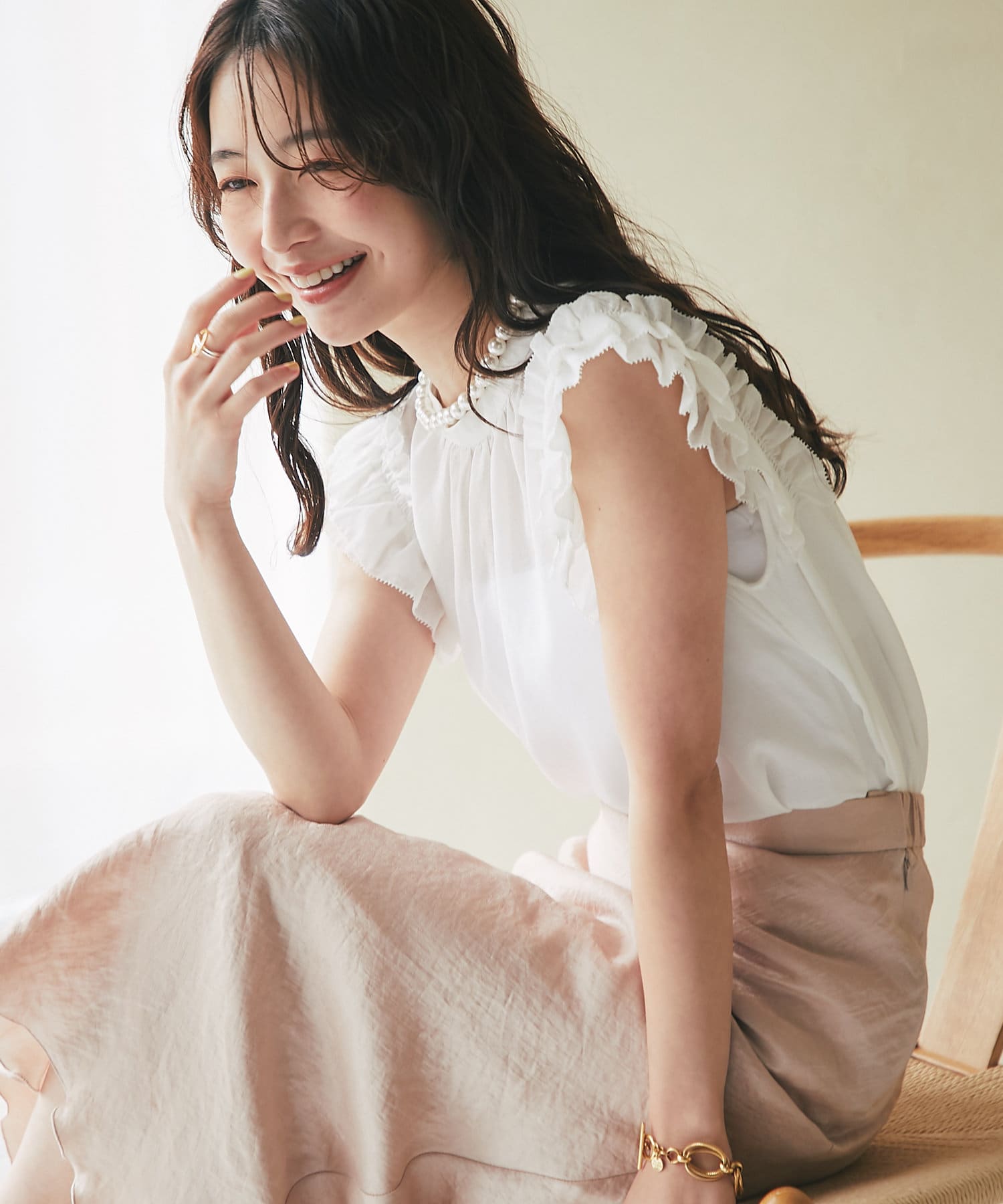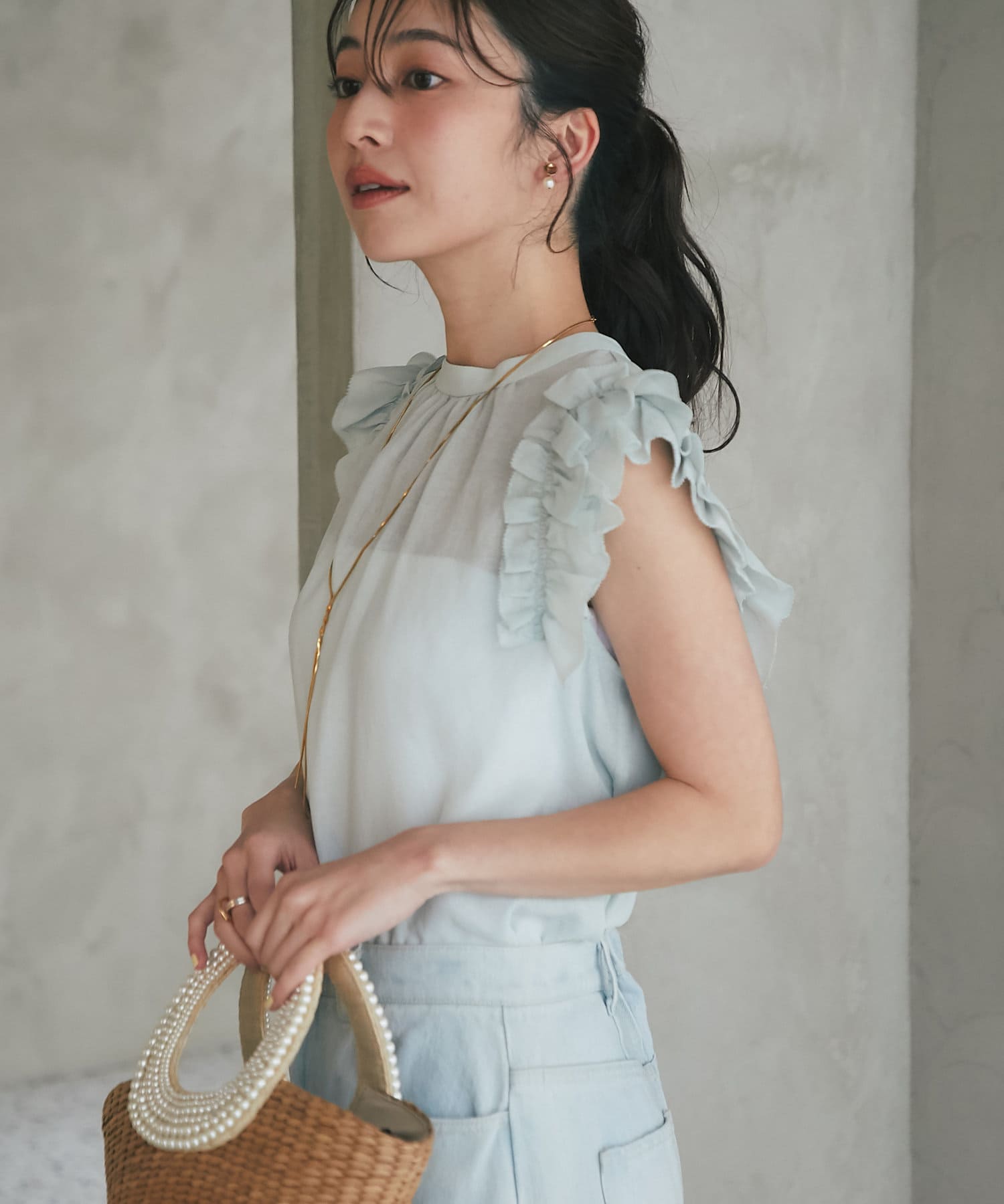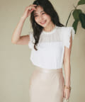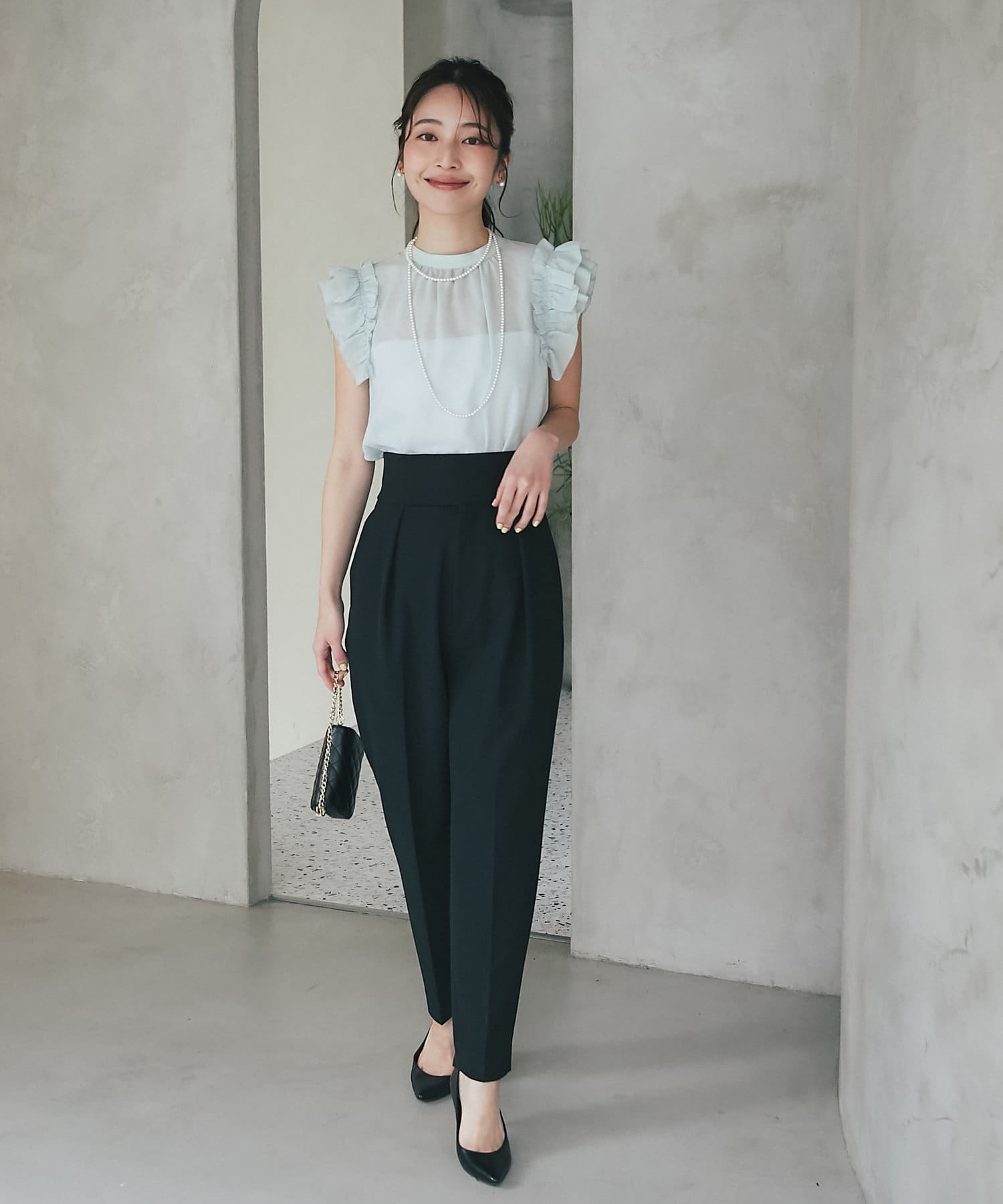 また、襟元の露出をおさえることで、ノースリーブとのバランスもよく、品の良い着こなしが可能です。