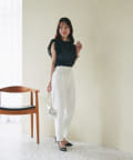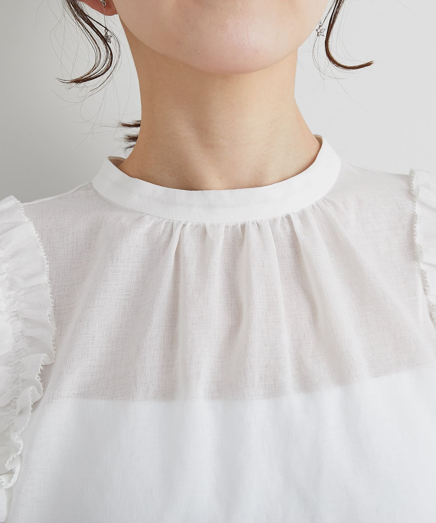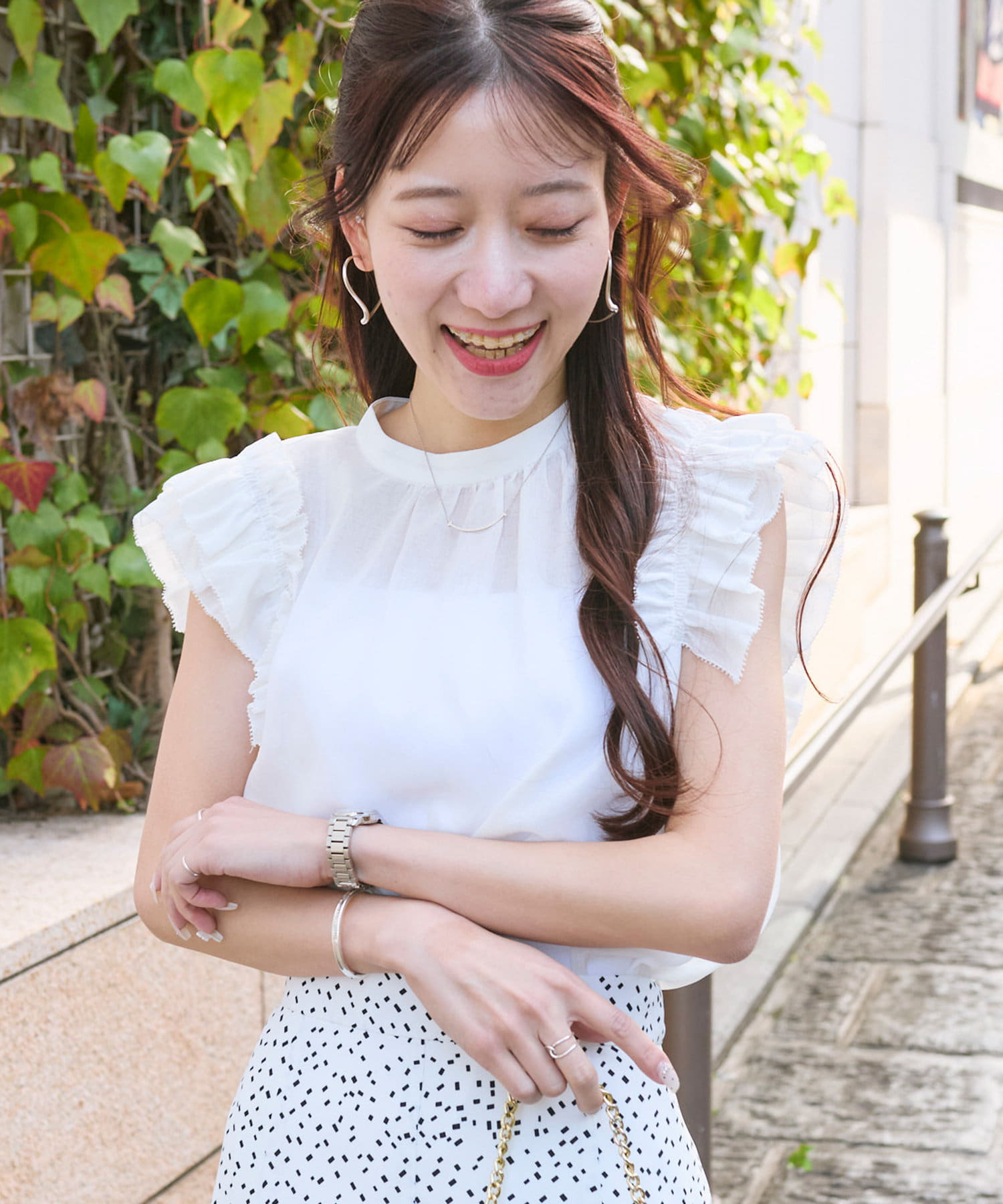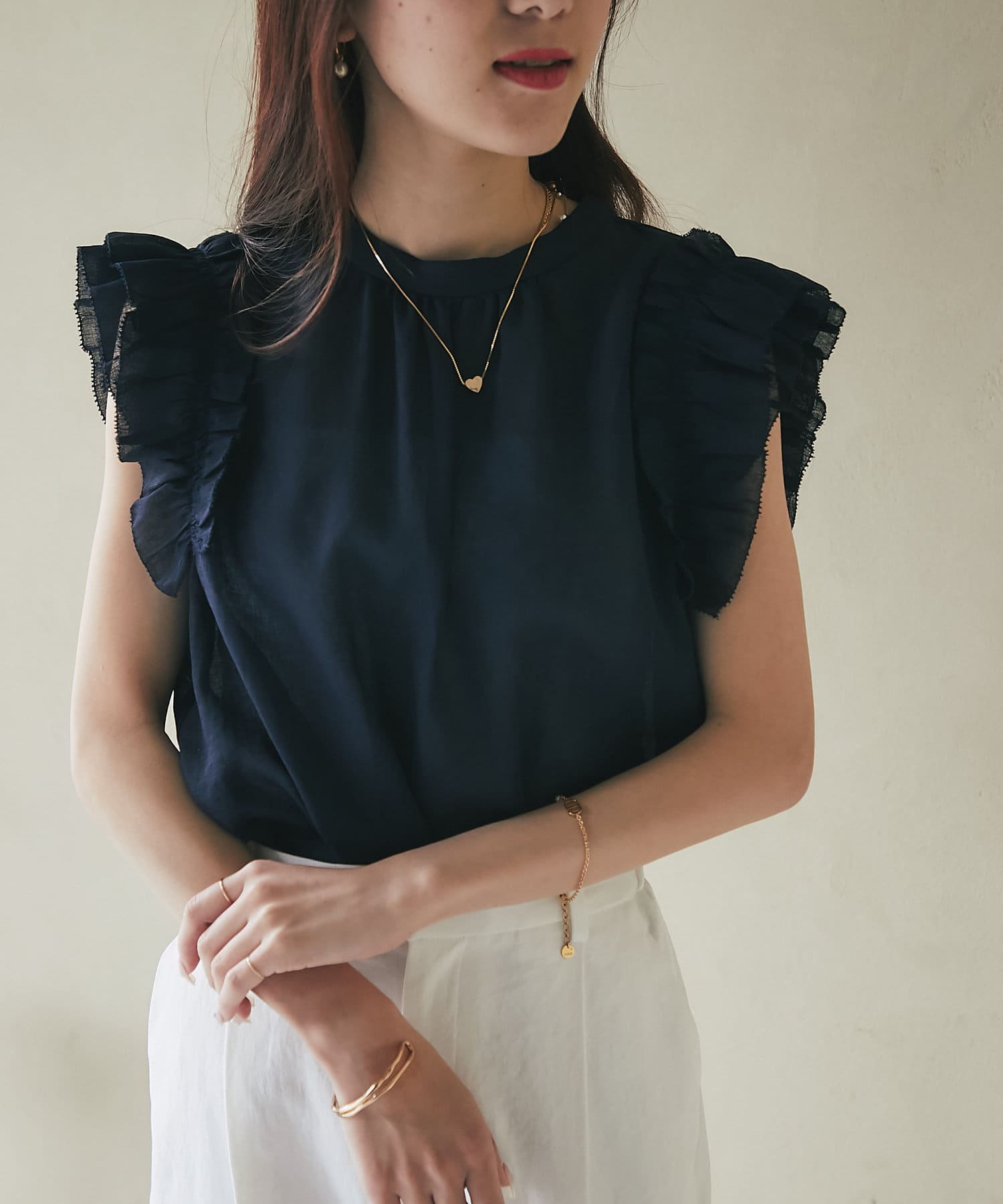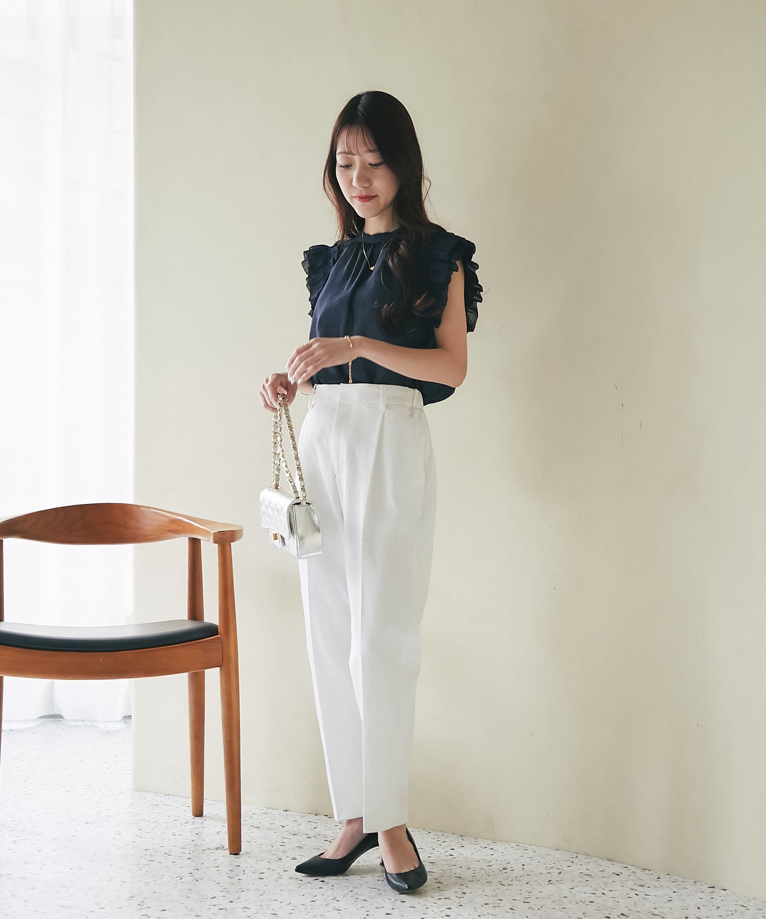また、襟元の露出をおさえることで、ノースリーブとのバランスもよく、品の良い着こなしが可能です。