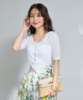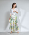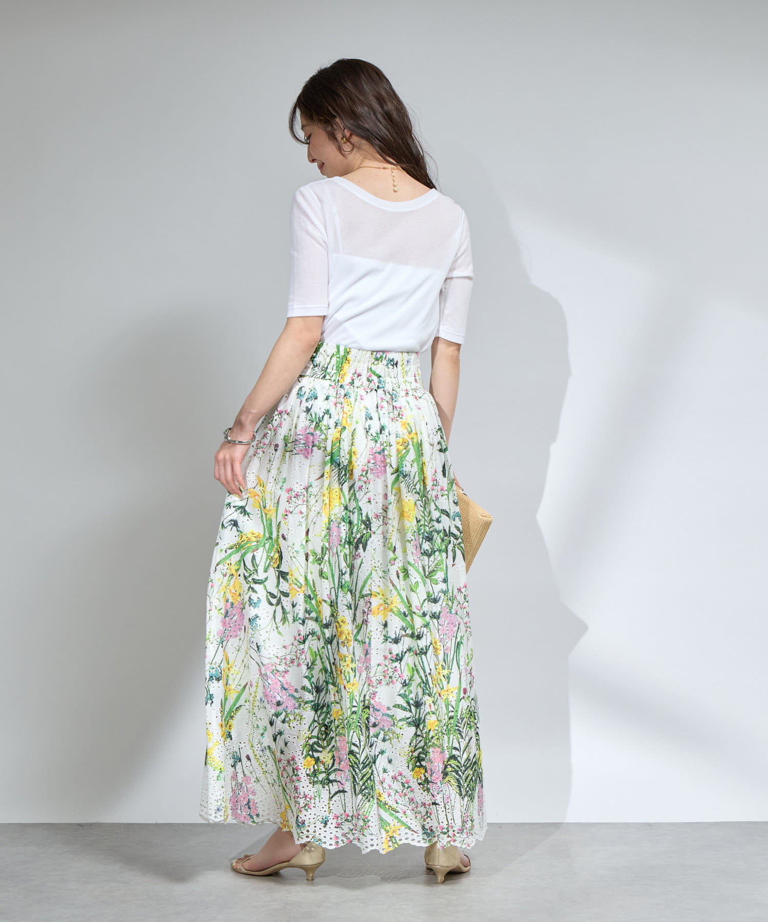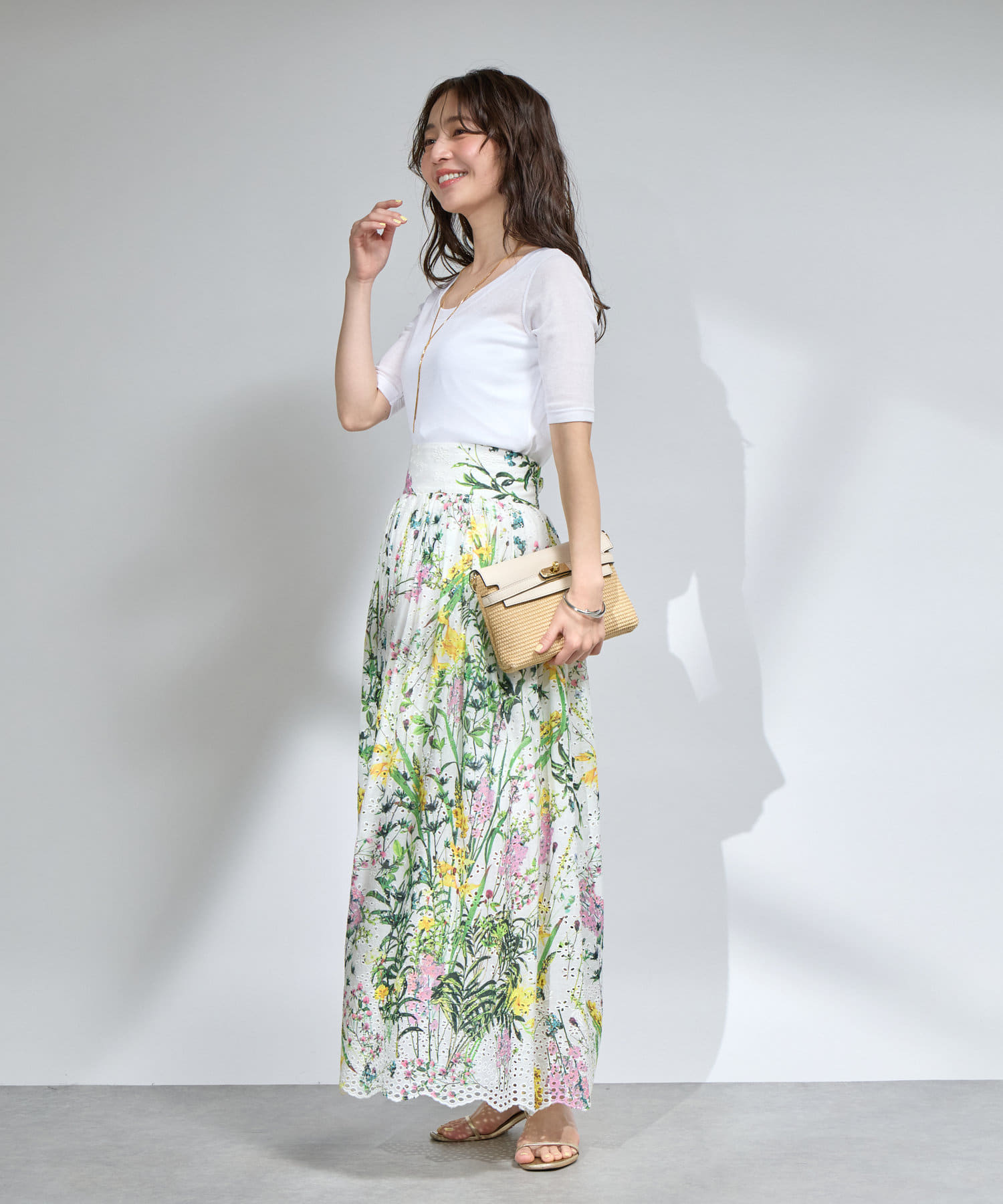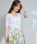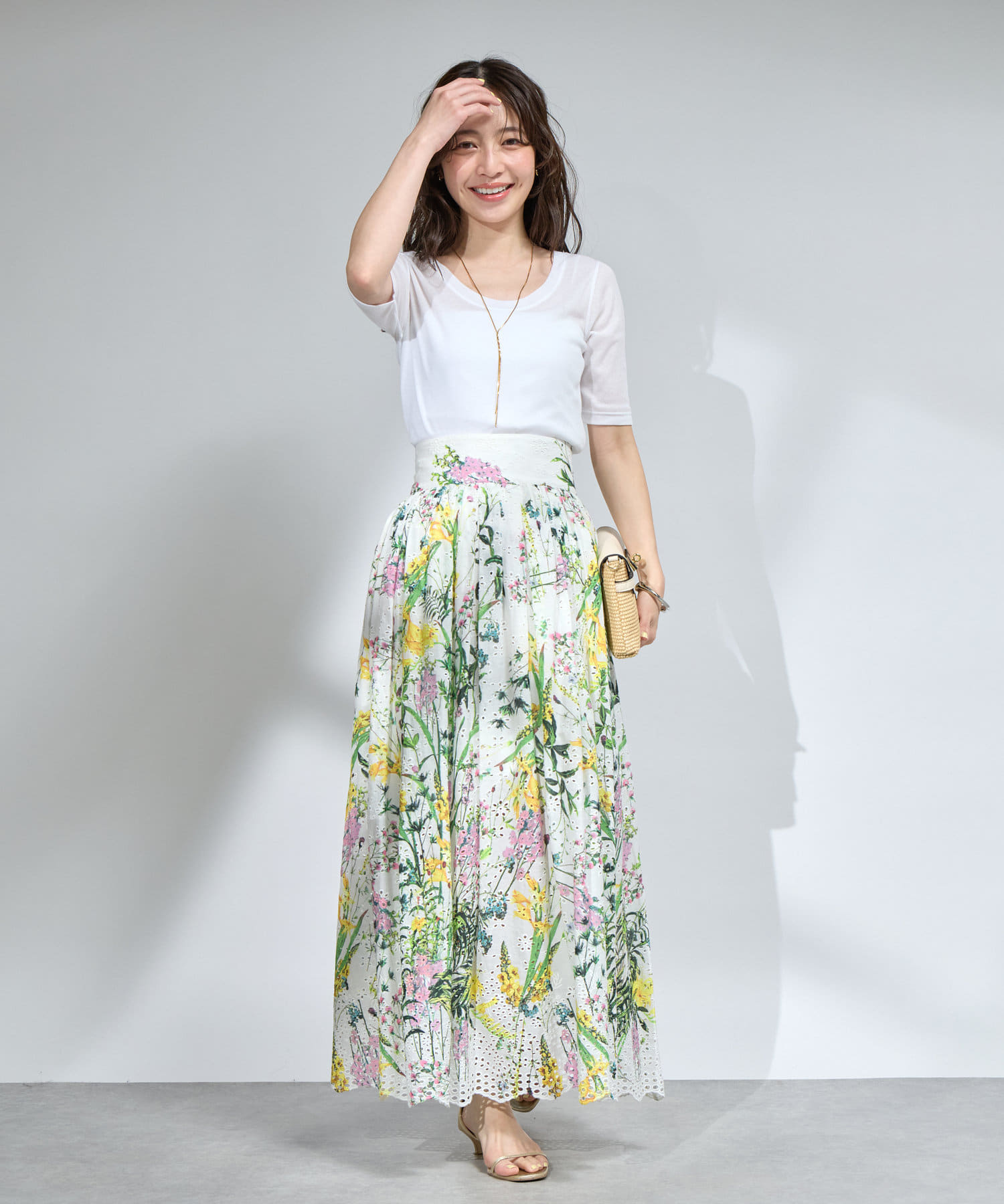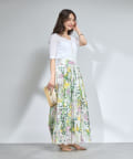 花柄のスカートと合わせてフェミニンなスタイルに。