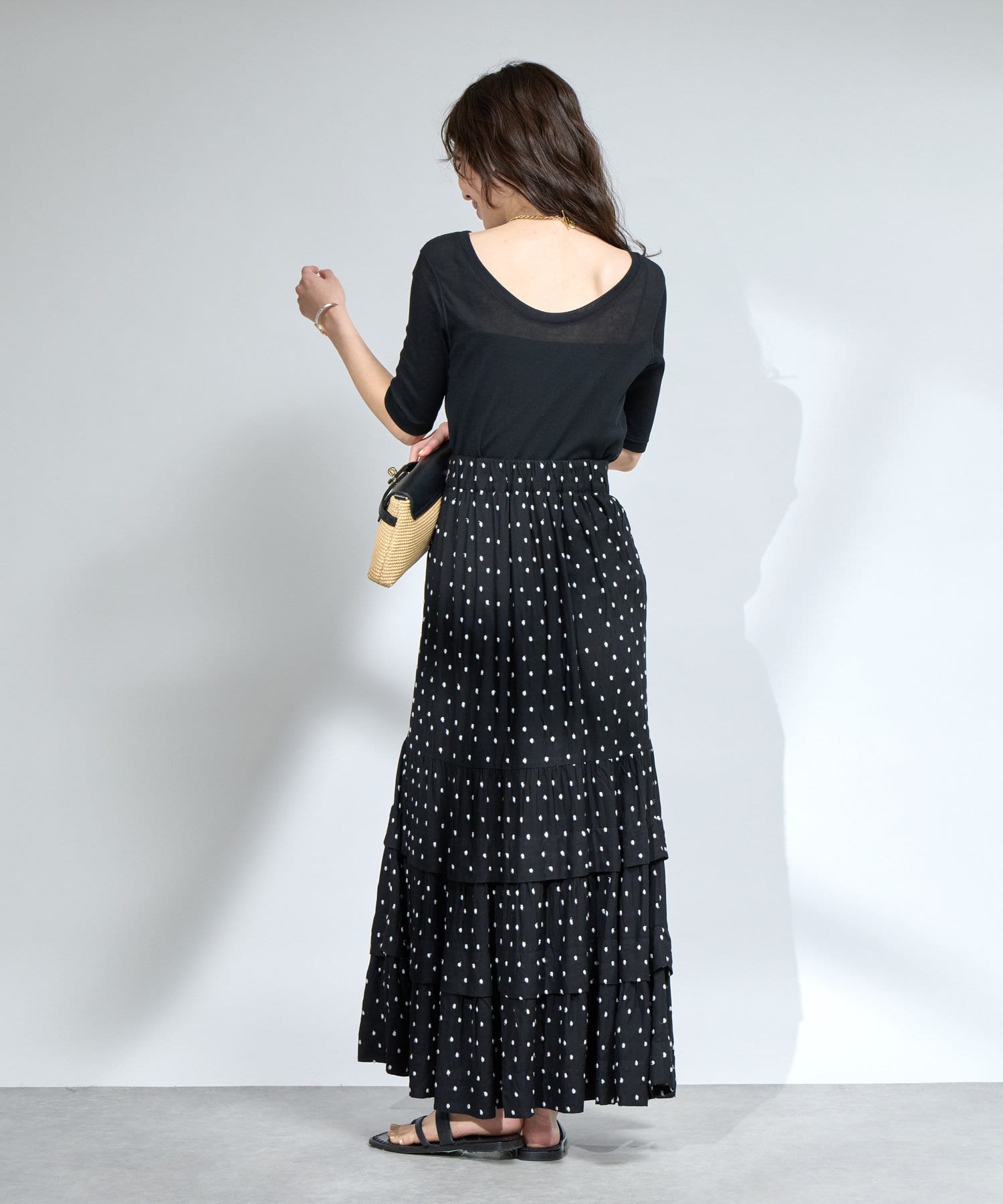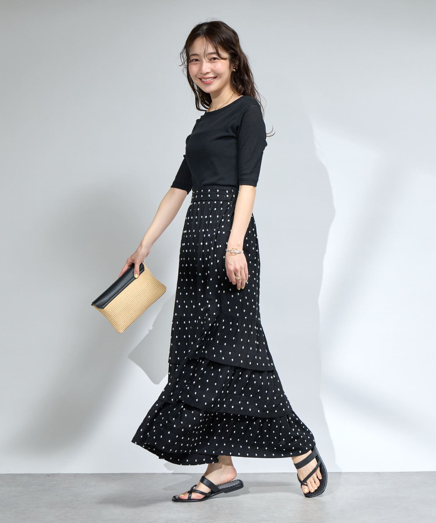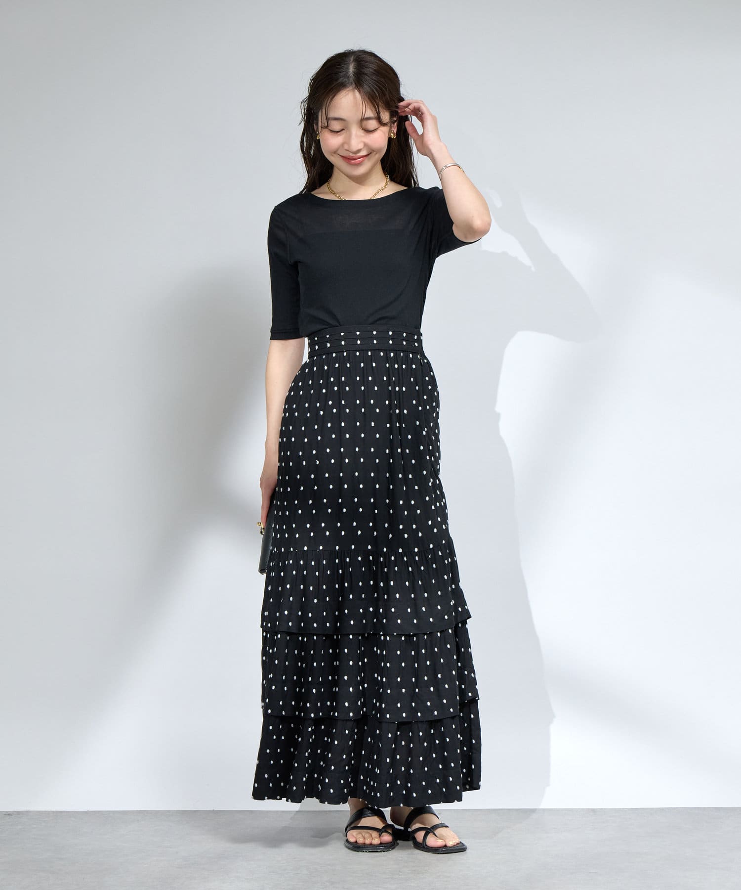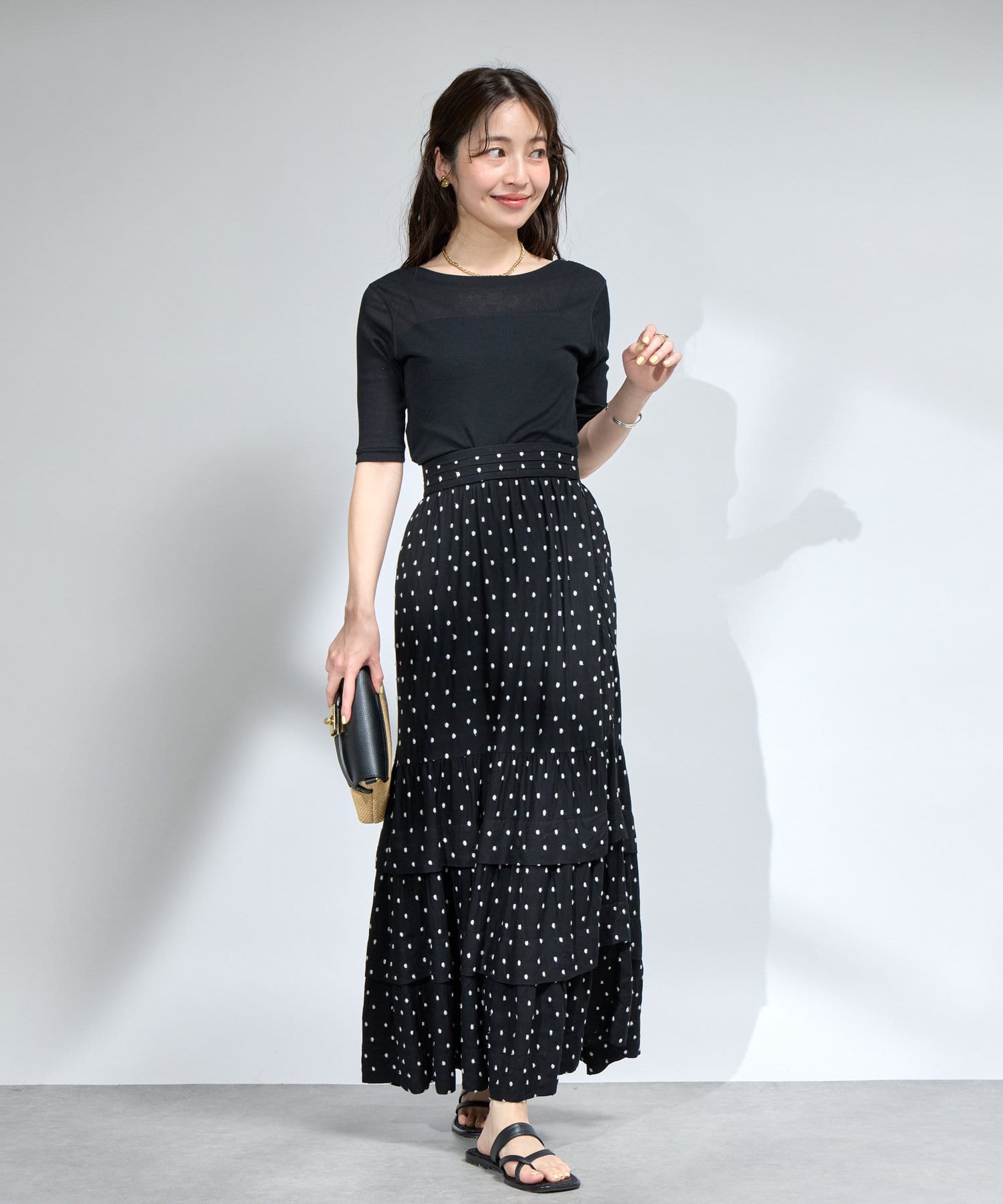 花柄のスカートと合わせてフェミニンなスタイルに。