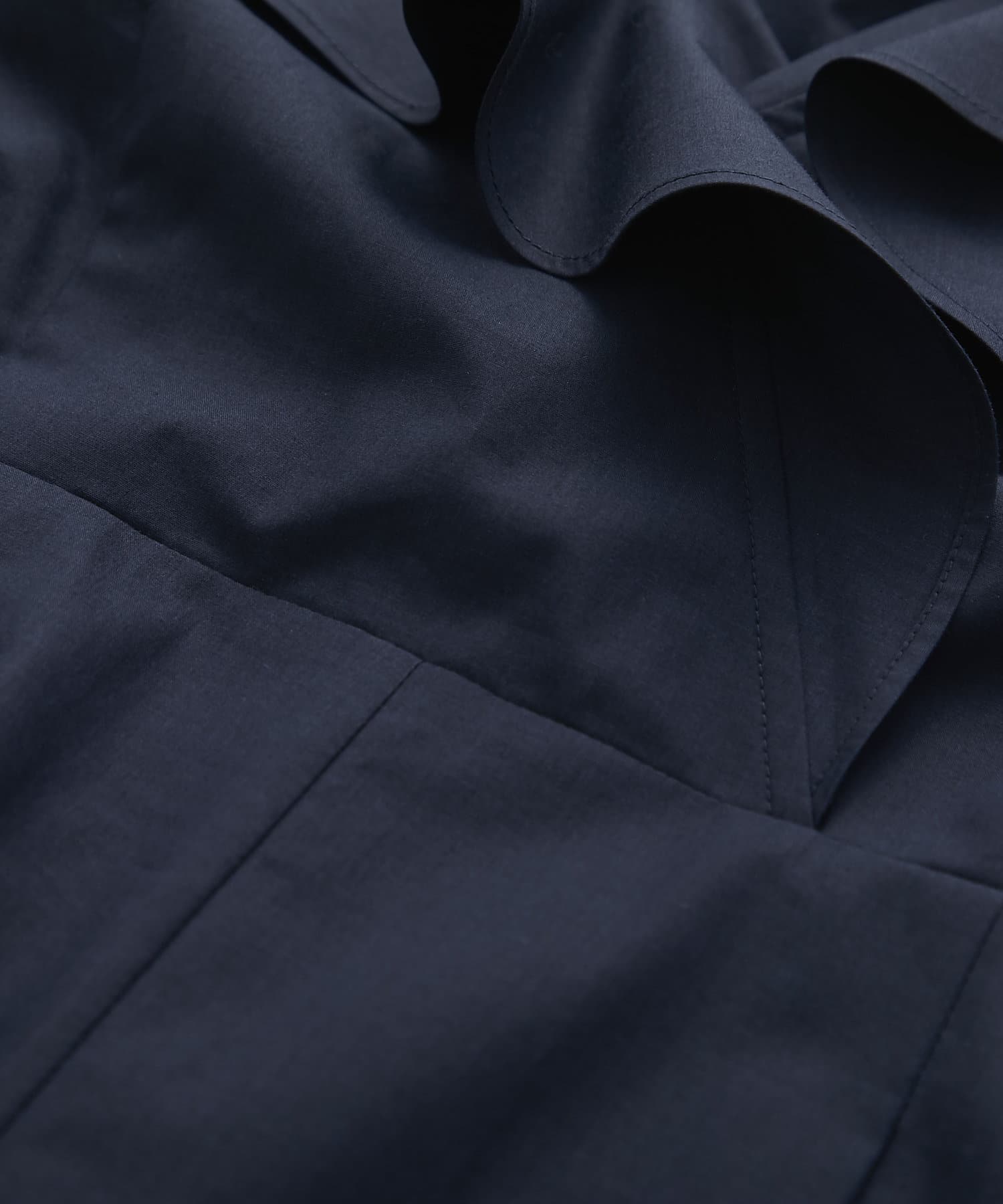 首元を美しく飾るVネックと、肩から袖にかけて施されたたっぷりのフリルが、
