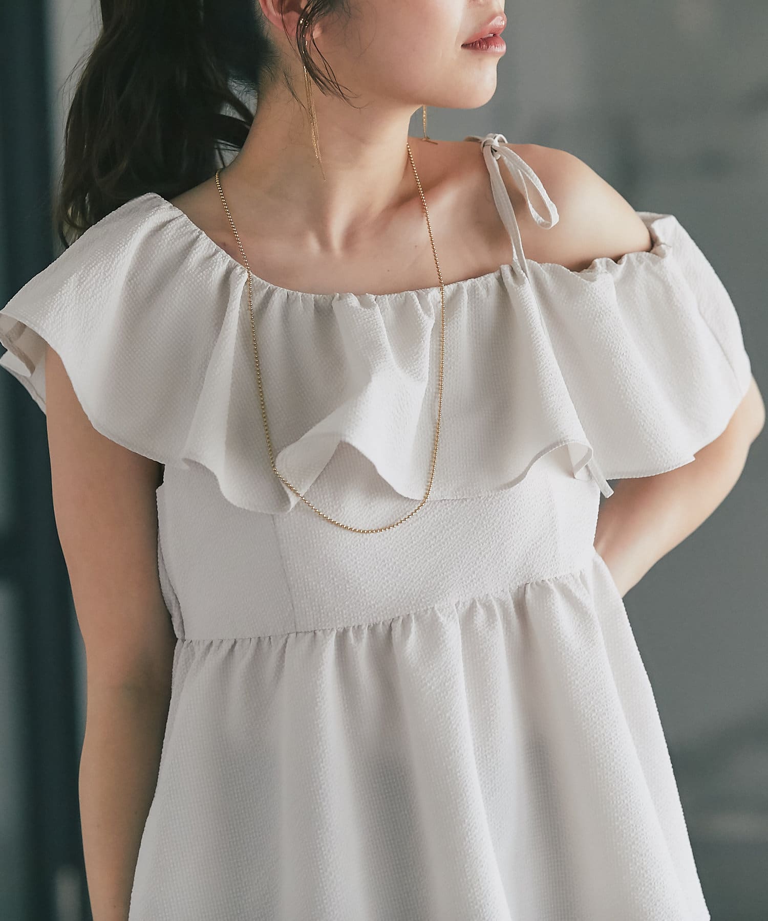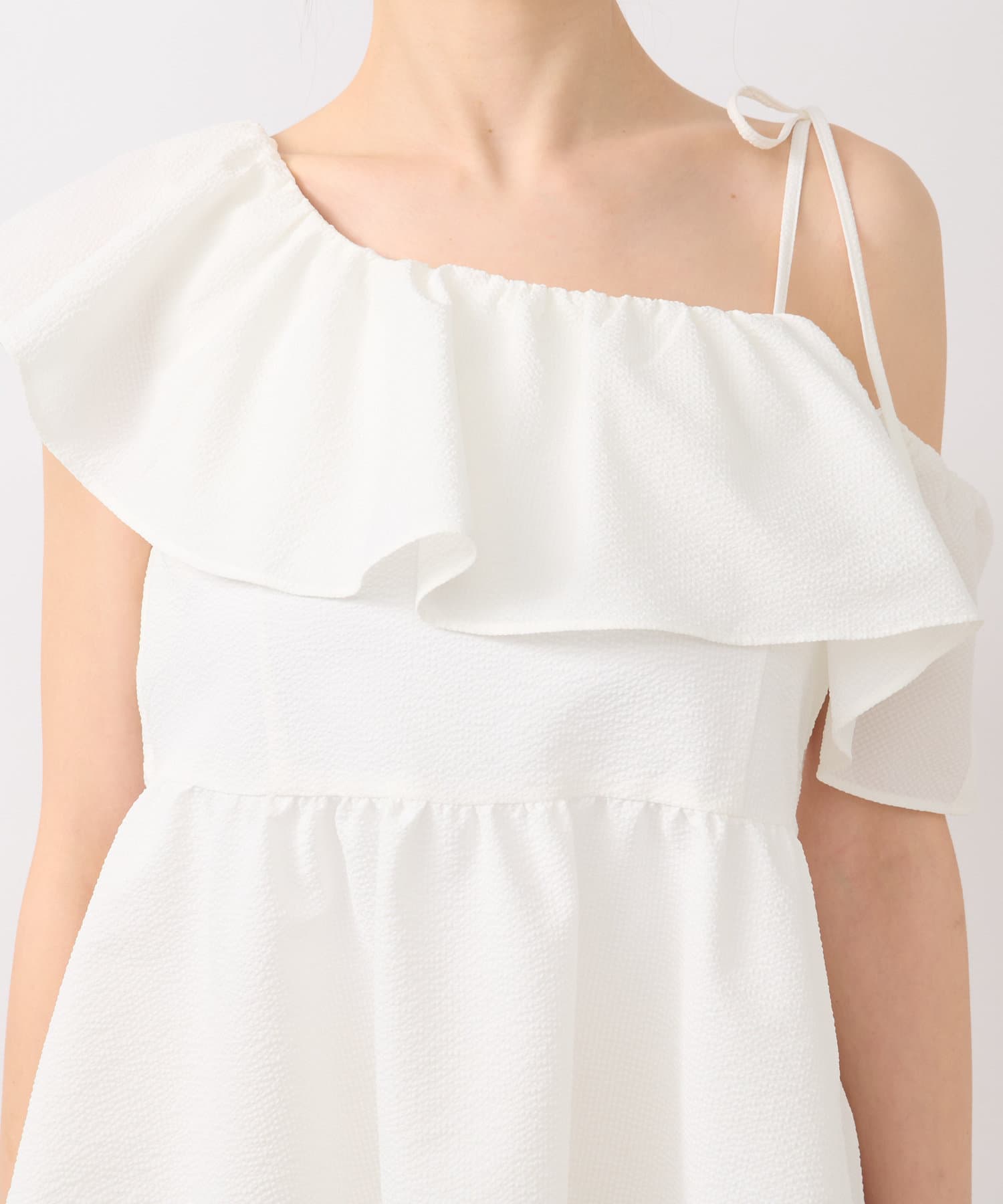 アシメのワンショルダーのようなデザインで片側には細いキャミソールのようなストラップ付き。