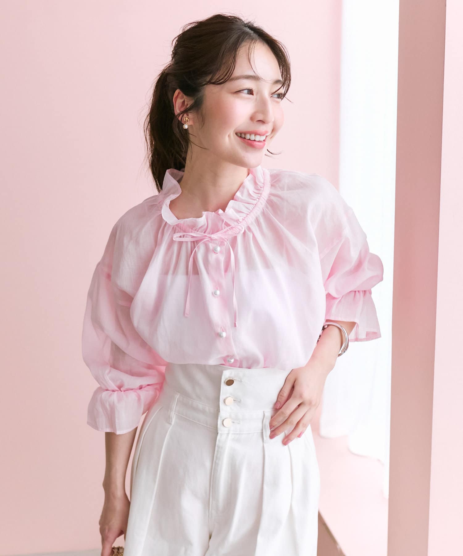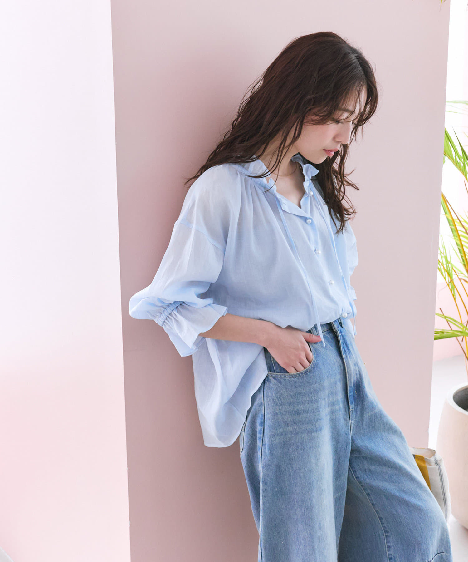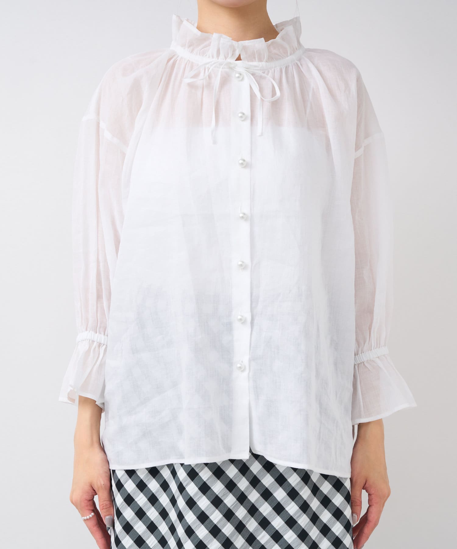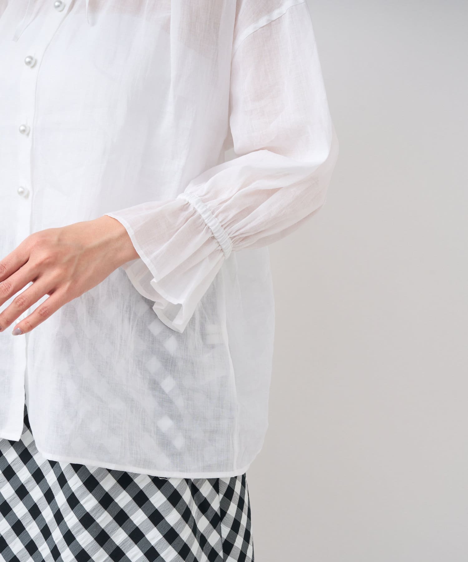【愛されエアリーブラウス】シアーリネン混パール釦リボンブラウス