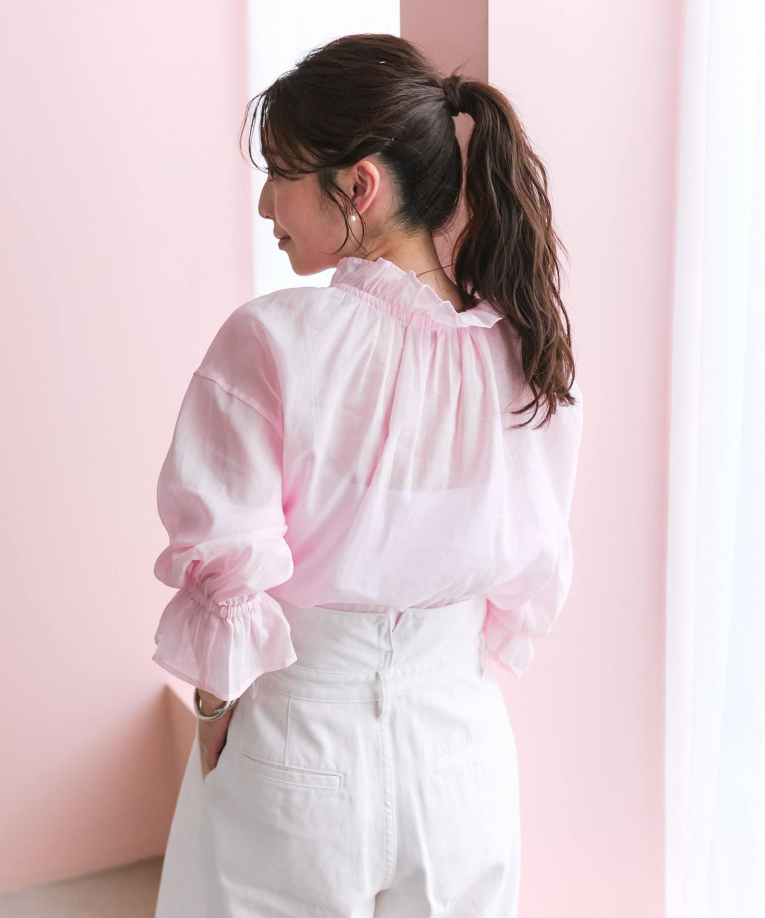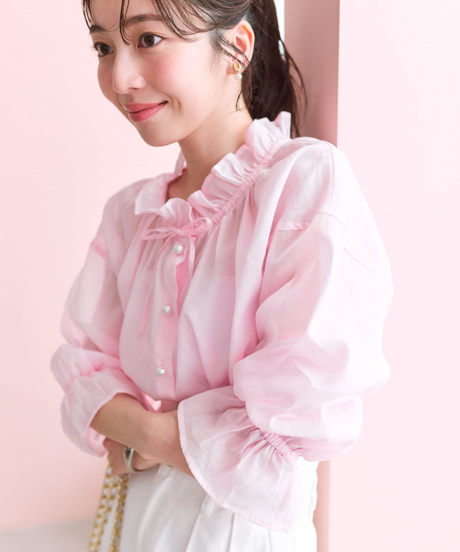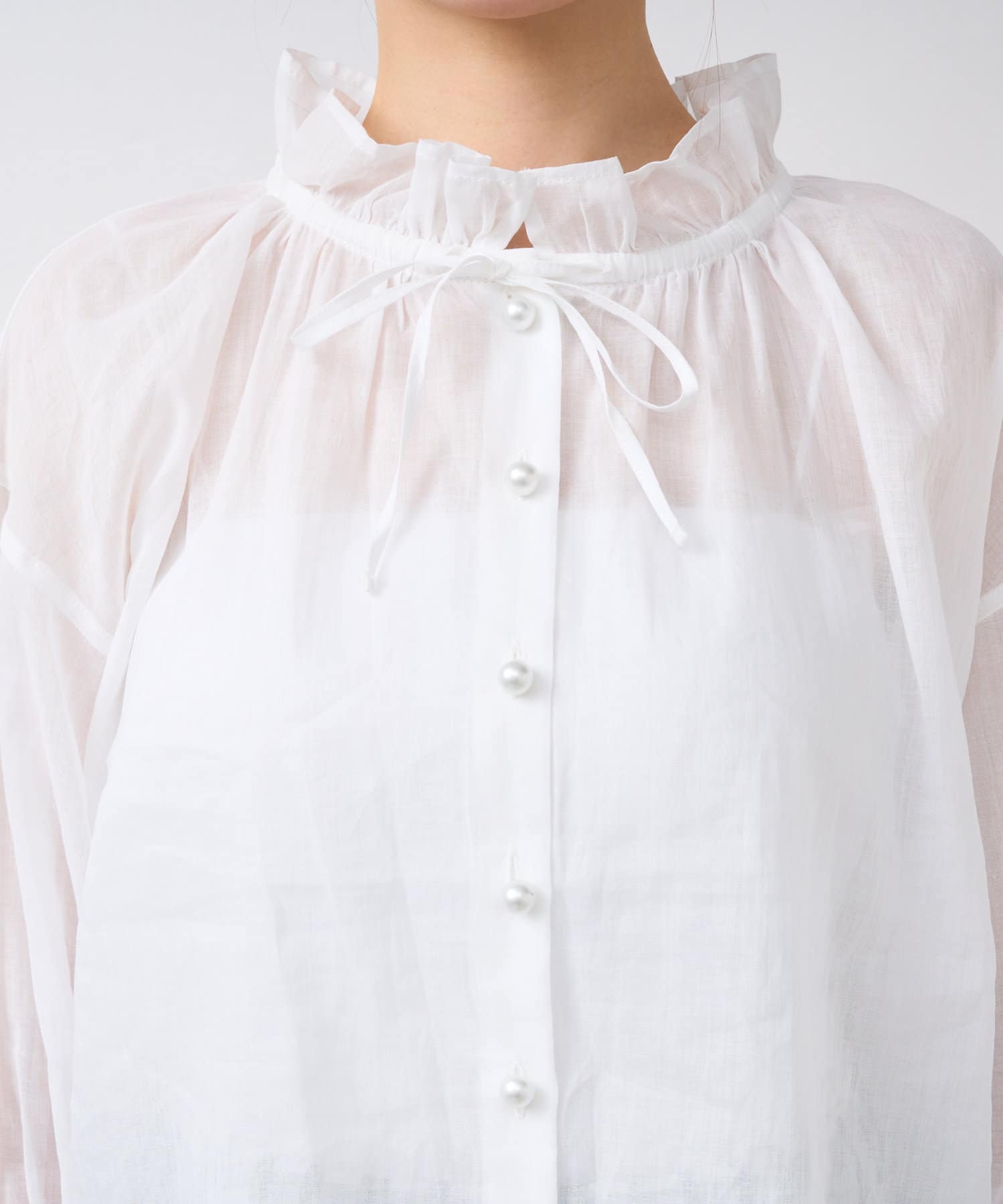 【愛されエアリーブラウス】シアーリネン混パール釦リボンブラウス
