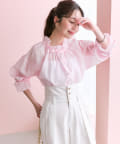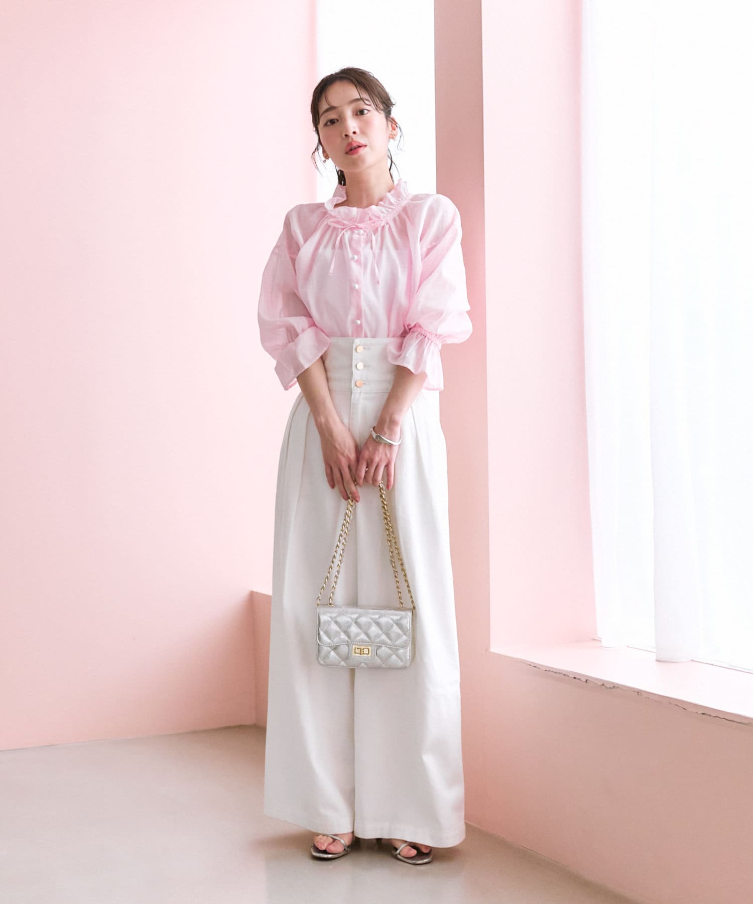 首元のギャザーとリボンが、フェミニンな雰囲気に。