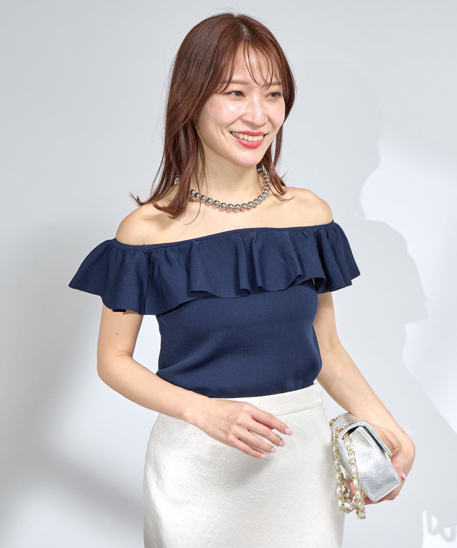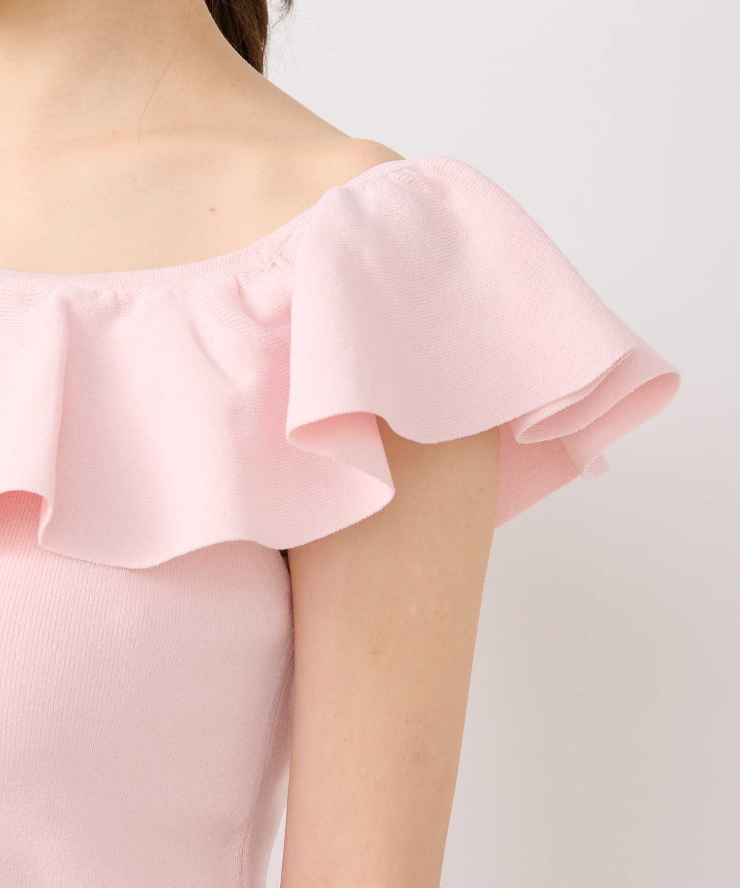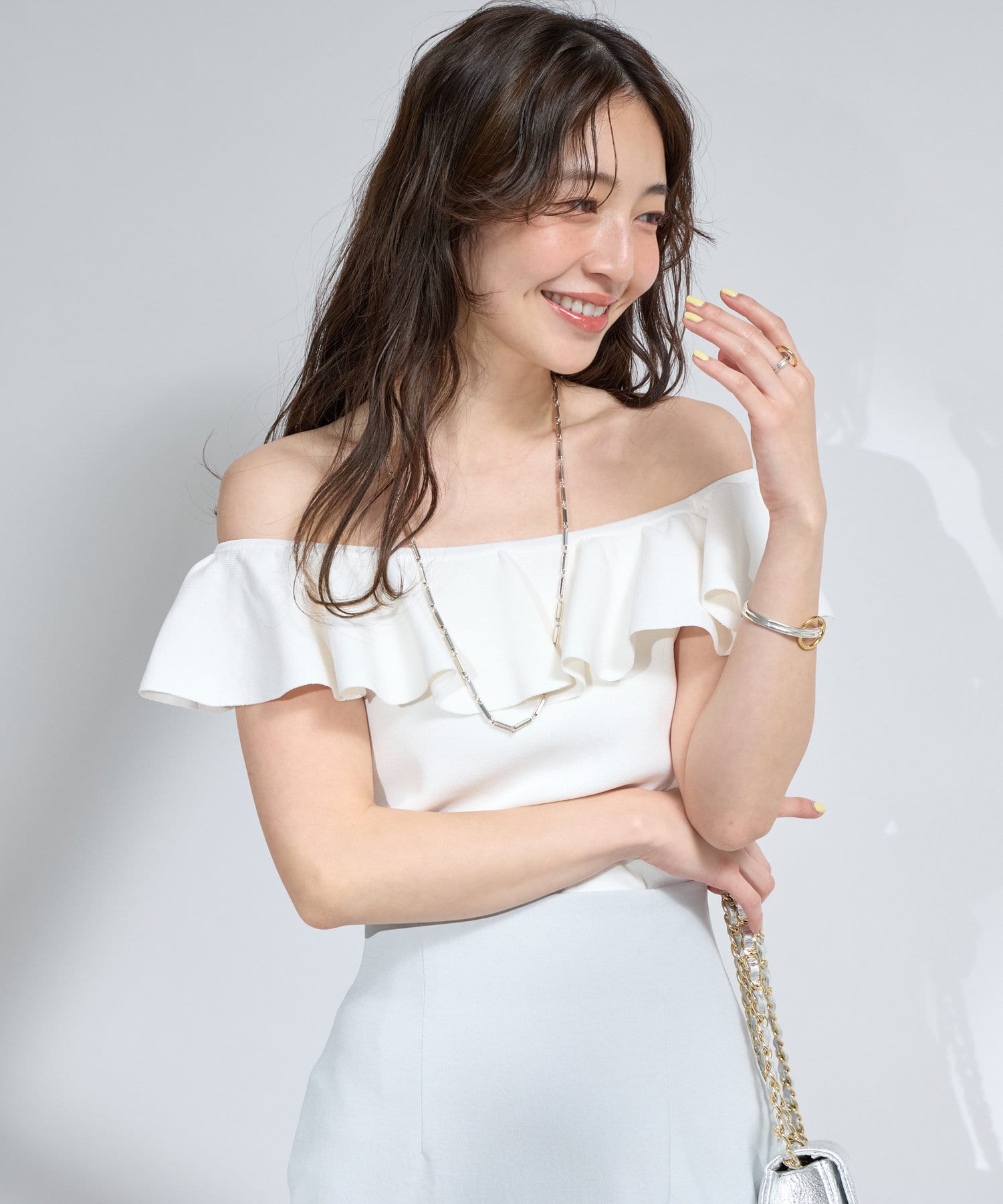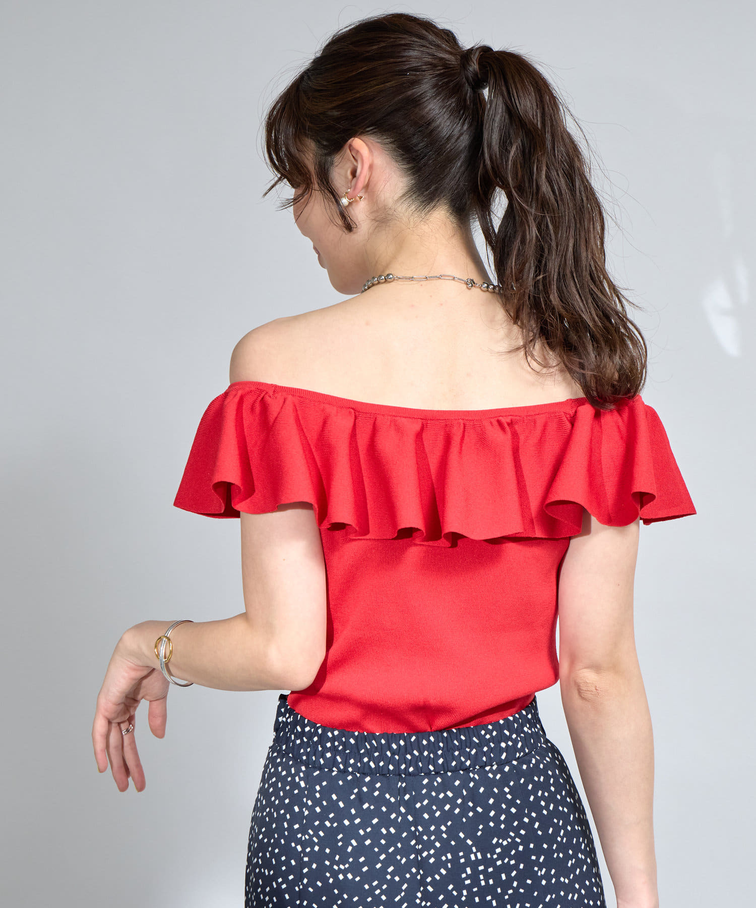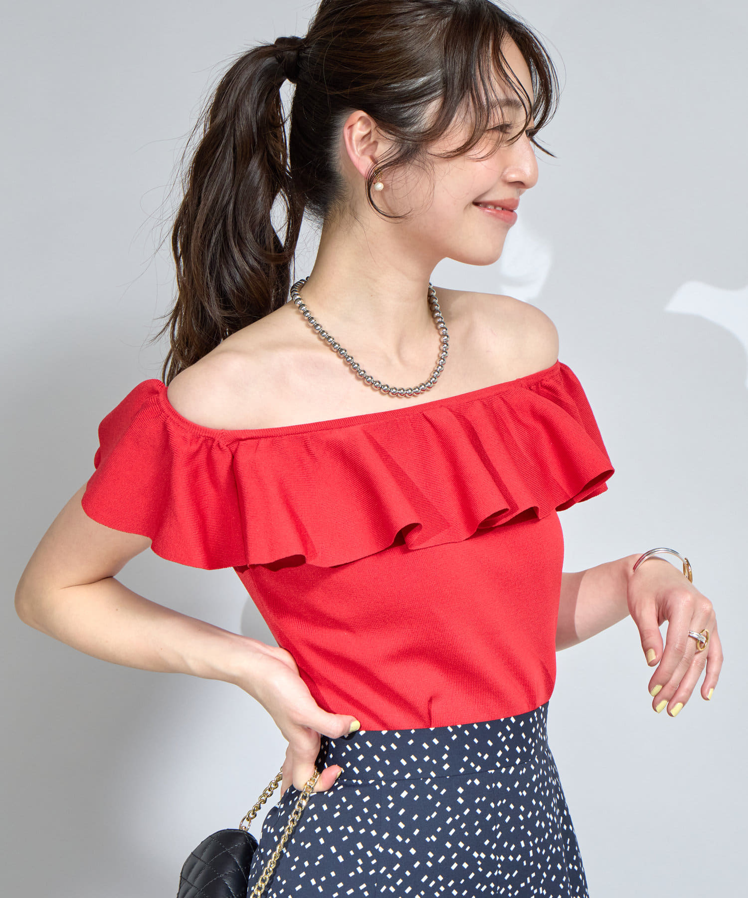 クールタッチ生地で機能性も兼ね備えた、華やかなオフショルラッフルニット。