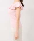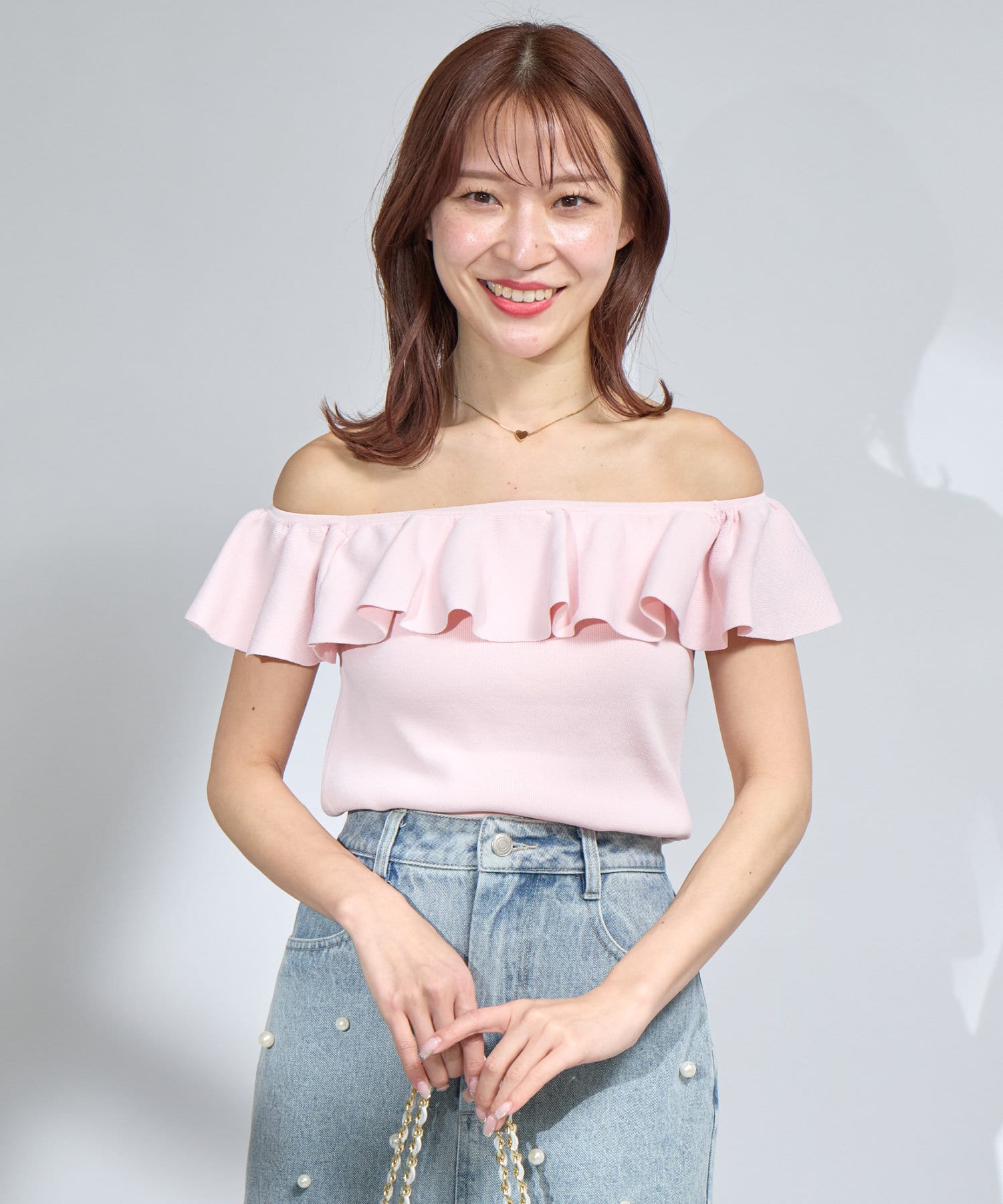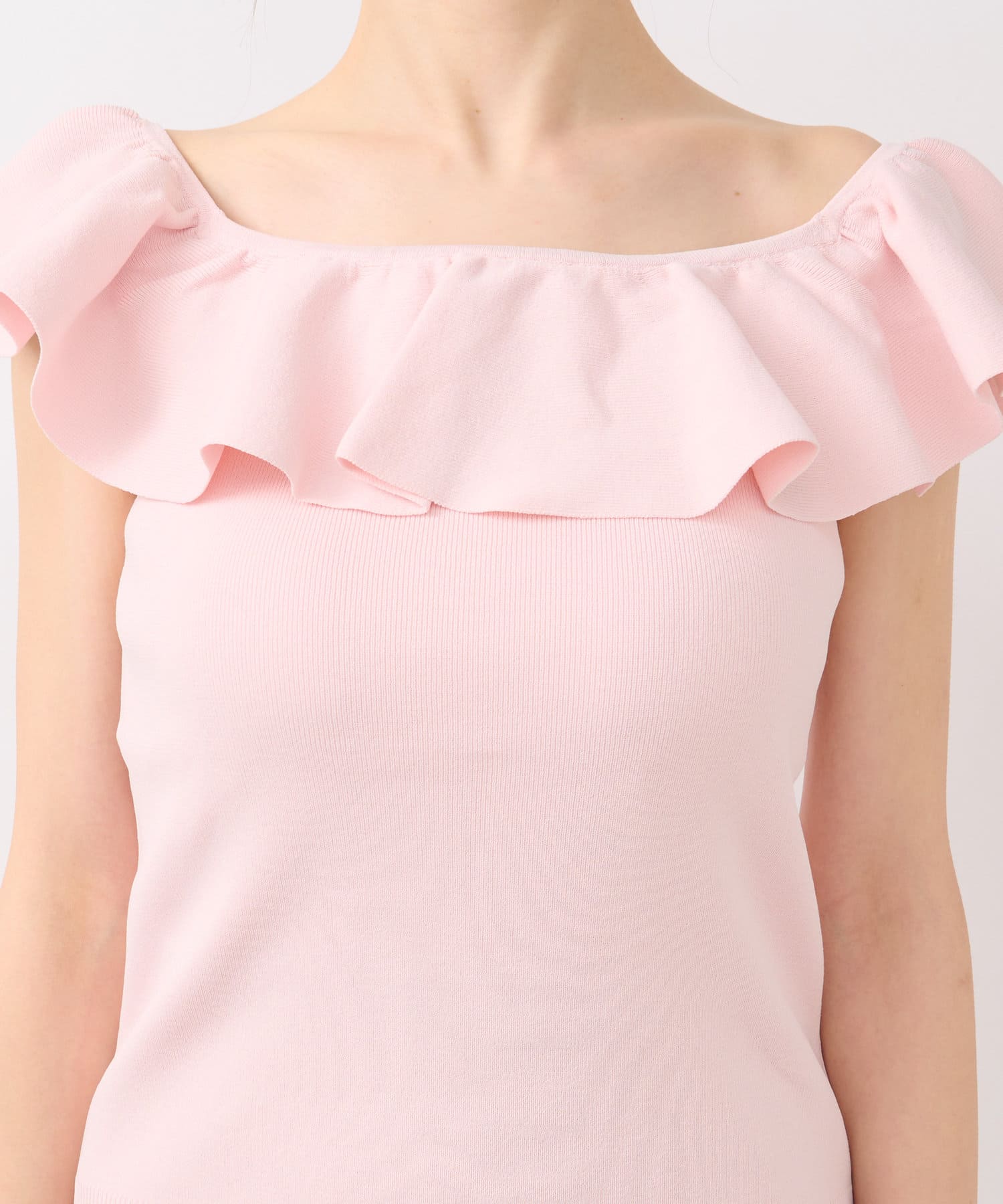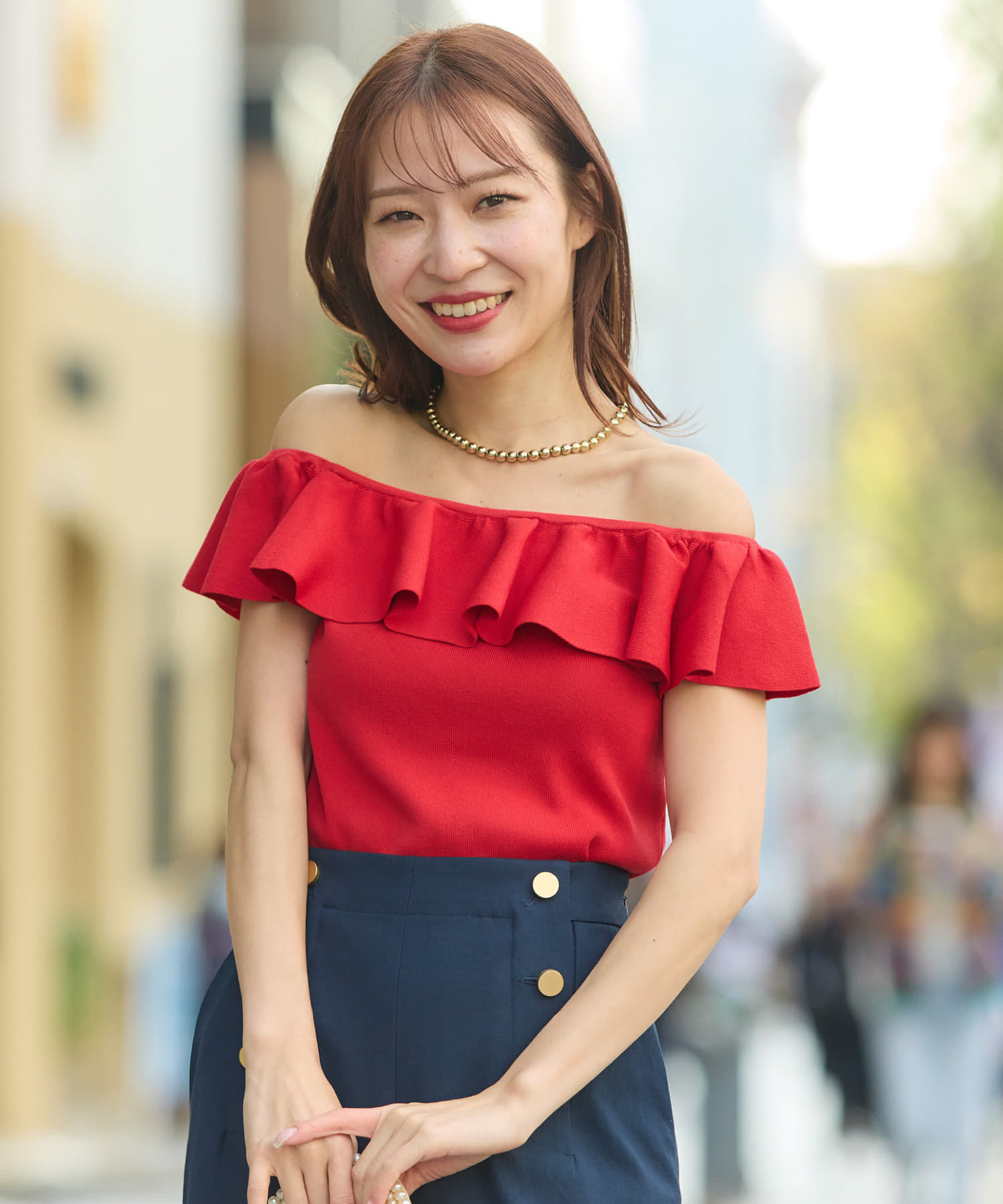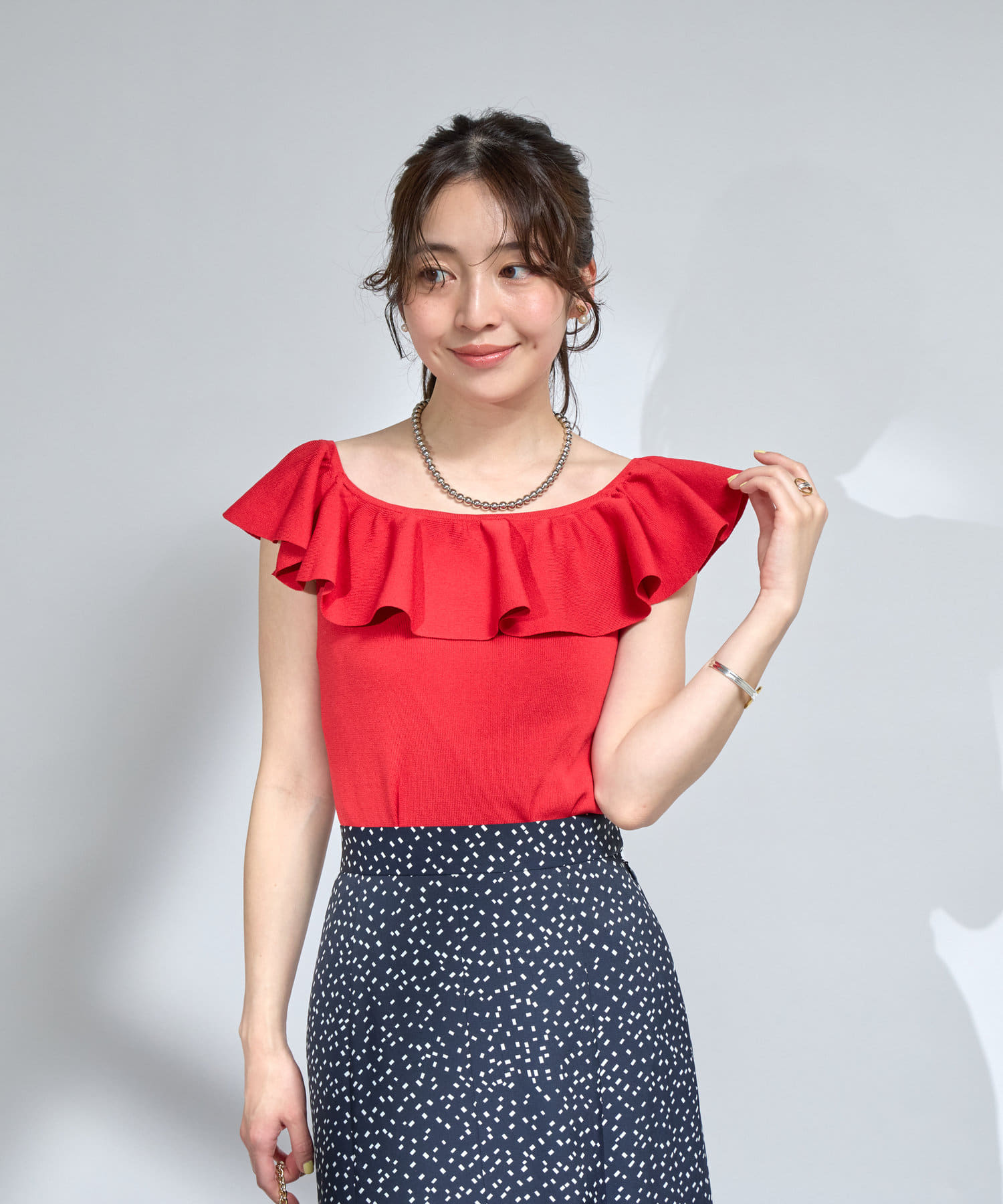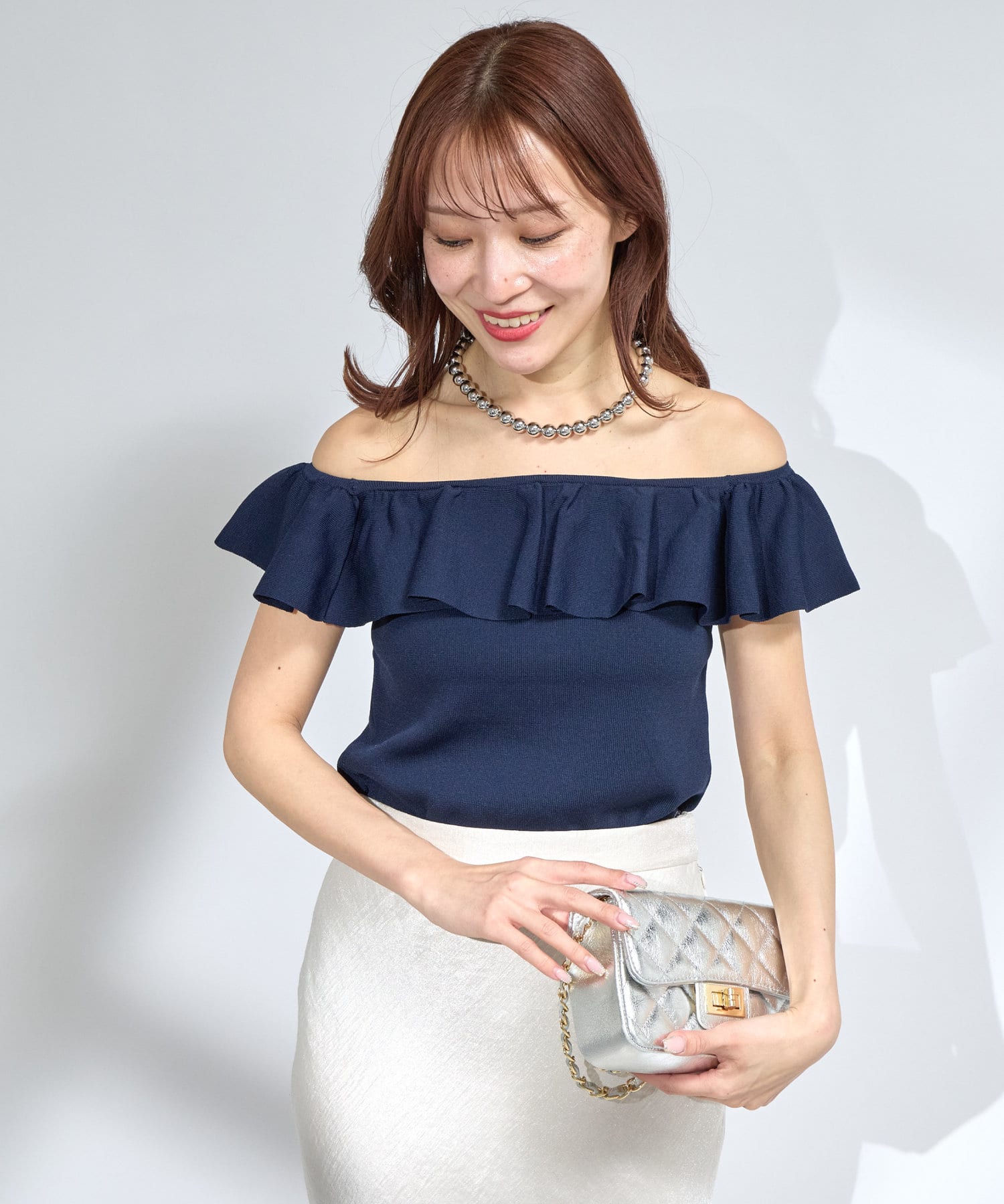 クールタッチ生地で機能性も兼ね備えた、華やかなオフショルラッフルニット。