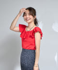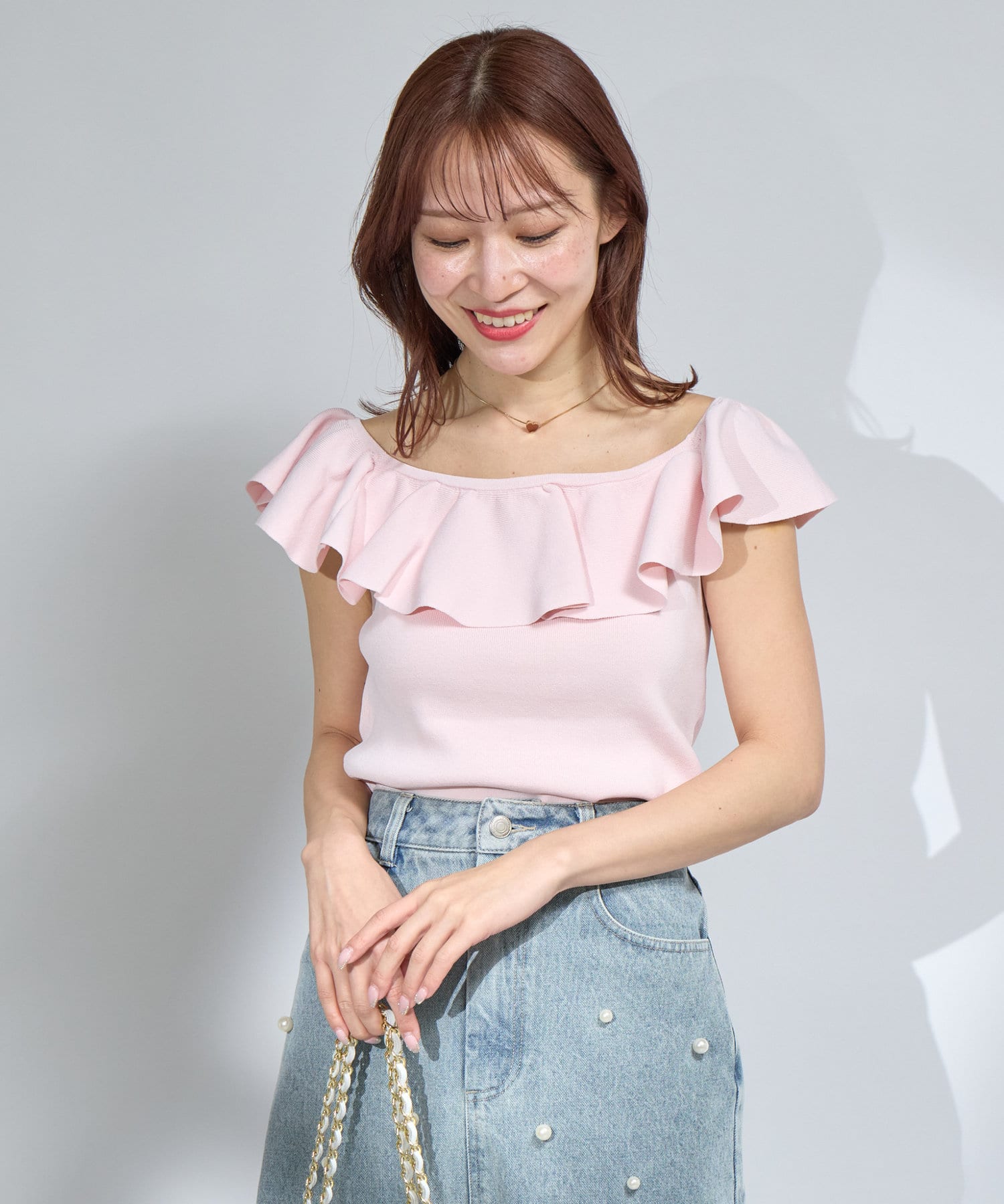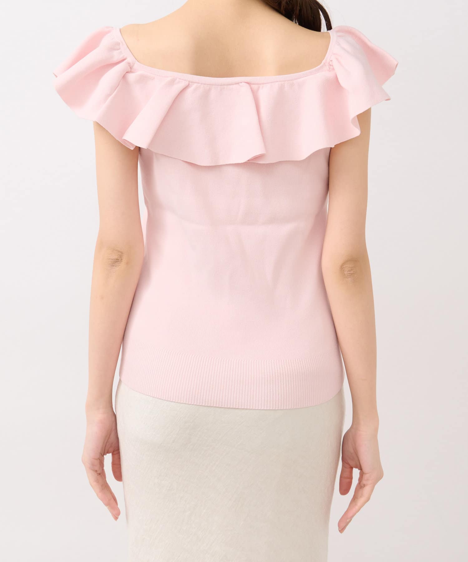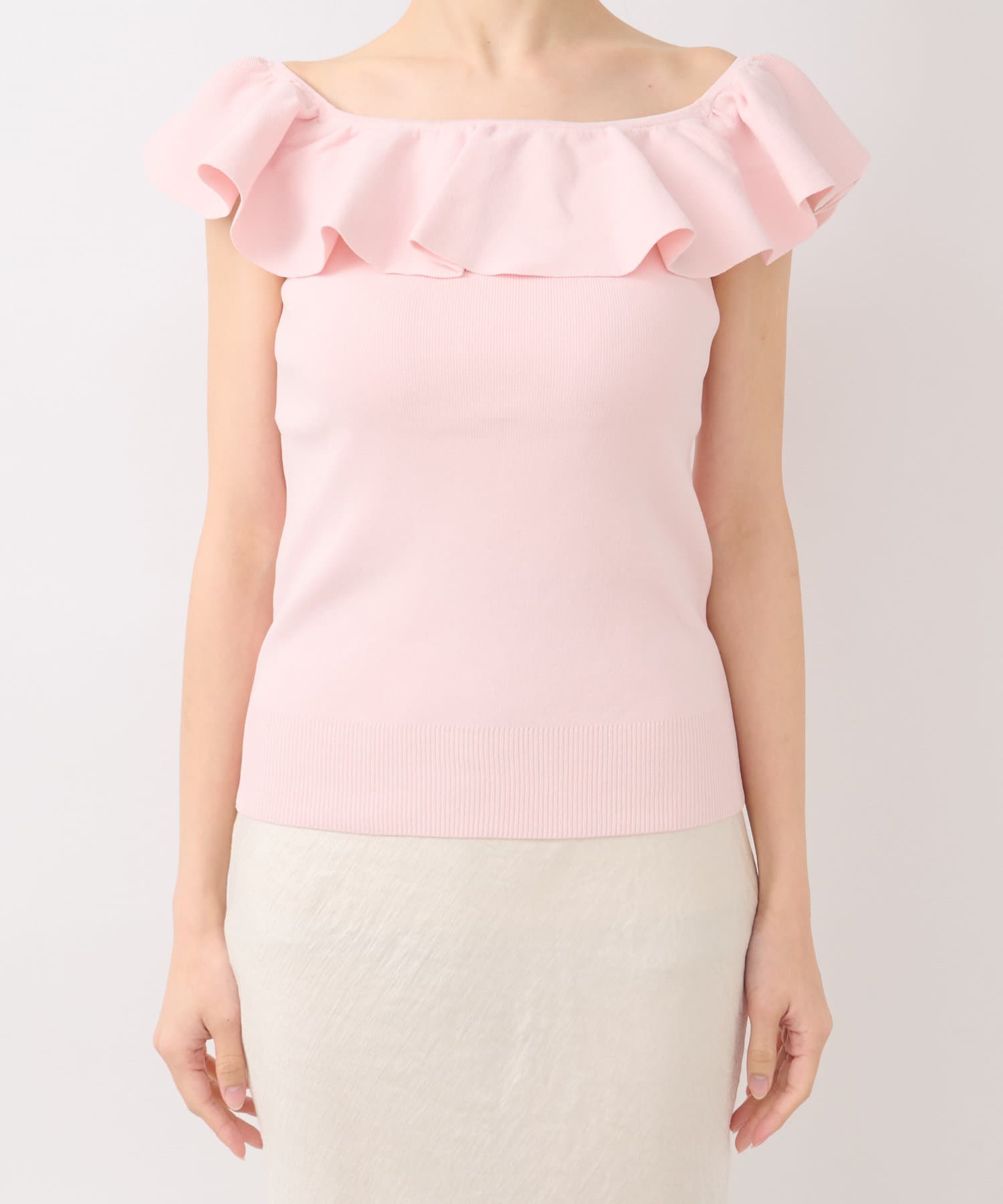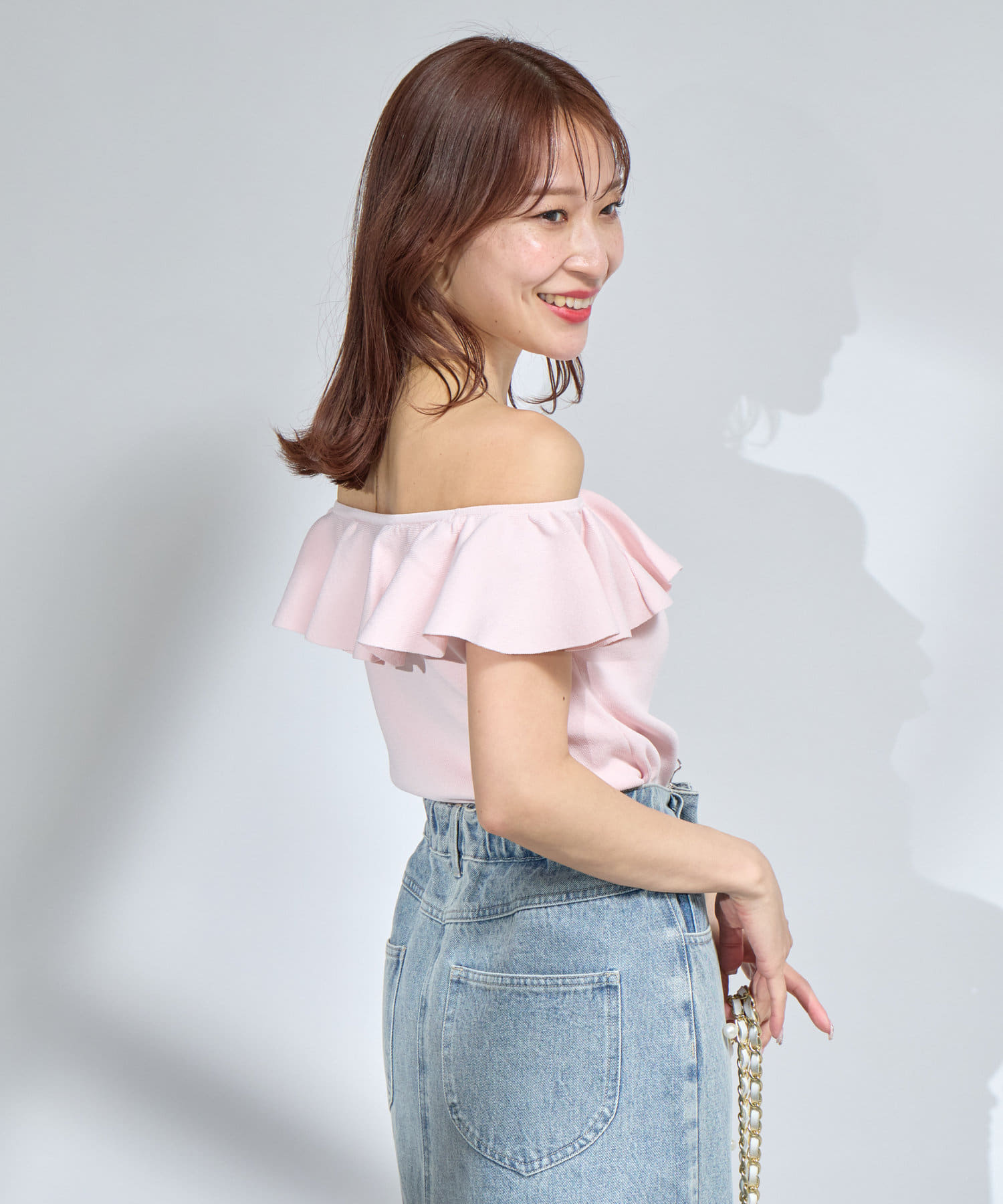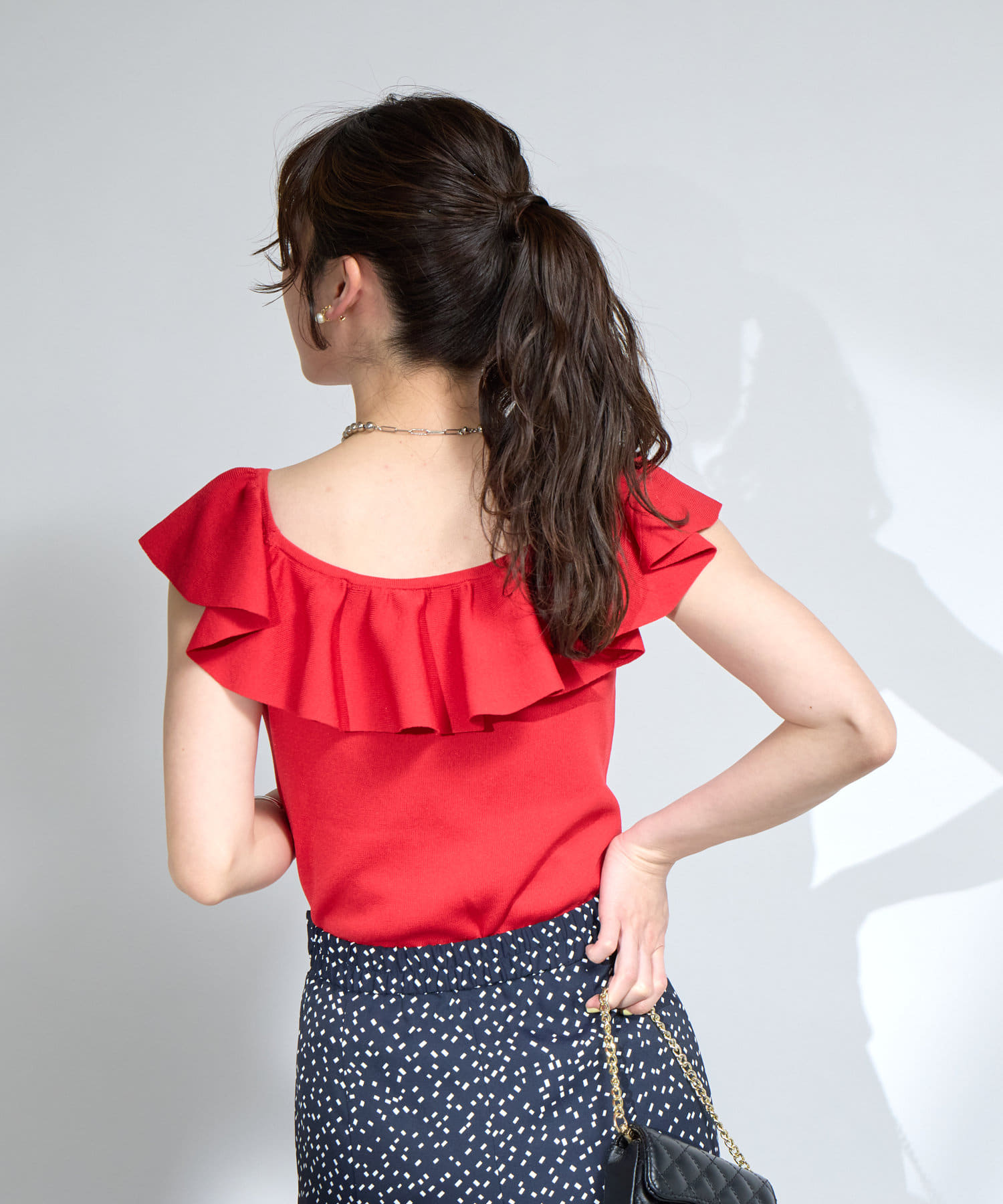 クールタッチ生地で機能性も兼ね備えた、華やかなオフショルラッフルニット。