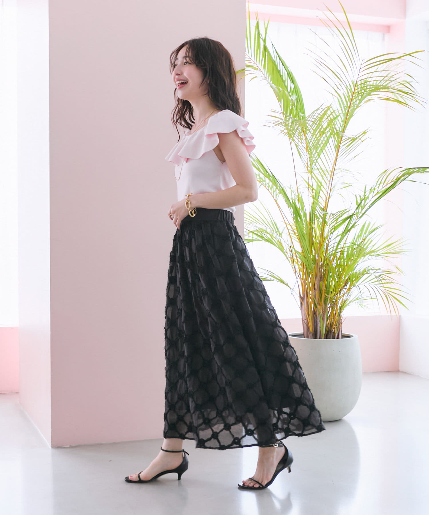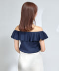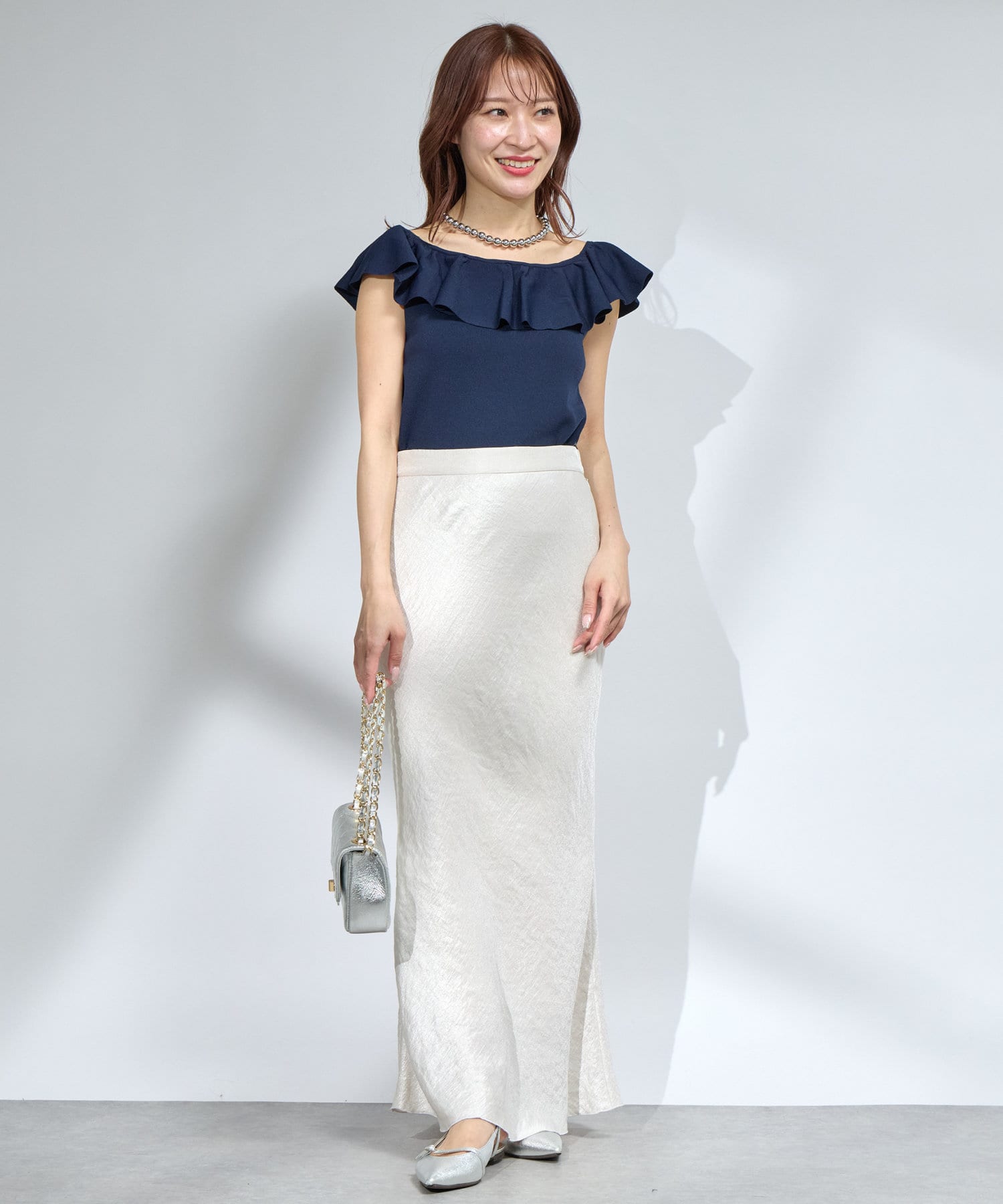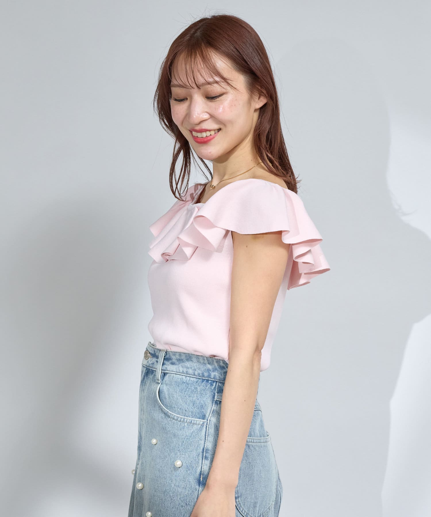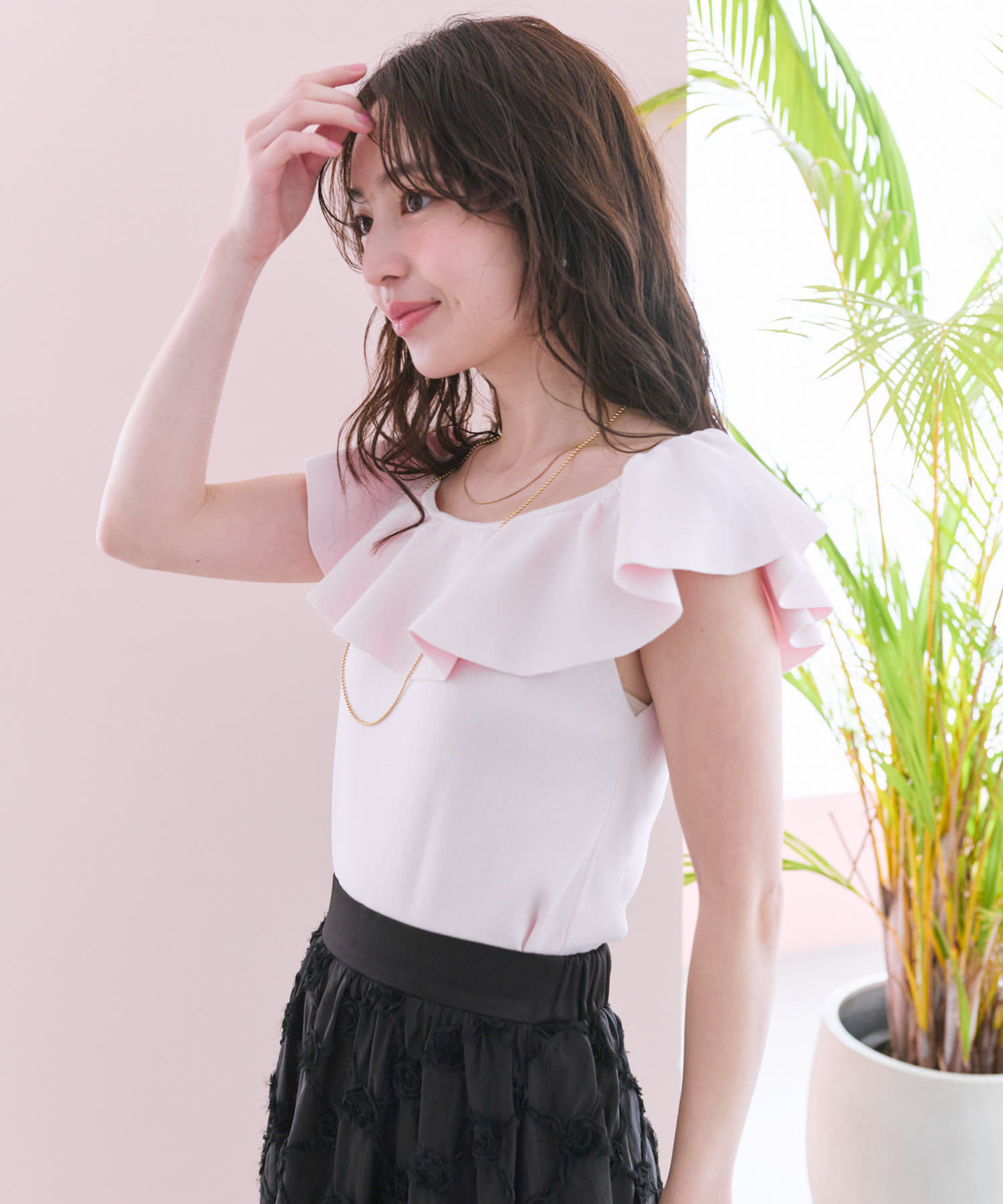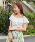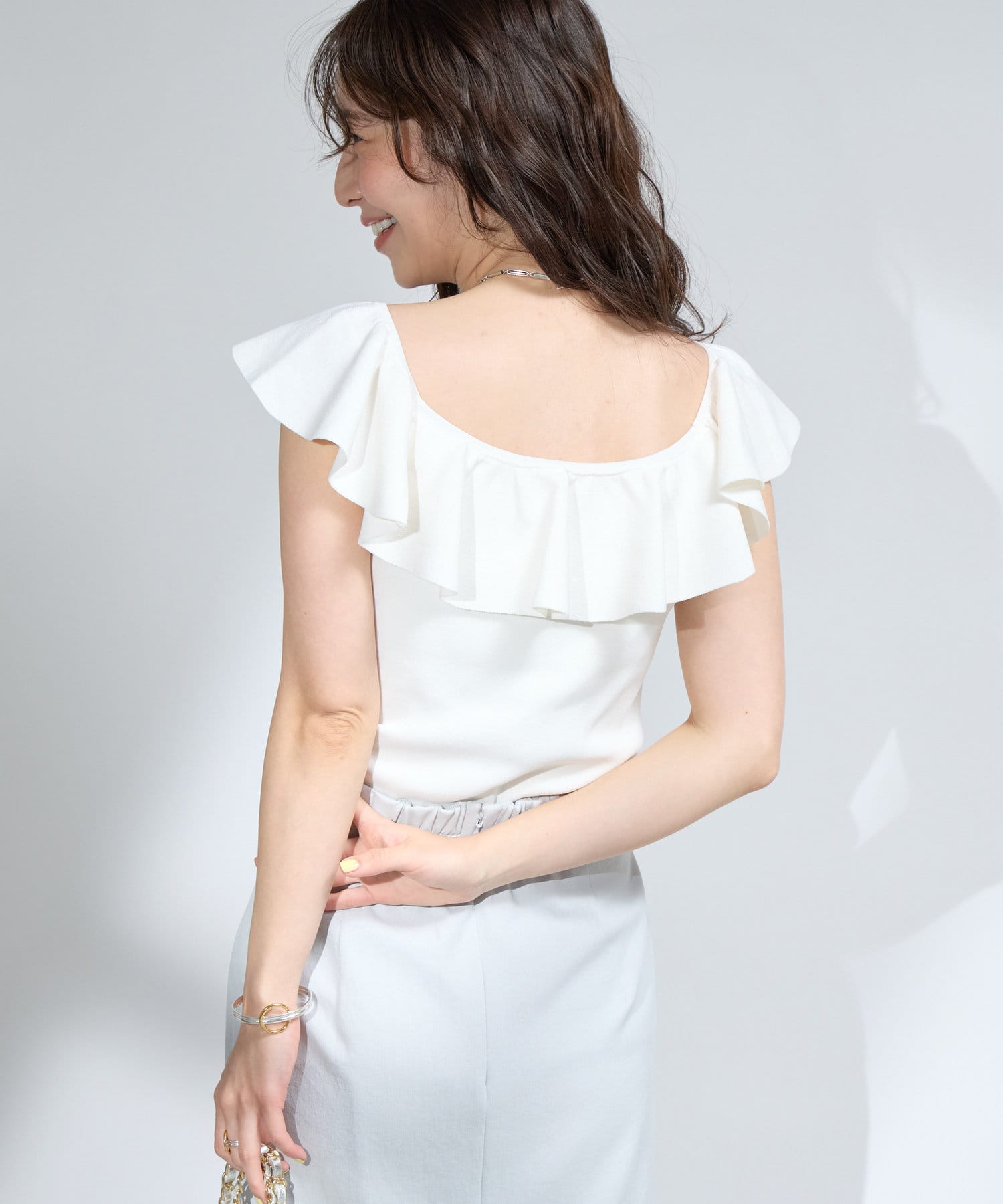 クールタッチ生地で機能性も兼ね備えた、華やかなオフショルラッフルニット。