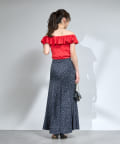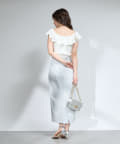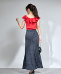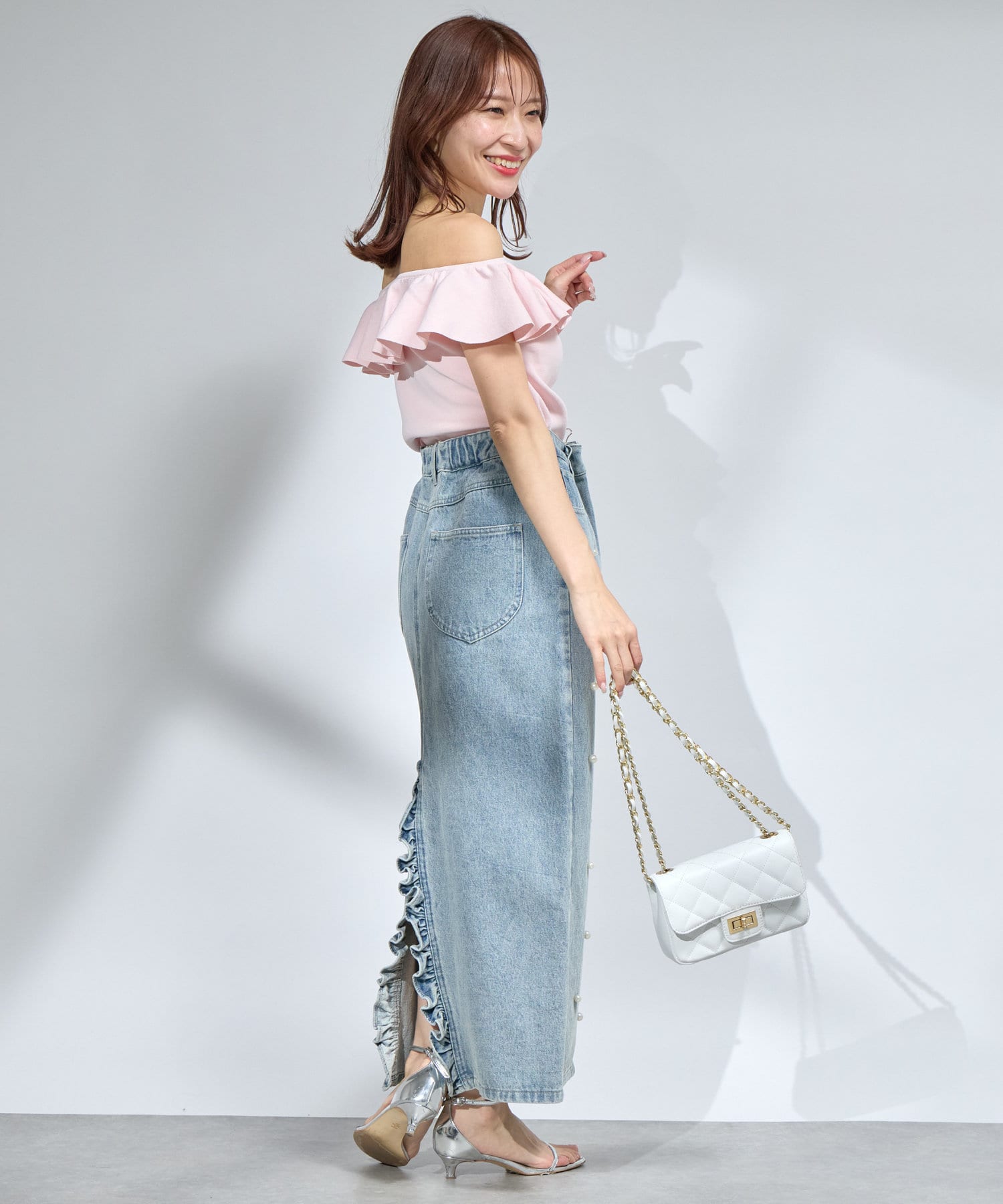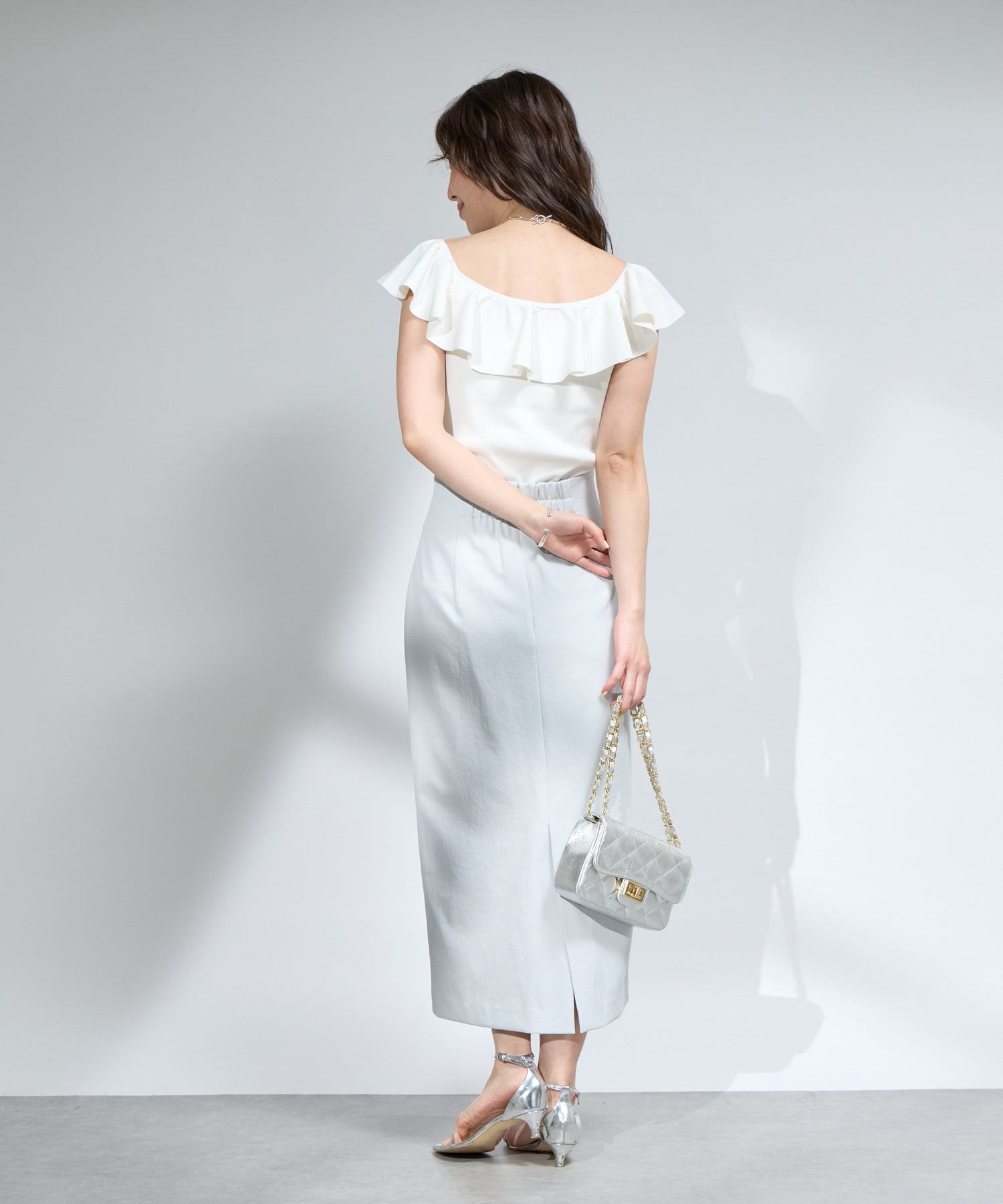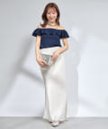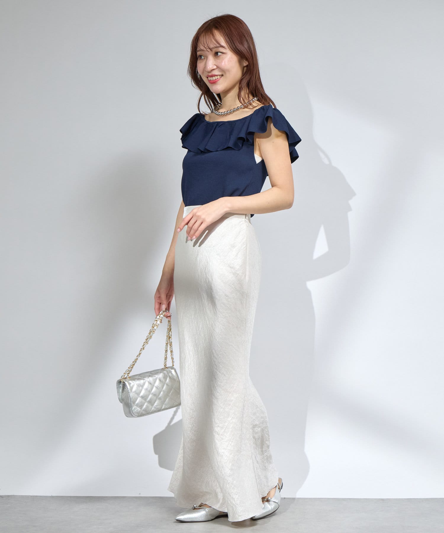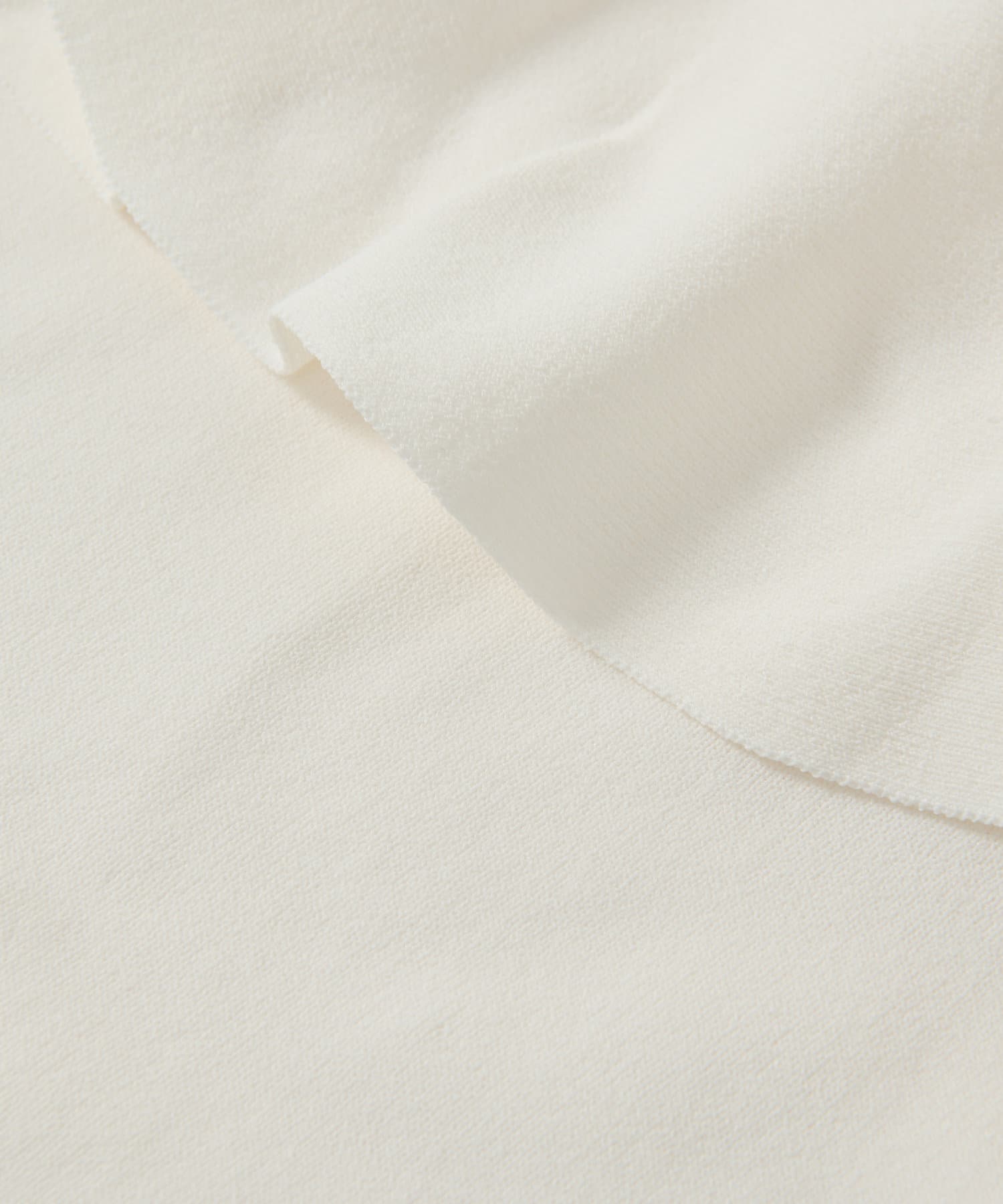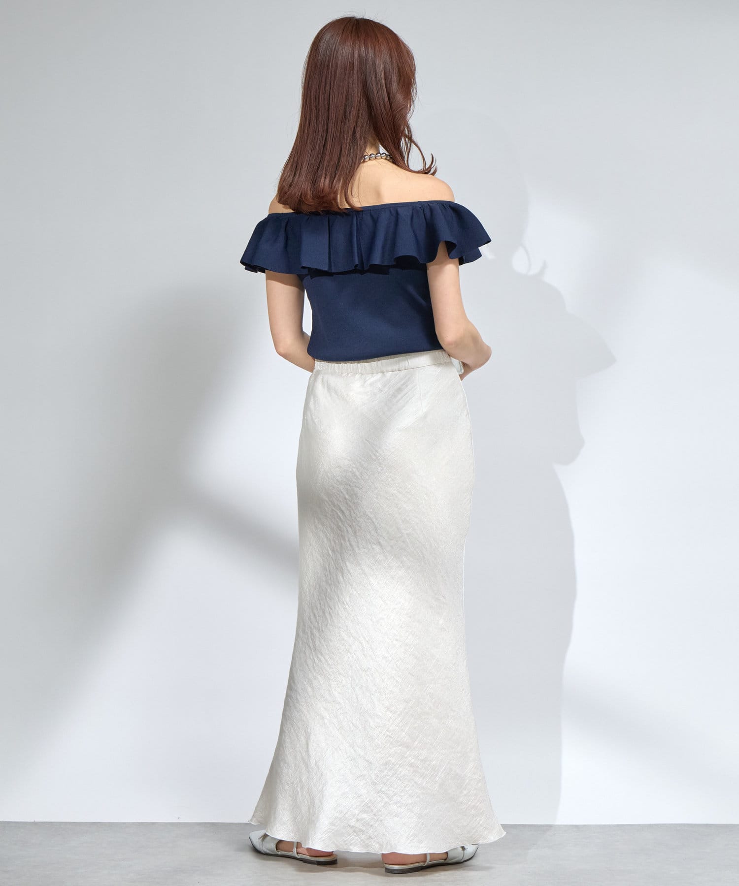 クールタッチ生地で機能性も兼ね備えた、華やかなオフショルラッフルニット。