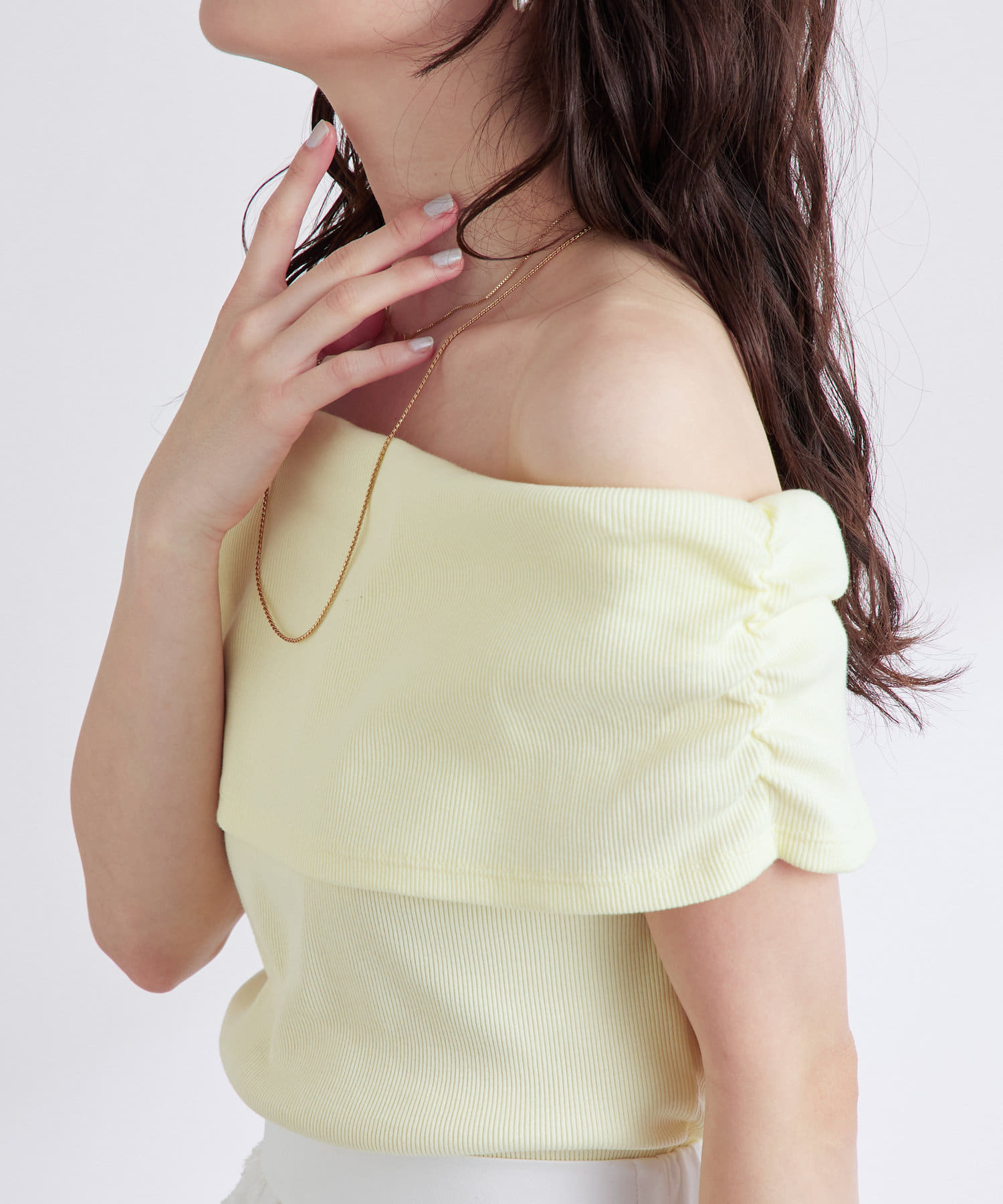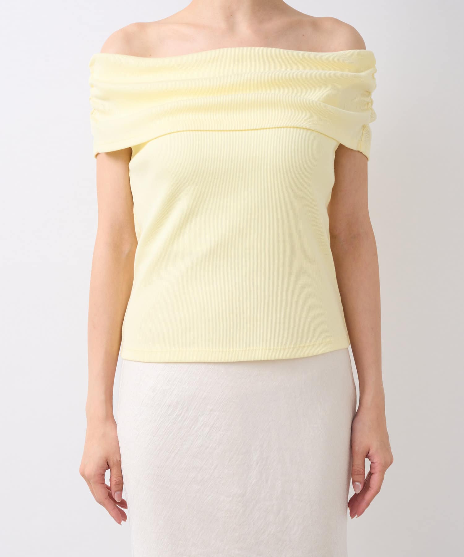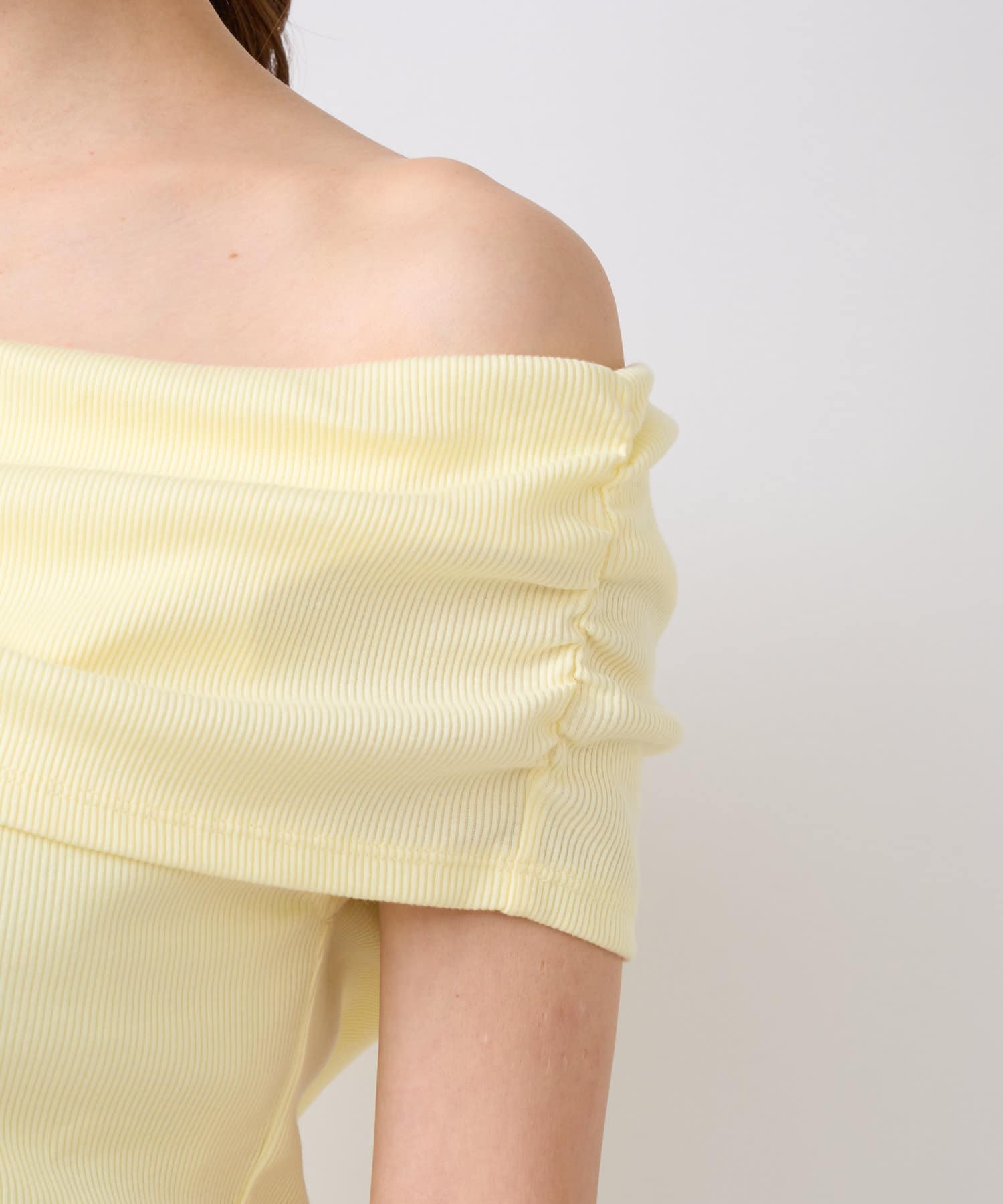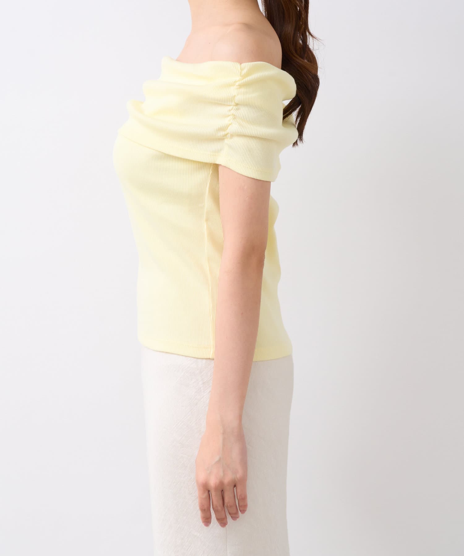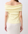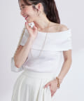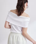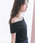 オフショルのデザインでデコルテがきれいに見えるテレコのカットソー。