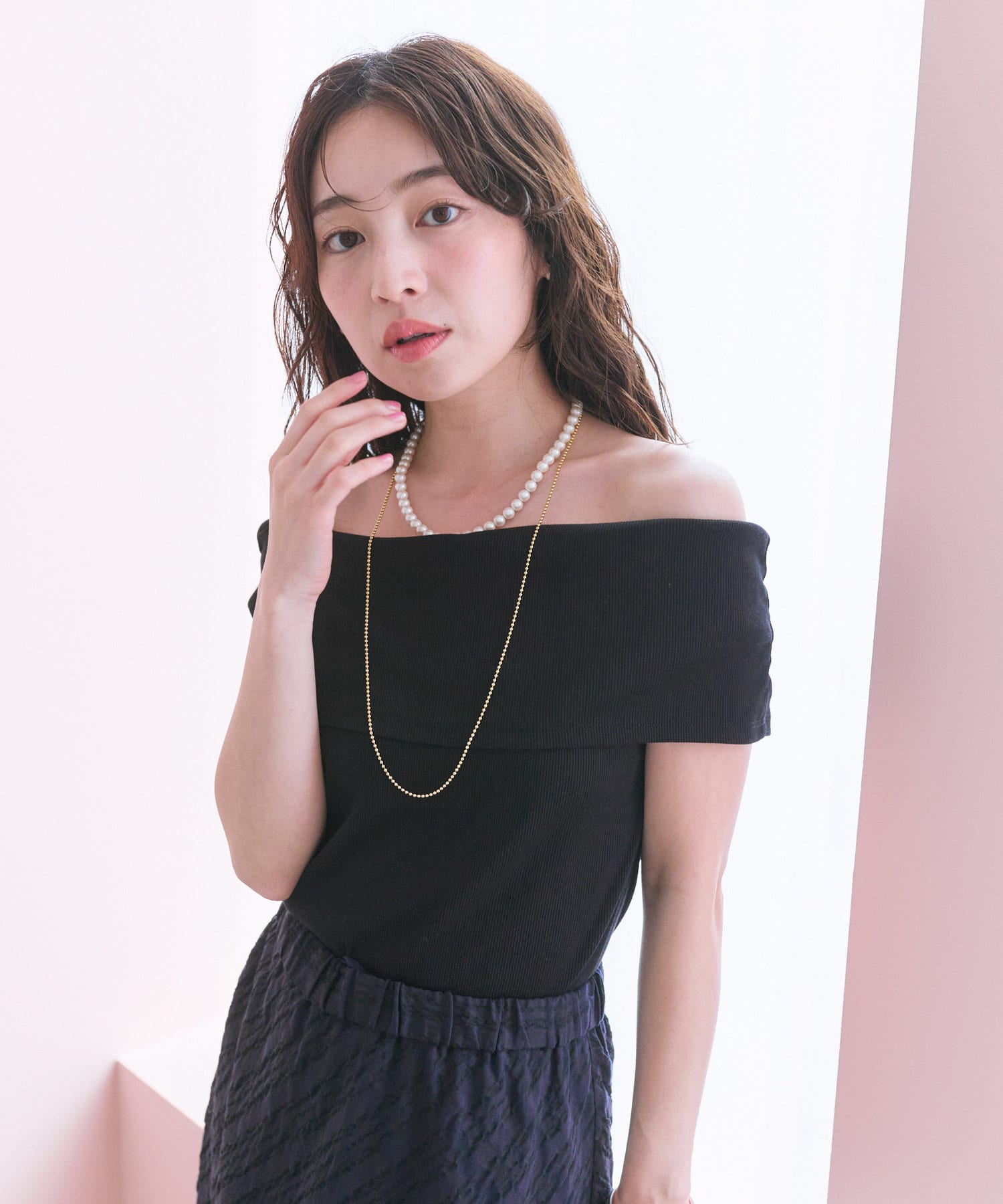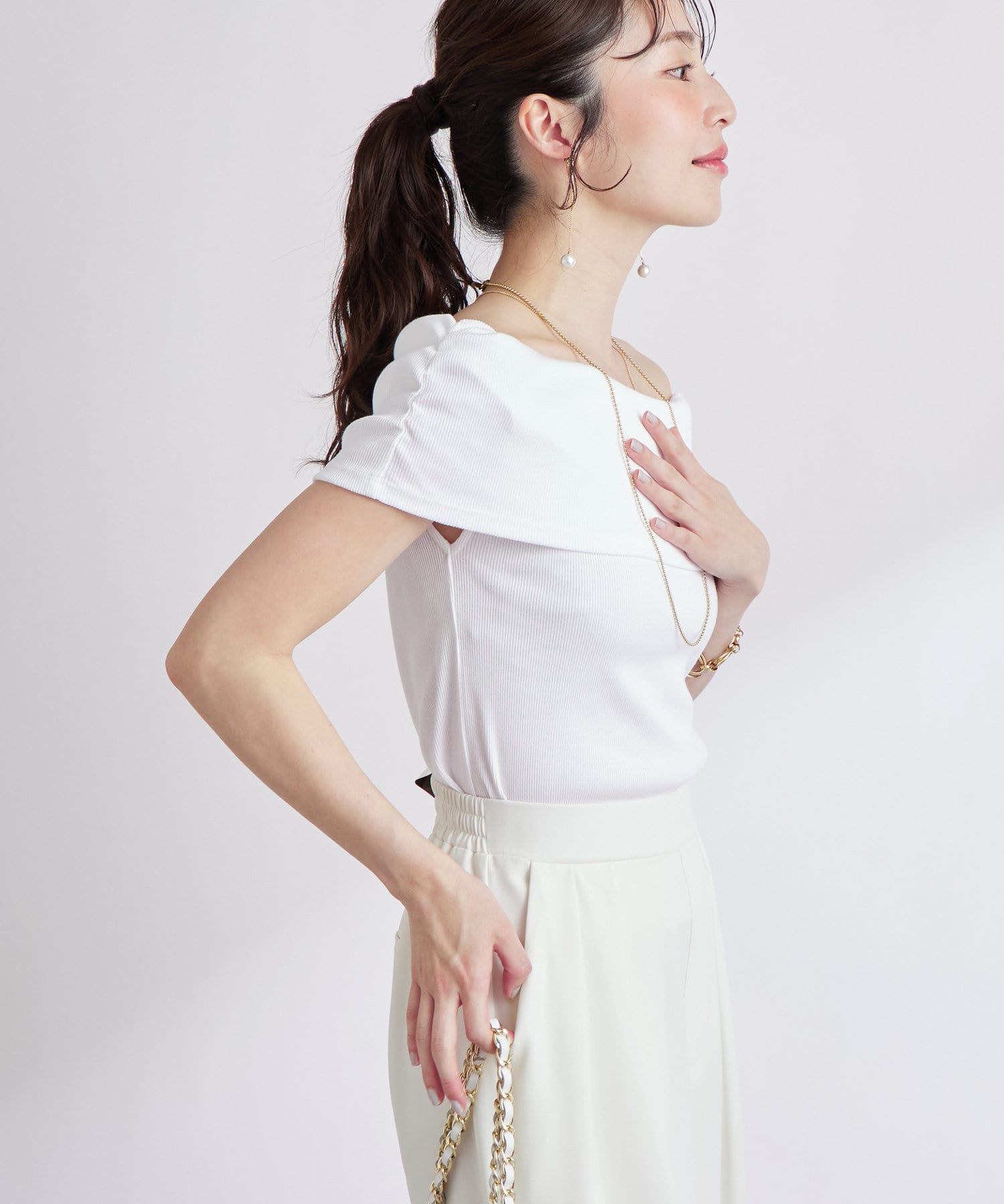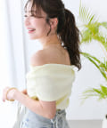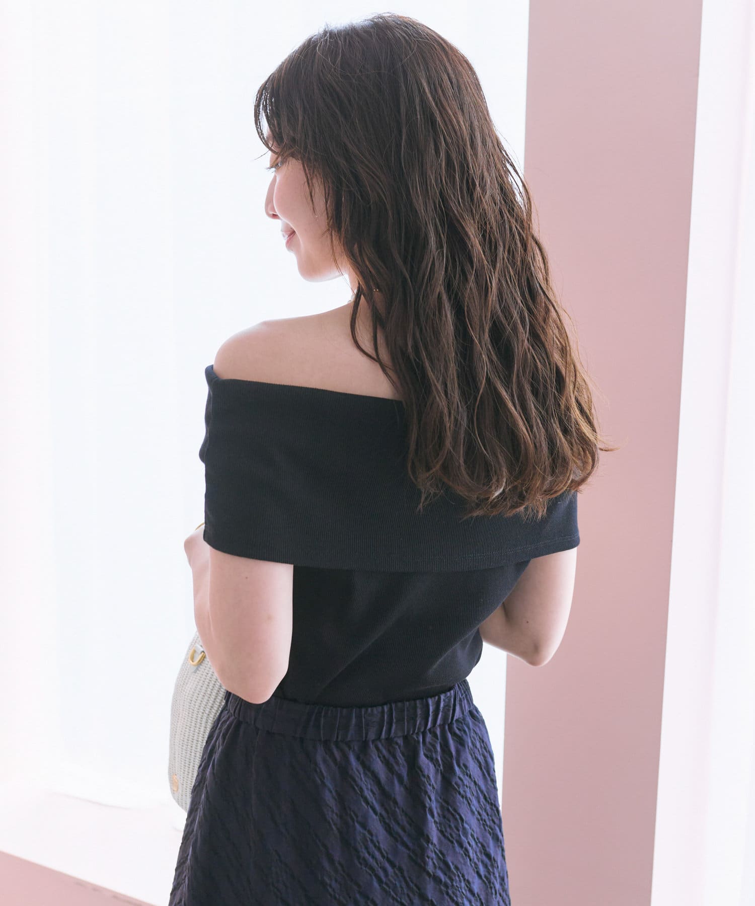 オフショルのデザインでデコルテがきれいに見えるテレコのカットソー。