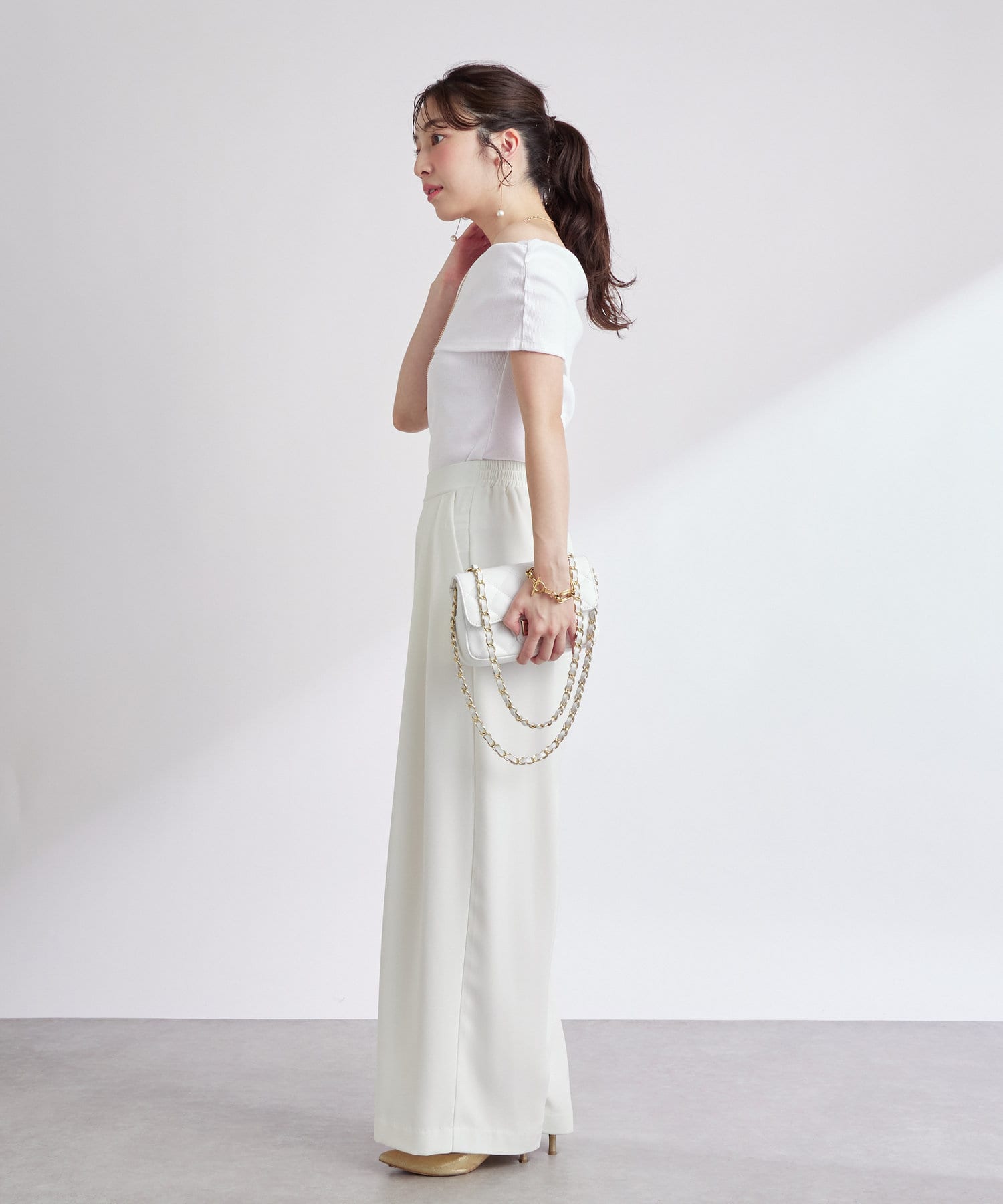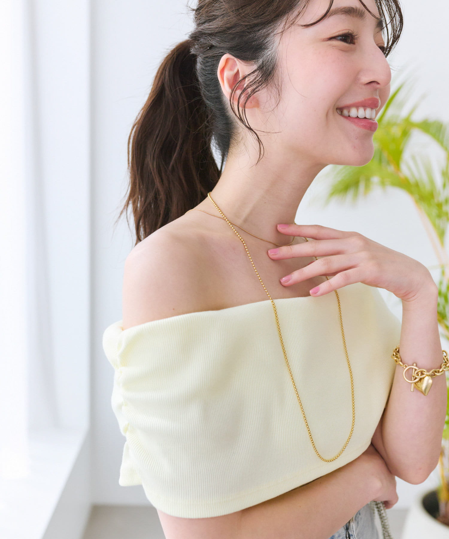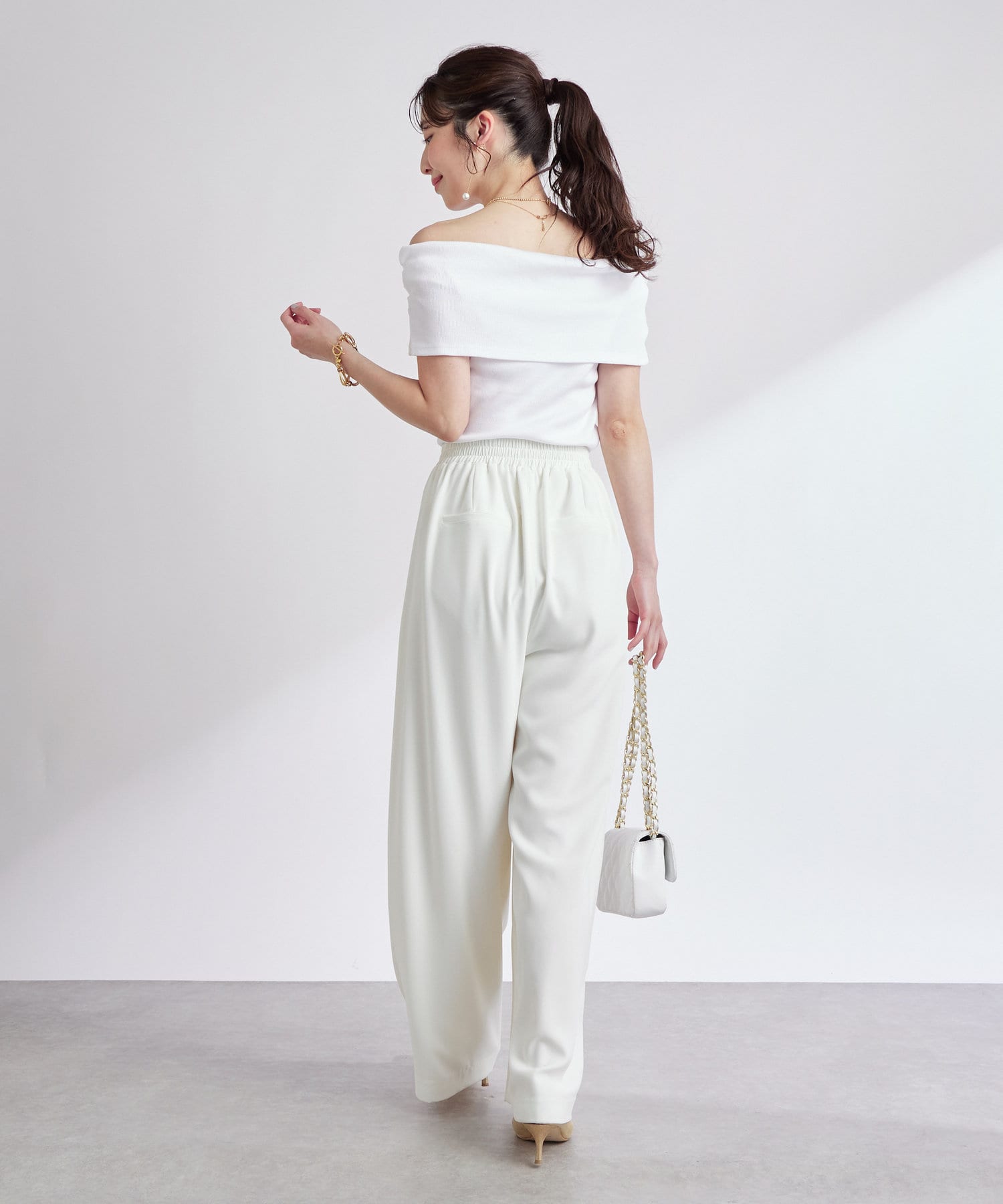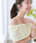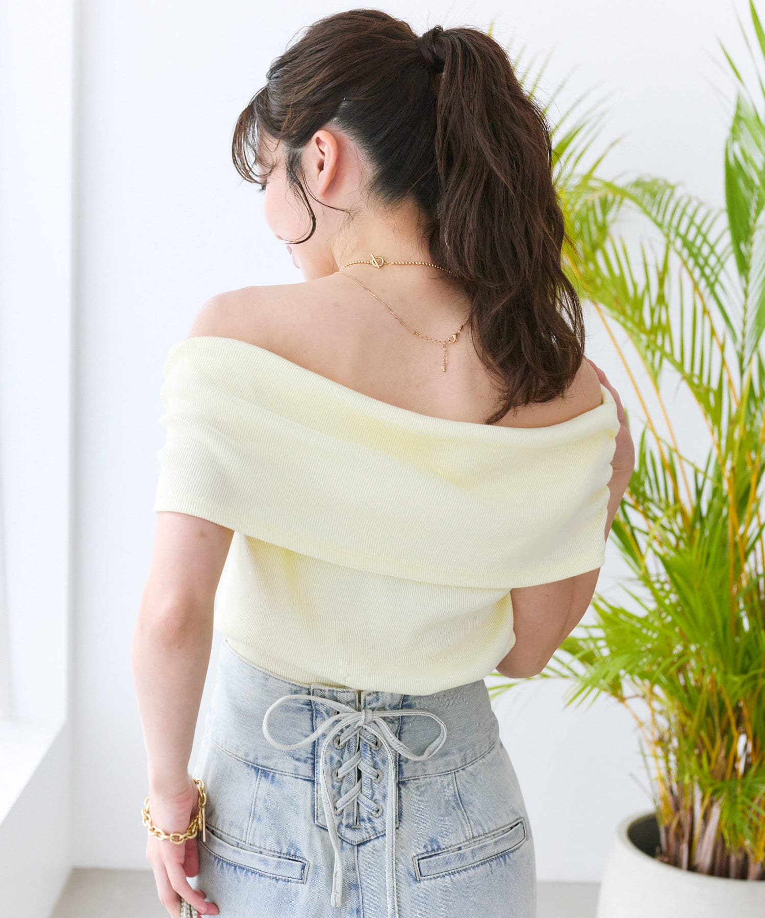 オフショルのデザインでデコルテがきれいに見えるテレコのカットソー。