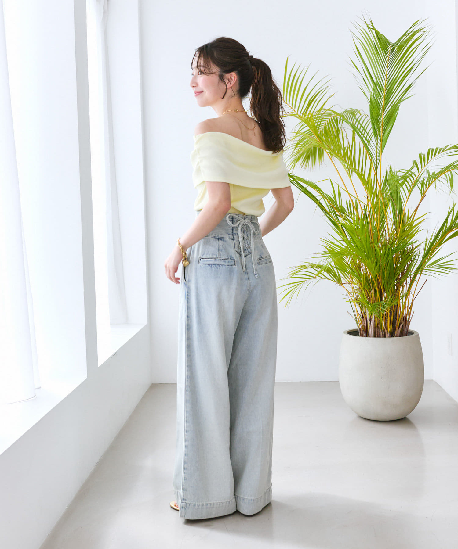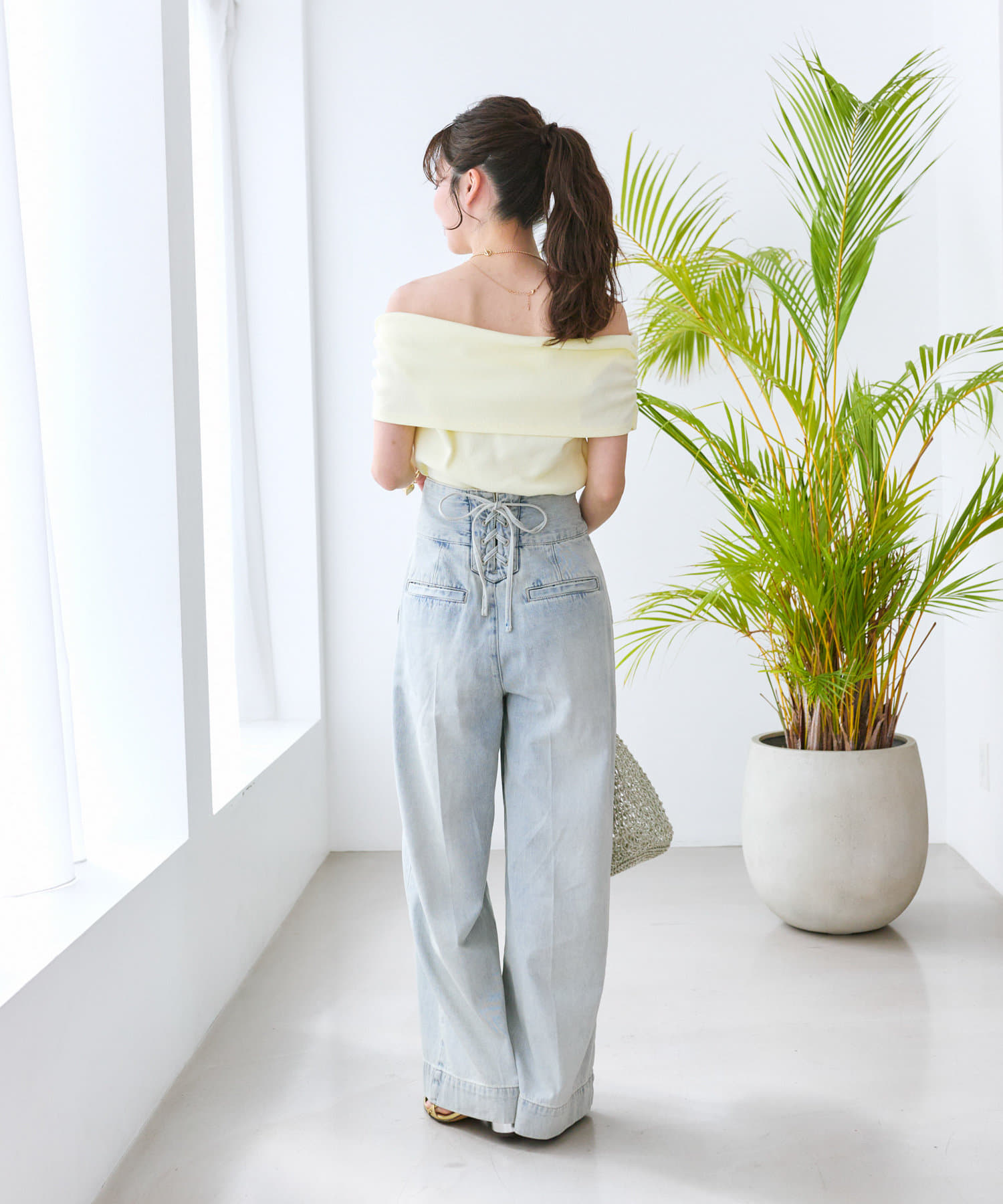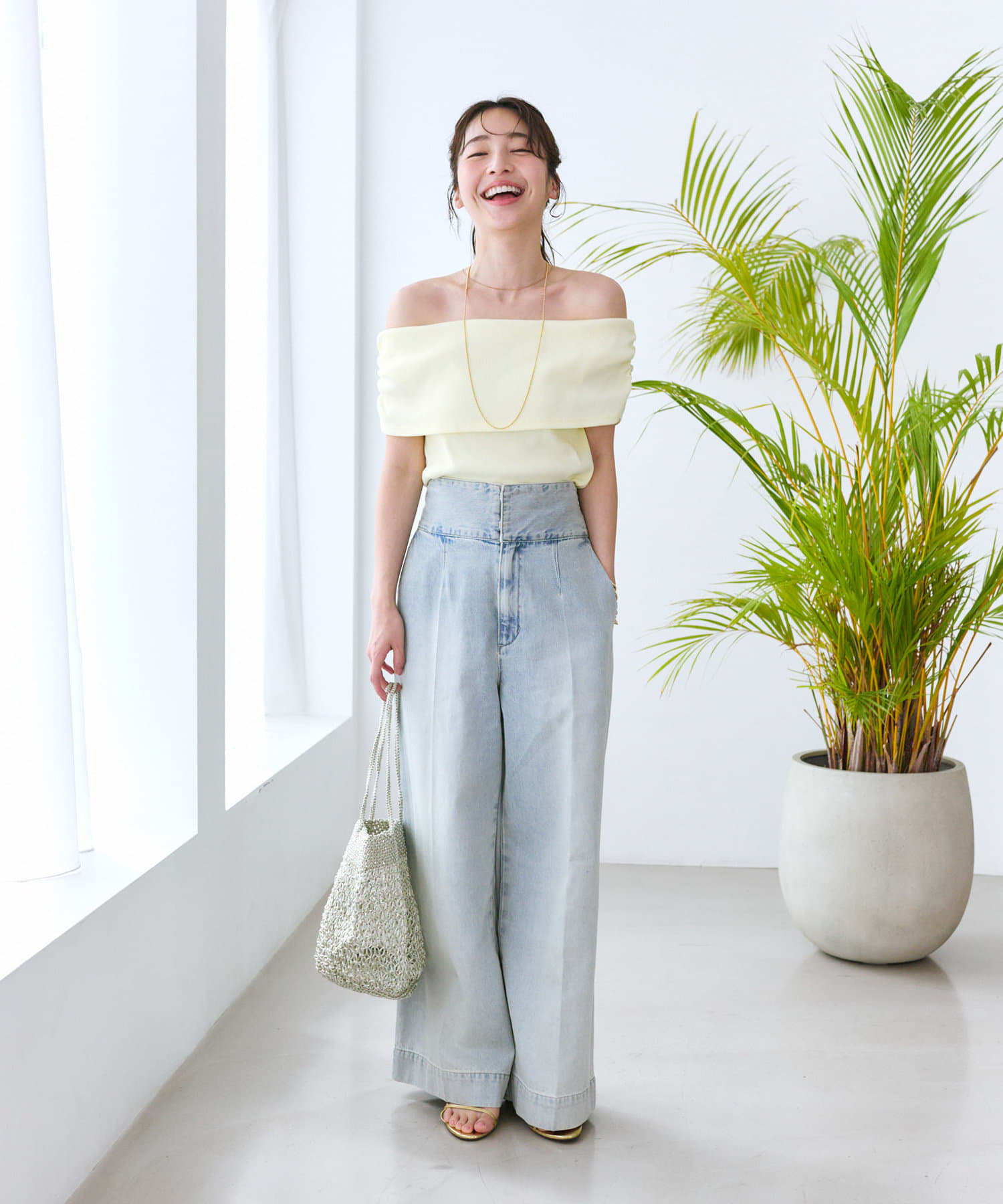 ふんわりシルエットのスカートやワイドパンツ、デニム合わせがお勧めです。