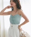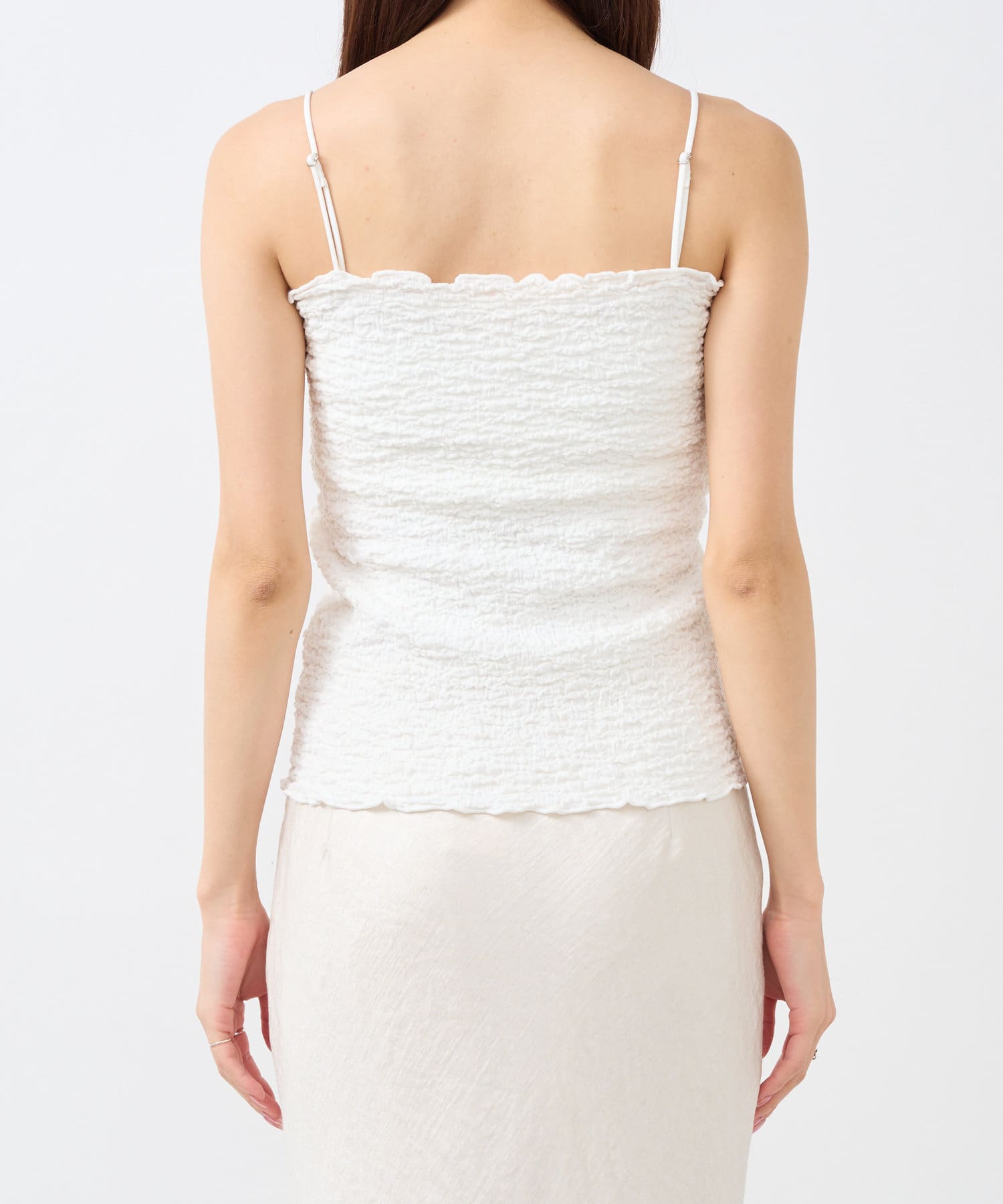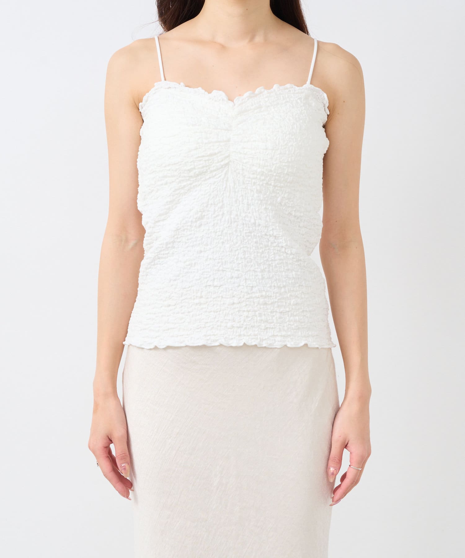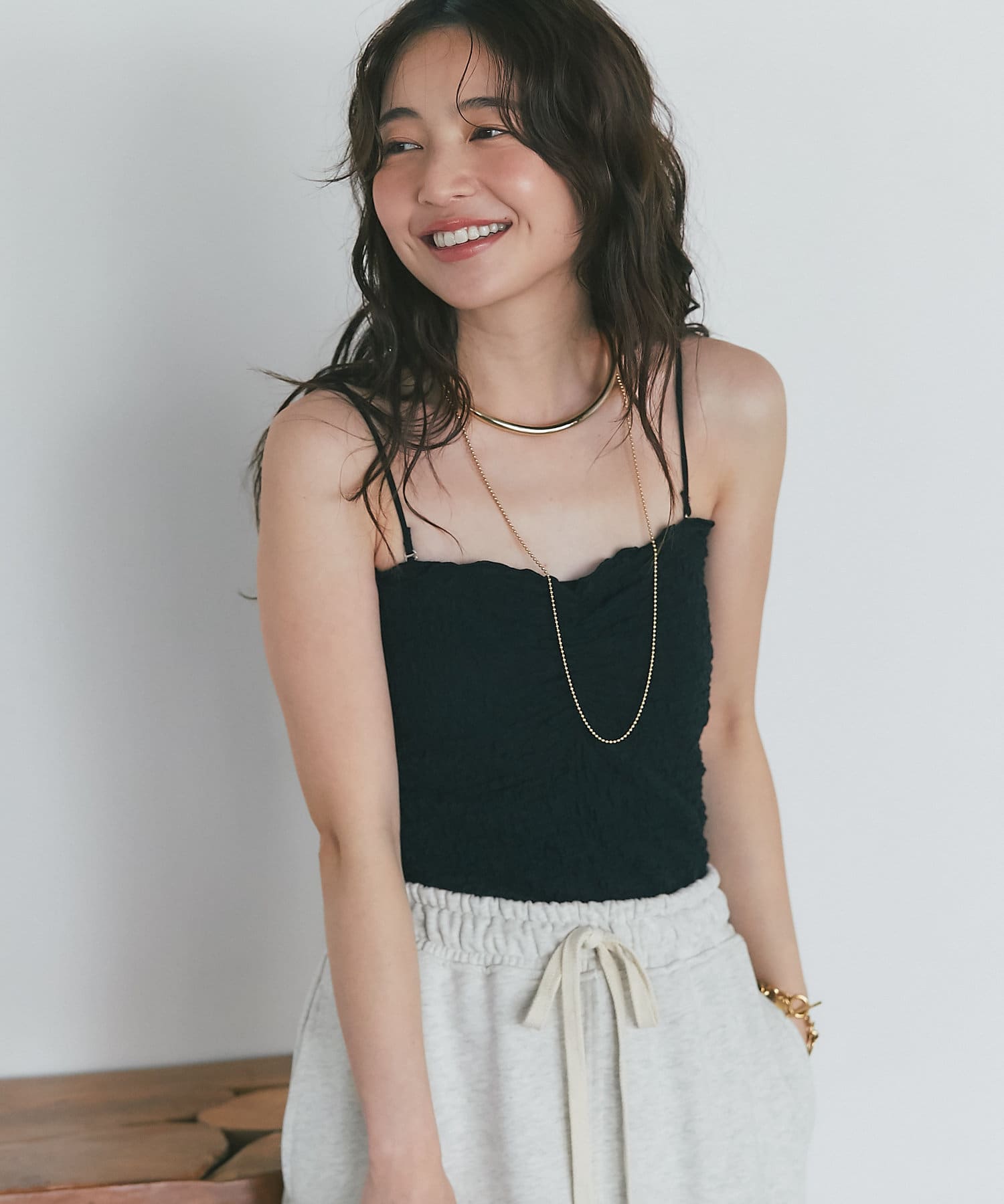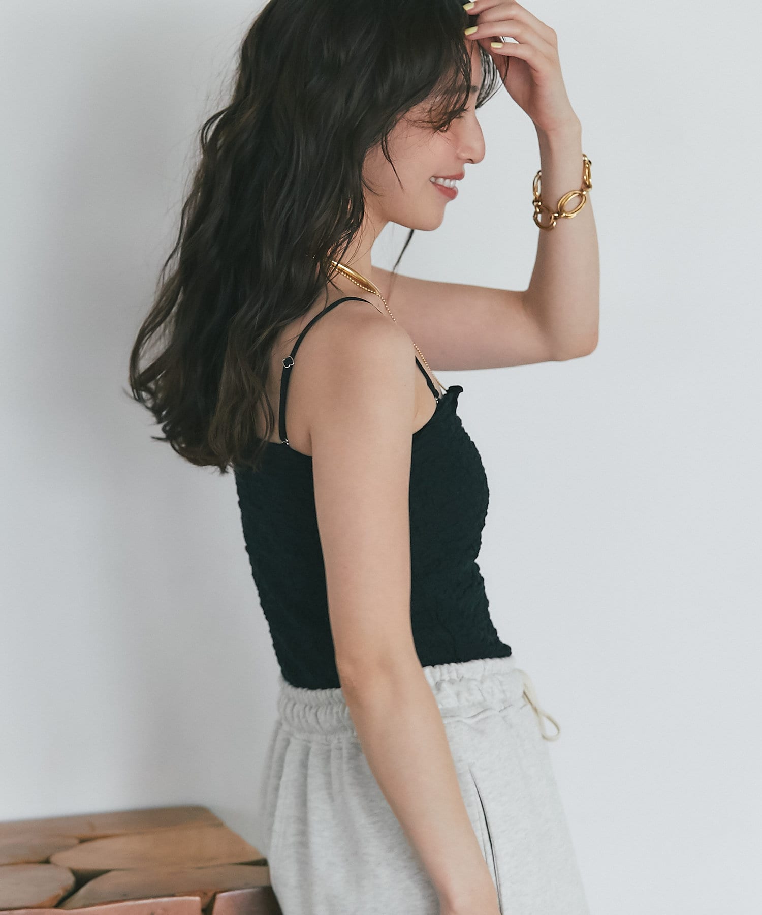ふんわりと柔らかなシャーリングが、女性らしいシルエットを際立たせるキャミソール。