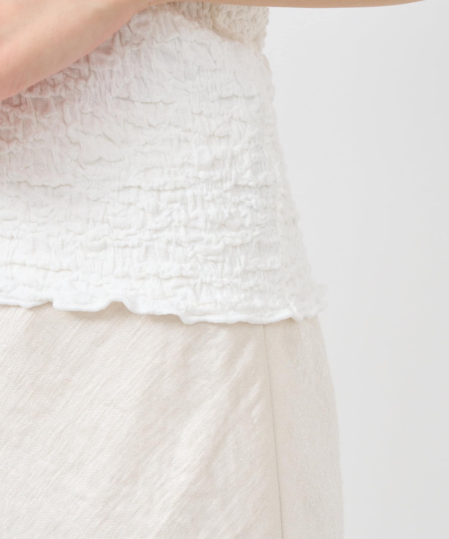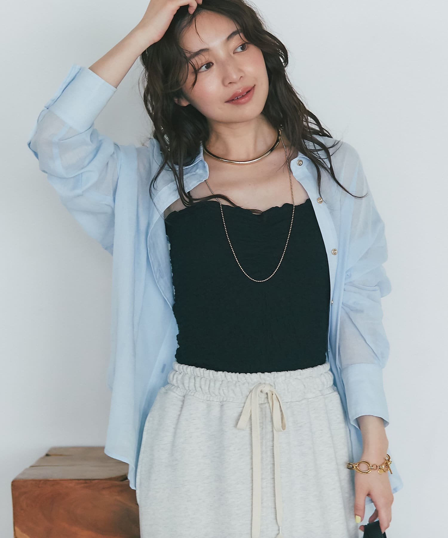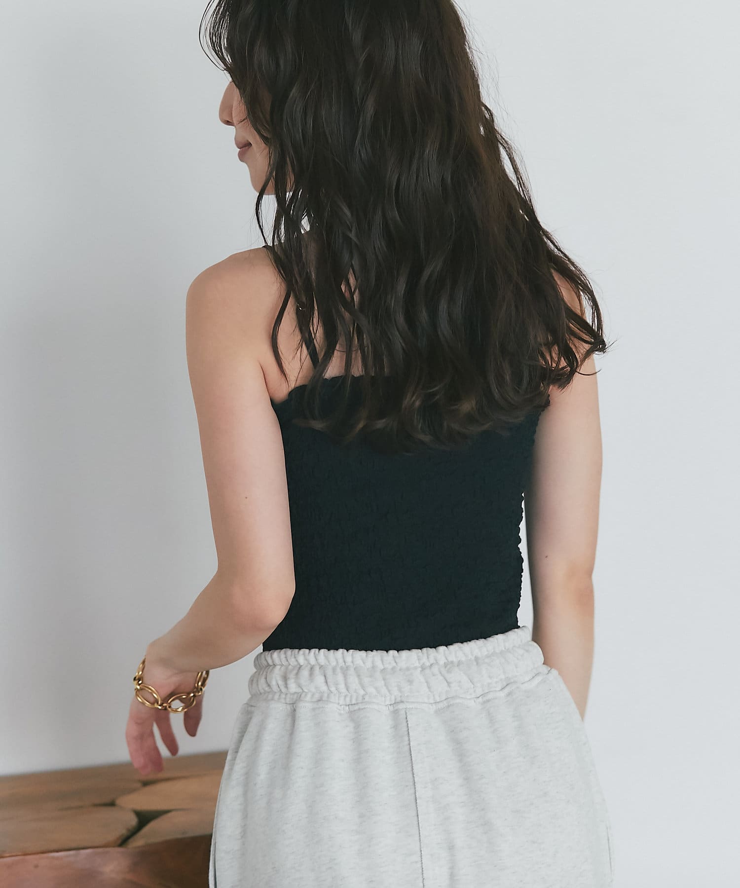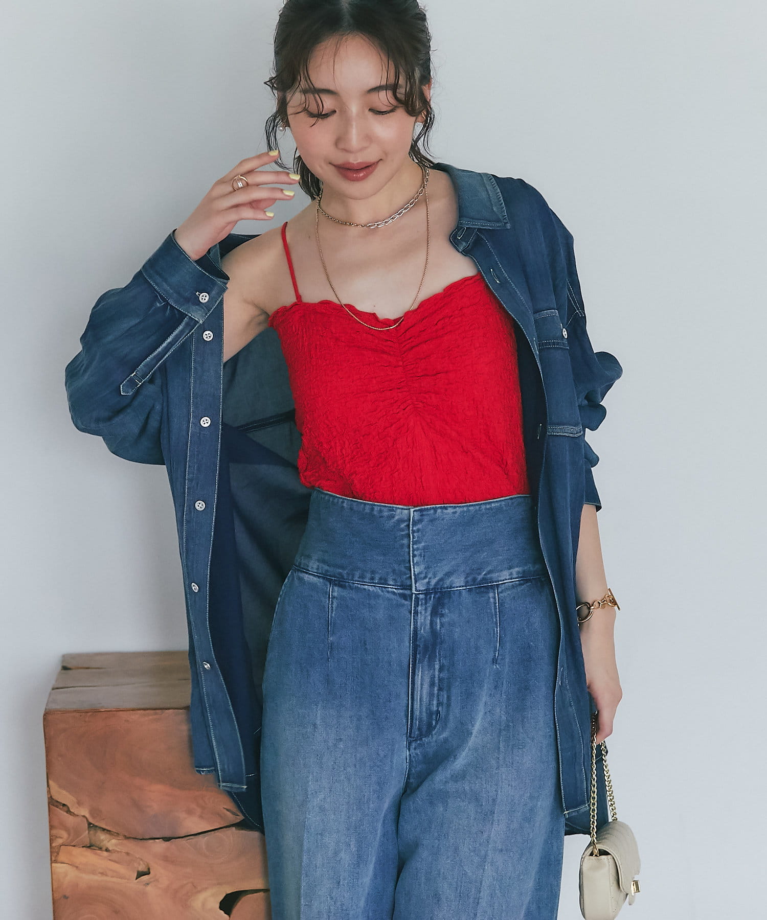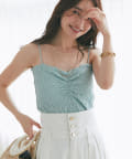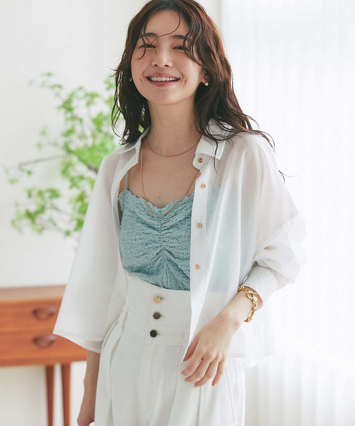 ふんわりと柔らかなシャーリングが、女性らしいシルエットを際立たせるキャミソール。
