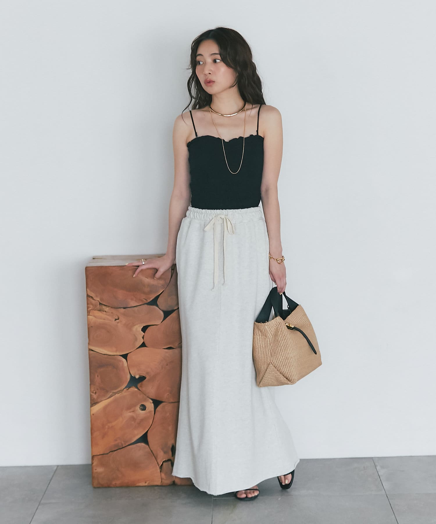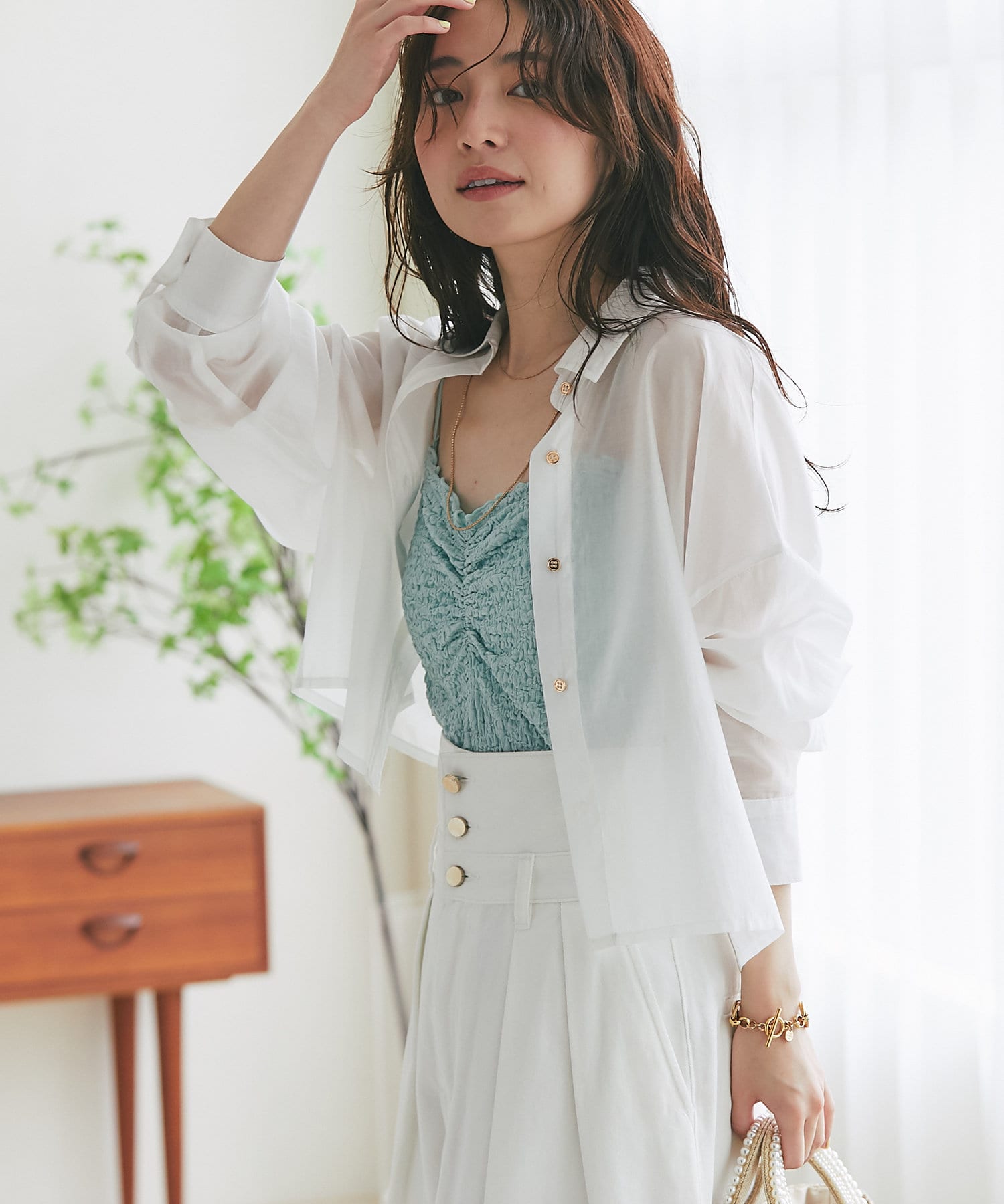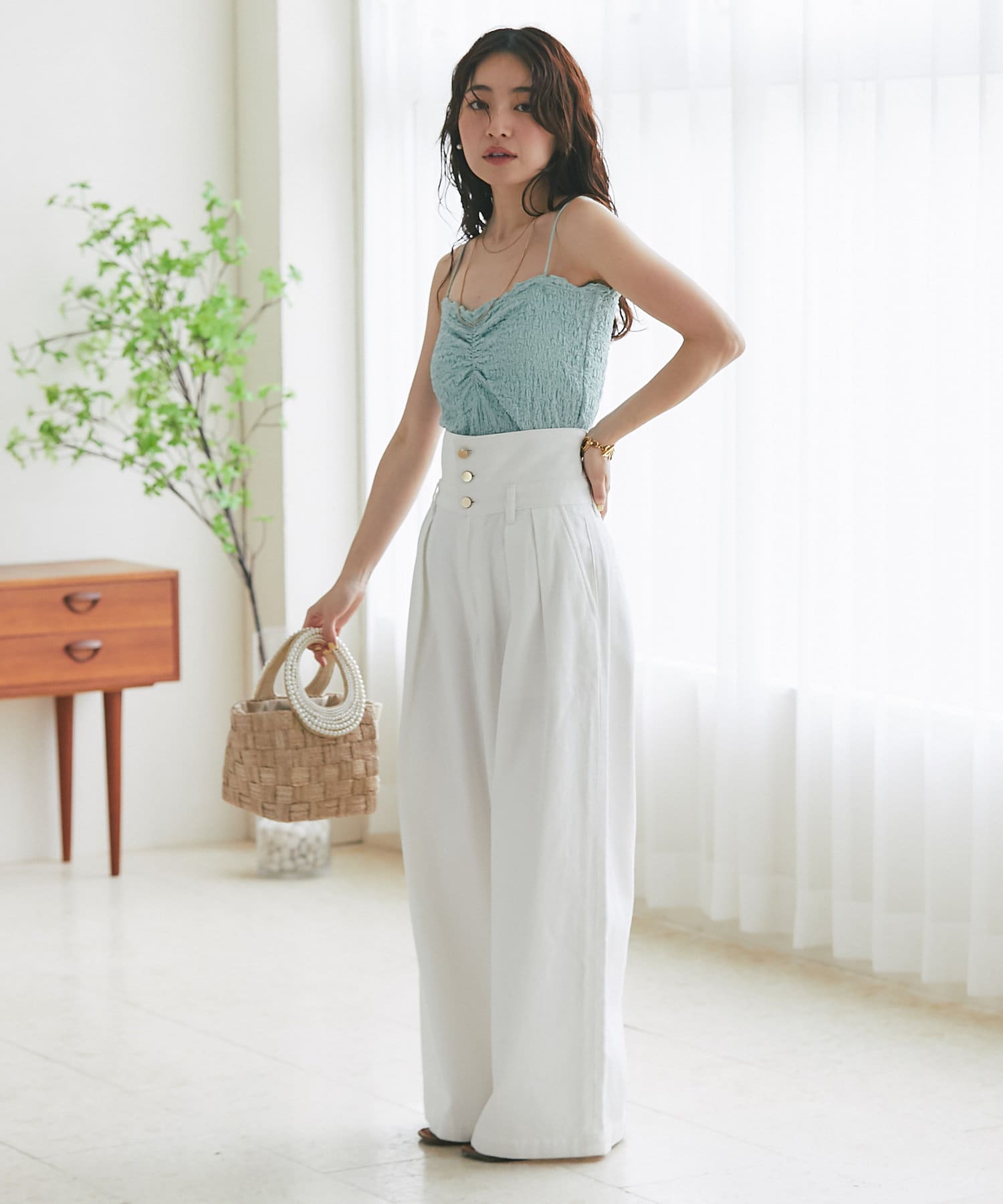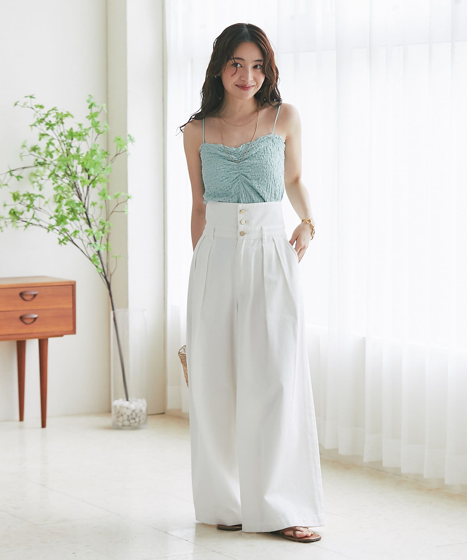 ふんわりと柔らかなシャーリングが、女性らしいシルエットを際立たせるキャミソール。