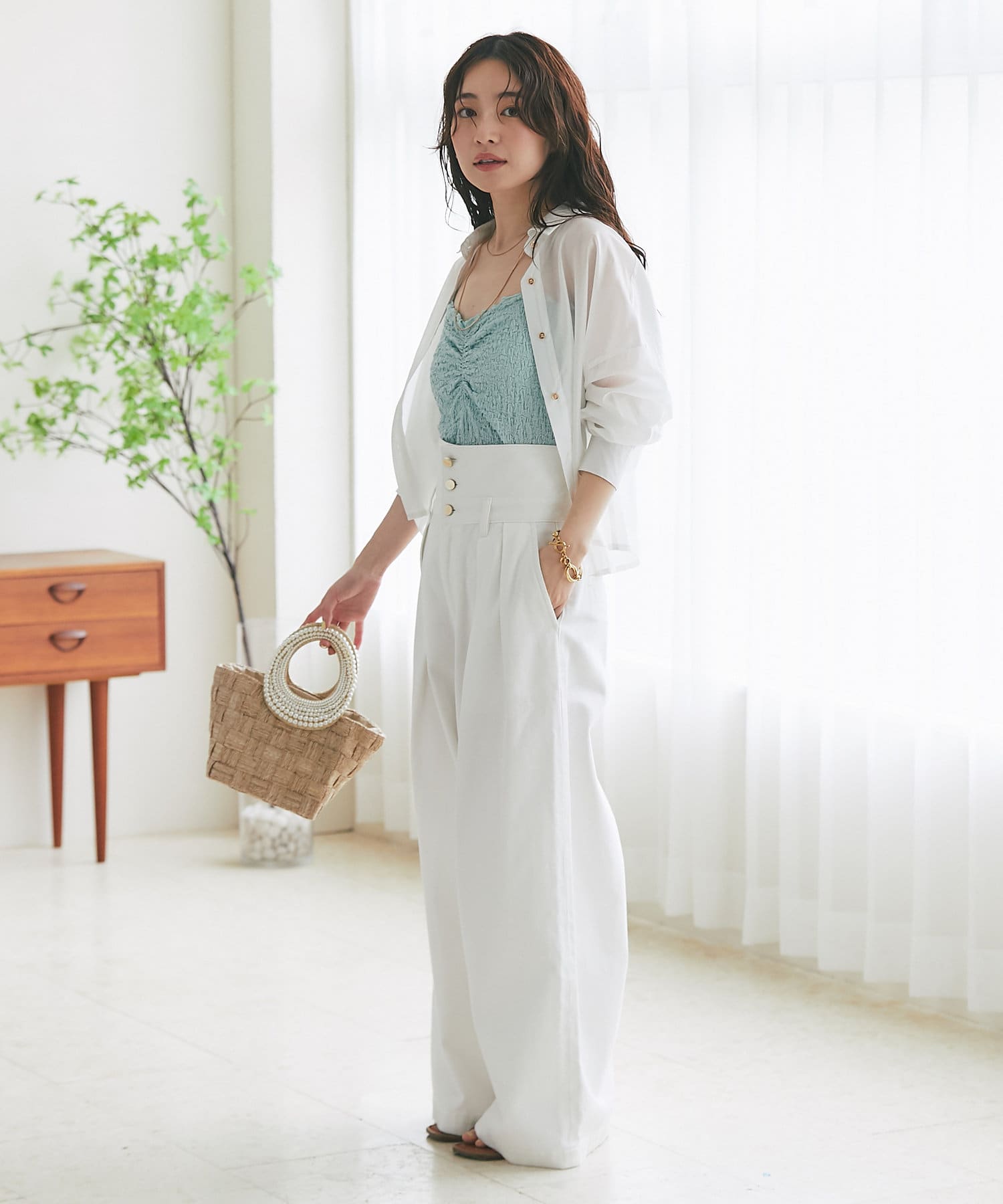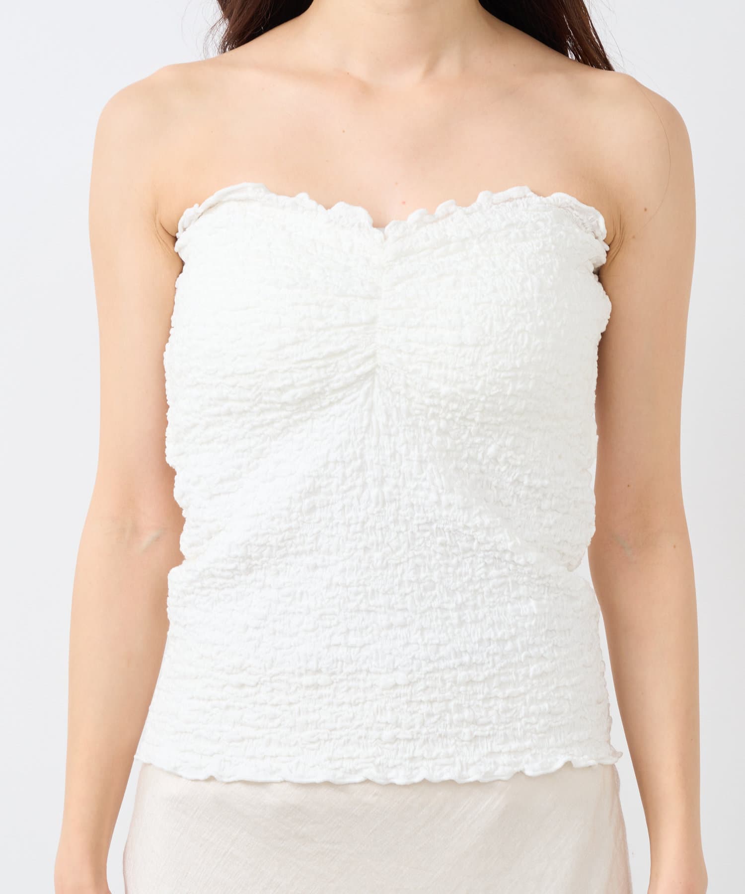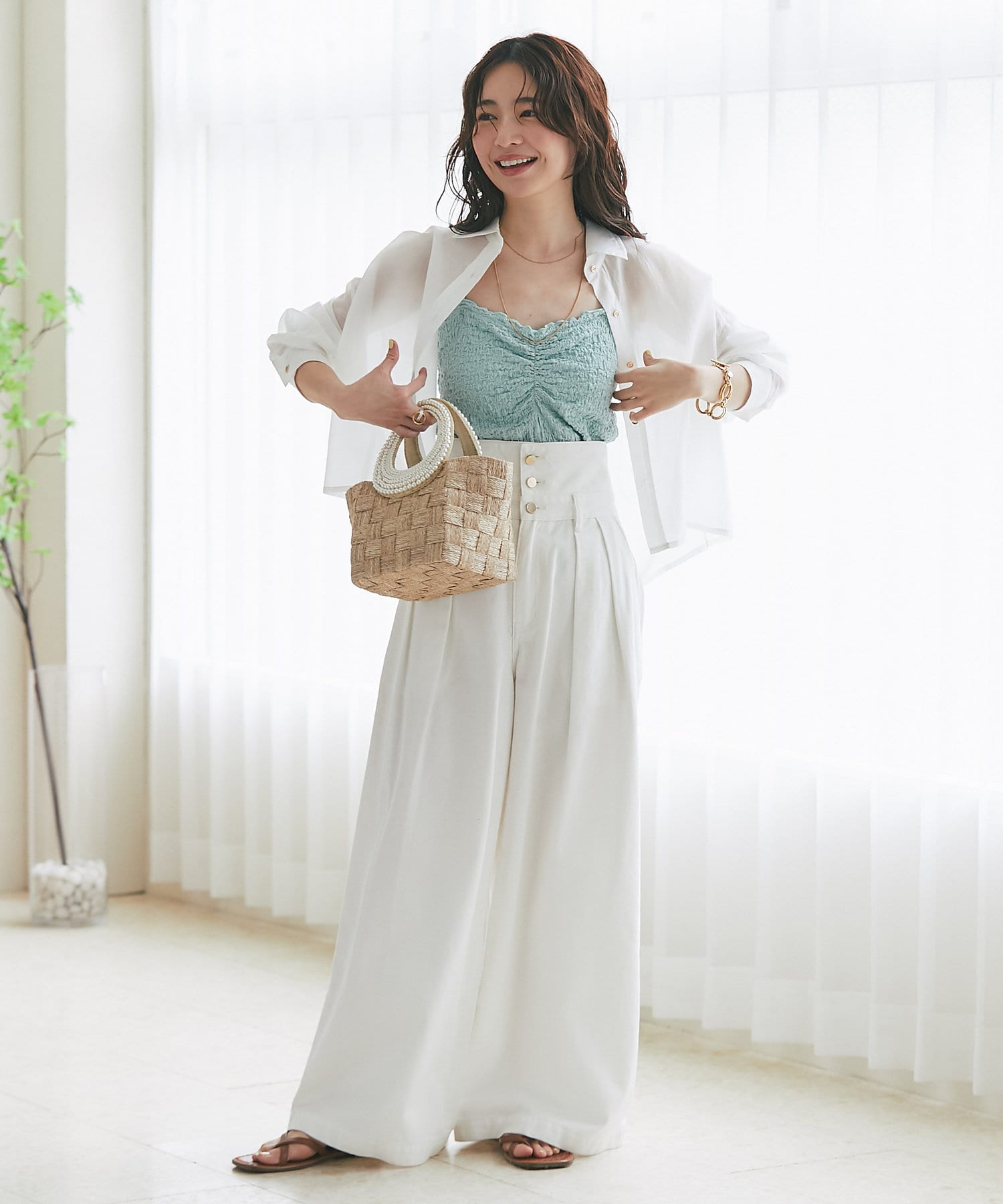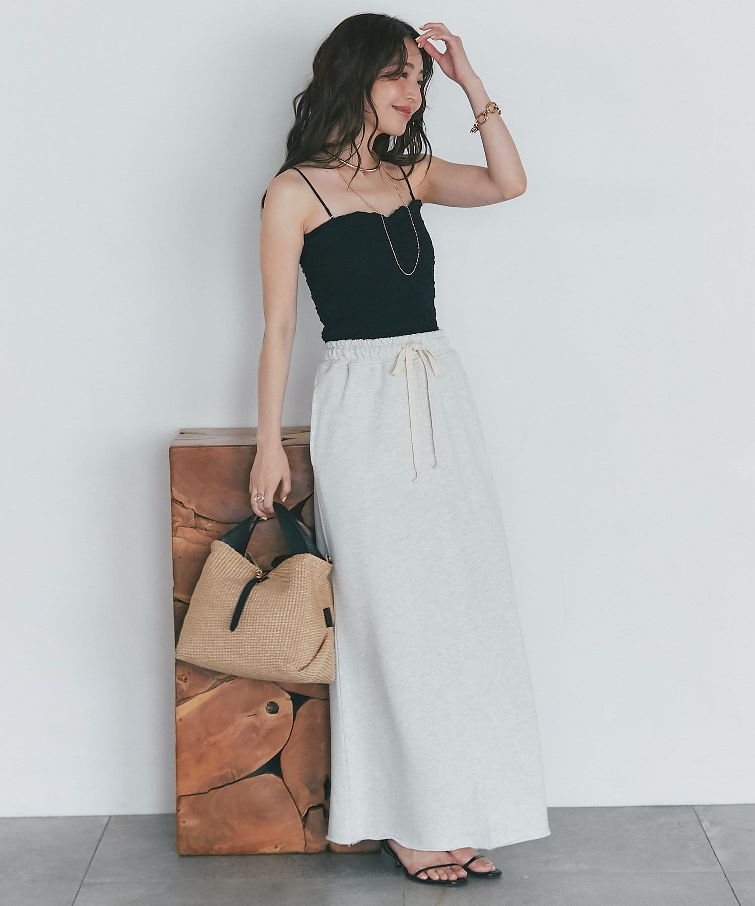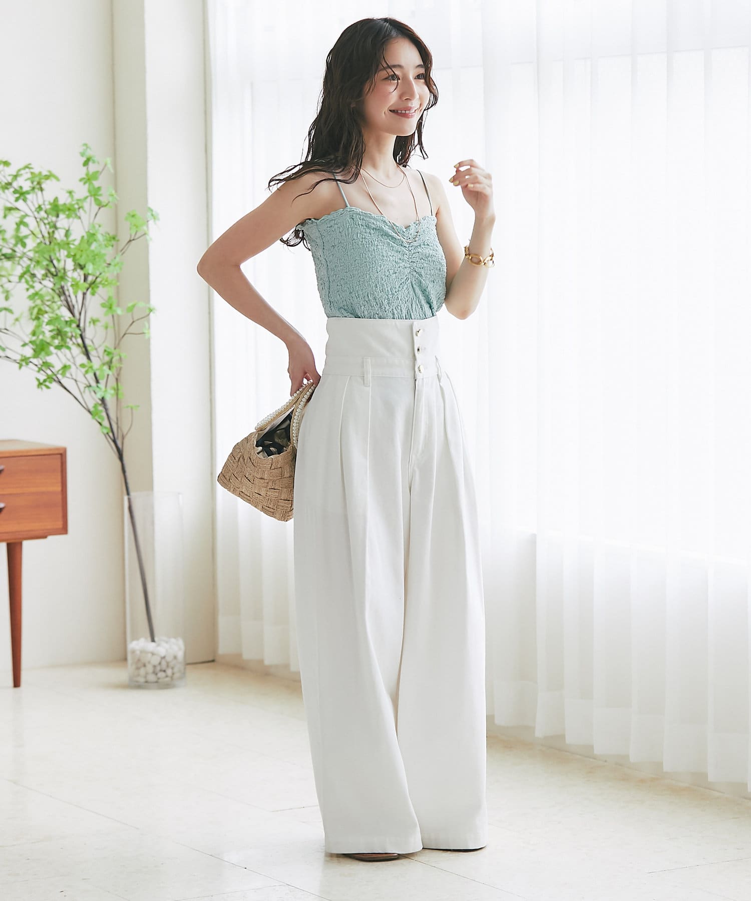 ふんわりと柔らかなシャーリングが、女性らしいシルエットを際立たせるキャミソール。